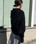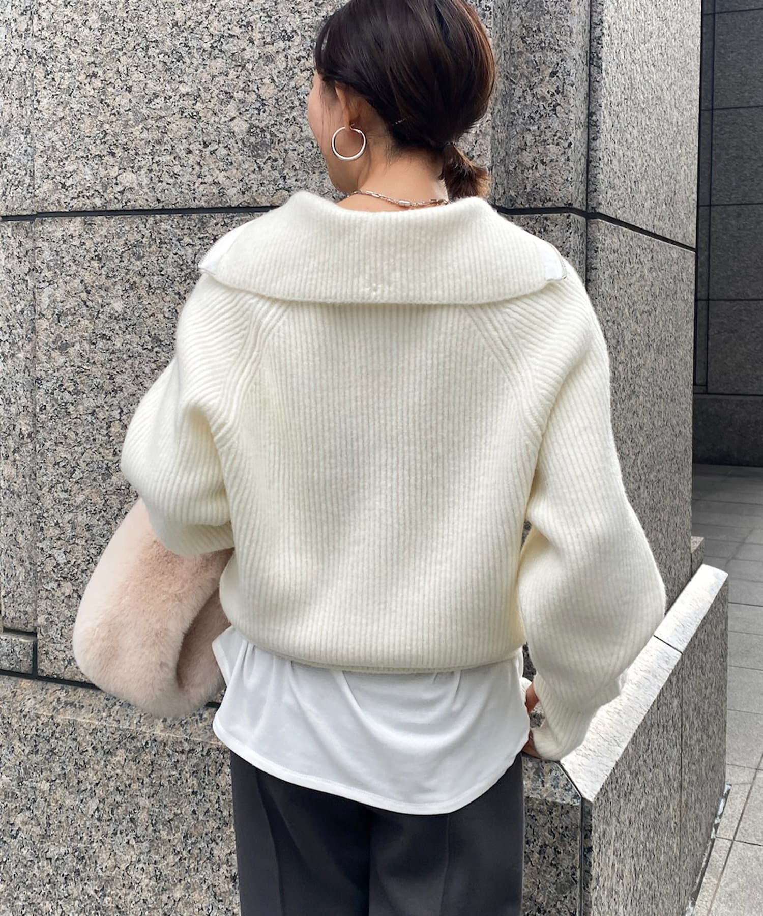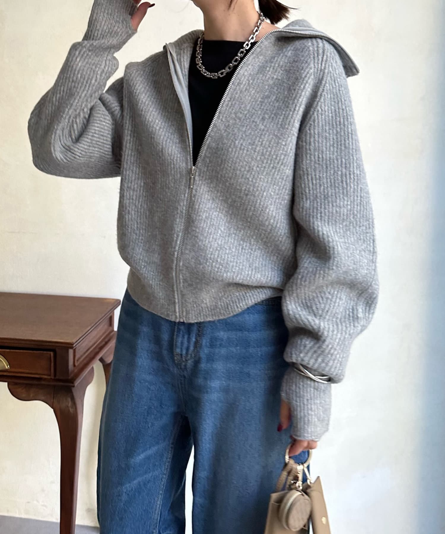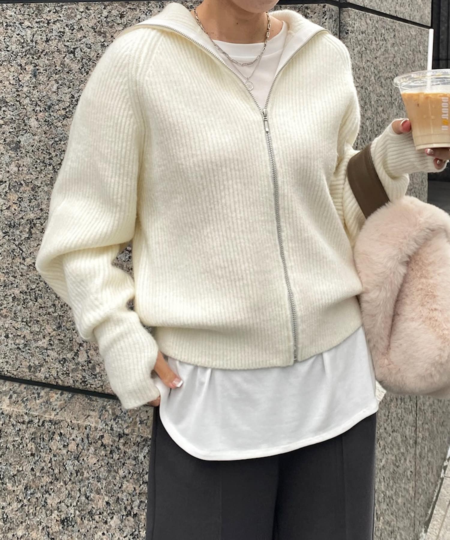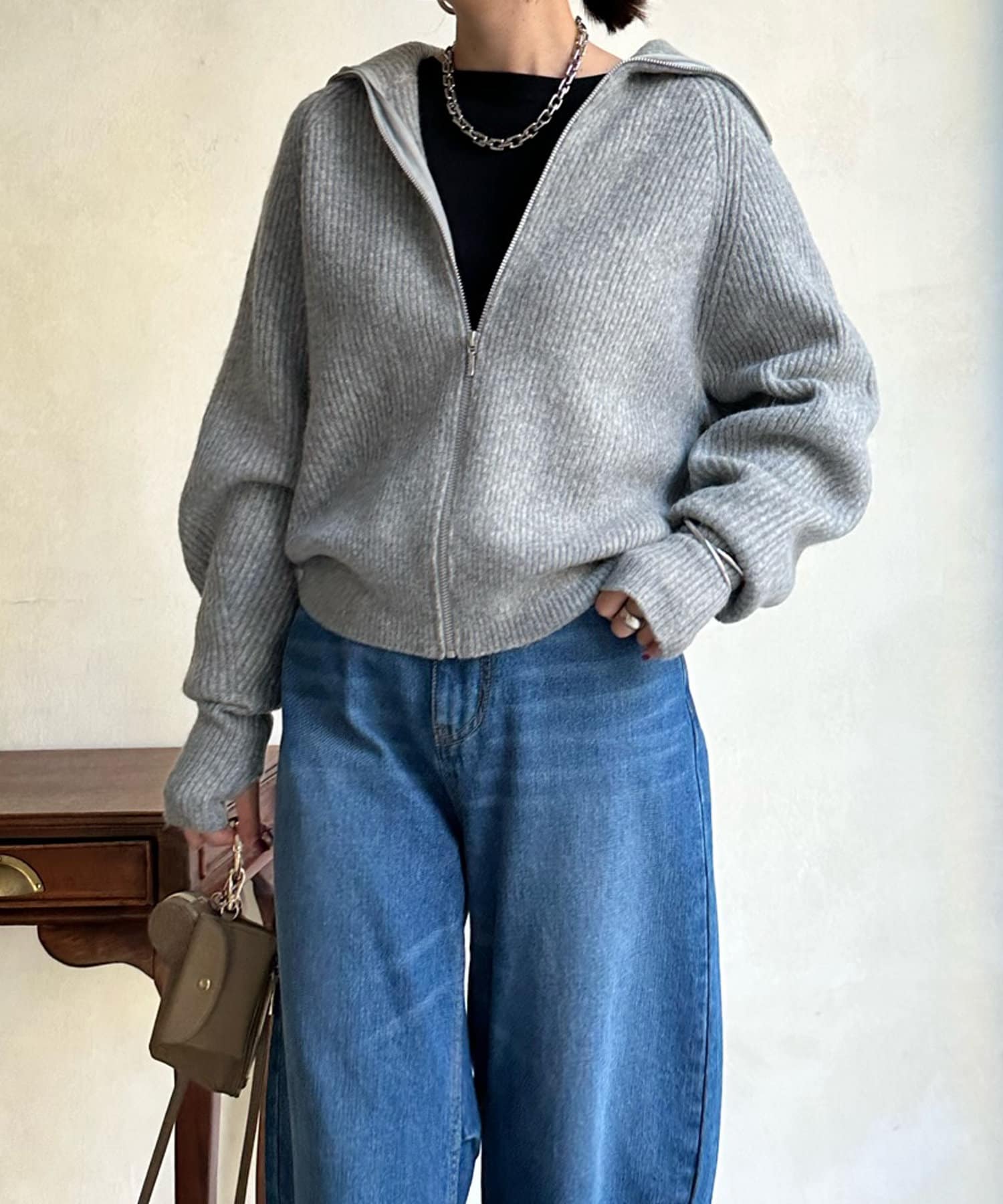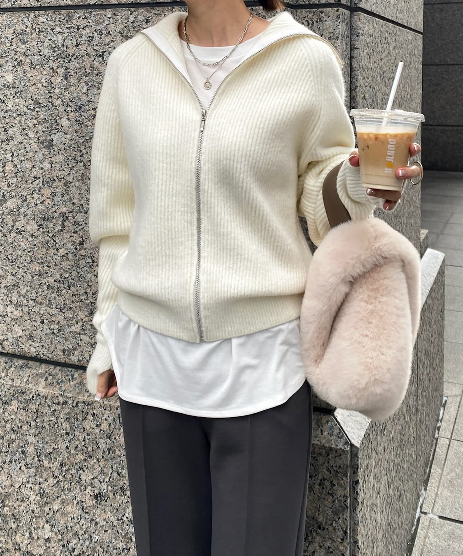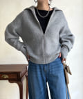 襟デザインが旬な印象に。フルジップデザインのため、カーディガンとしてもプルオーバーとしても着られる万能さが魅力の1着です。