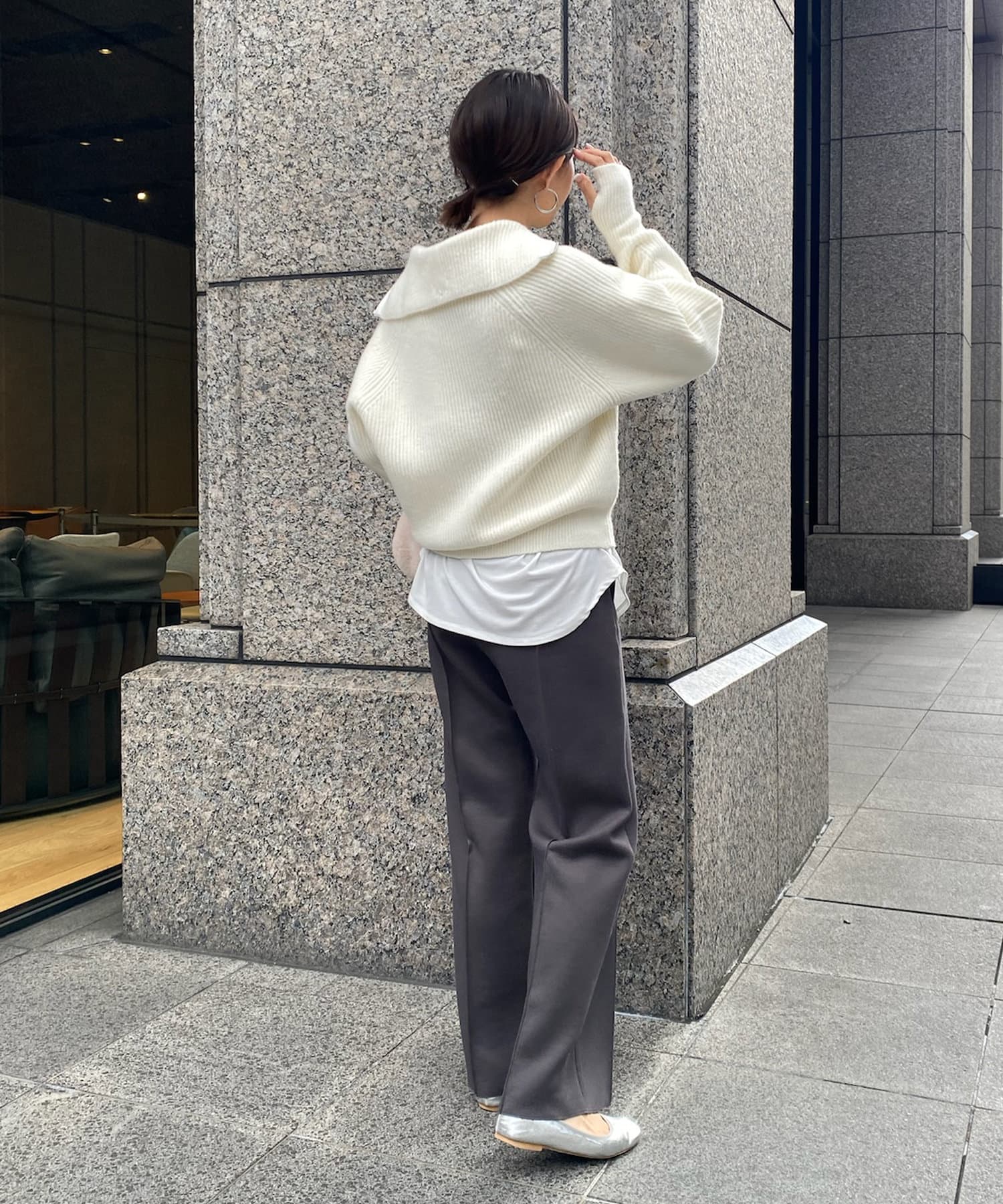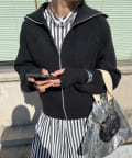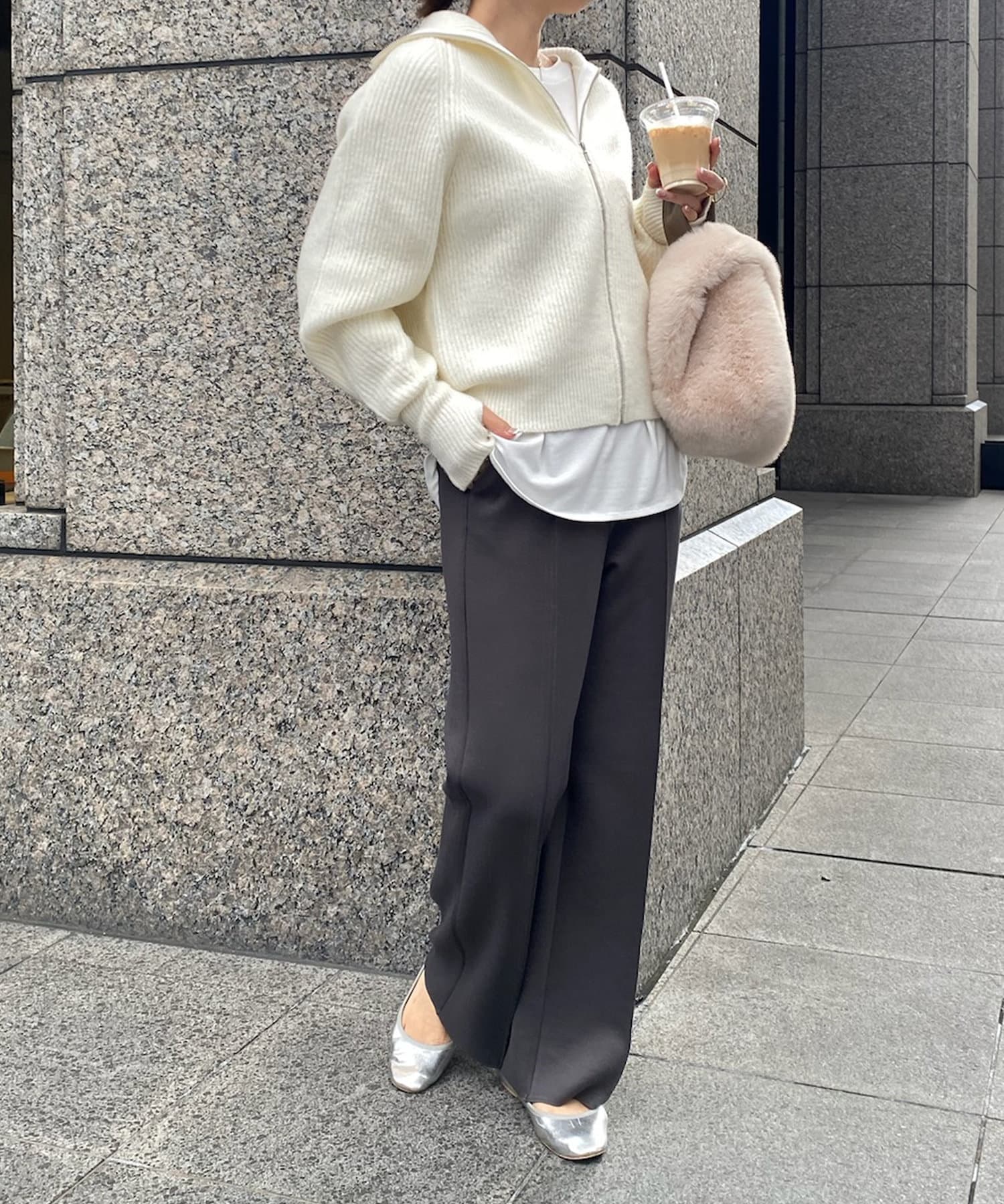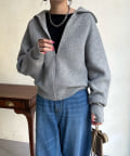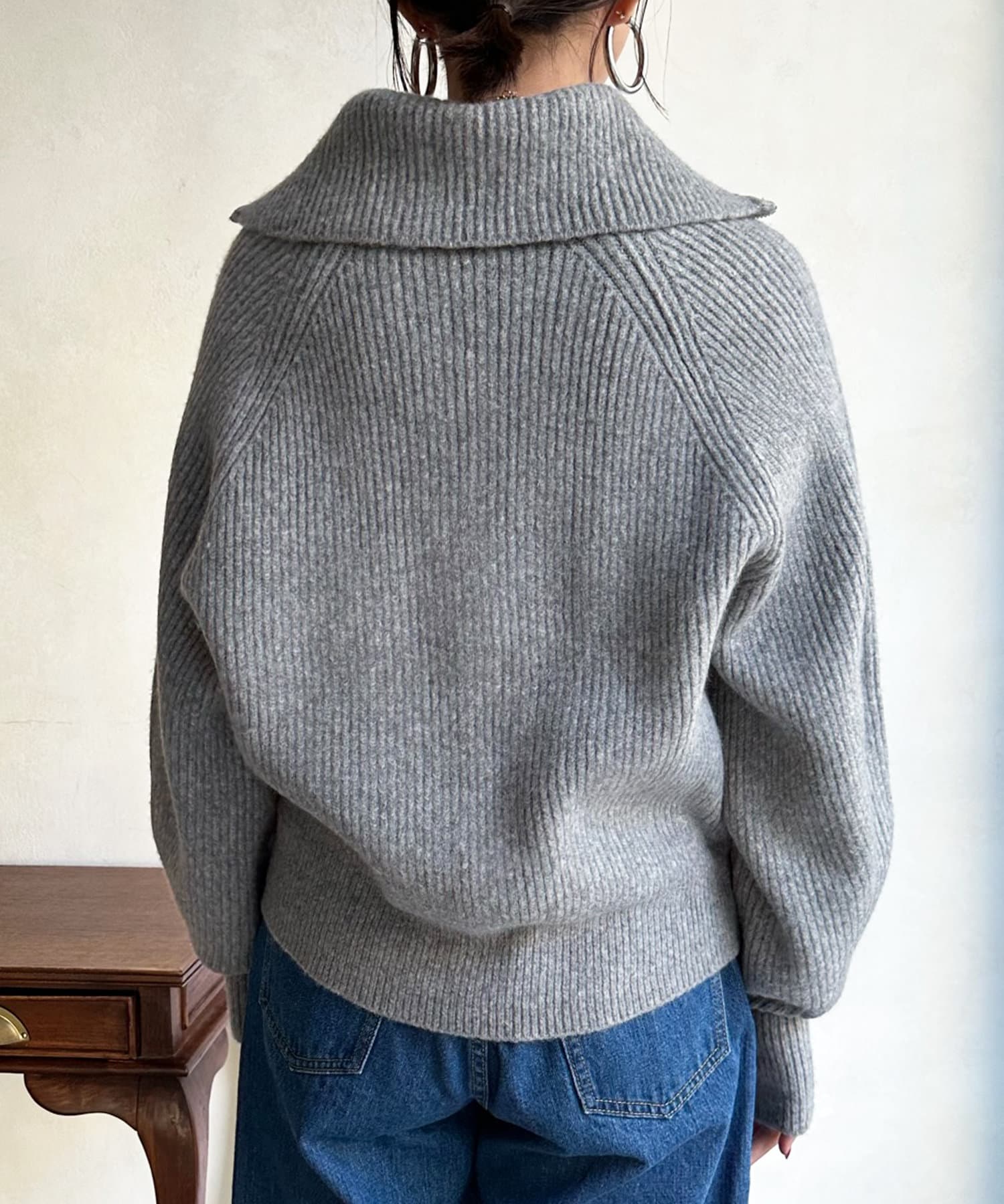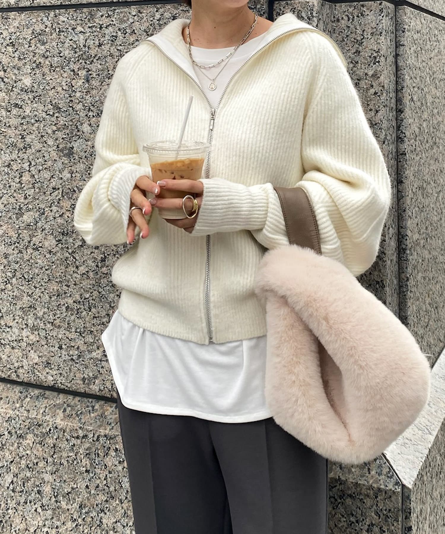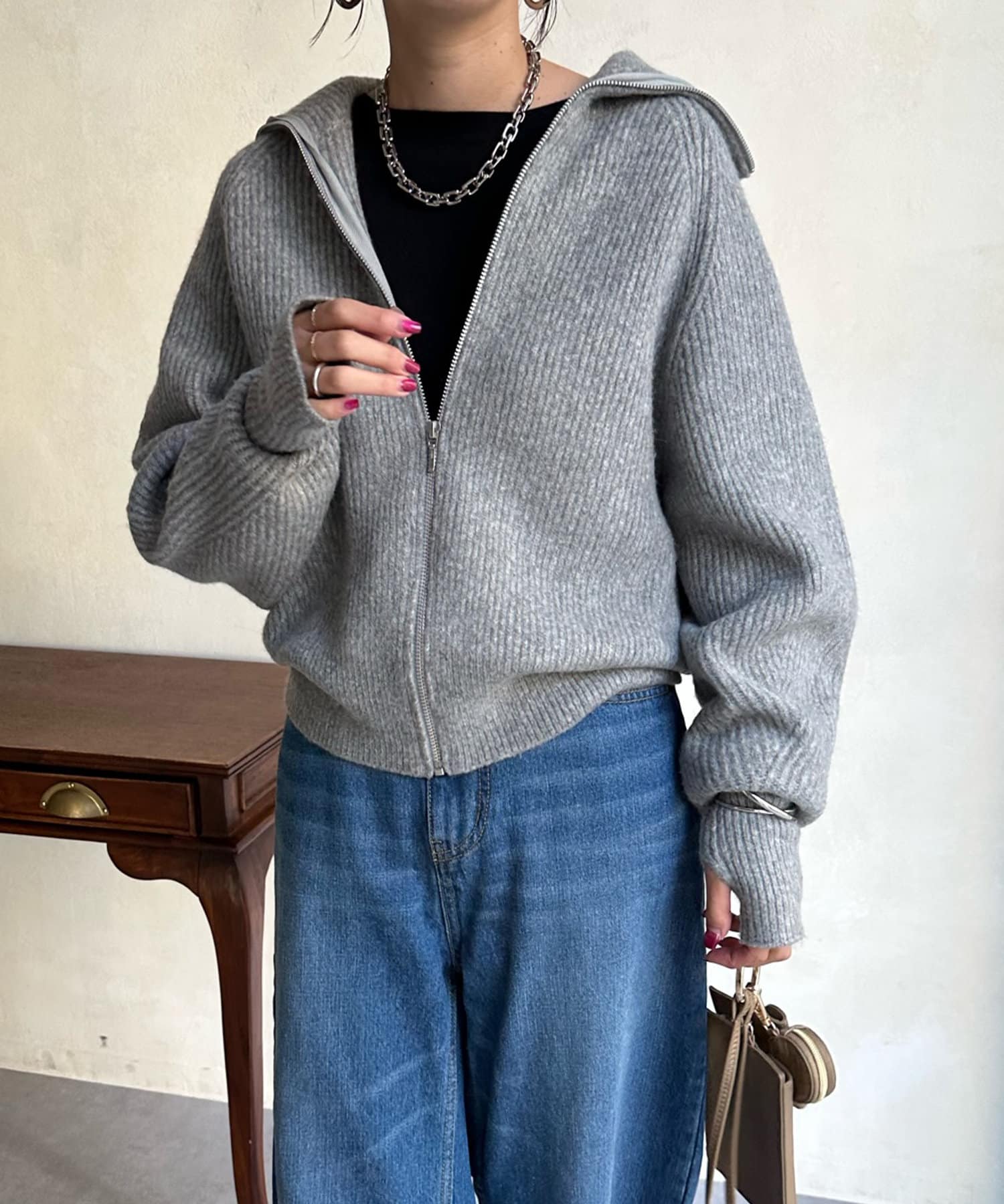 襟デザインが旬な印象に。フルジップデザインのため、カーディガンとしてもプルオーバーとしても着られる万能さが魅力の1着です。