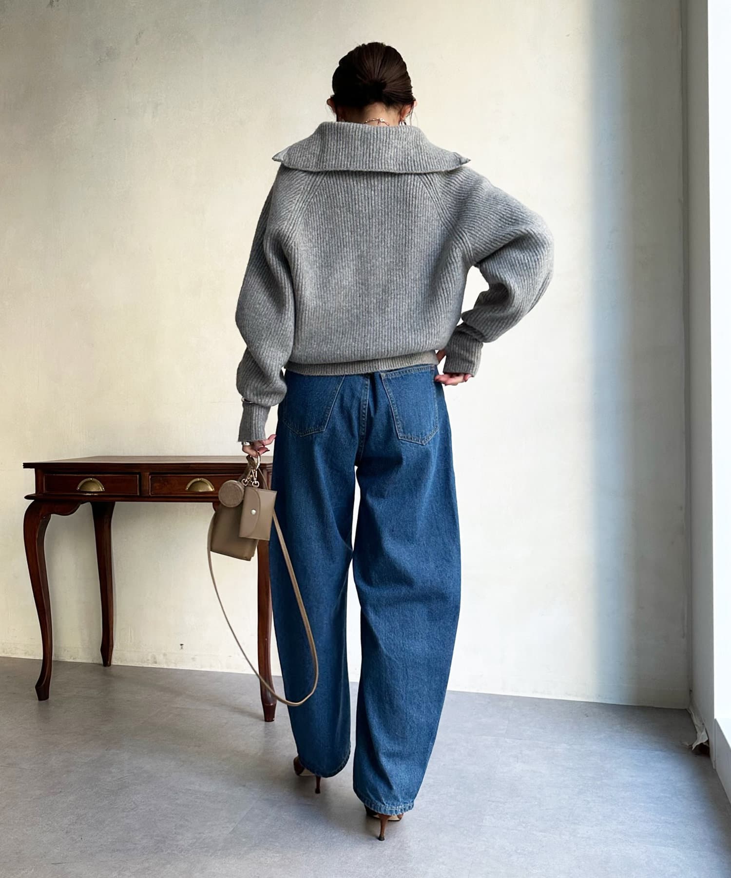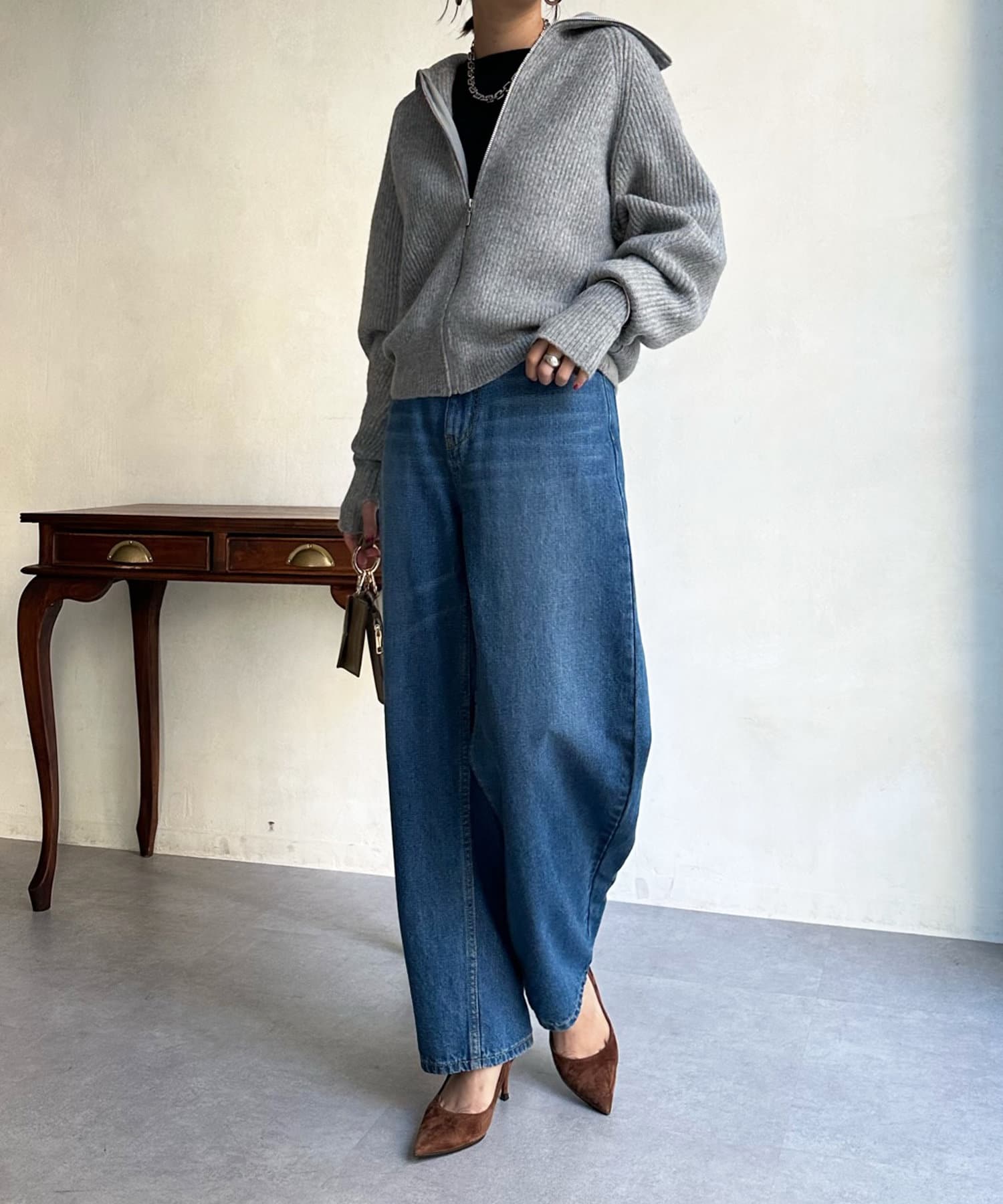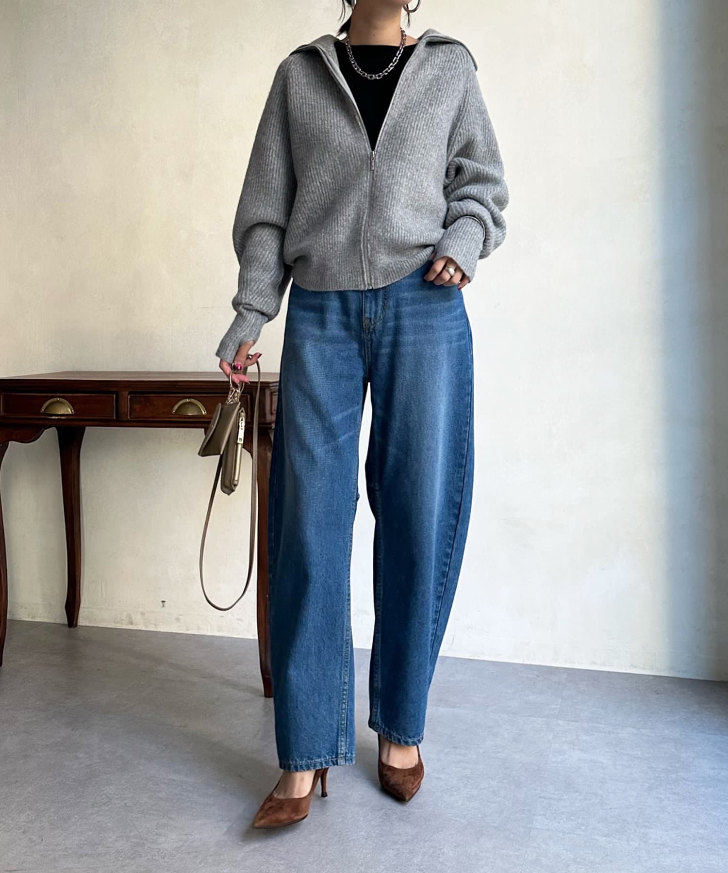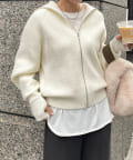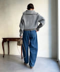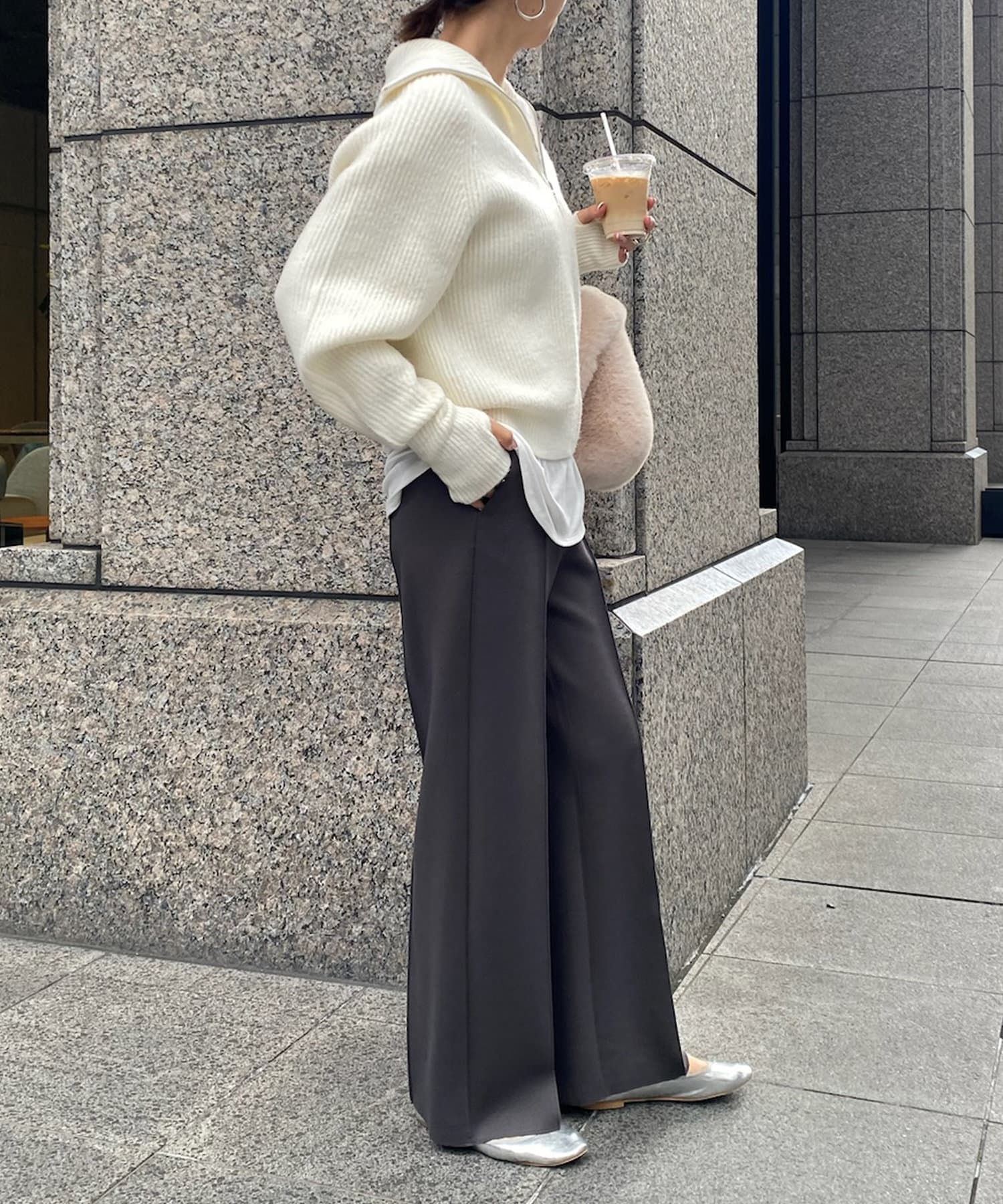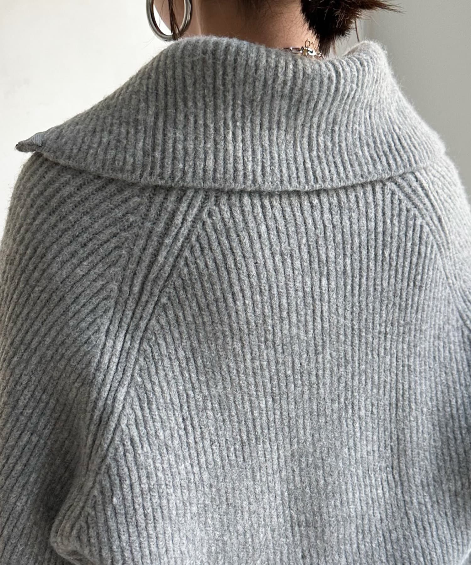 襟デザインが旬な印象に。フルジップデザインのため、カーディガンとしてもプルオーバーとしても着られる万能さが魅力の1着です。