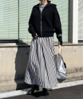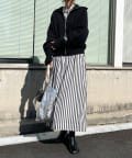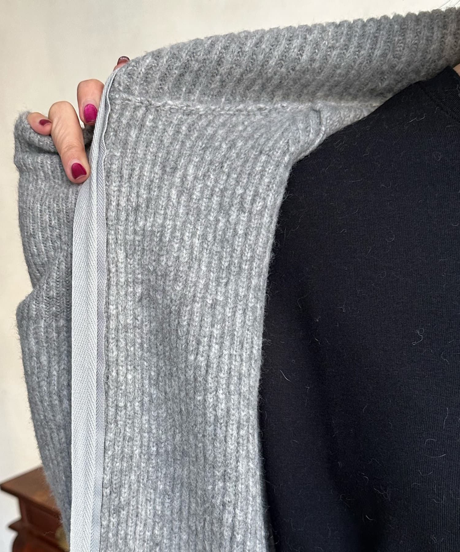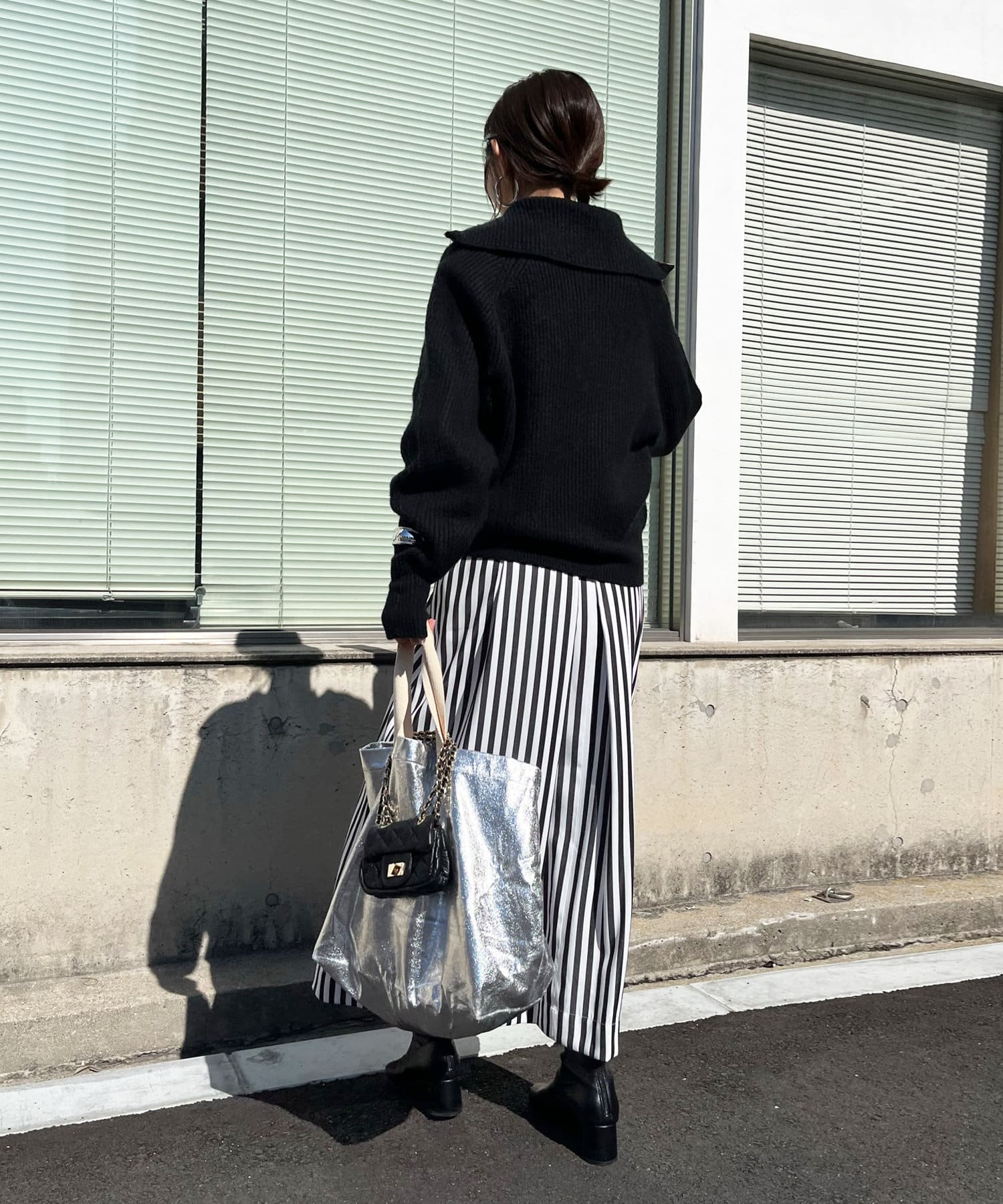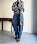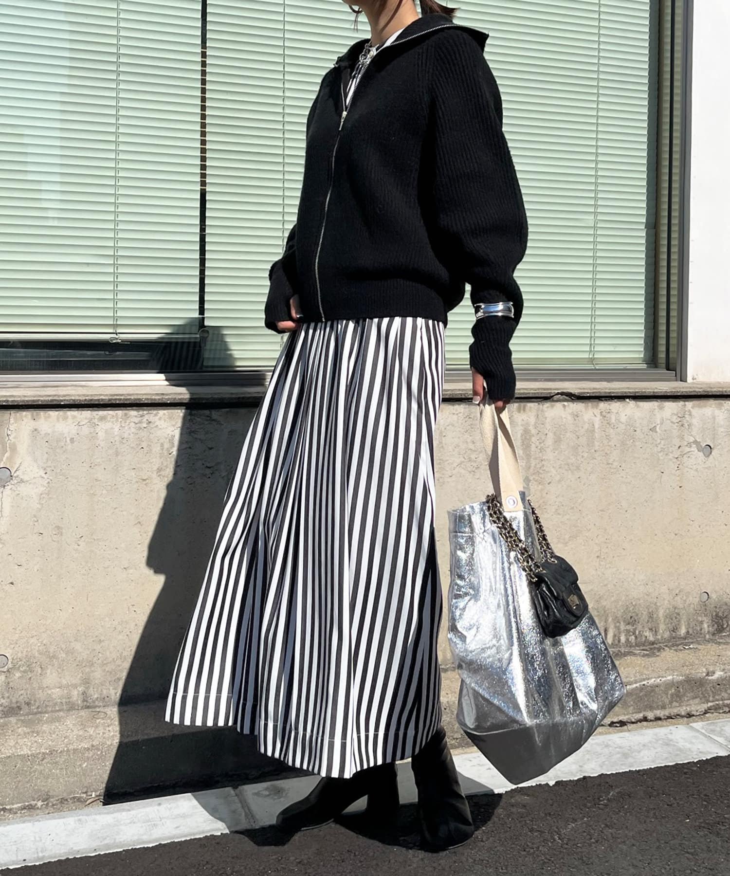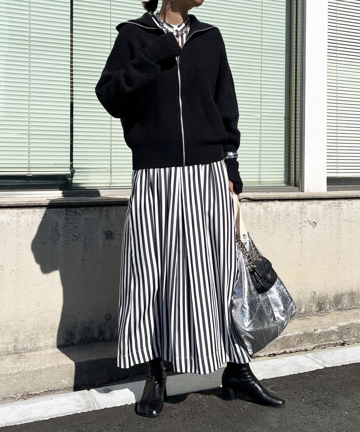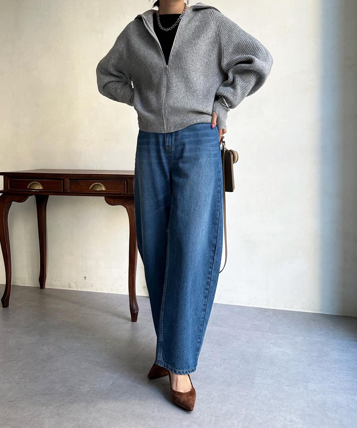 襟デザインが旬な印象に。フルジップデザインのため、カーディガンとしてもプルオーバーとしても着られる万能さが魅力の1着です。