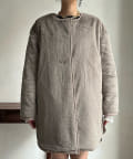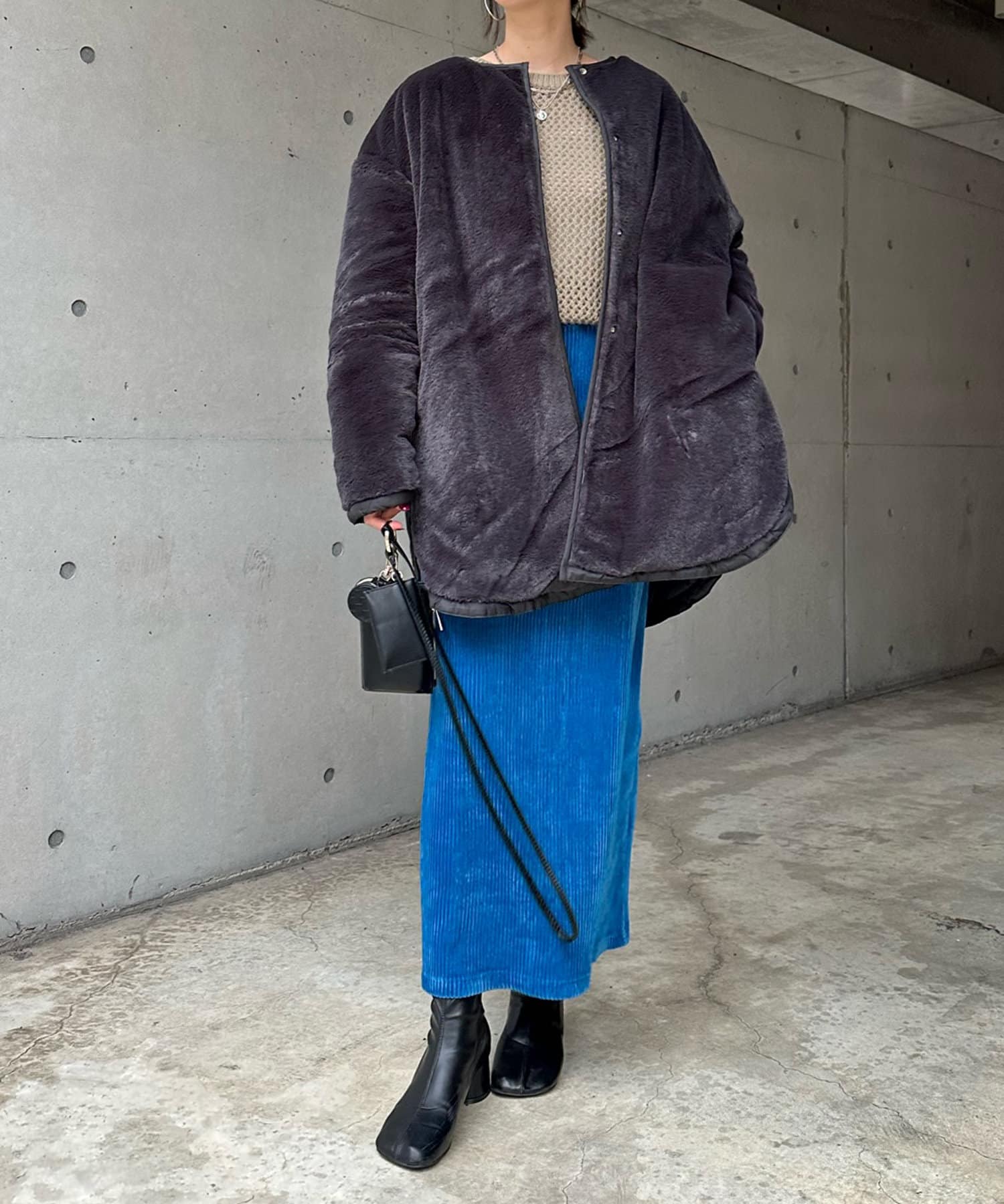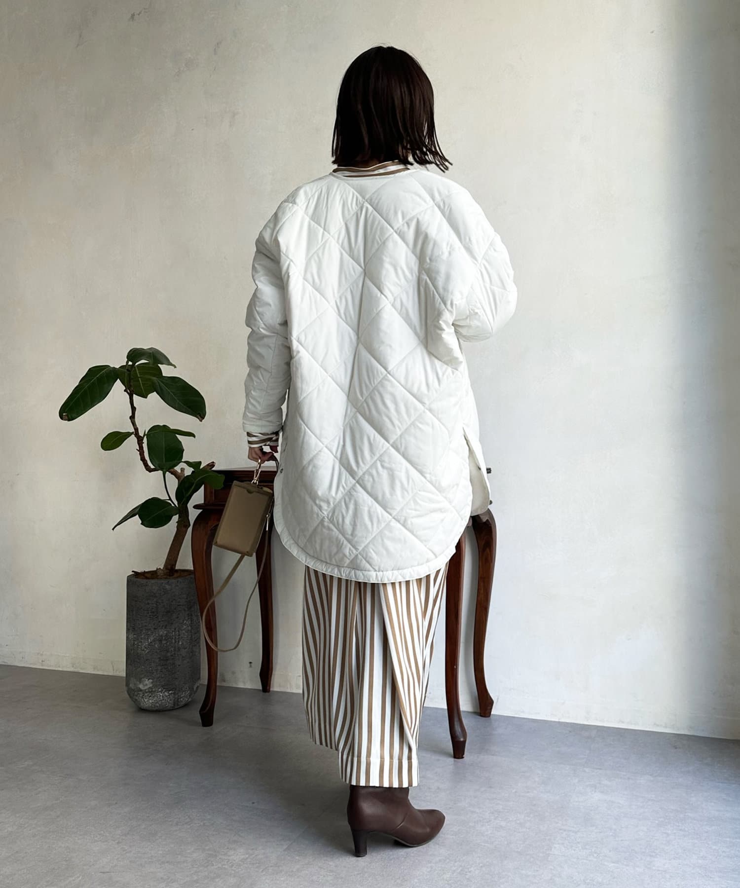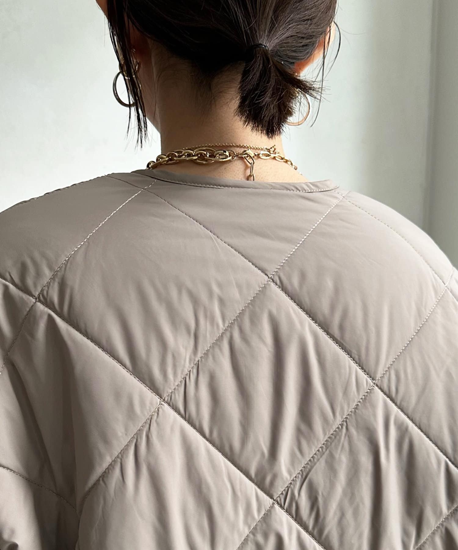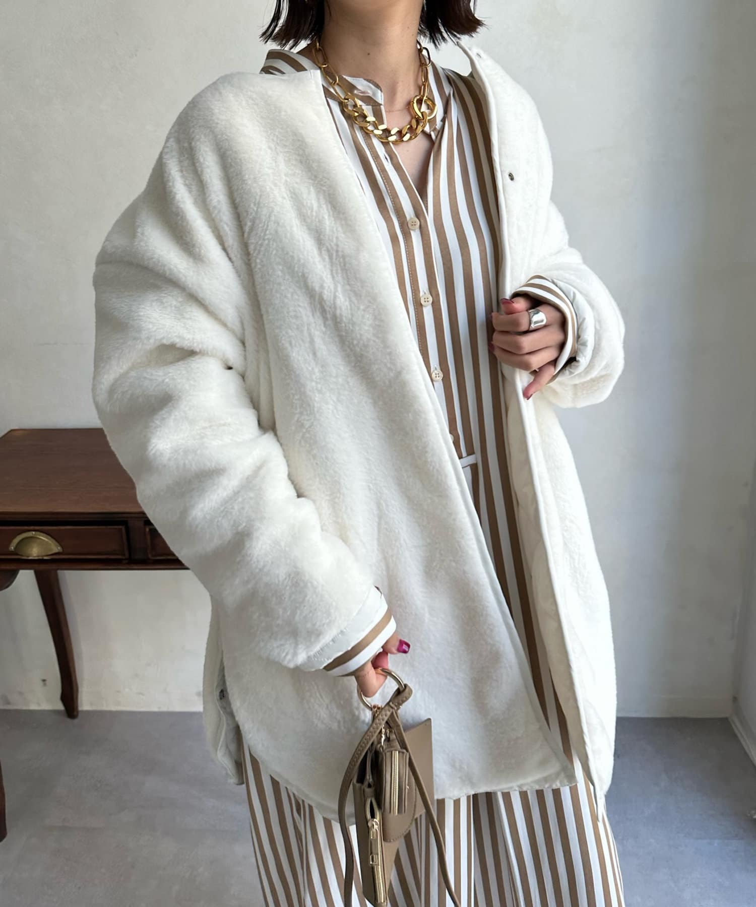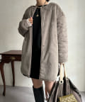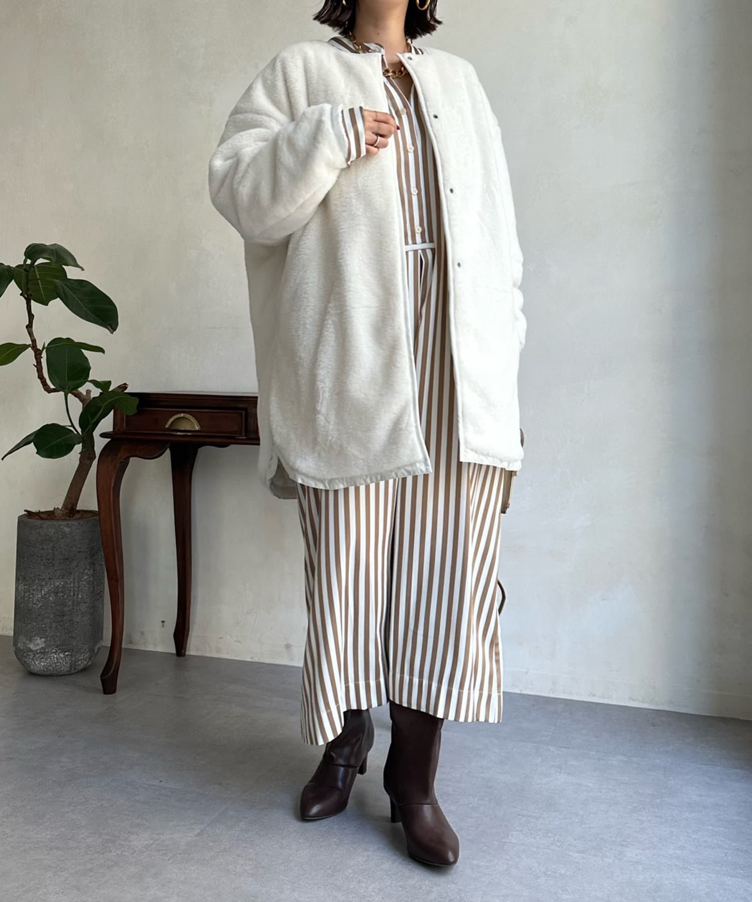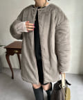 身体をすっぽりと覆ってくれる余裕感のあるシルエットに仕上げ、首元はノーカラーのデザインにすることで、すっきりとした印象に。