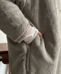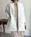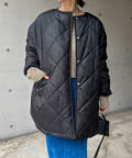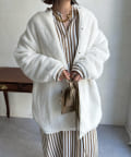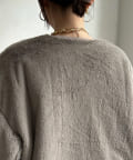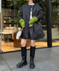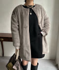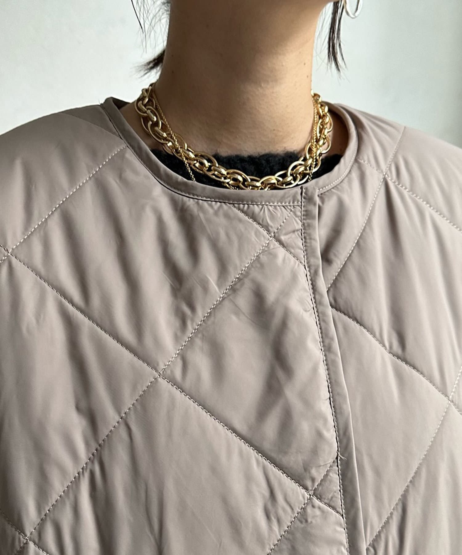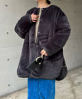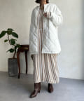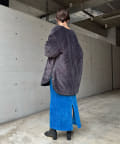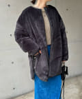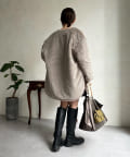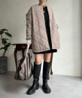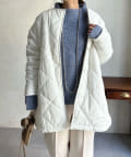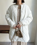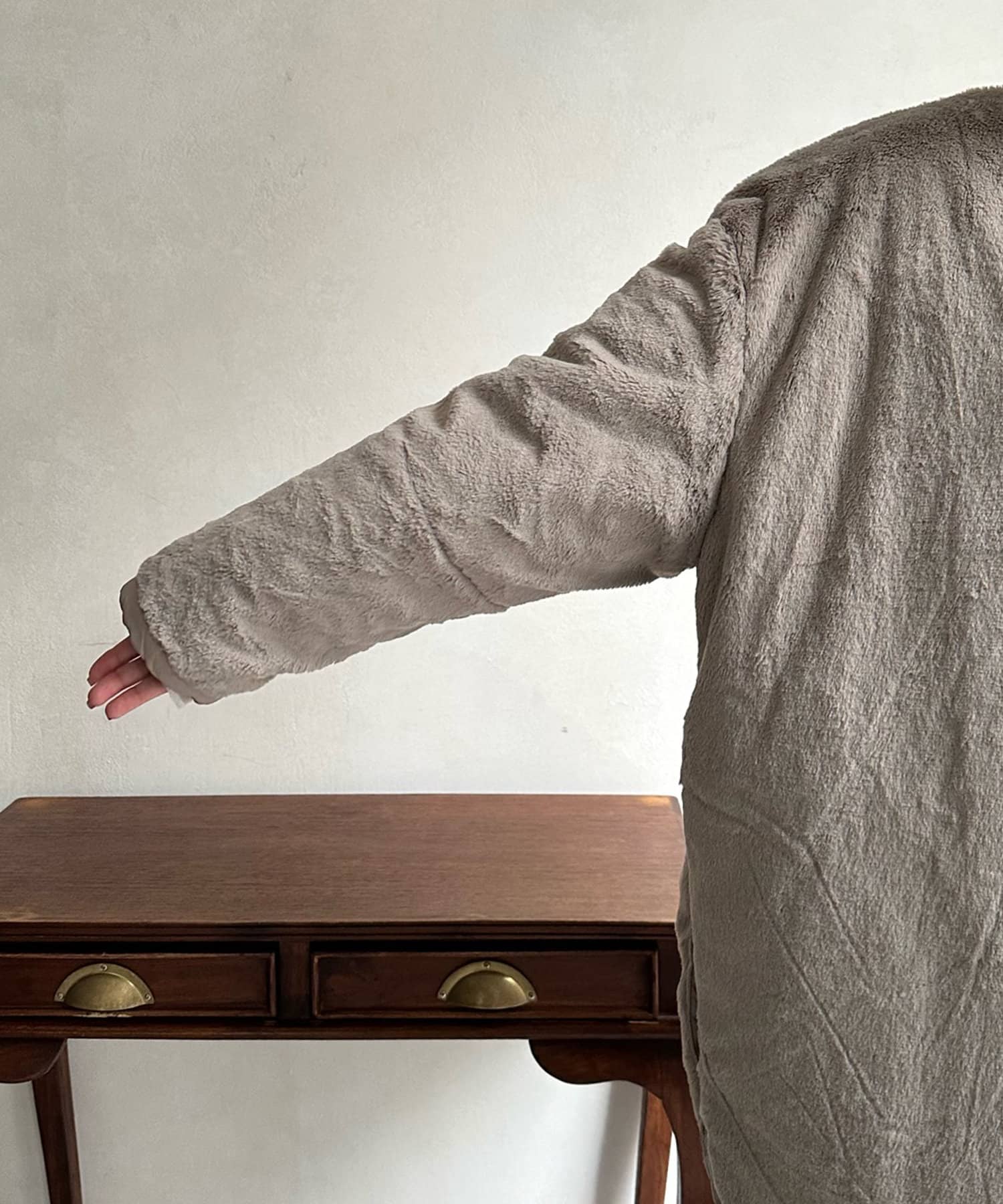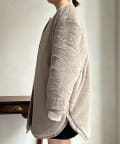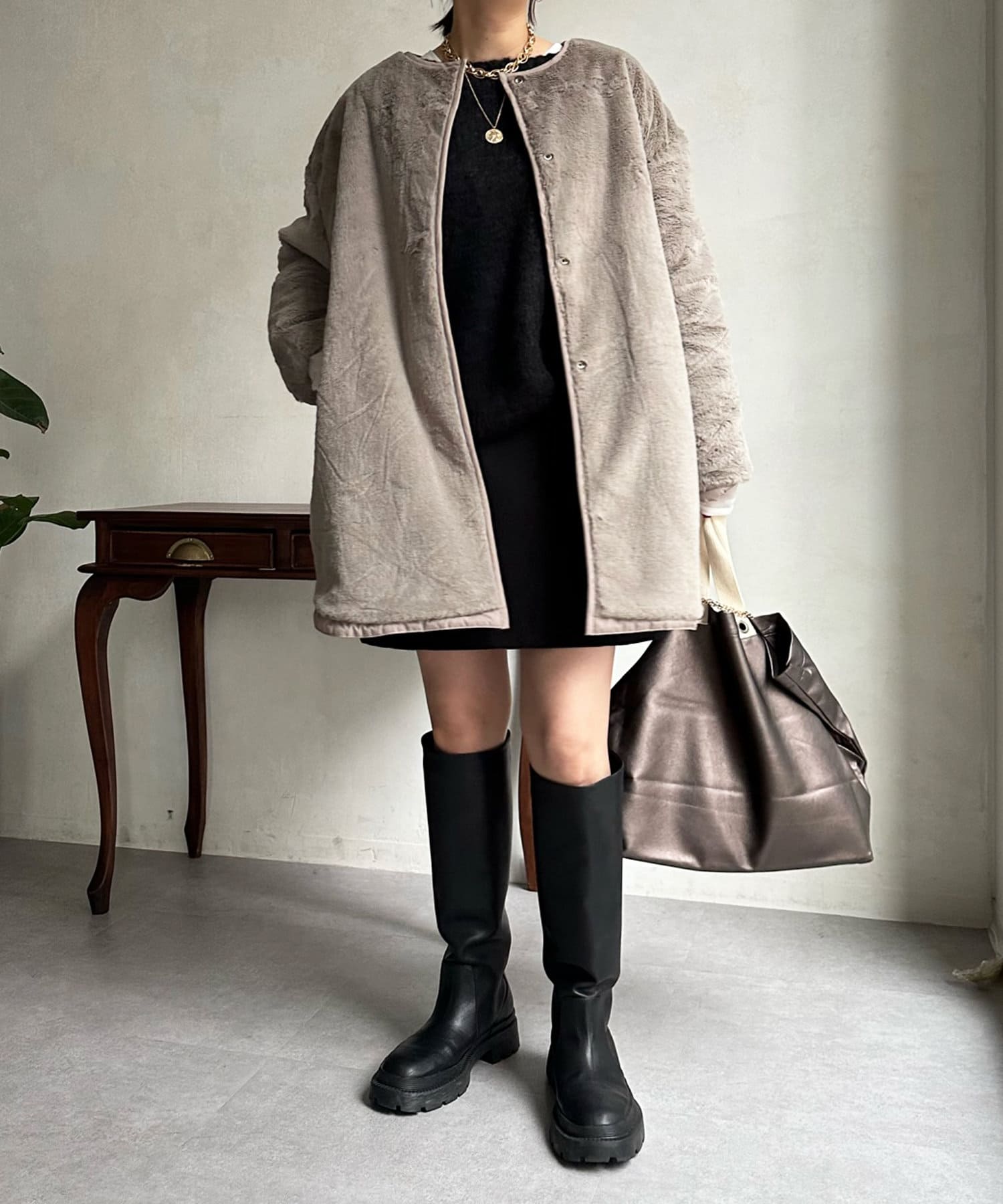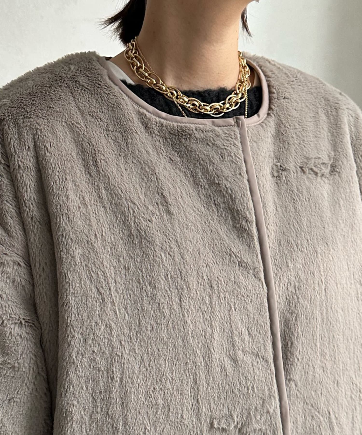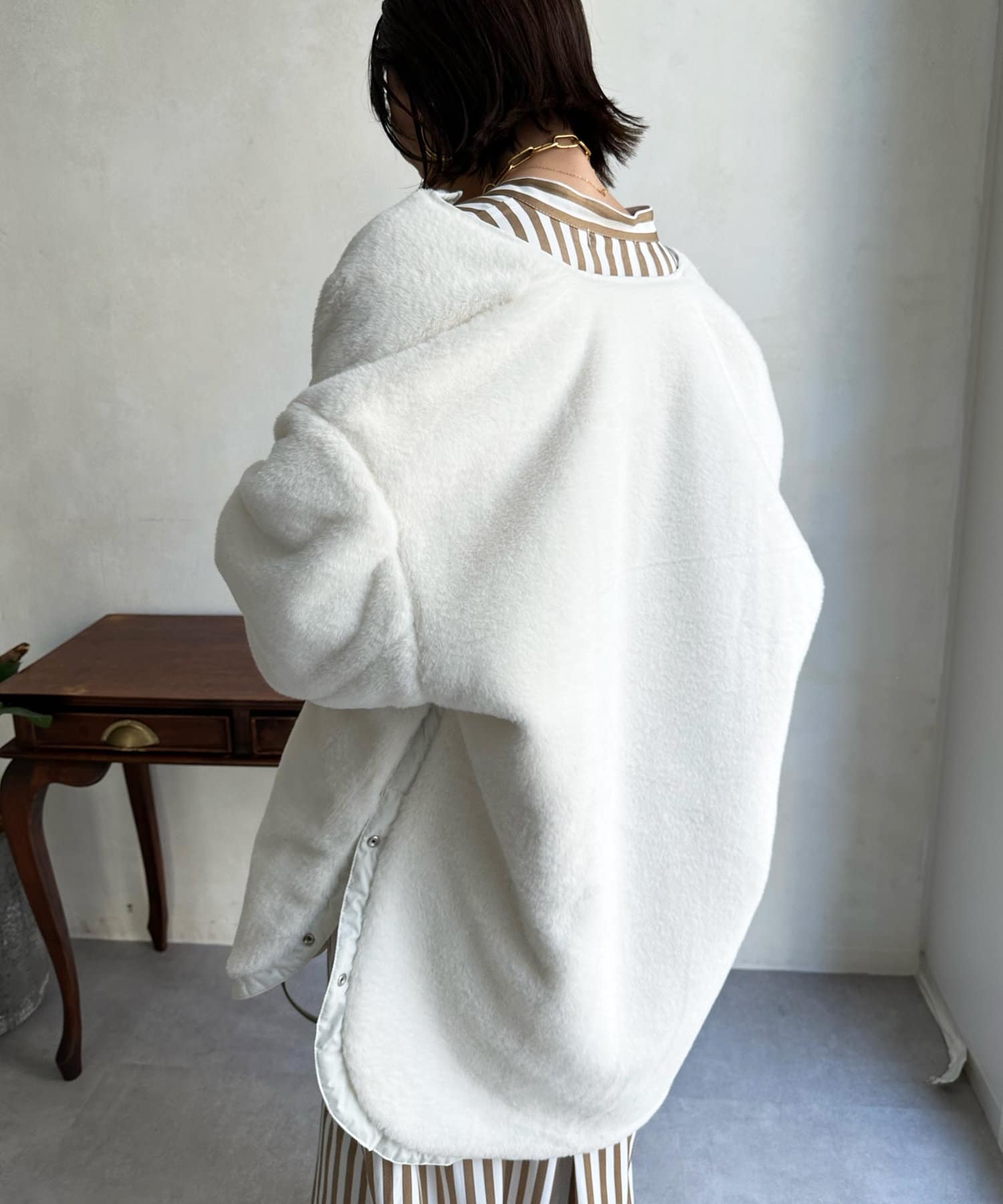 身体をすっぽりと覆ってくれる余裕感のあるシルエットに仕上げ、首元はノーカラーのデザインにすることで、すっきりとした印象に。