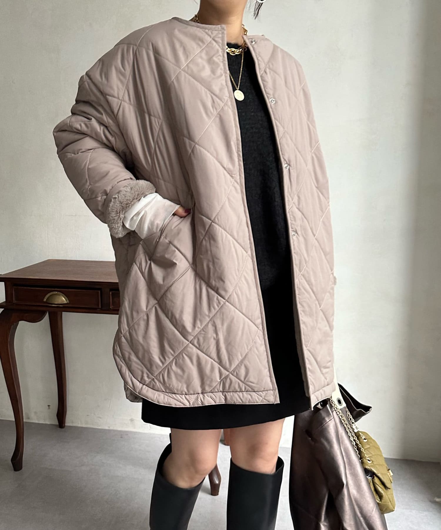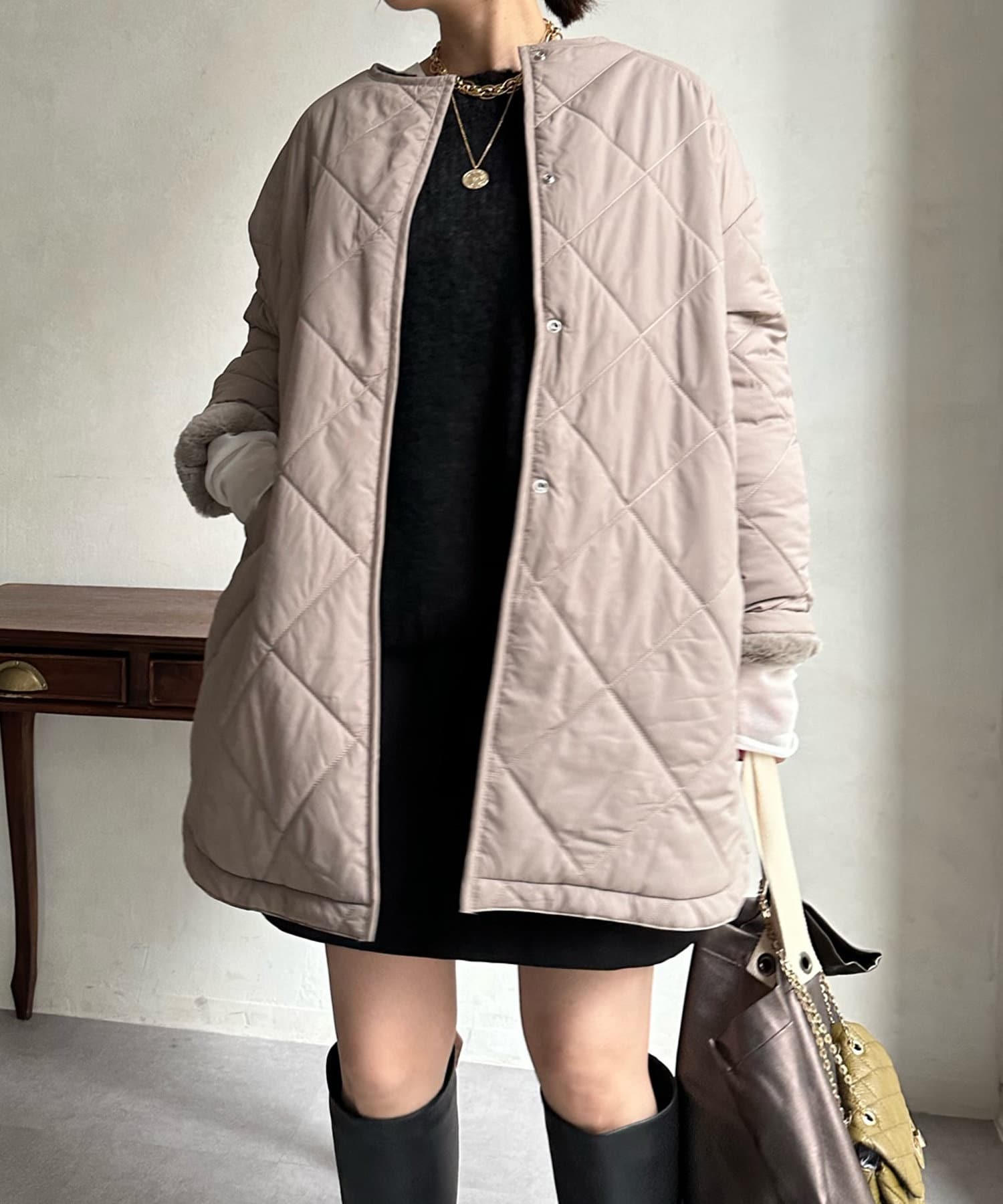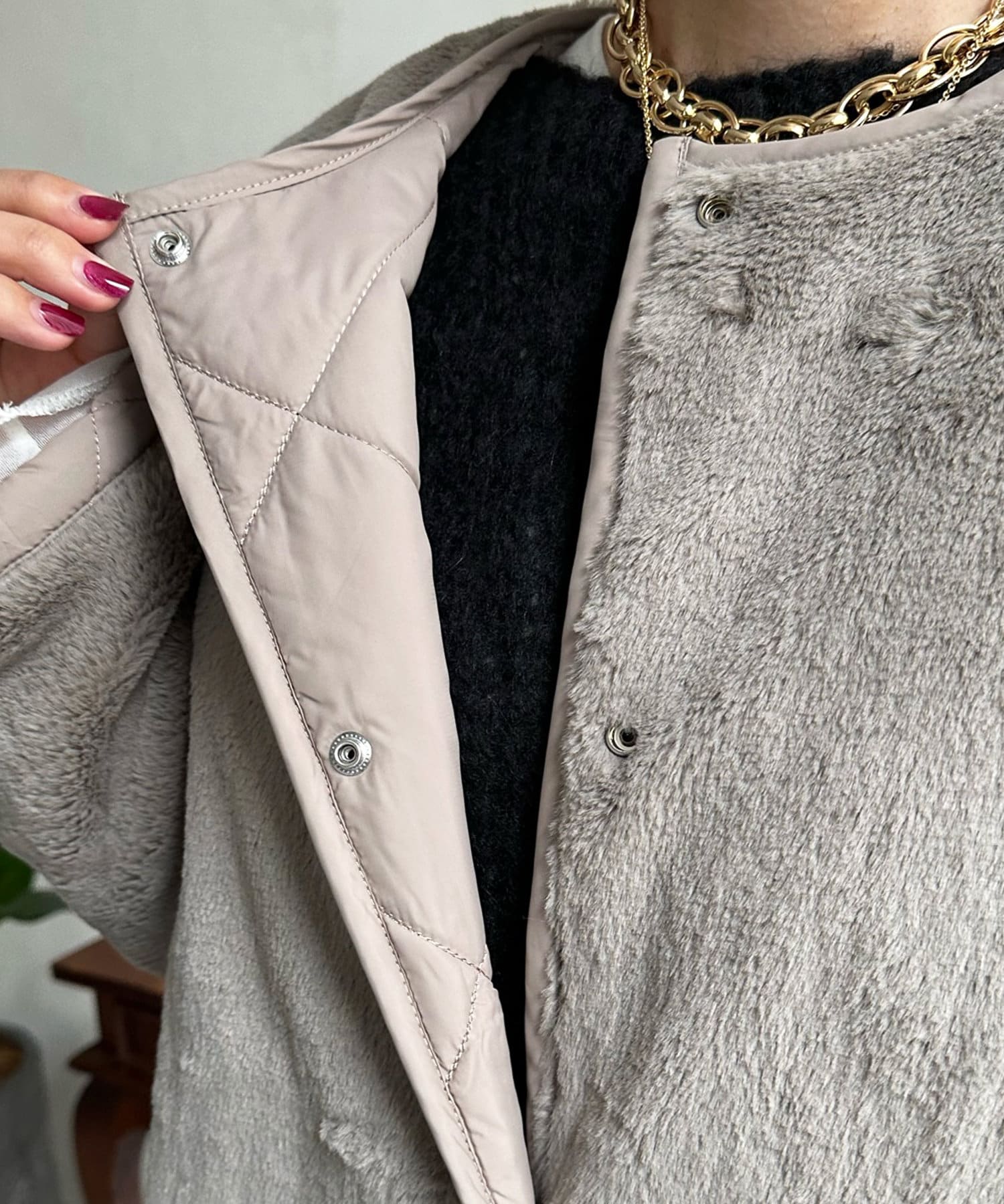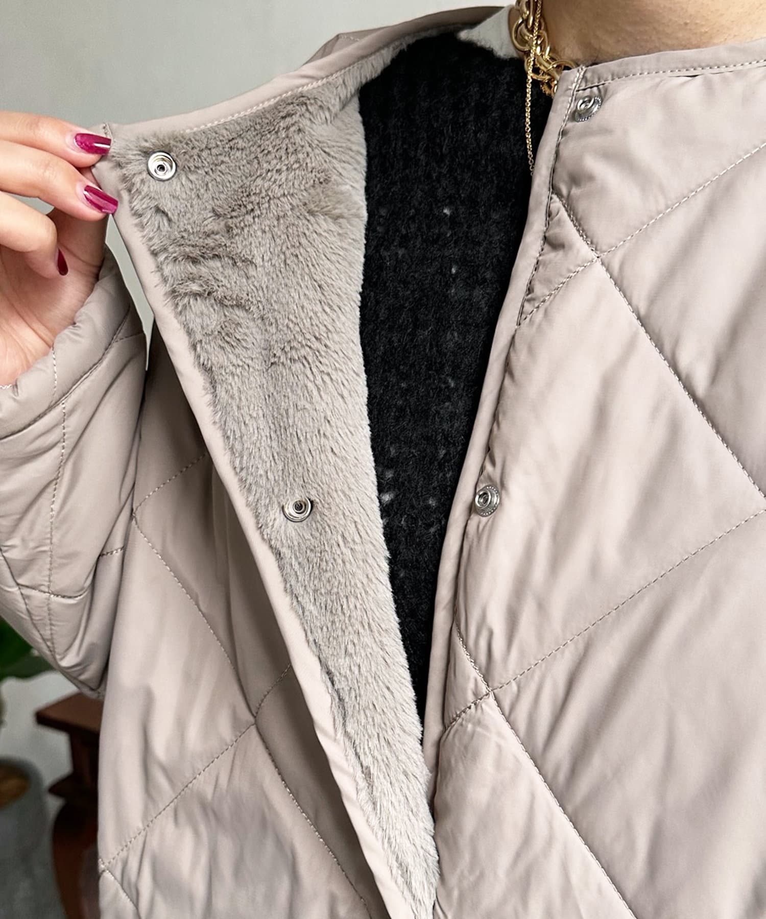 中綿入りキルティング&フェイクファーの表裏どちらで着てもかわいいリバーシブルのコート。