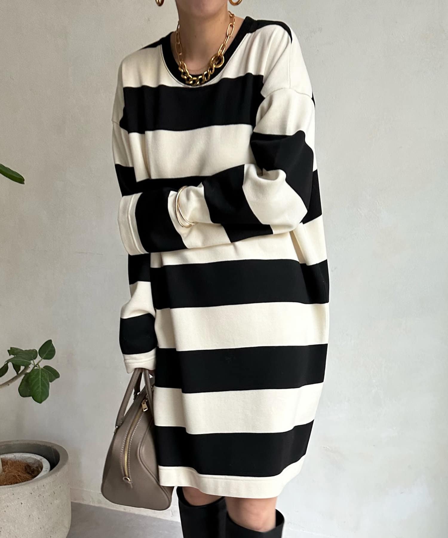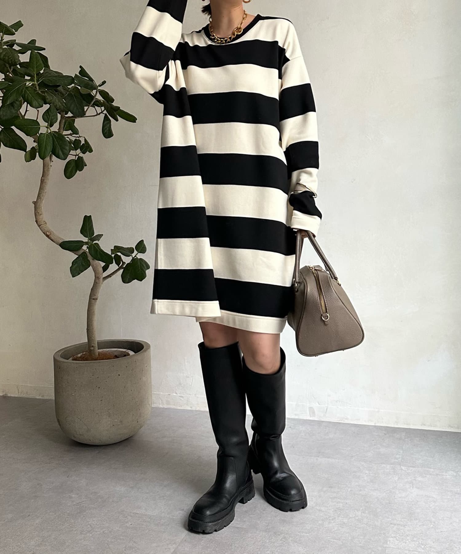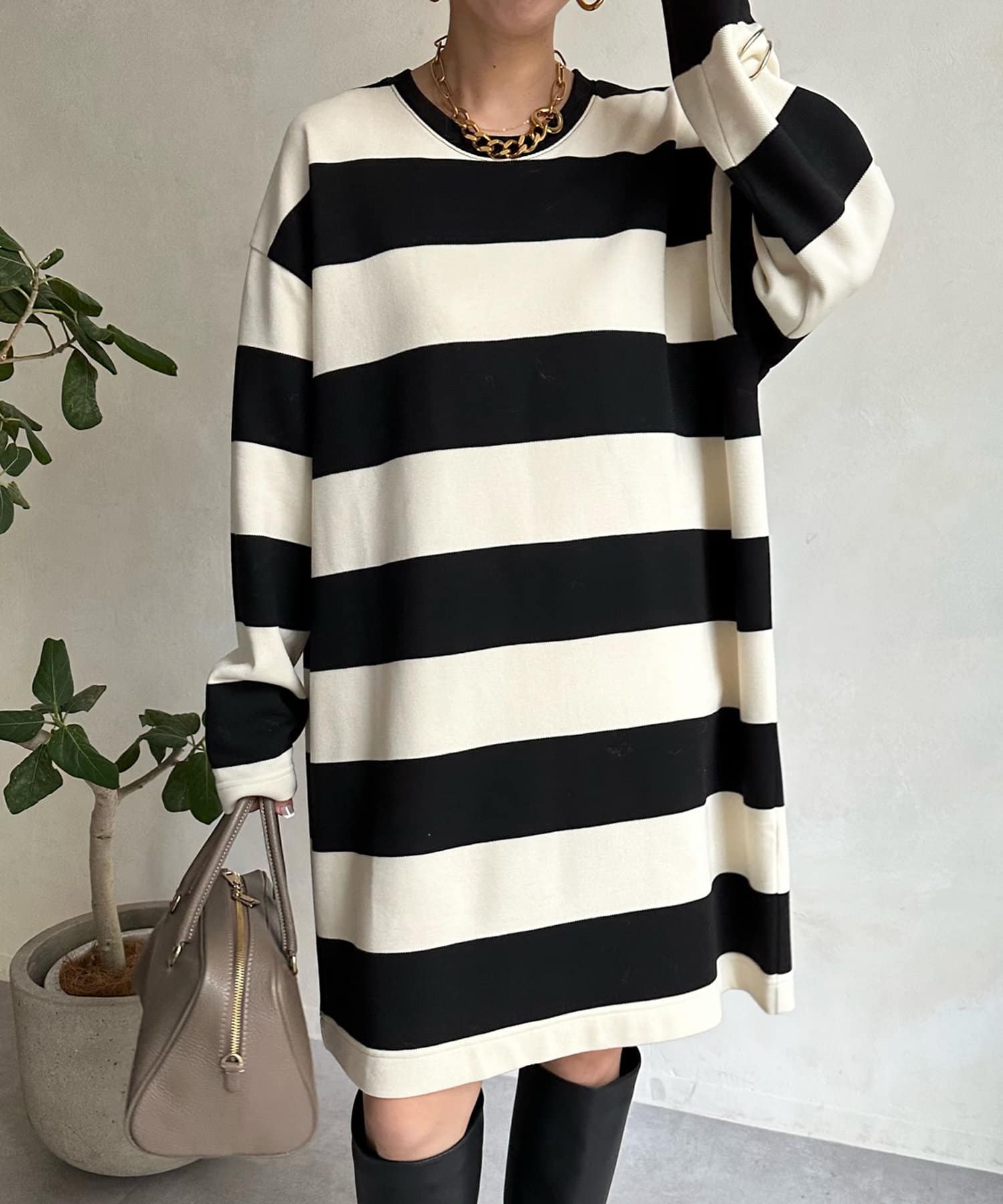 身体のラインを拾わず、ルーズに着られるサイジングで、着丈は今季注目のチュニック丈に。