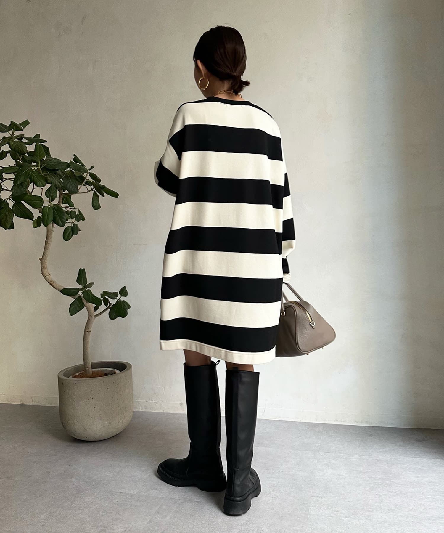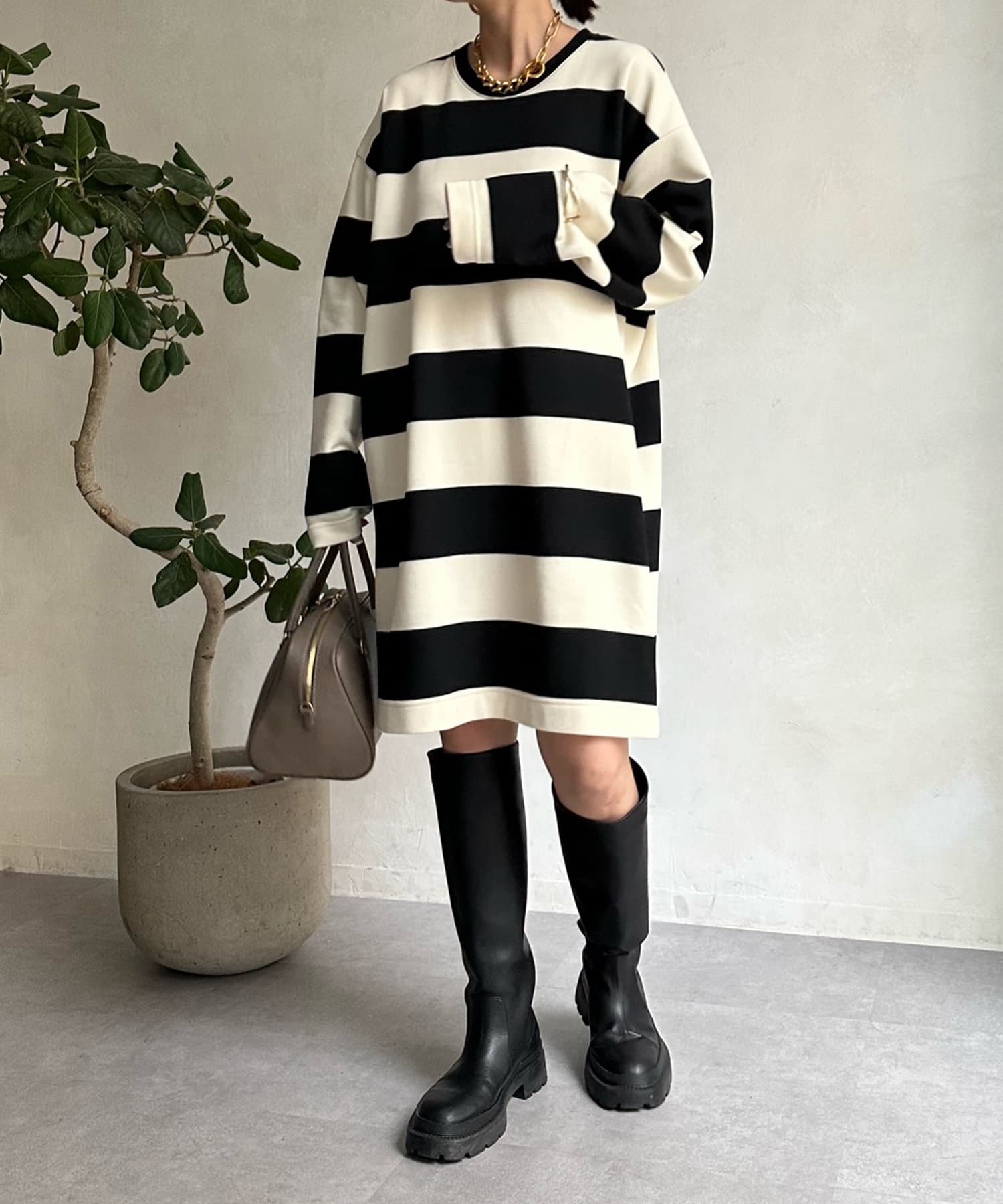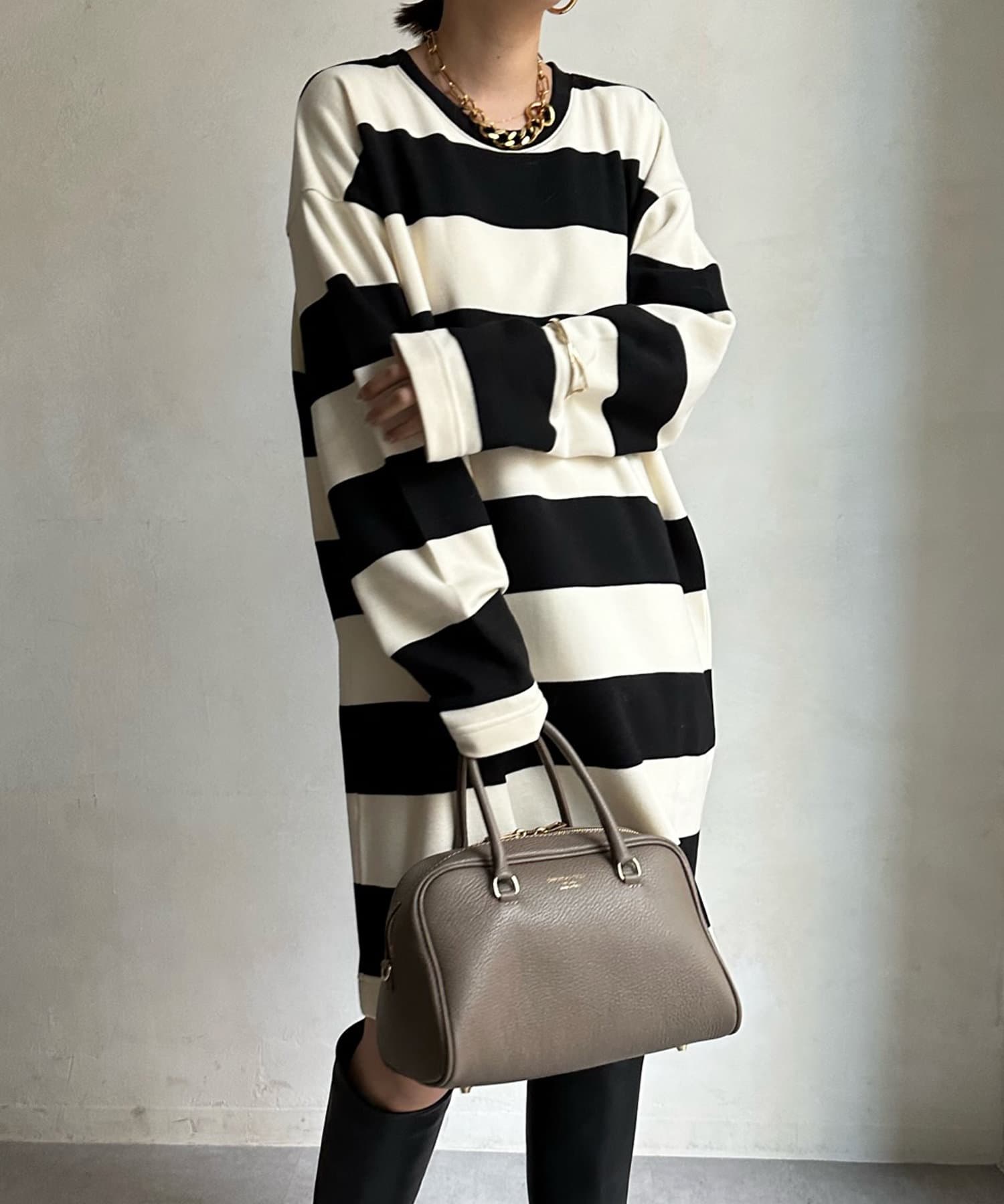 身体のラインを拾わず、ルーズに着られるサイジングで、着丈は今季注目のチュニック丈に。