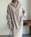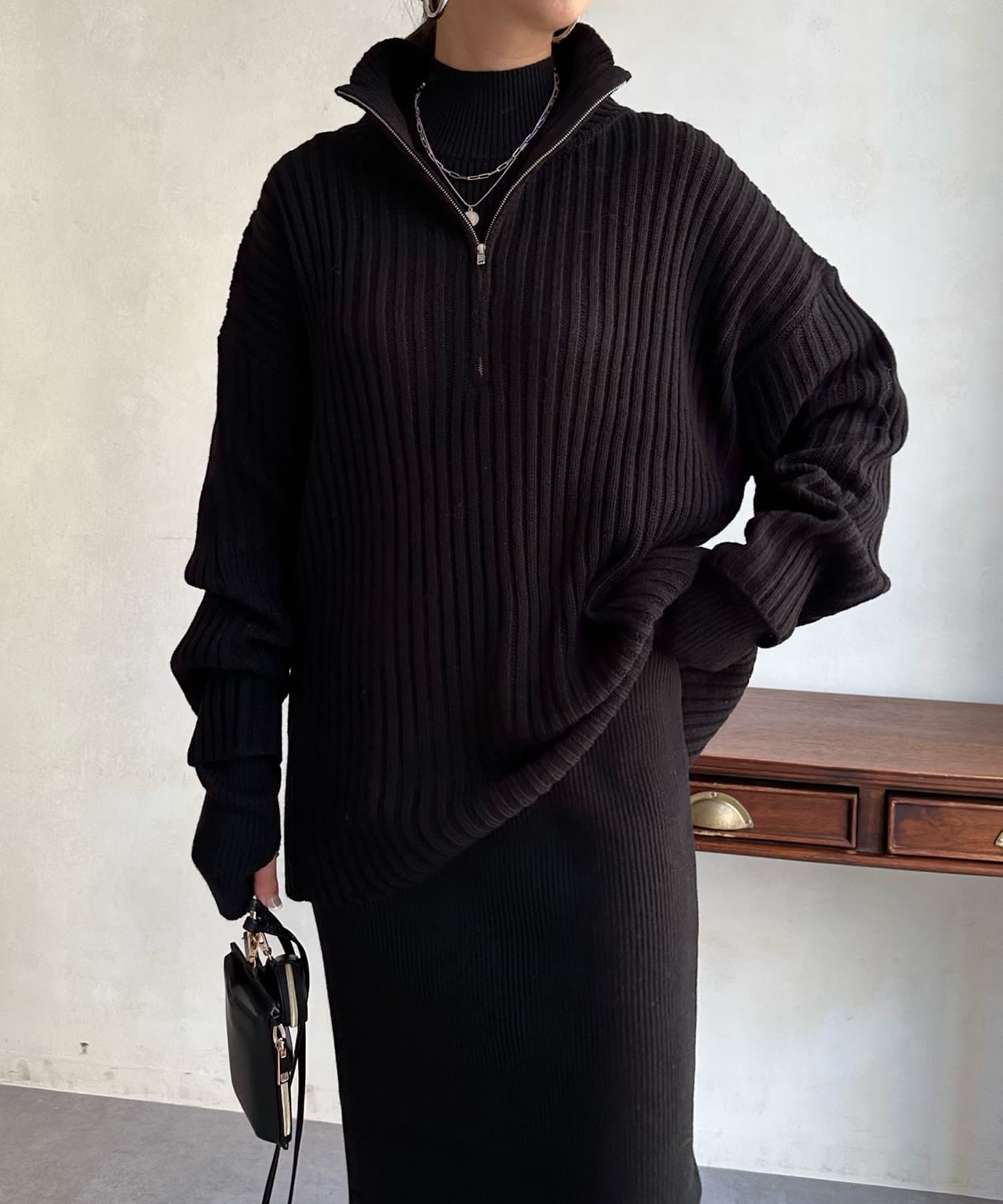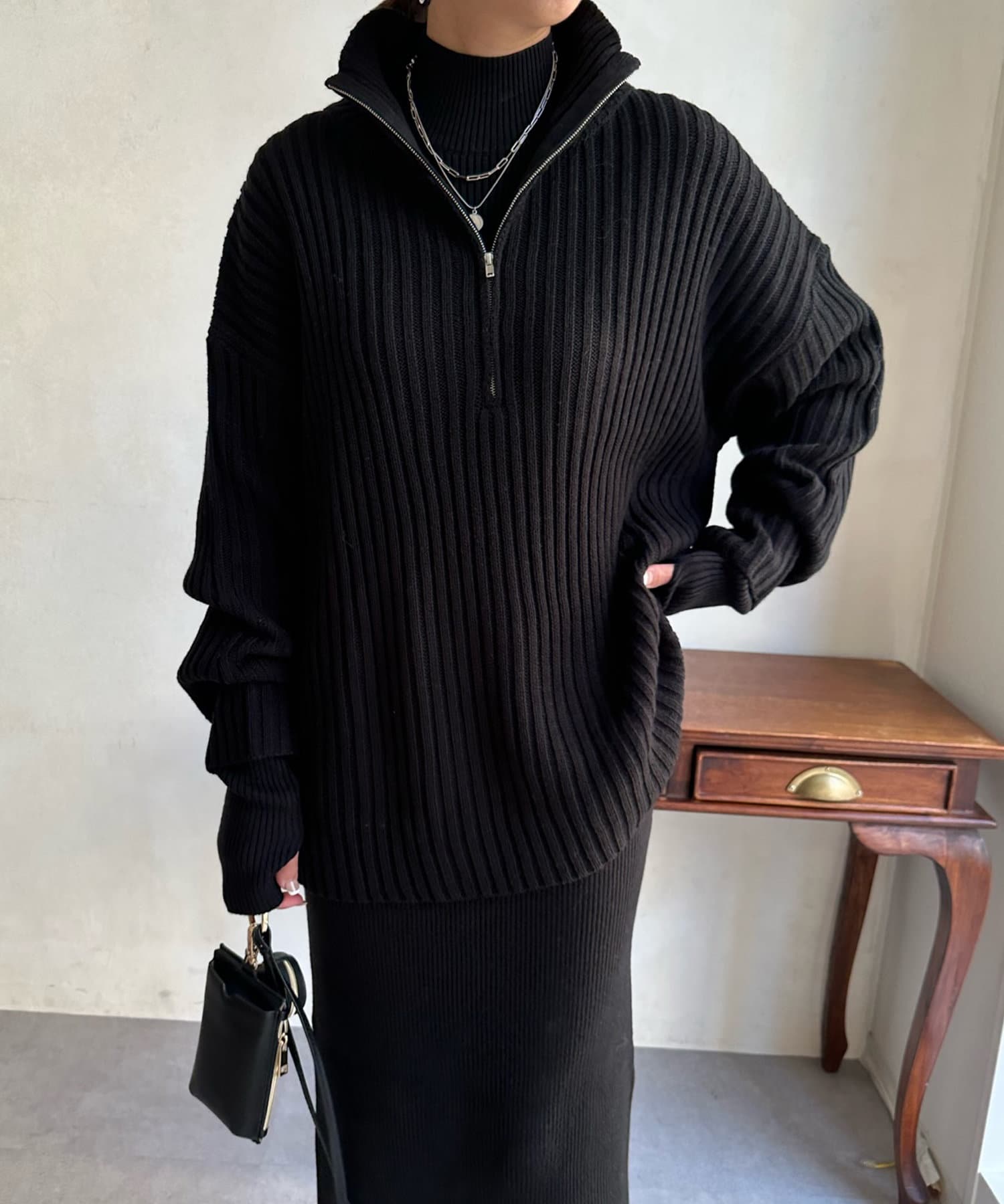 【DouDou】ハーフジッププルオーバー+ニットワンピースセット