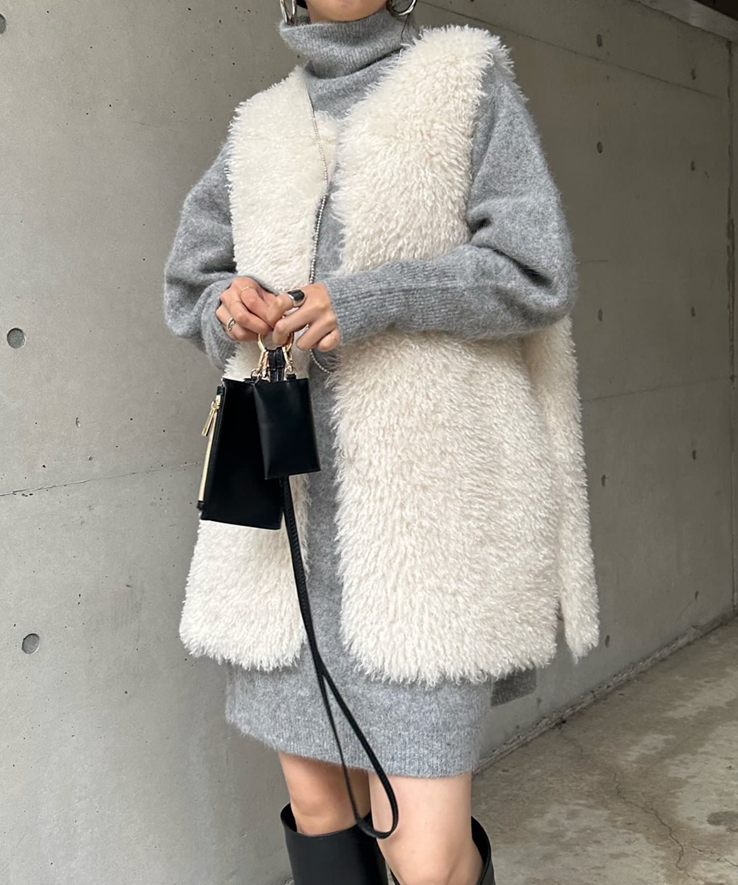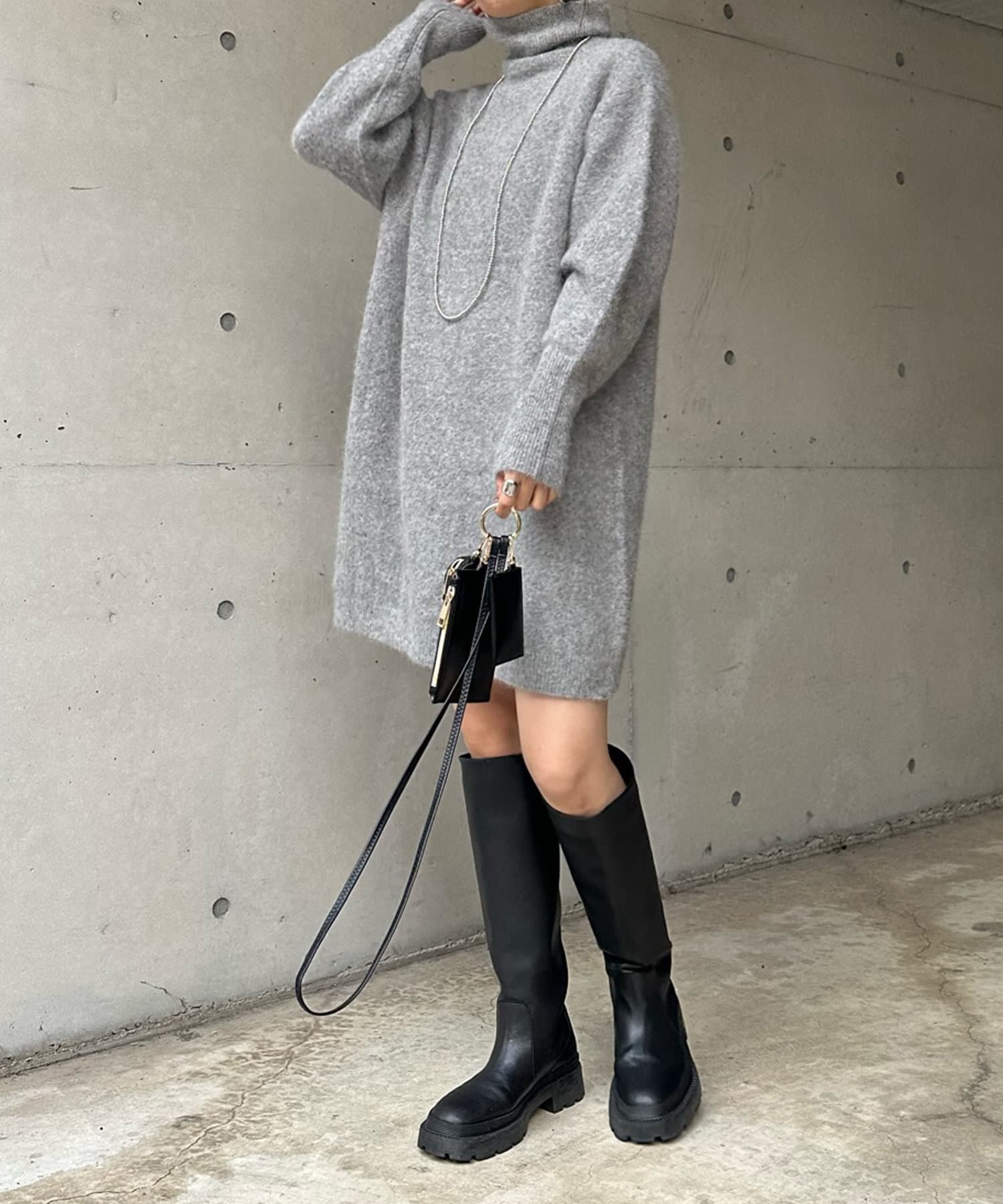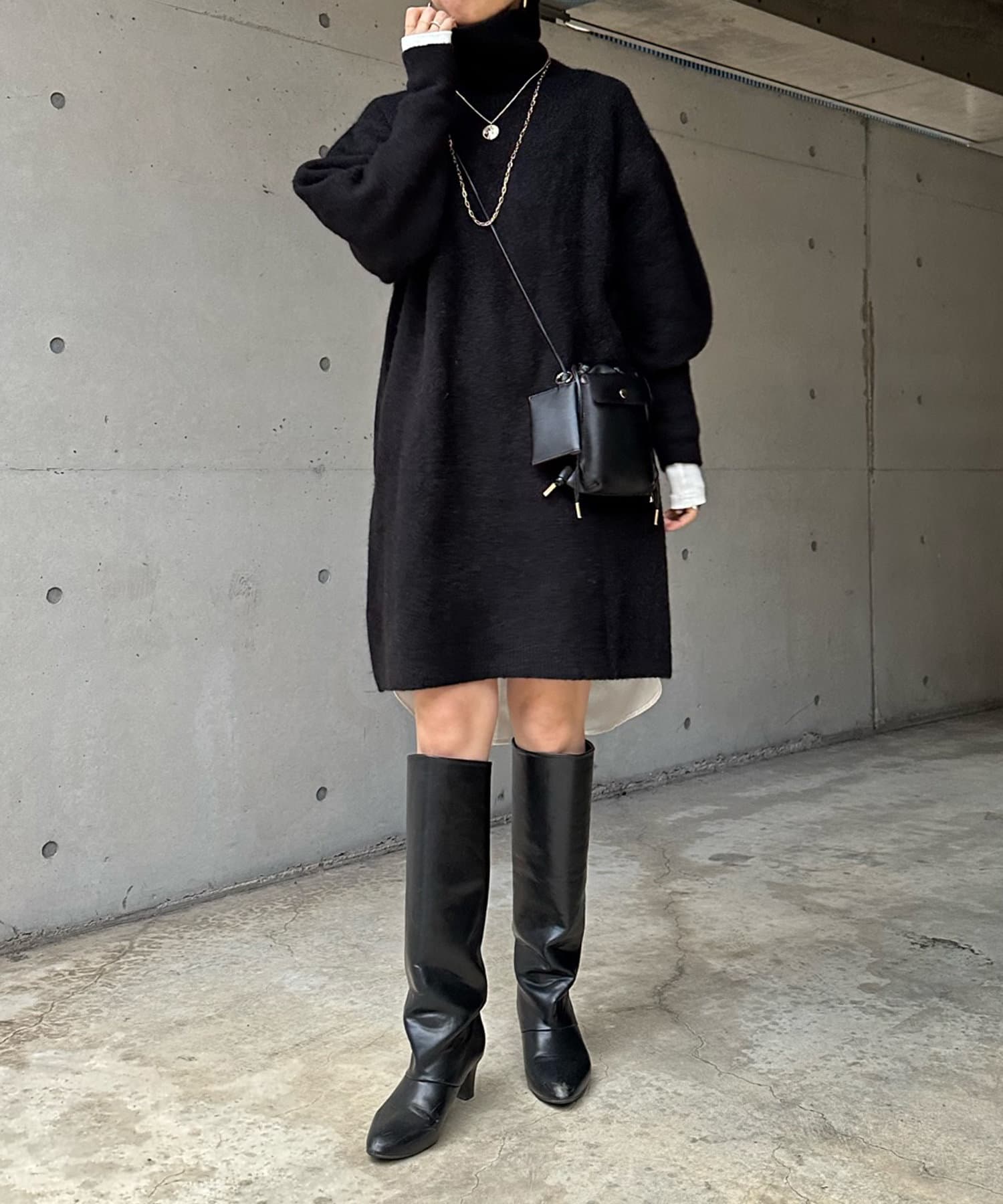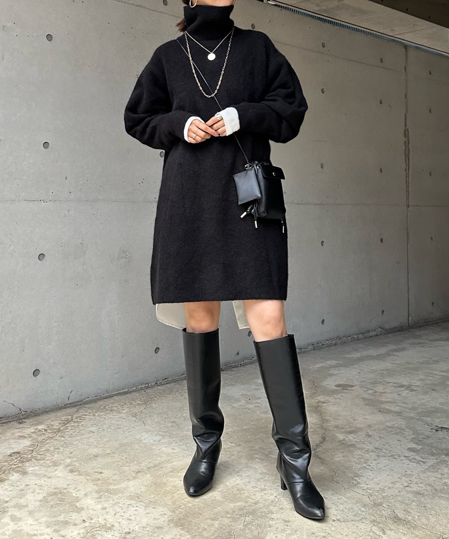 ネックラインは、締め付けない緩めのタートルネックなので、顔周りをすっきりと演出してくれますよ。