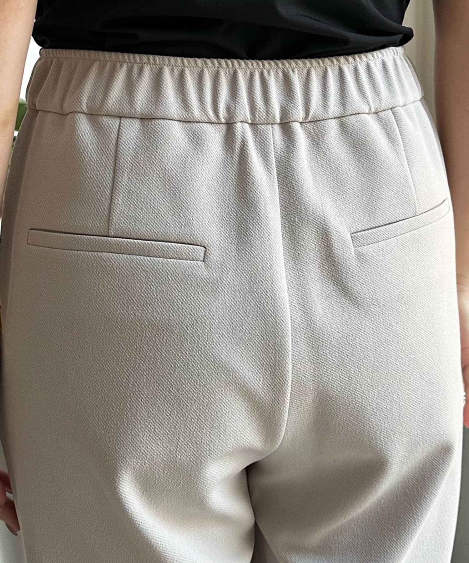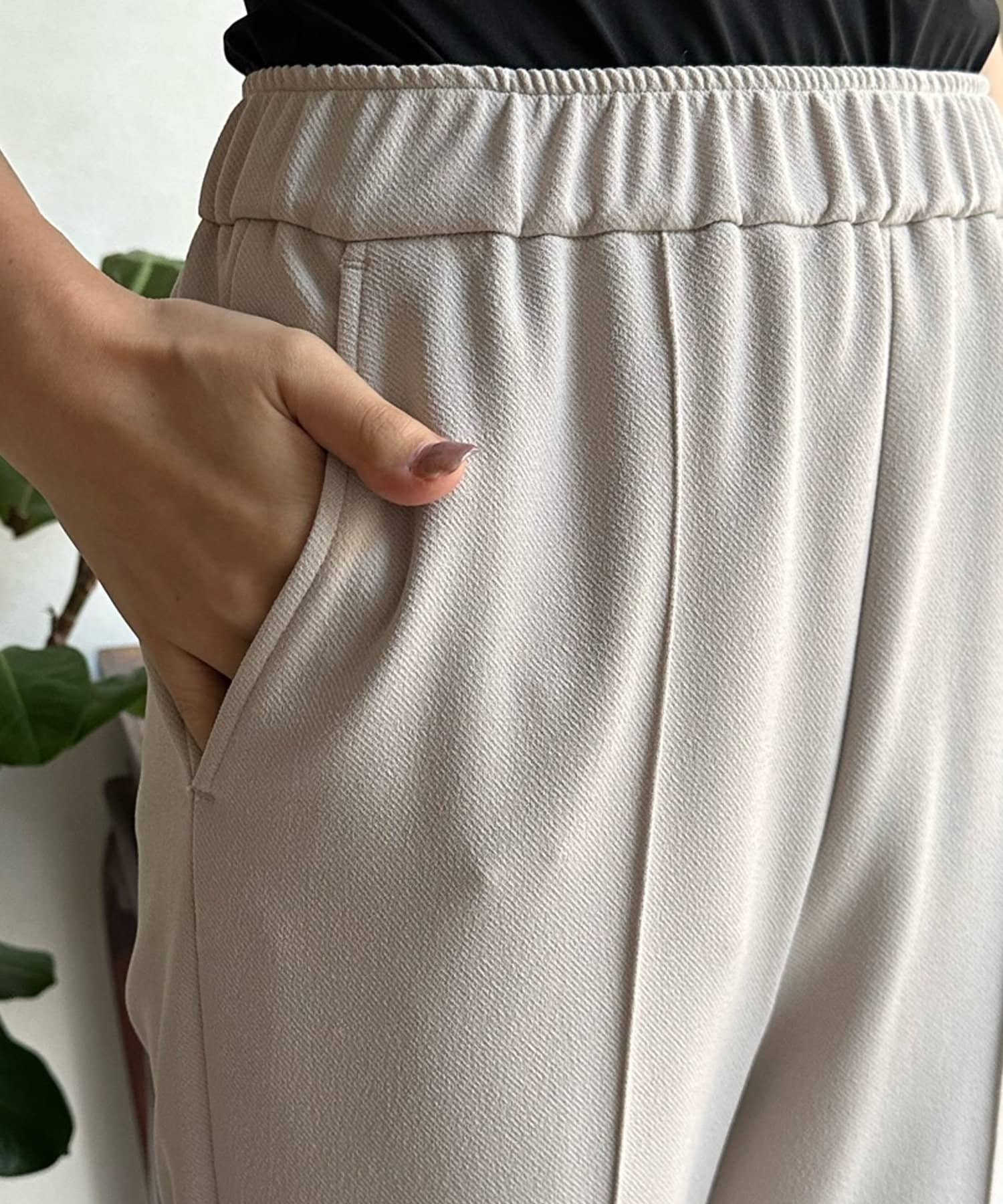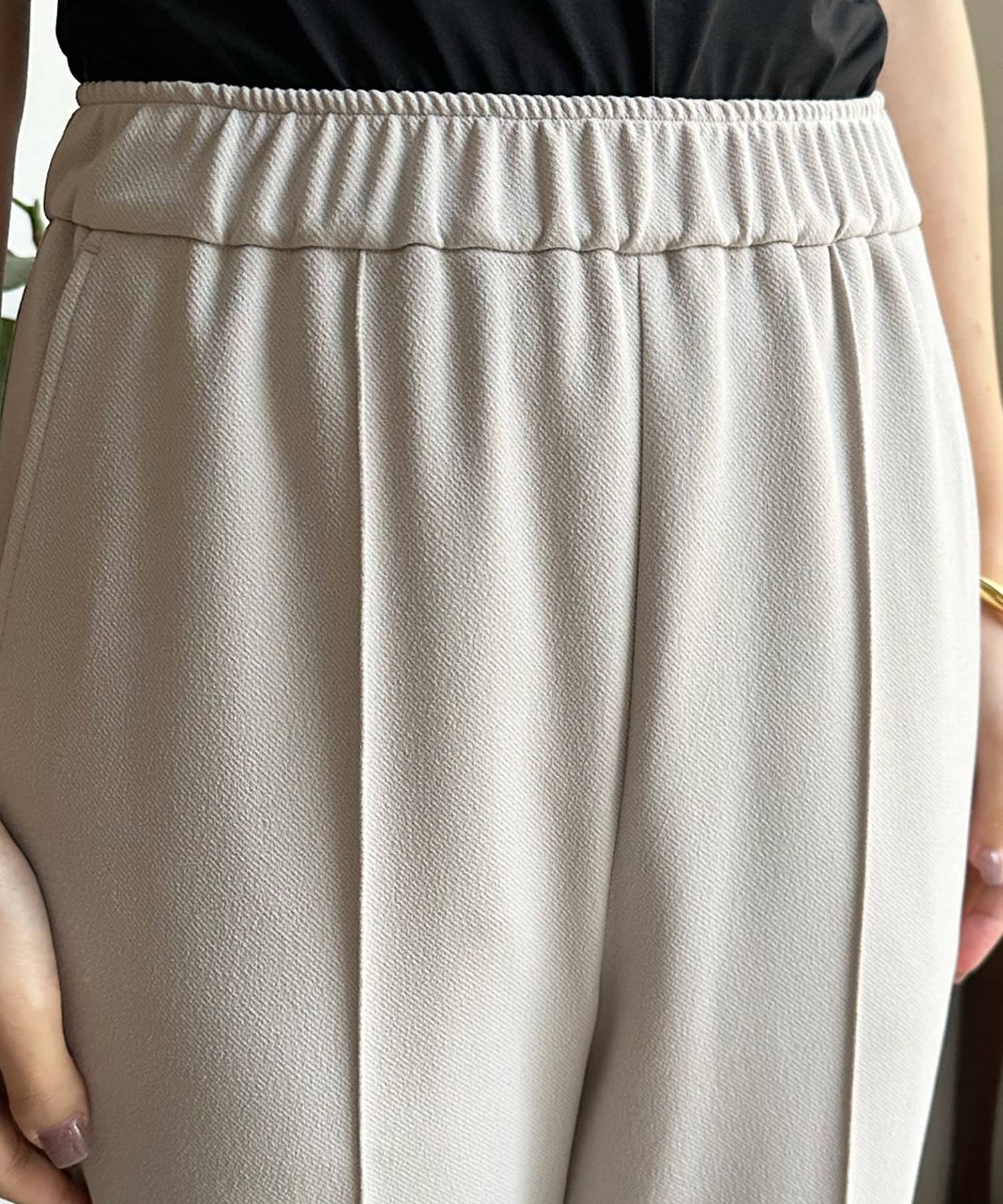 脚が自然ときれいに見えるしっかりと入ったセンタープレス+凹凸感のある素材感が、上品見えする1着に。