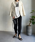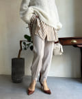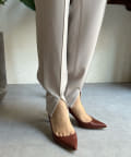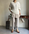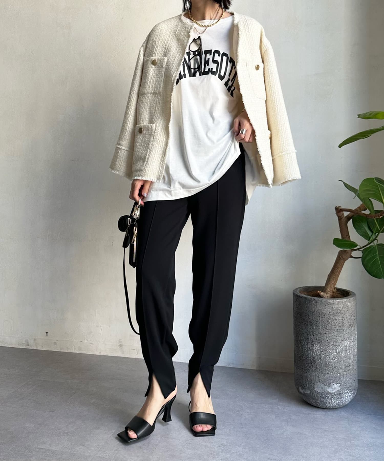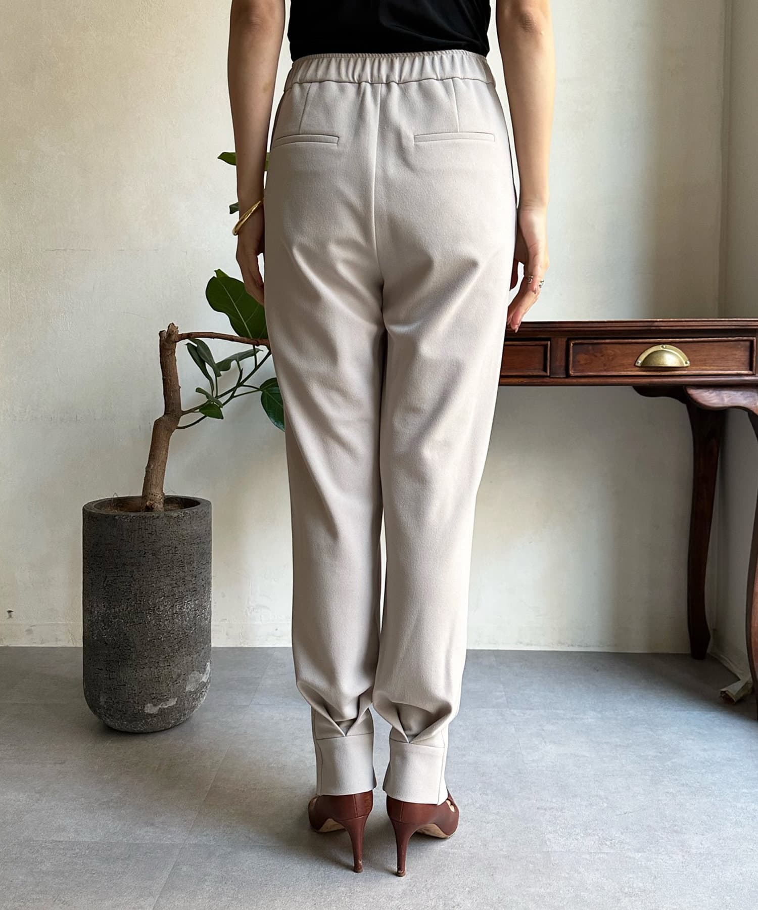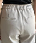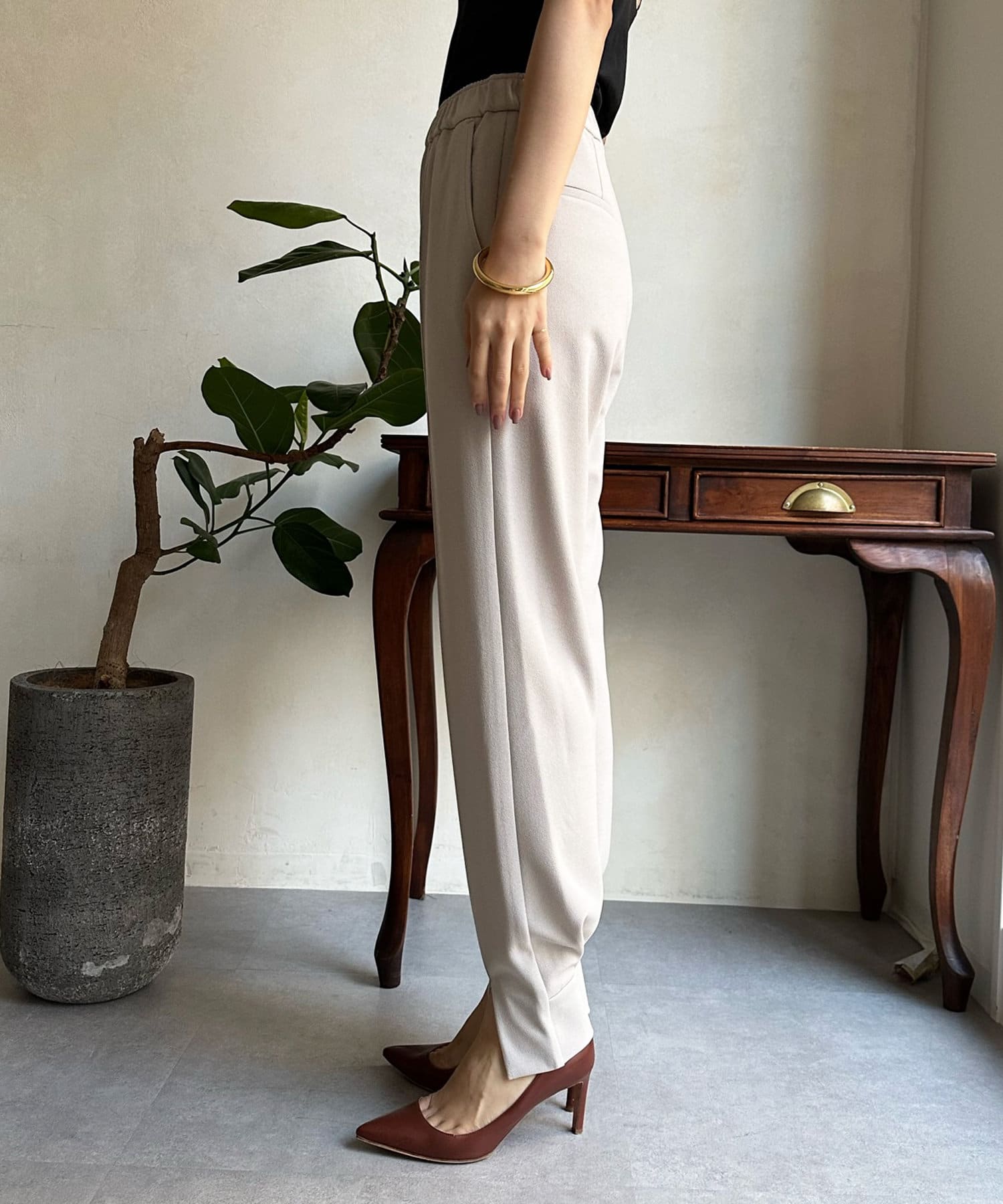 脚が自然ときれいに見えるしっかりと入ったセンタープレス+凹凸感のある素材感が、上品見えする1着に。