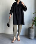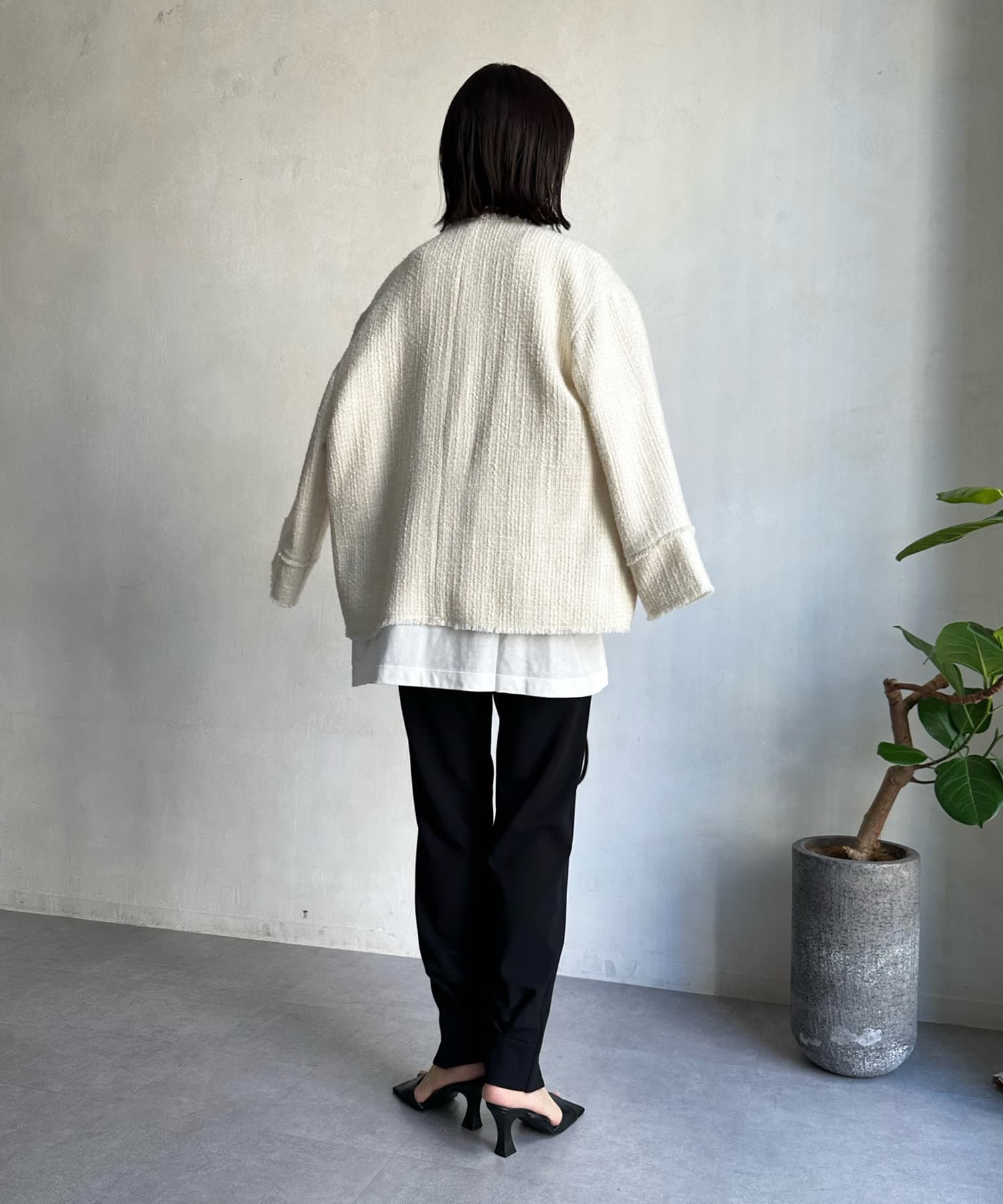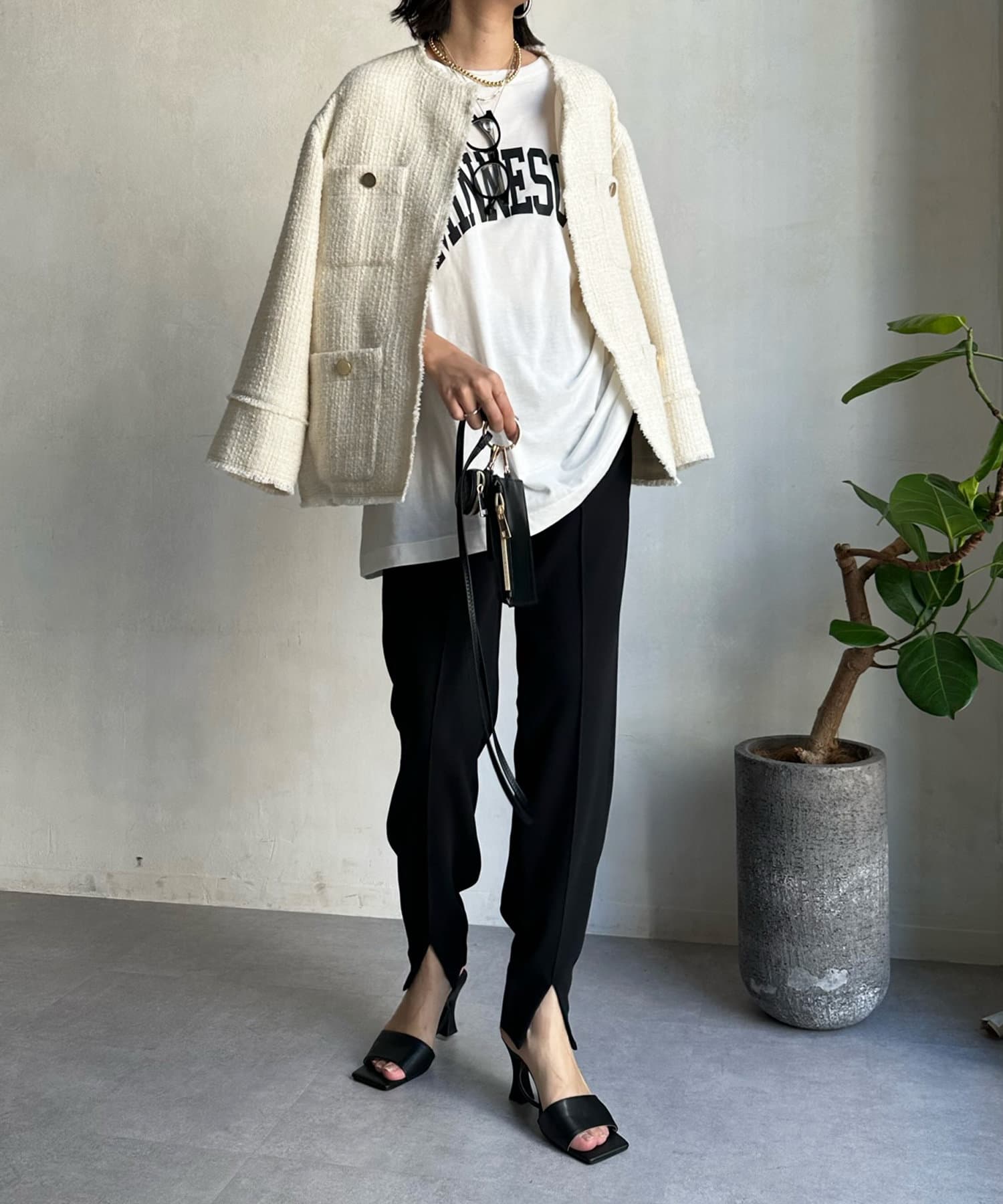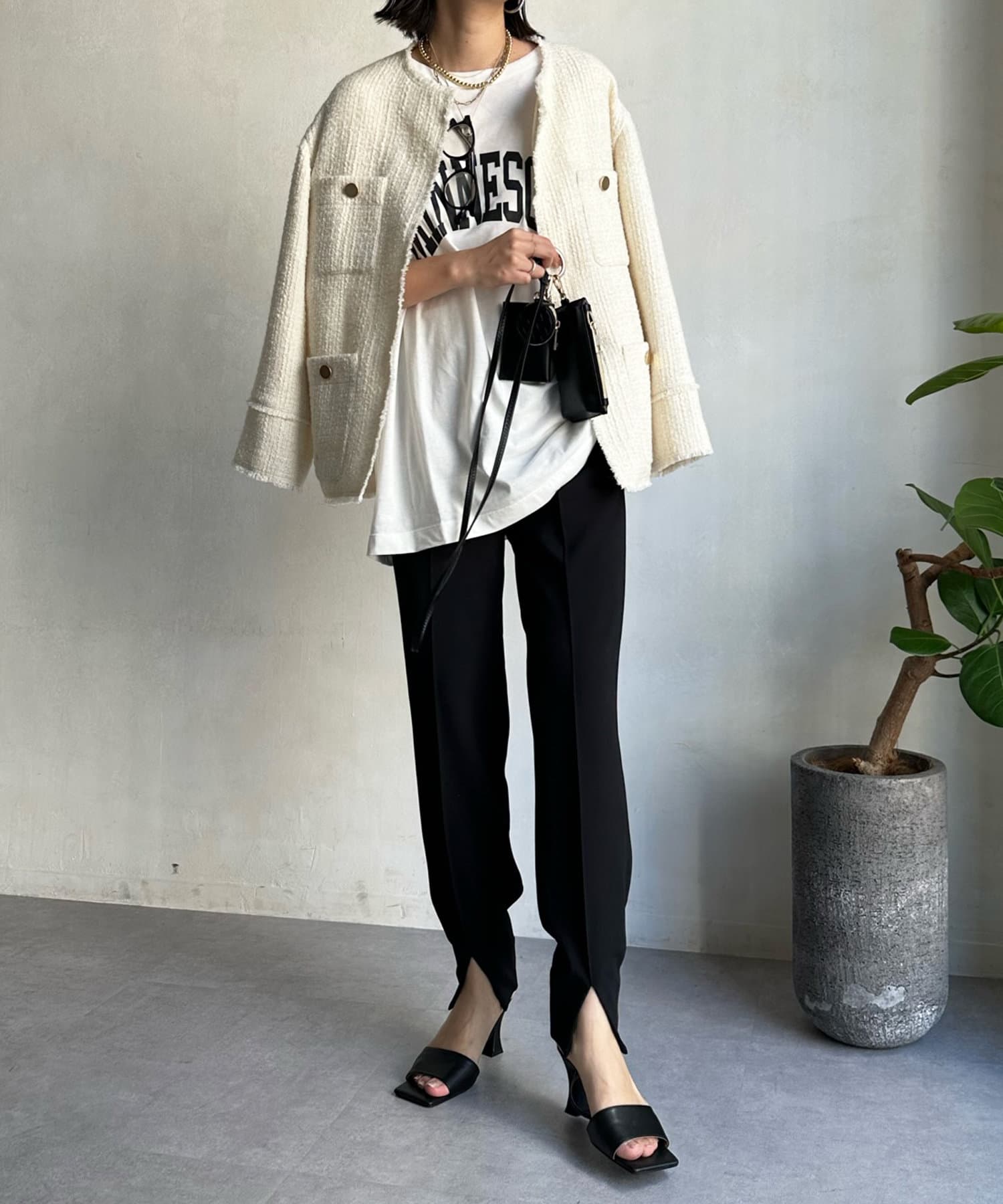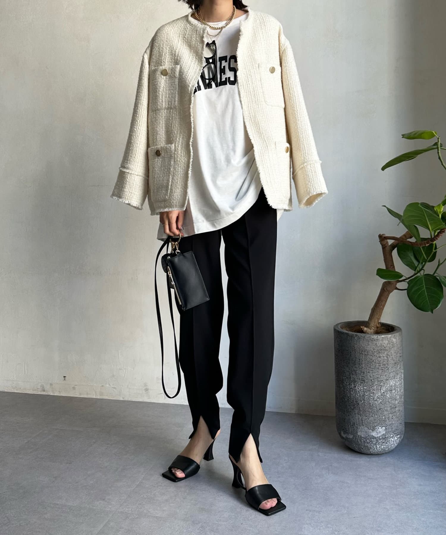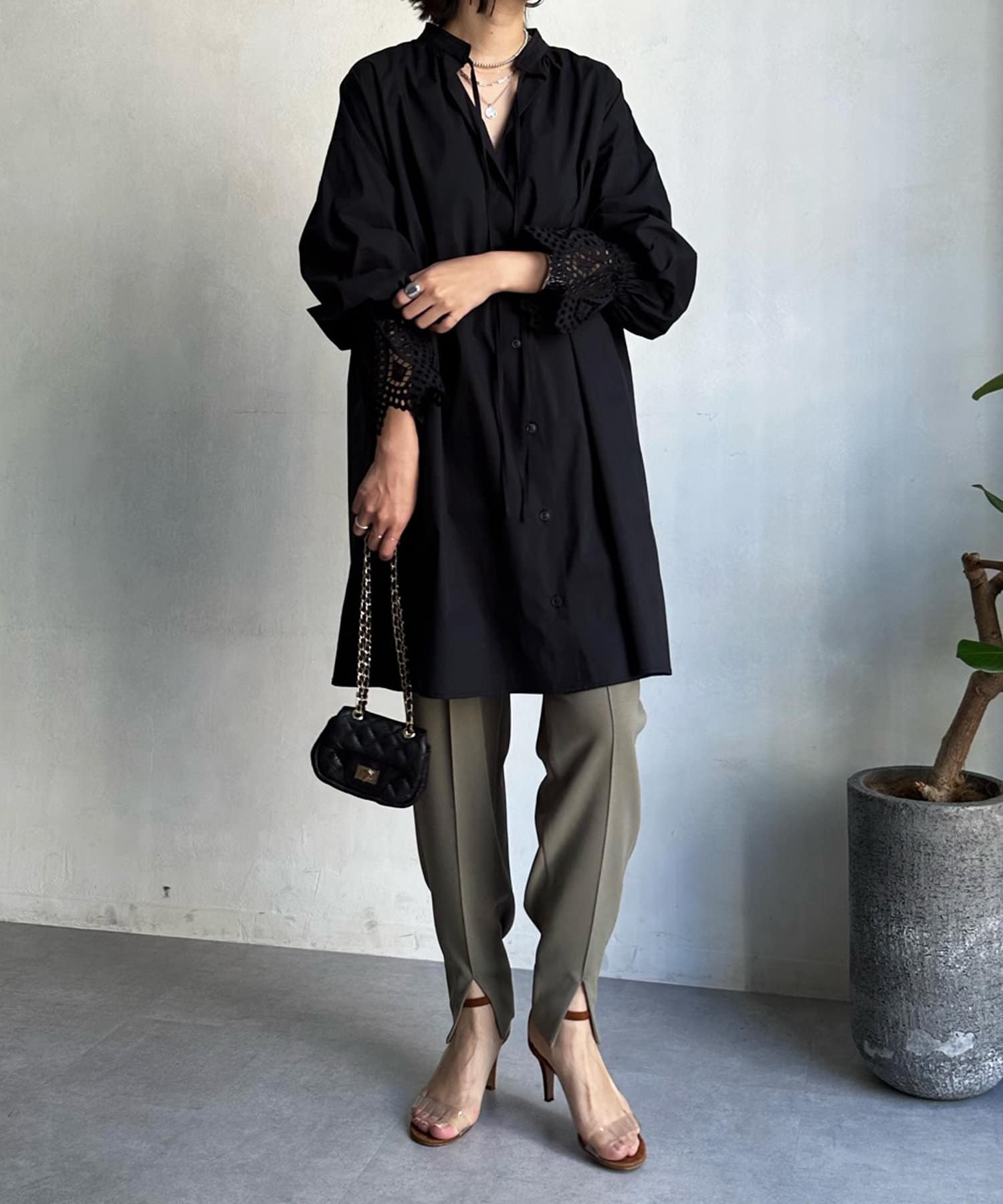 フロント裾にはスリットを施し、バックにはたぷっと溜まるボリューム感を作る、タックをプラス。