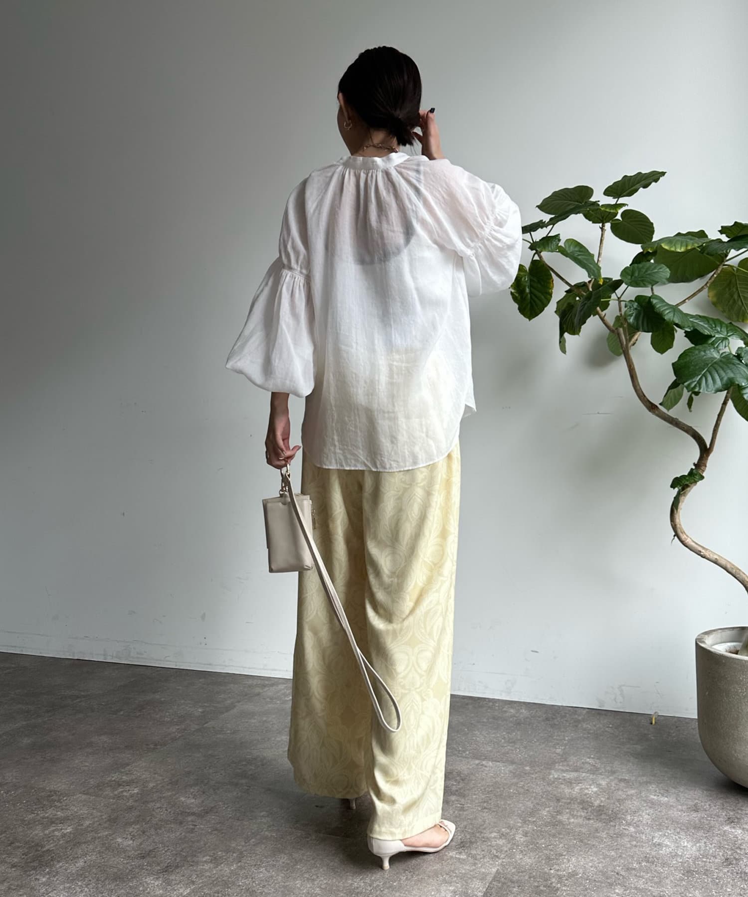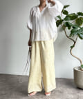 ゆとりのあるワイドパンツなので、タンクトップをインしたり、シャツやTシャツのフロントを少しインしてバランスを取る着こなし方がおすすめですよ。