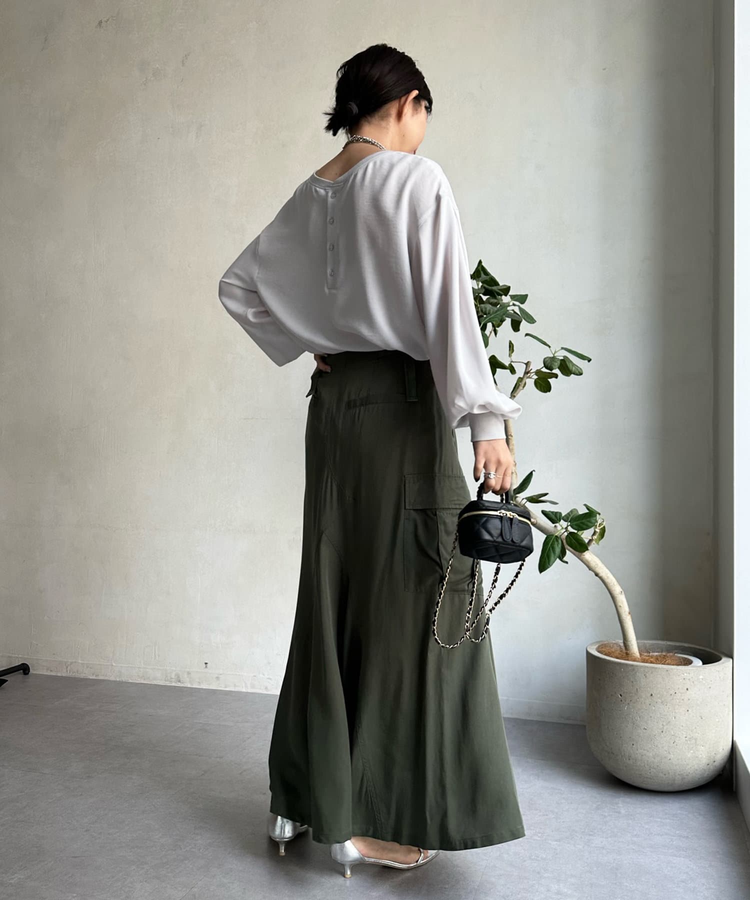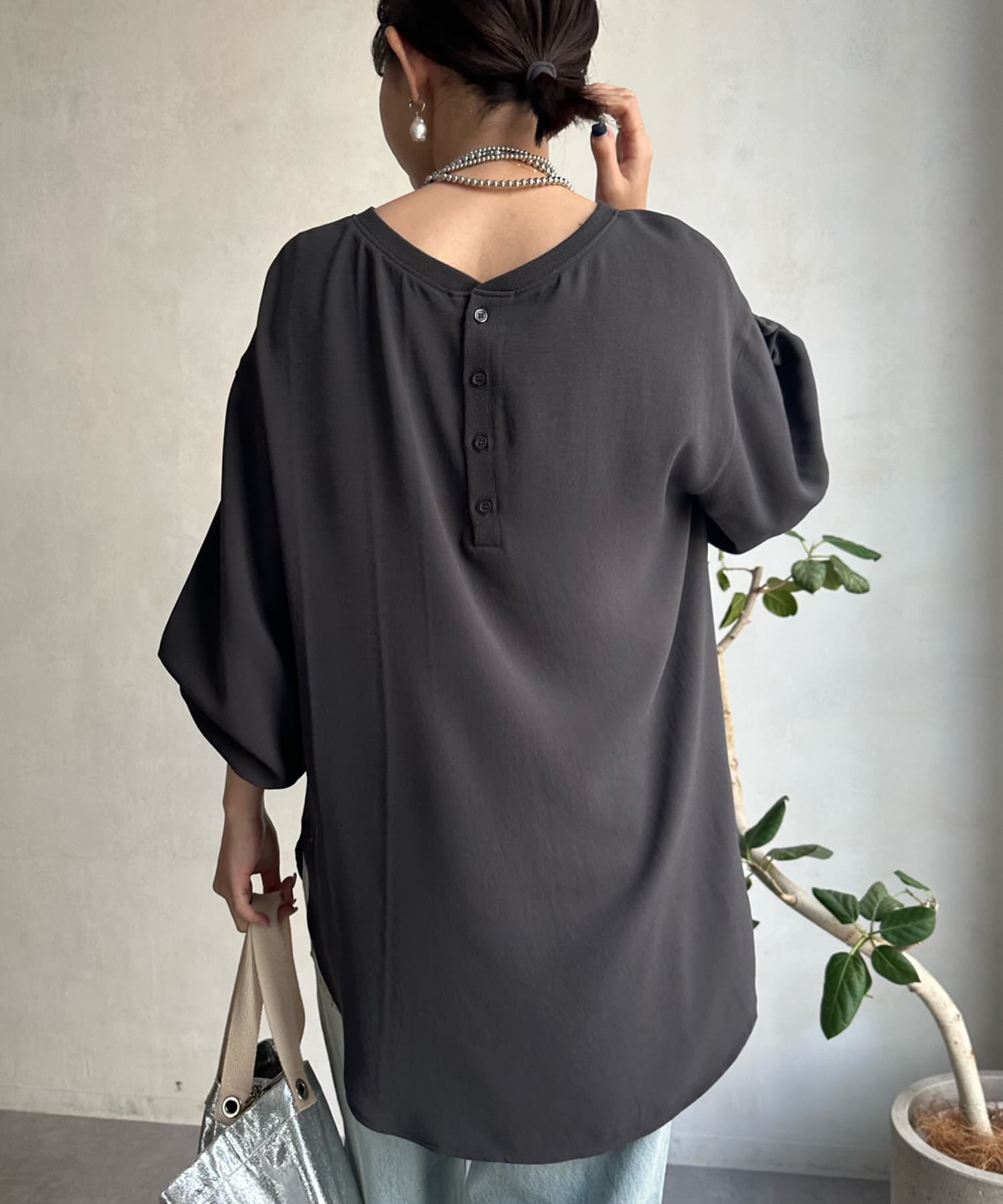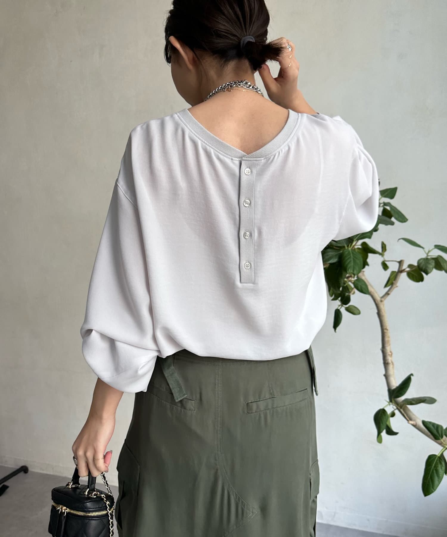 そして、バックネック部分のボタンデザインや裾のカットなどで程よく抜け感のあるカジュアルさをプラスします。
