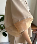 袖口をシアー素材に切り替えることで重たい印象にならず、サマ見えするワンポイントにも。