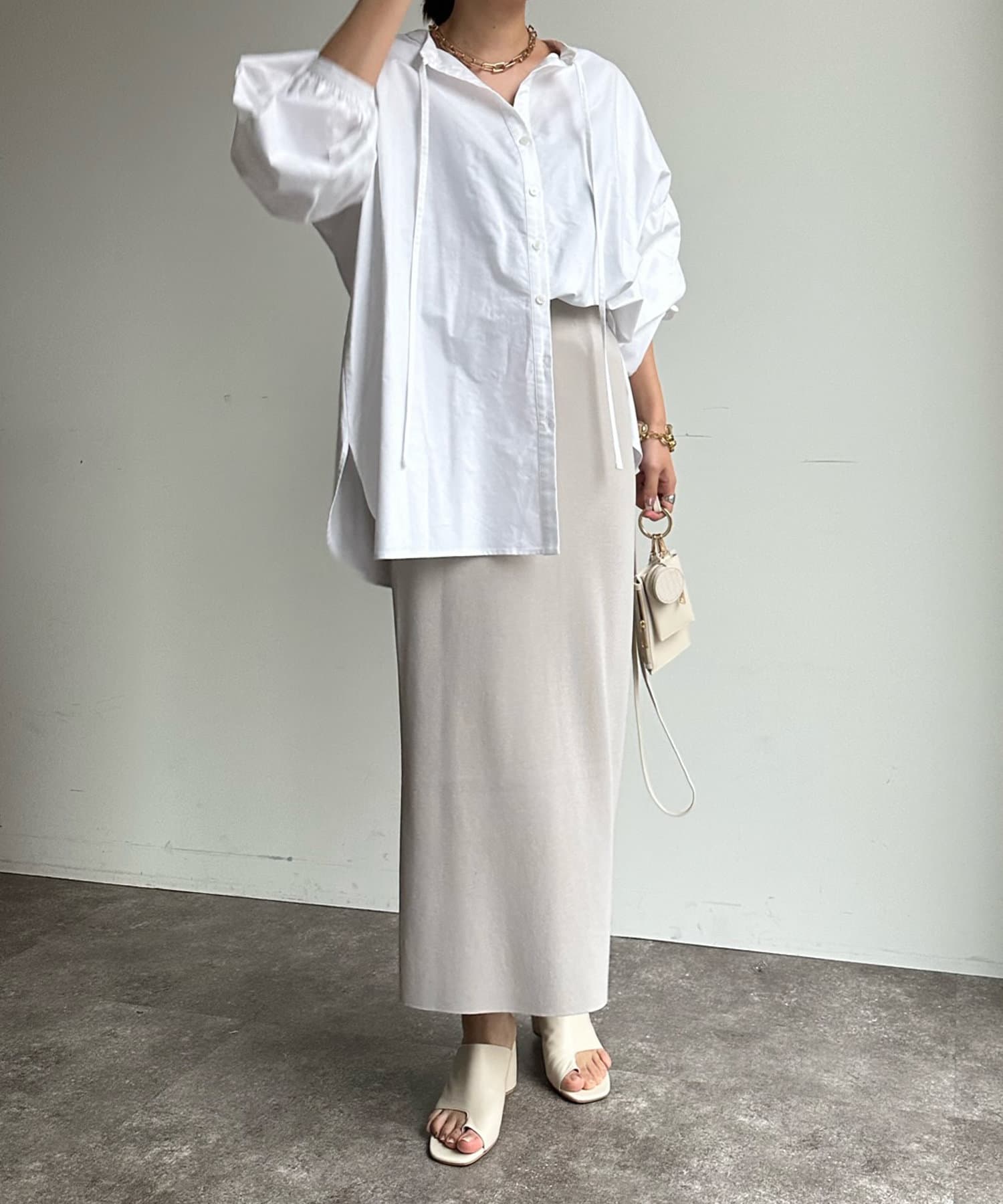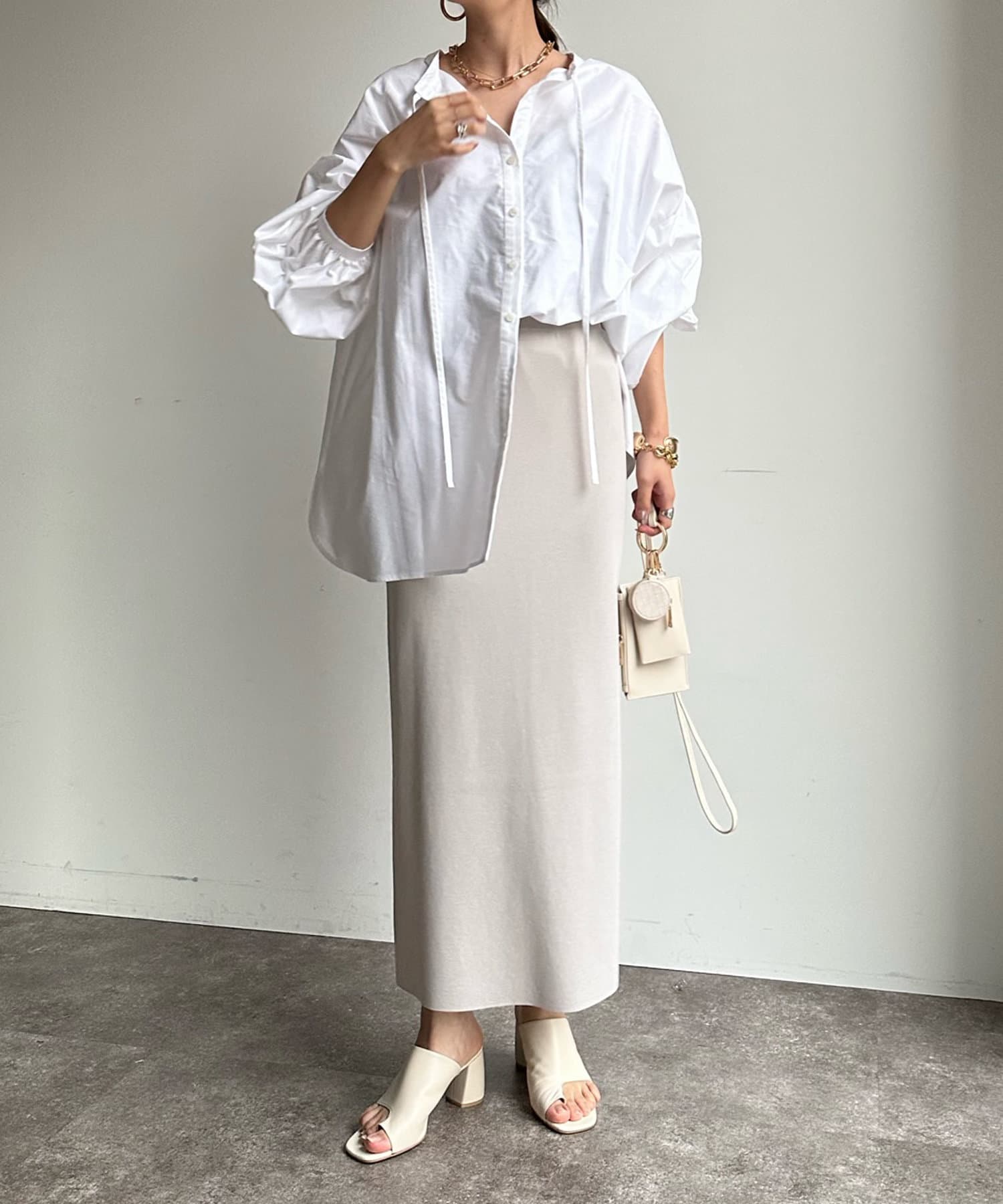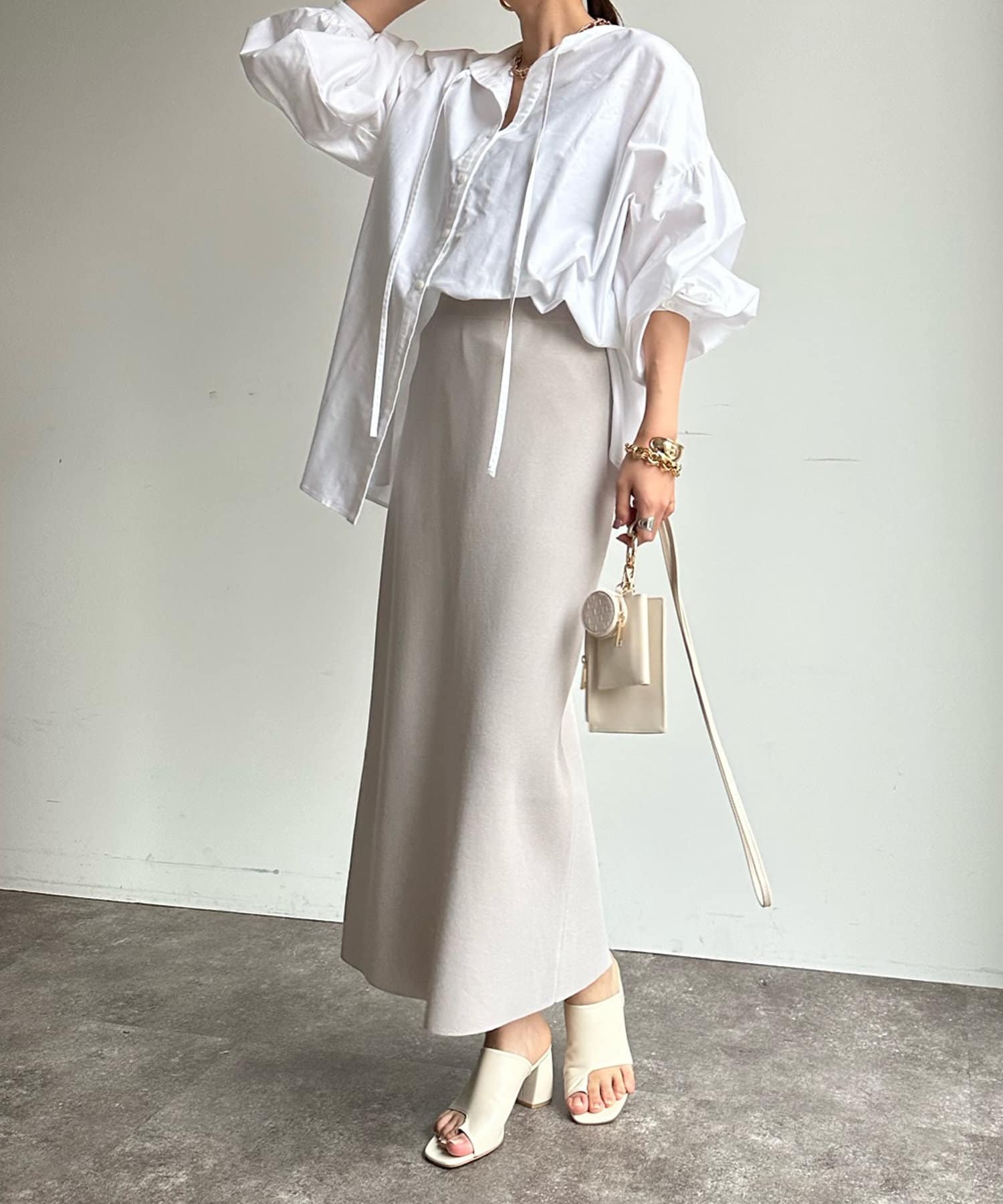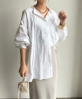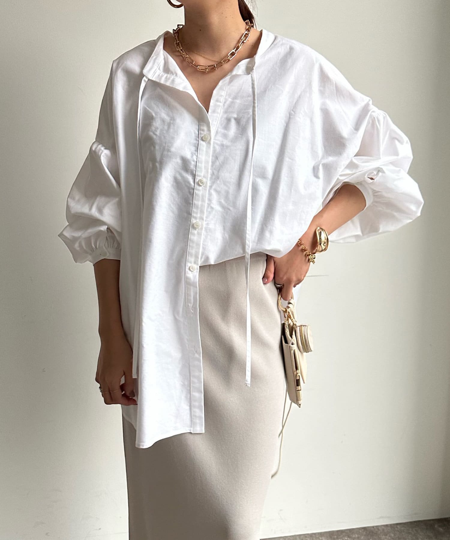 お顔周りがすっきりと見えるスキッパーデザインで、首元にはトレンド感のあるリボンをプラス。