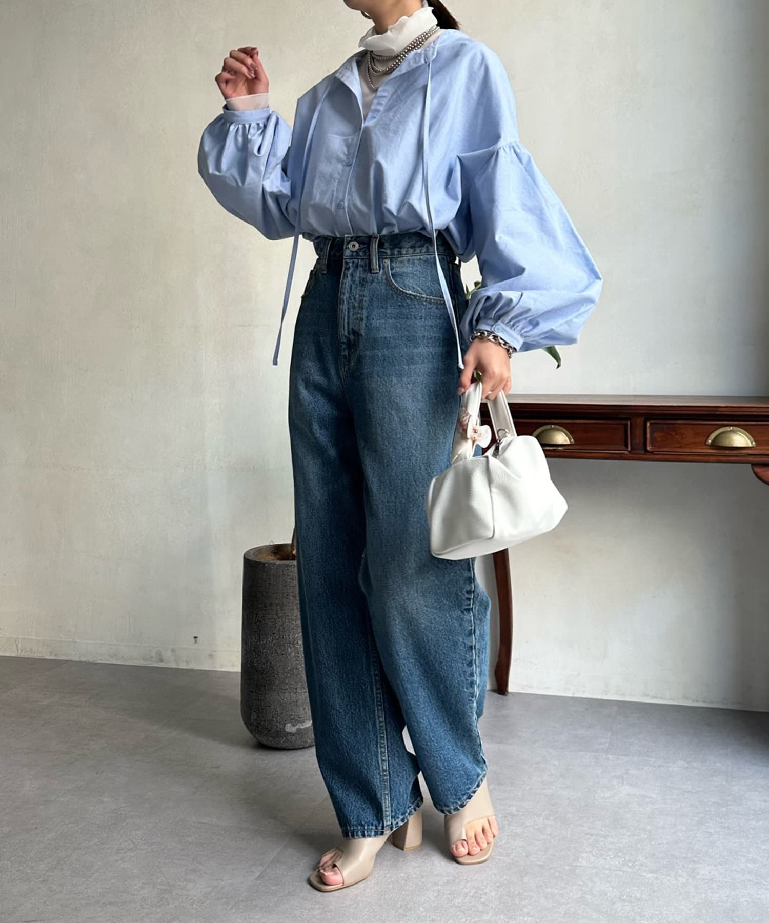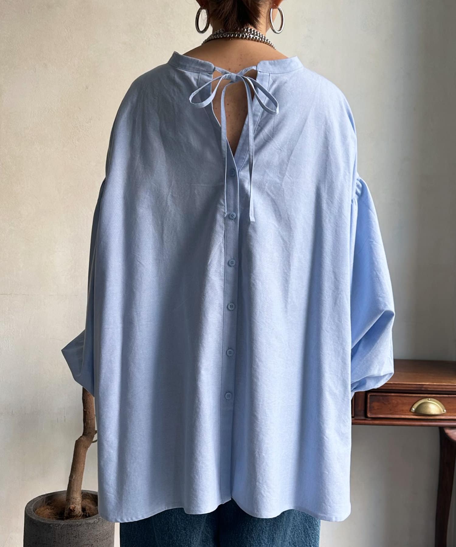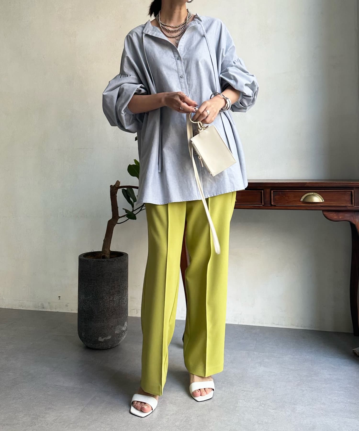 お顔周りがすっきりと見えるスキッパーデザインで、首元にはトレンド感のあるリボンをプラス。