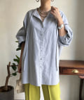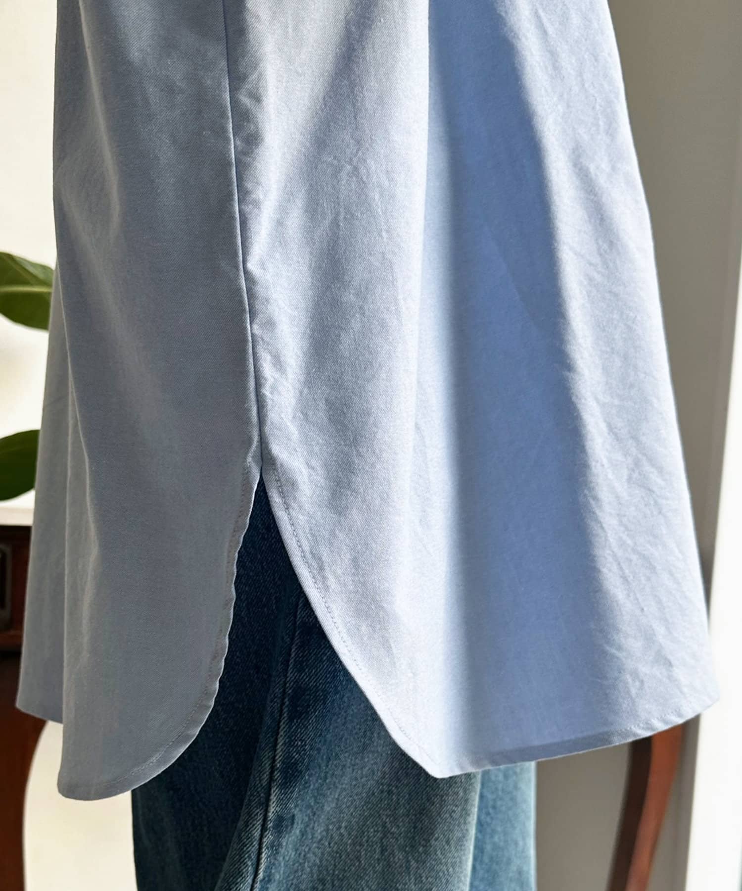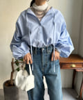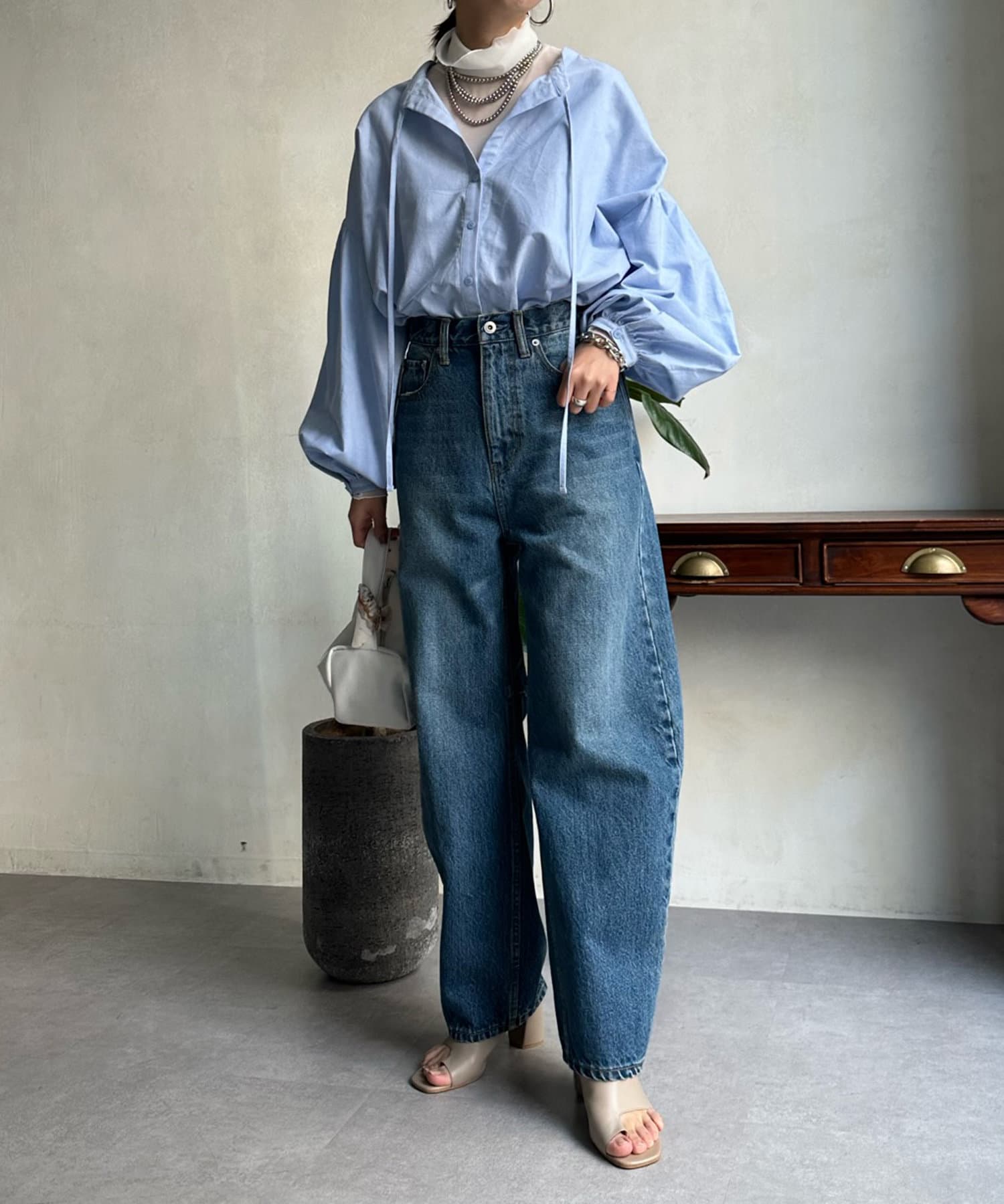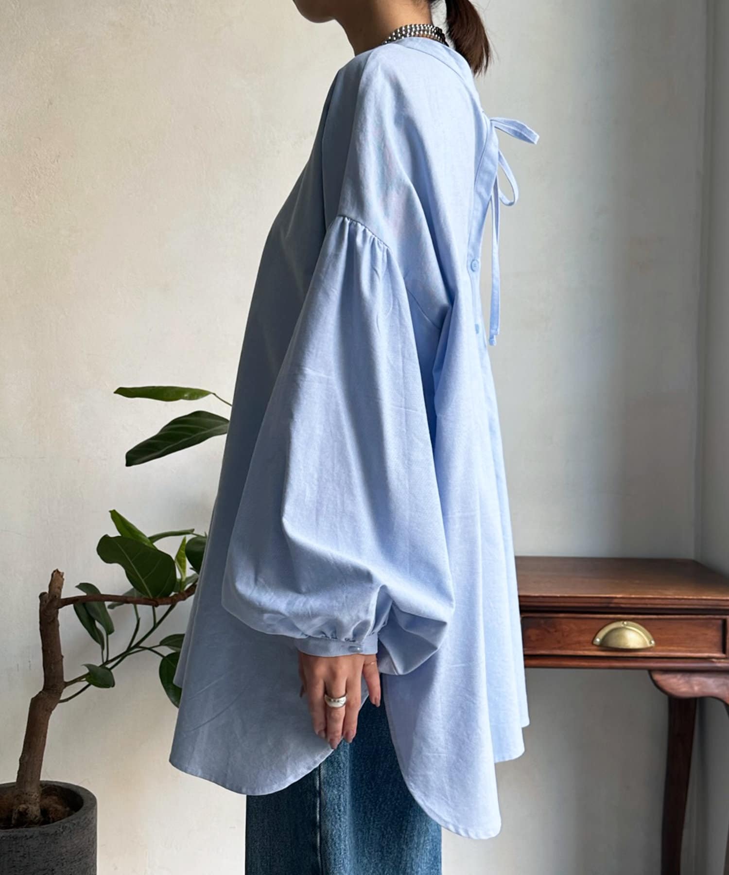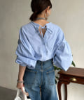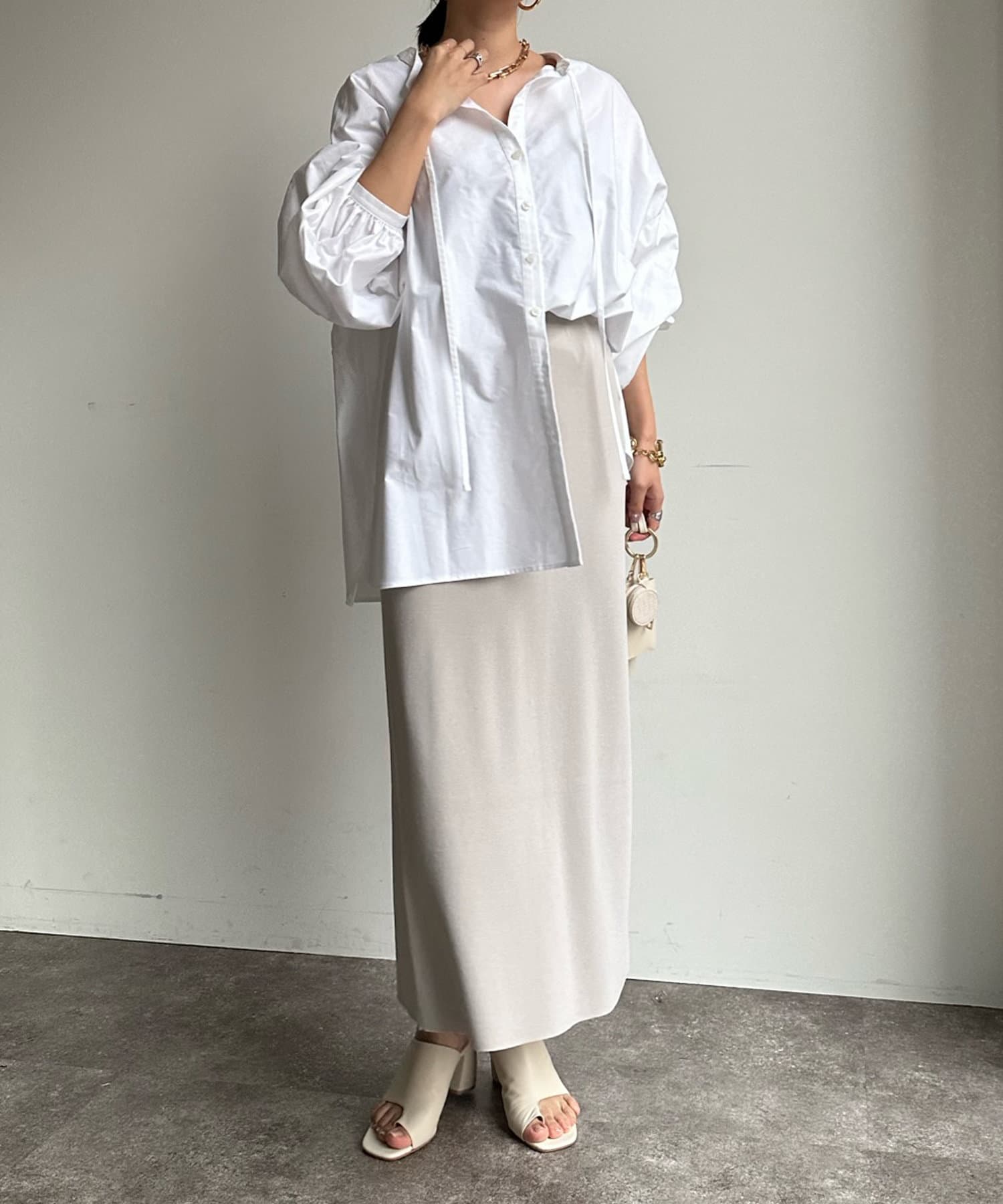 お顔周りがすっきりと見えるスキッパーデザインで、首元にはトレンド感のあるリボンをプラス。