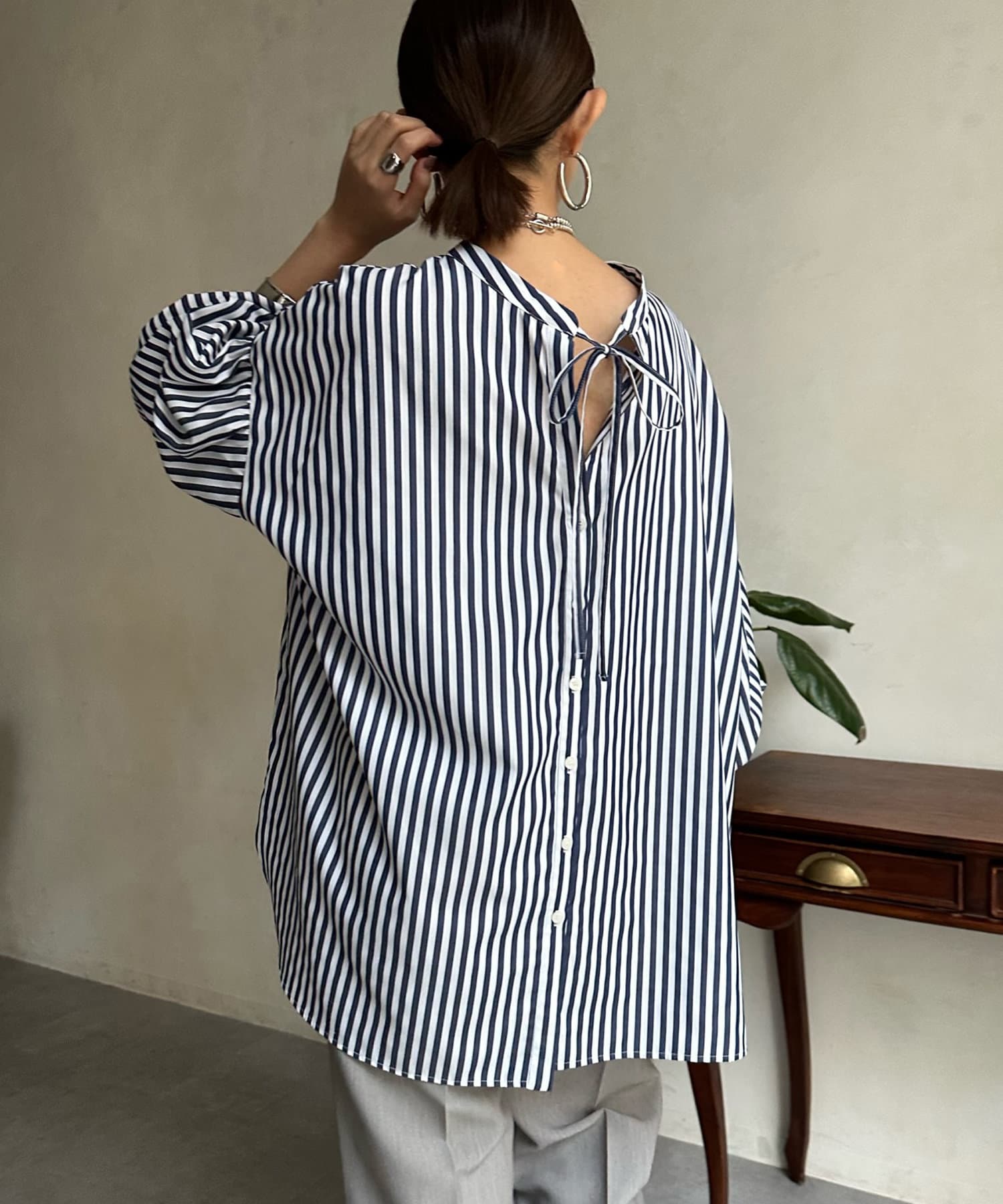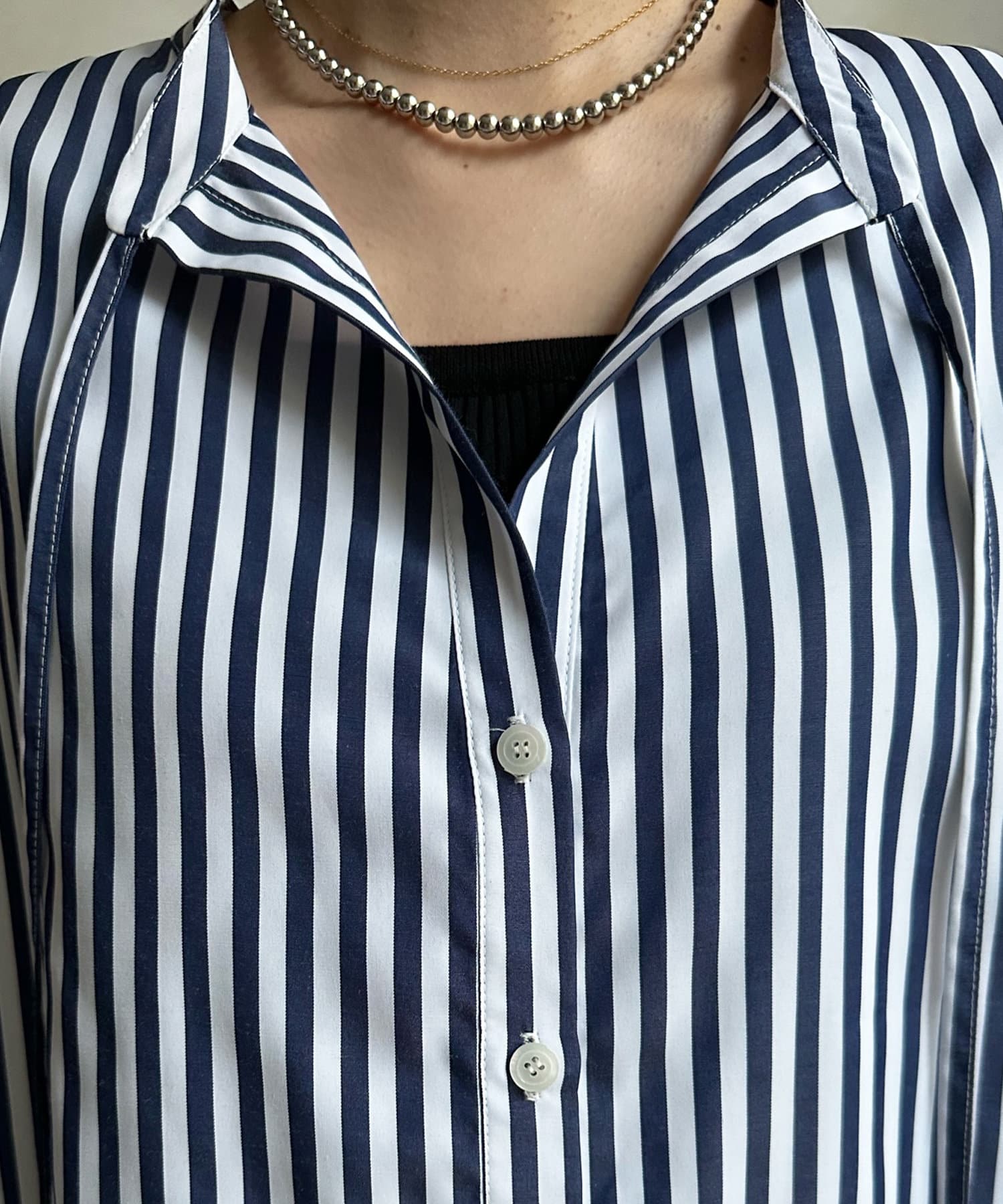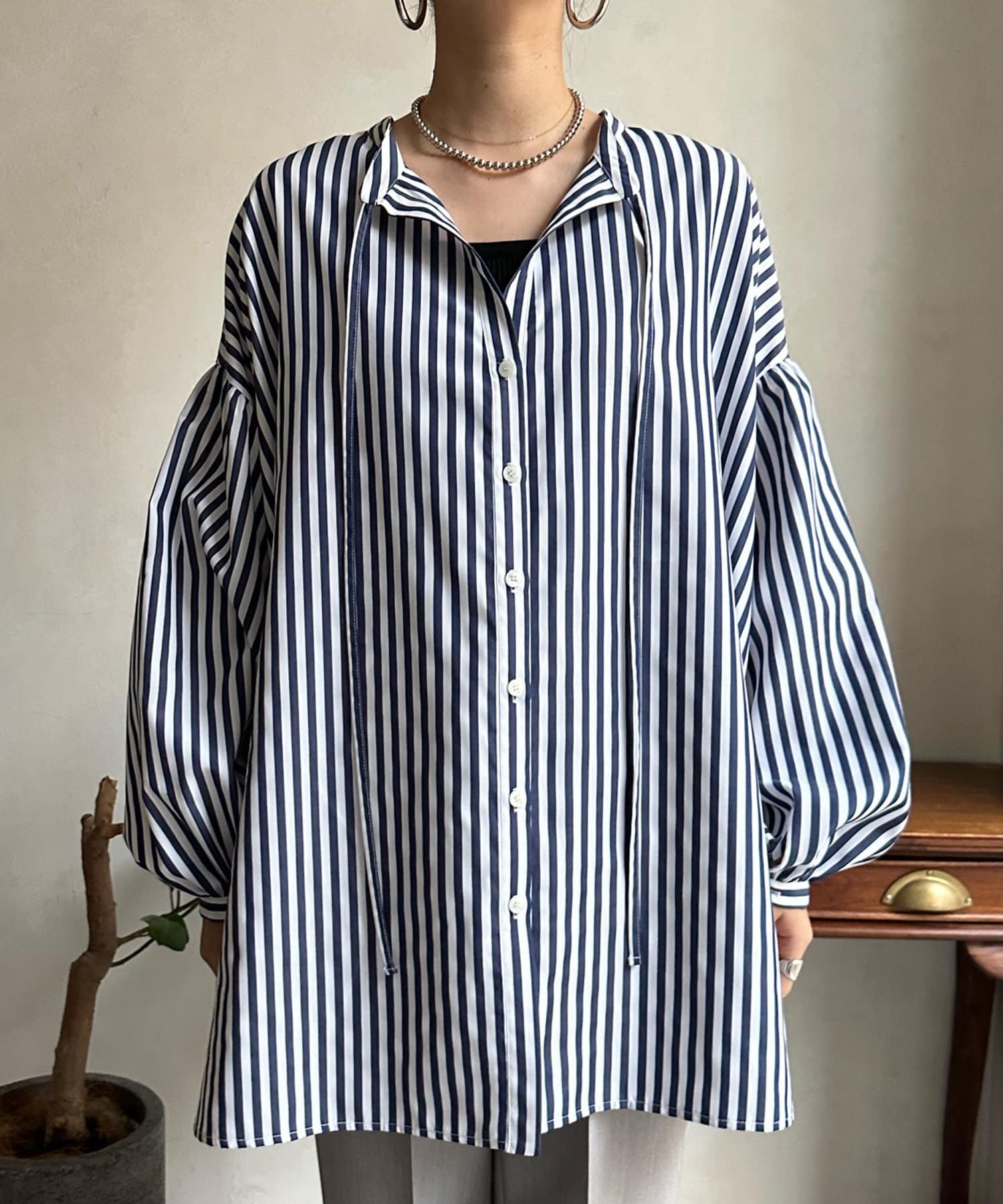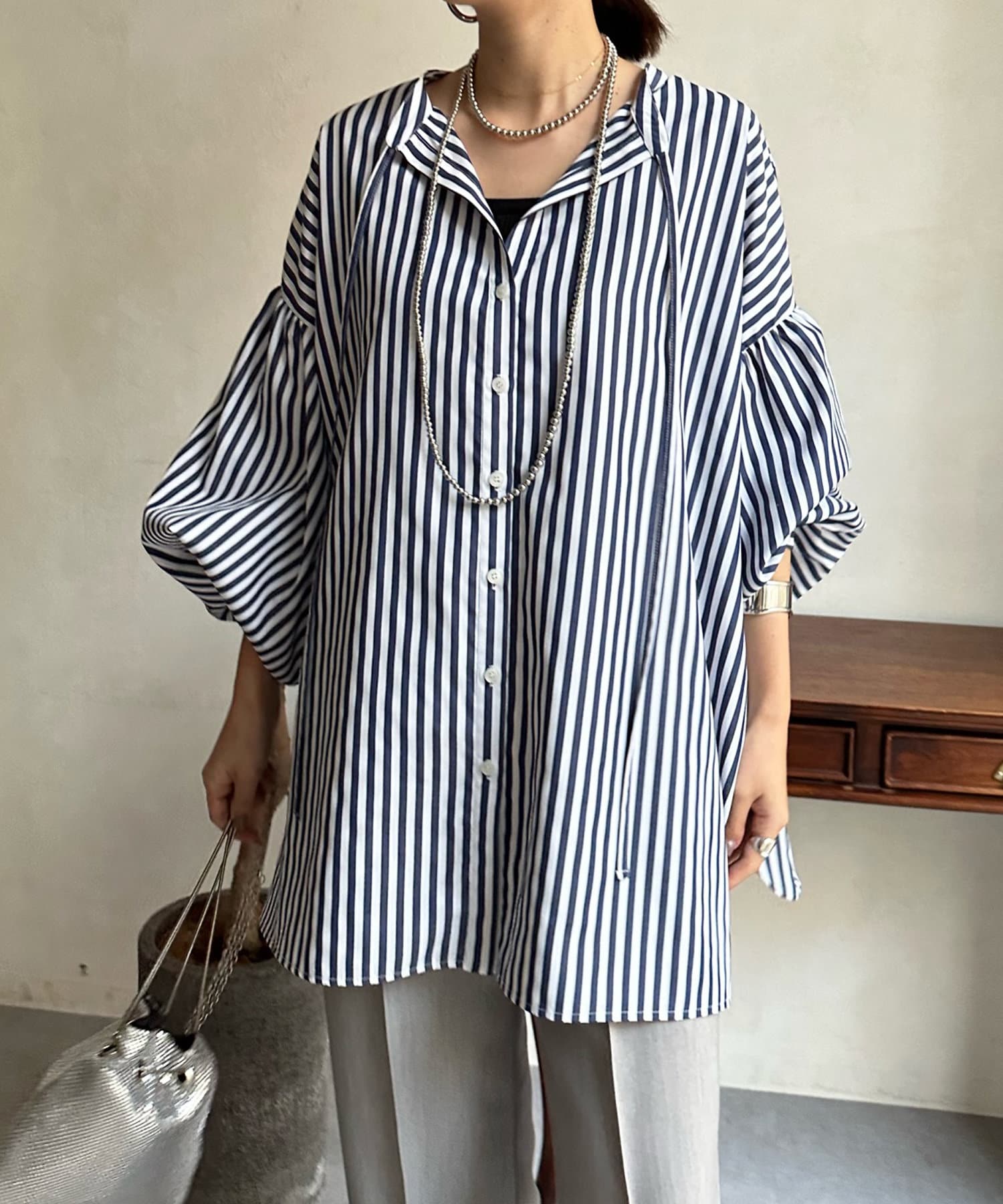 お顔周りがすっきりと見えるスキッパーデザインで、首元にはトレンド感のあるリボンをプラス。
