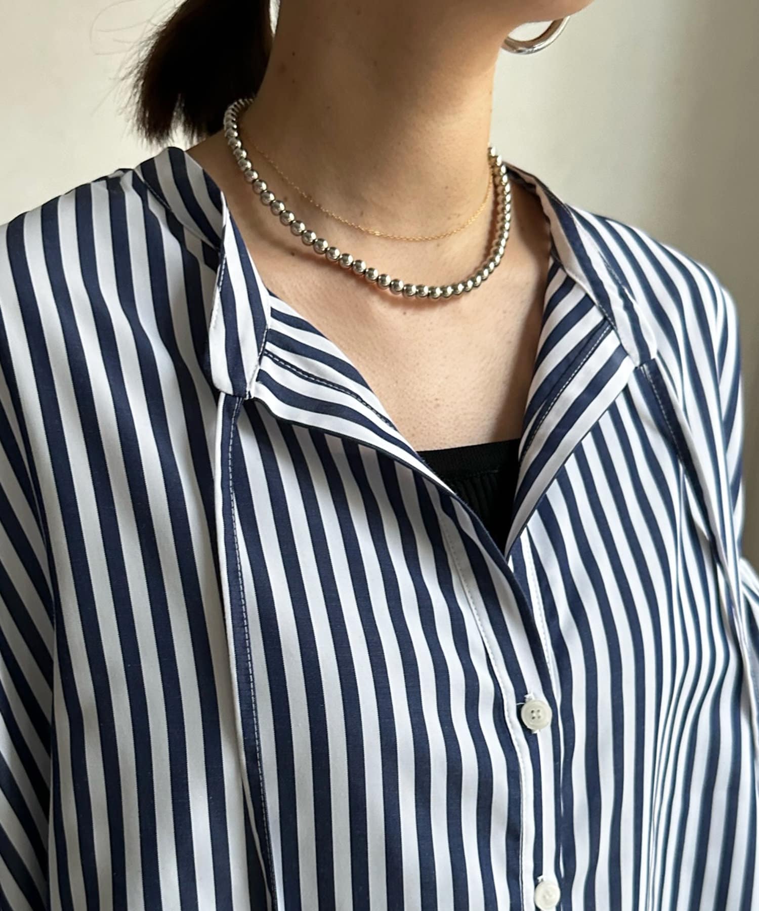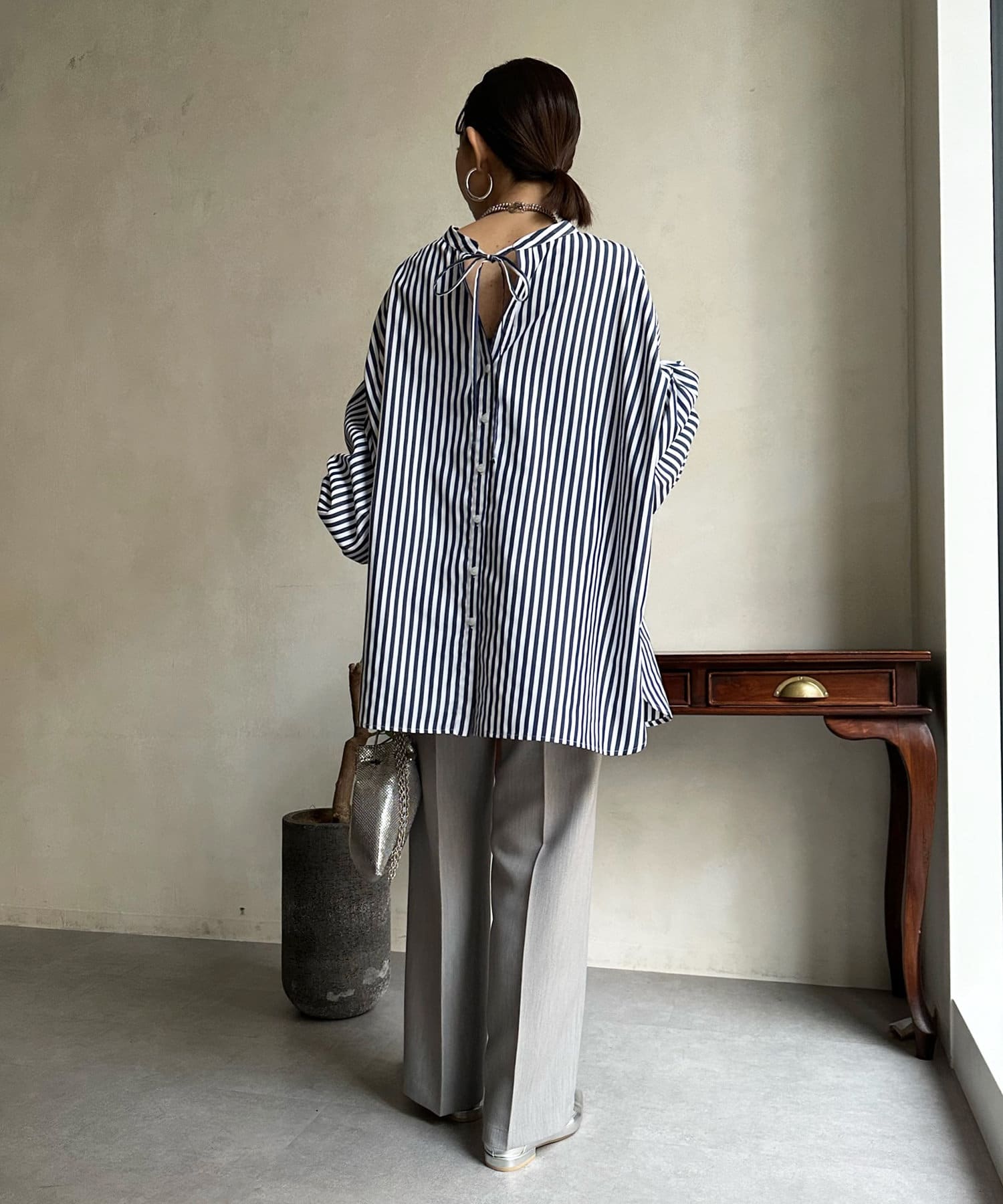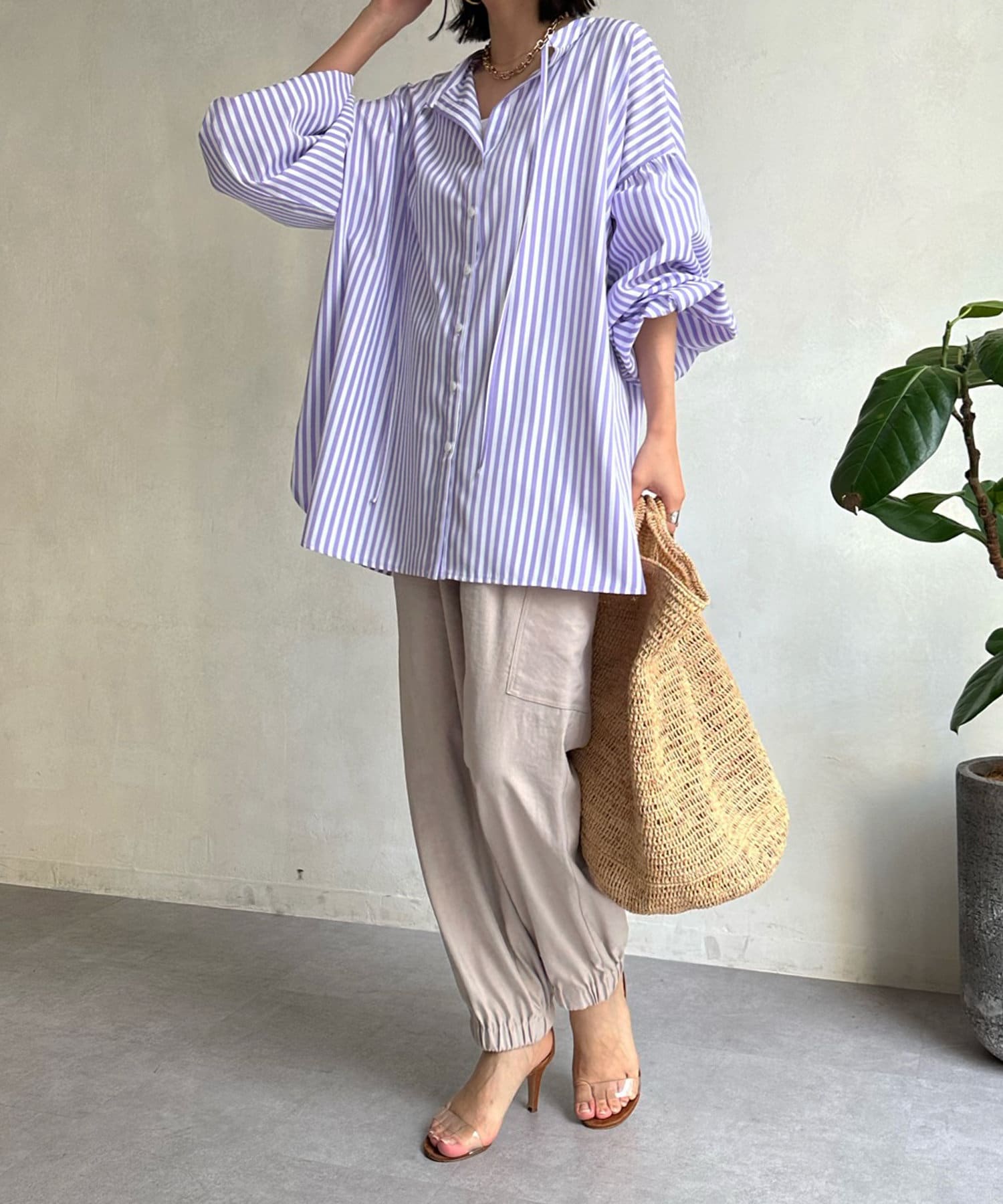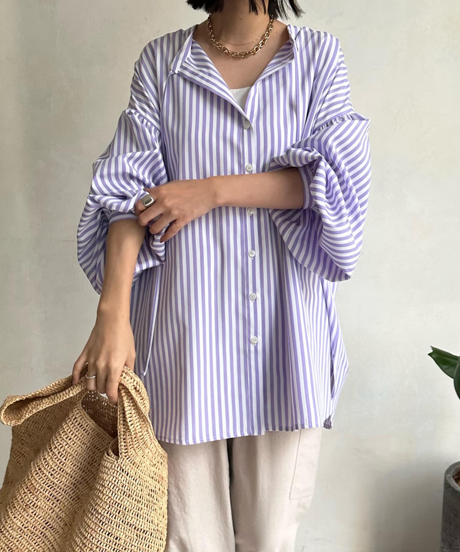 お顔周りがすっきりと見えるスキッパーデザインで、首元にはトレンド感のあるリボンをプラス。