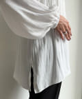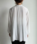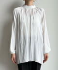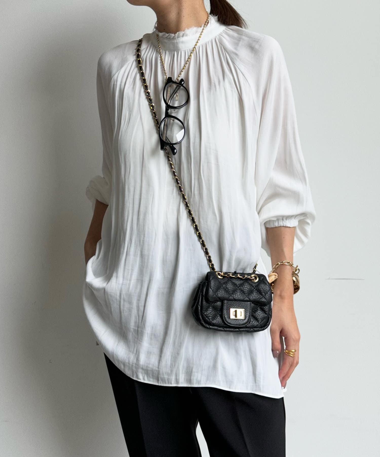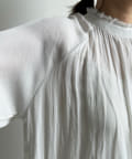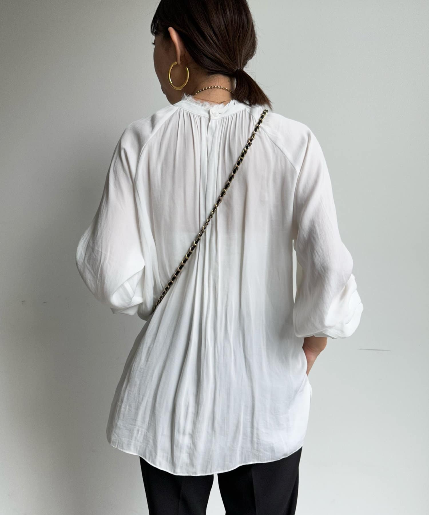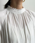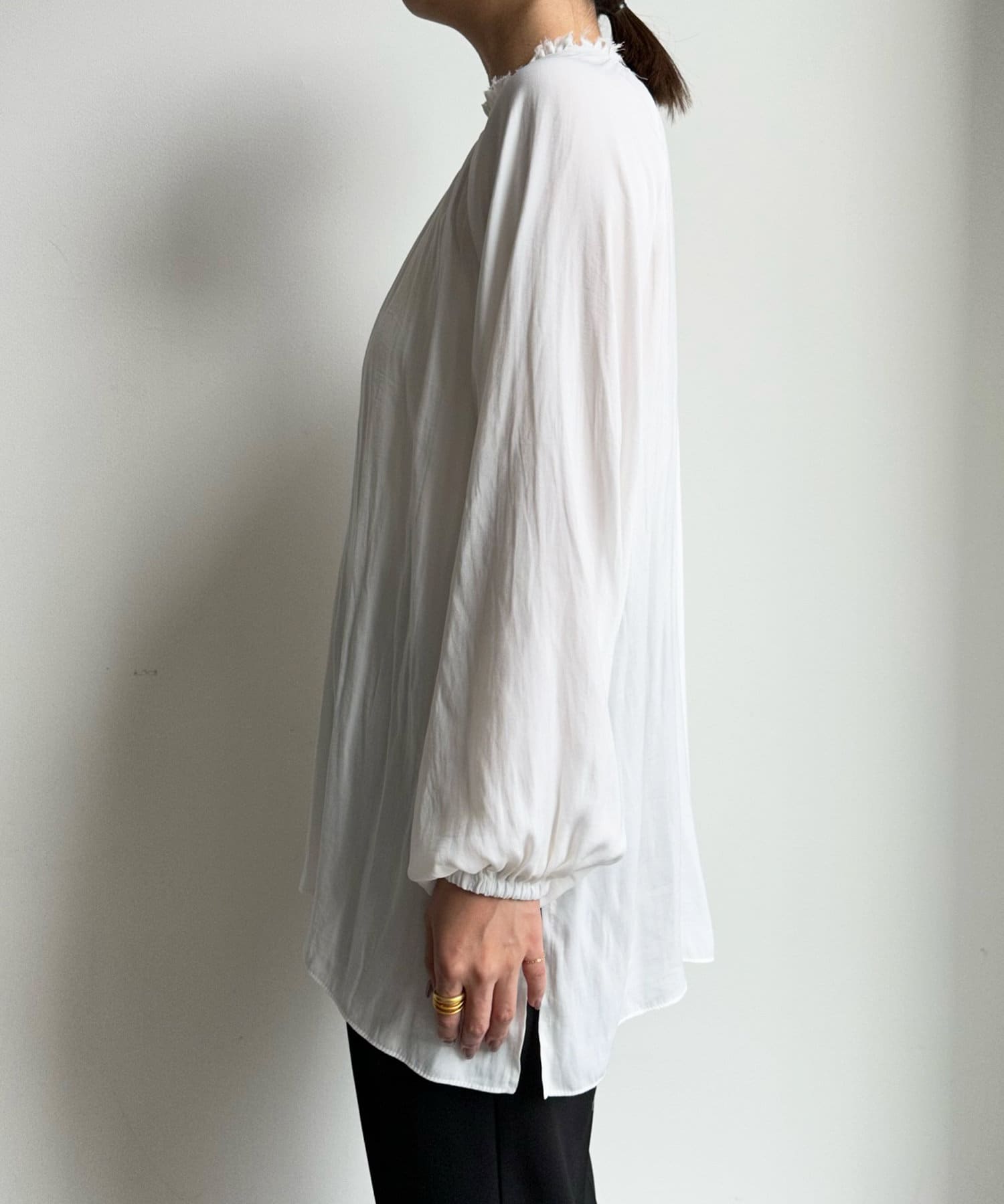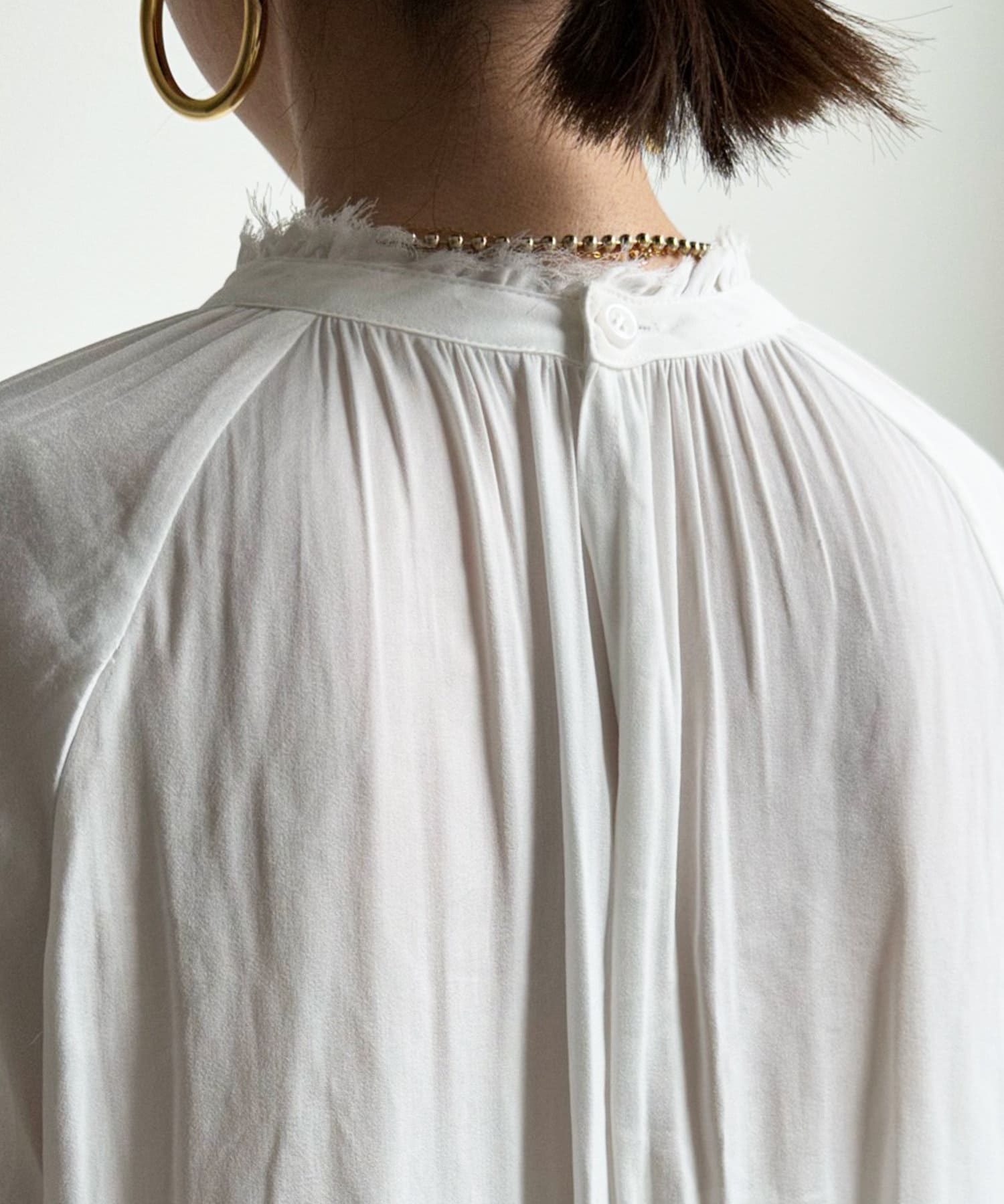ネック部分のフリルディティールとギャザーのデザインが、シンプルながらもポイントになってくれるバンドカラーブラウス。