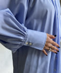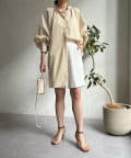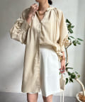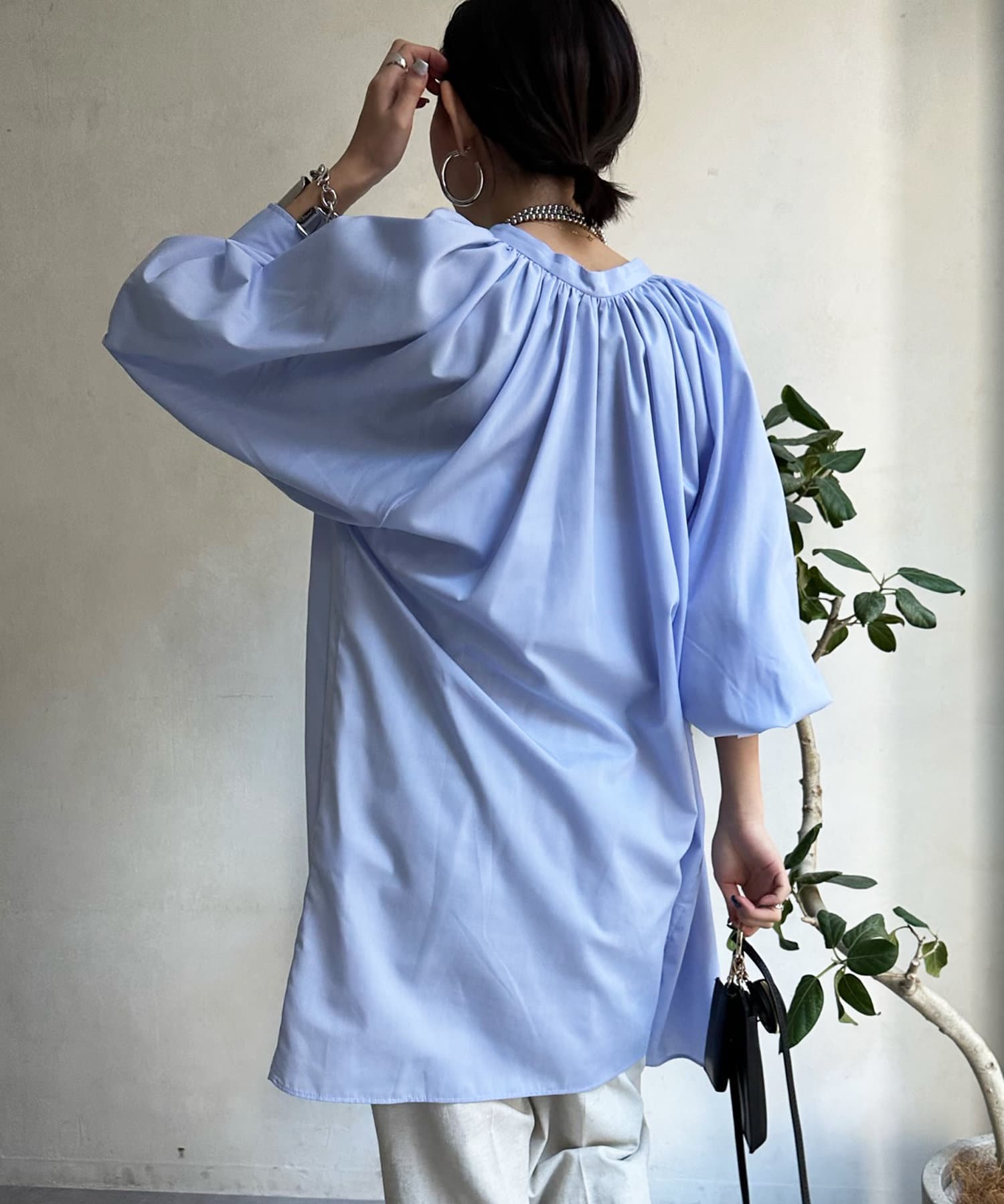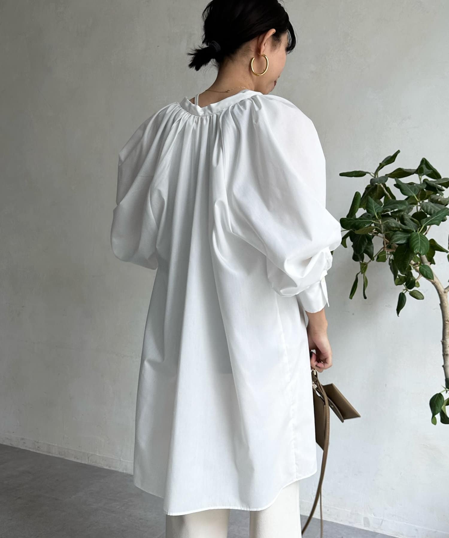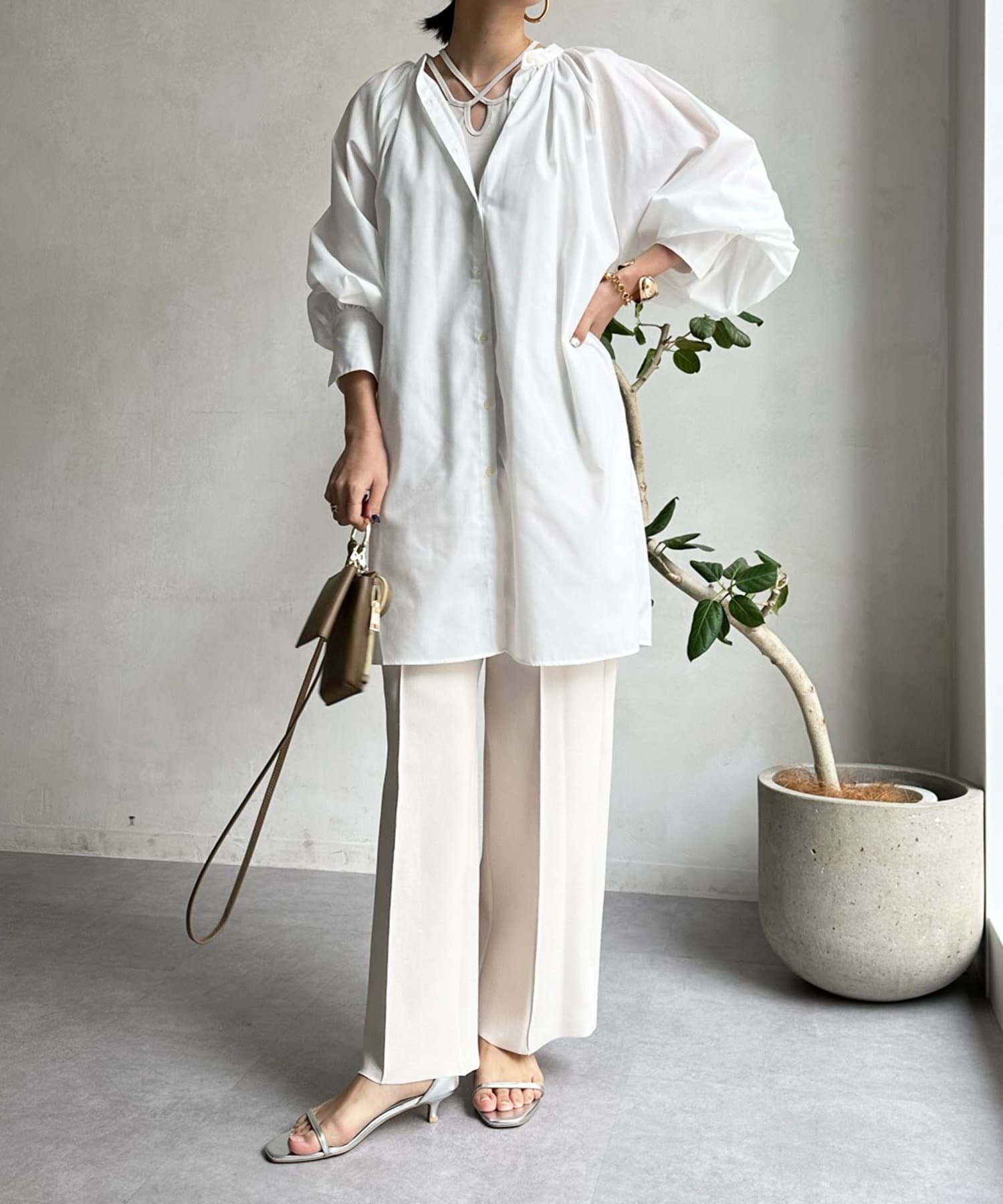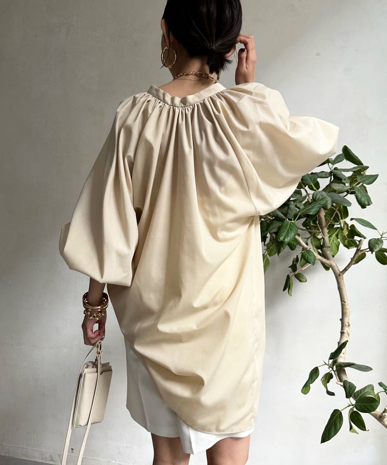 首元や袖口にギャザーを効かせ、ボリューム感をプラス。身頃はすっきりと仕上げ、メリハリの効いたシルエットに。