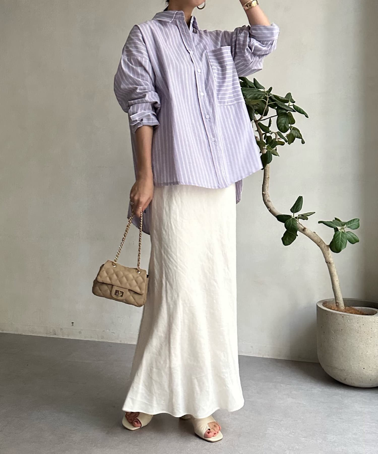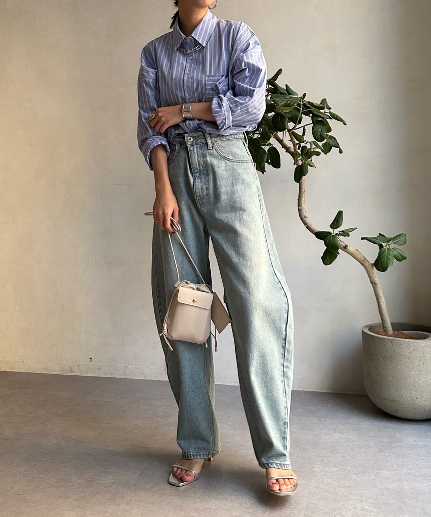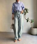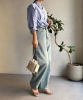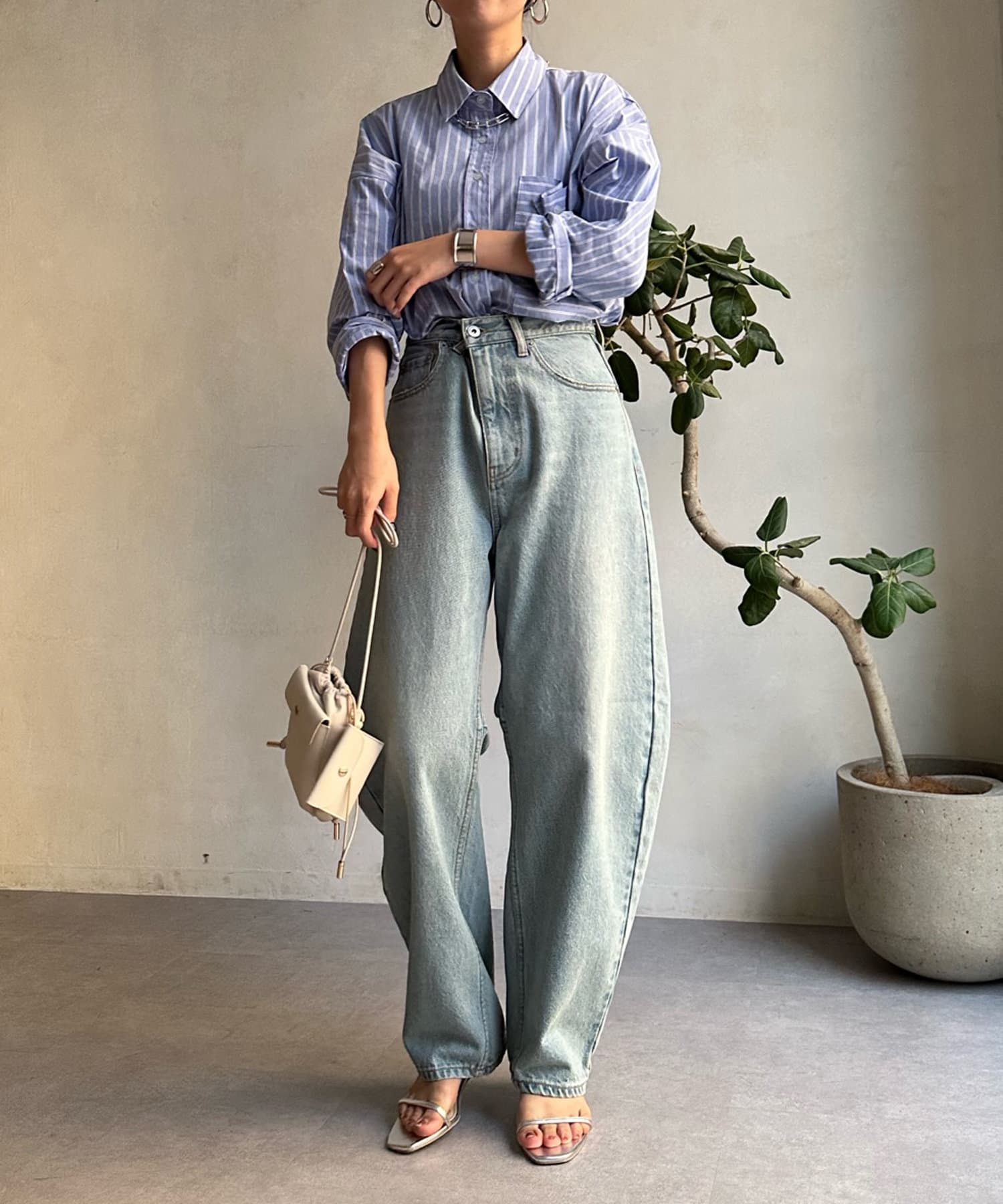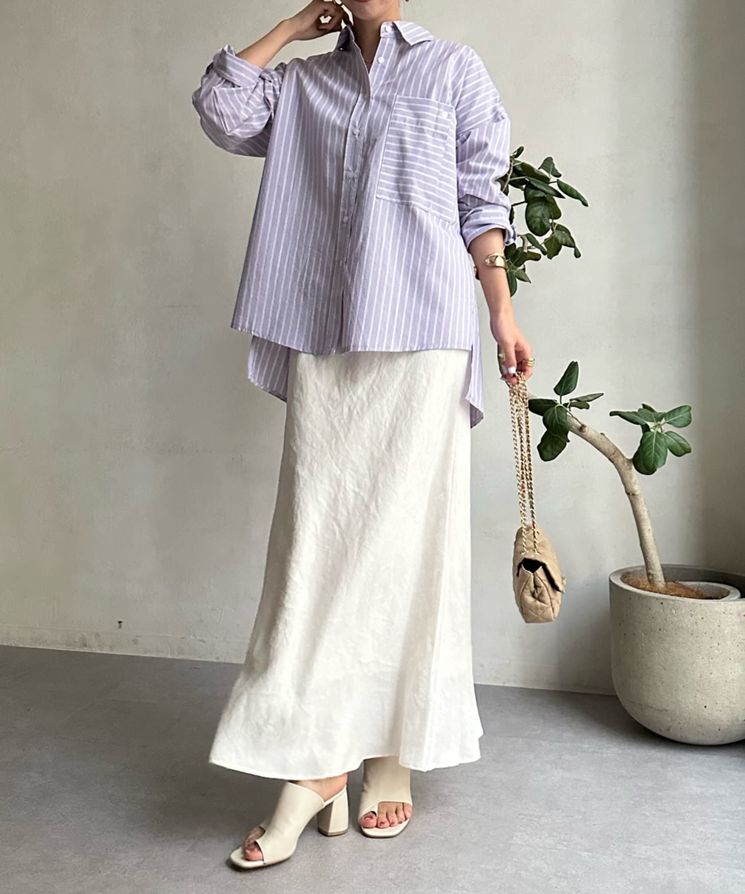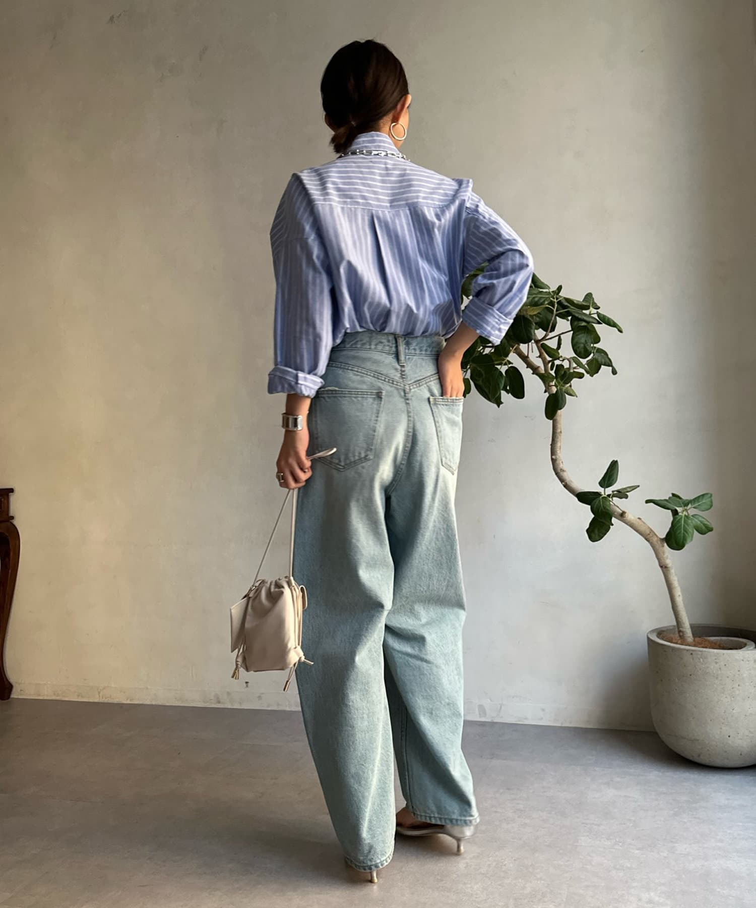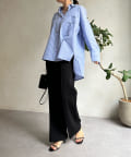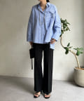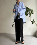 シャツは身幅にゆとりのあるシルエットながら、きちんと見えするレギュラーカラーとインでもアウトでも着れる丈感で、すっきりとしたバランスに仕上げました。