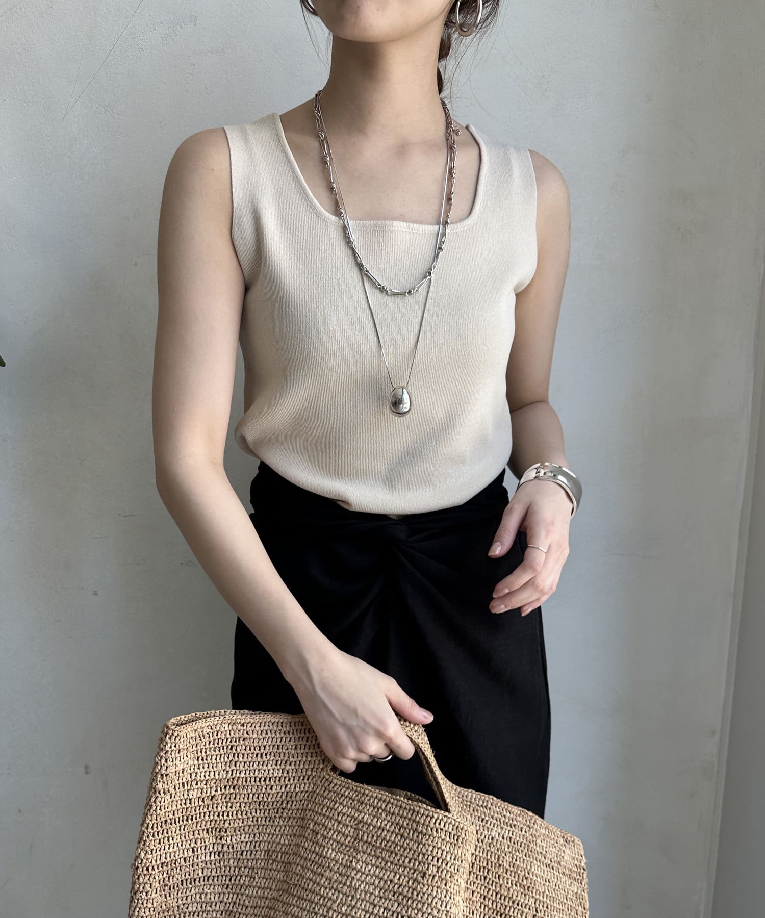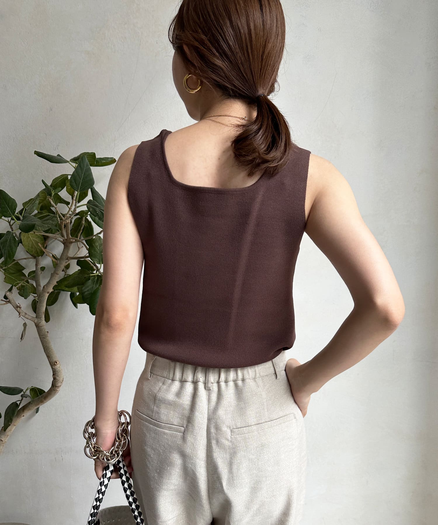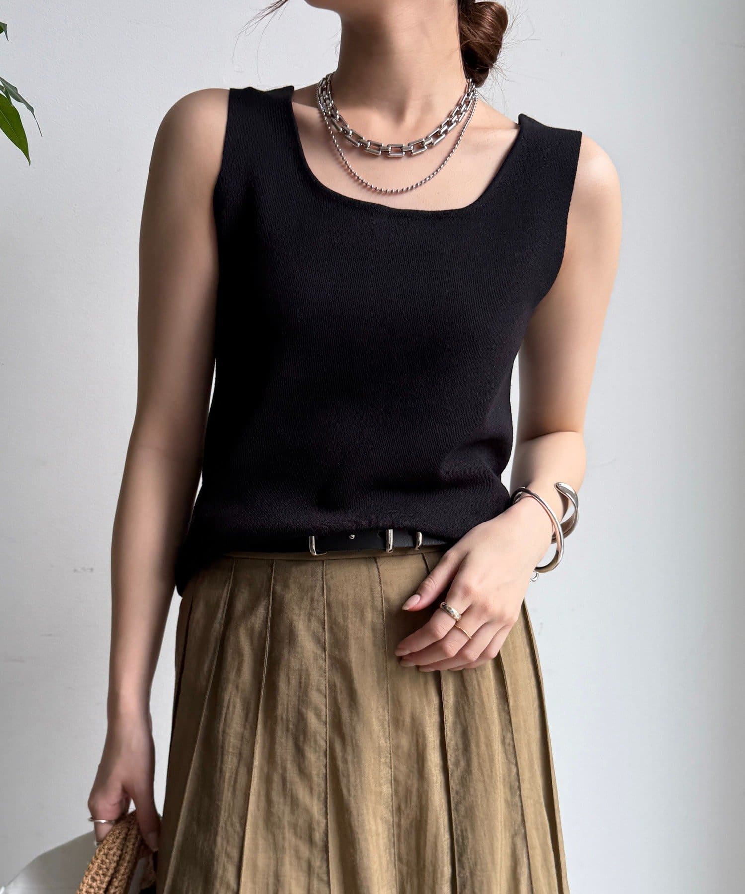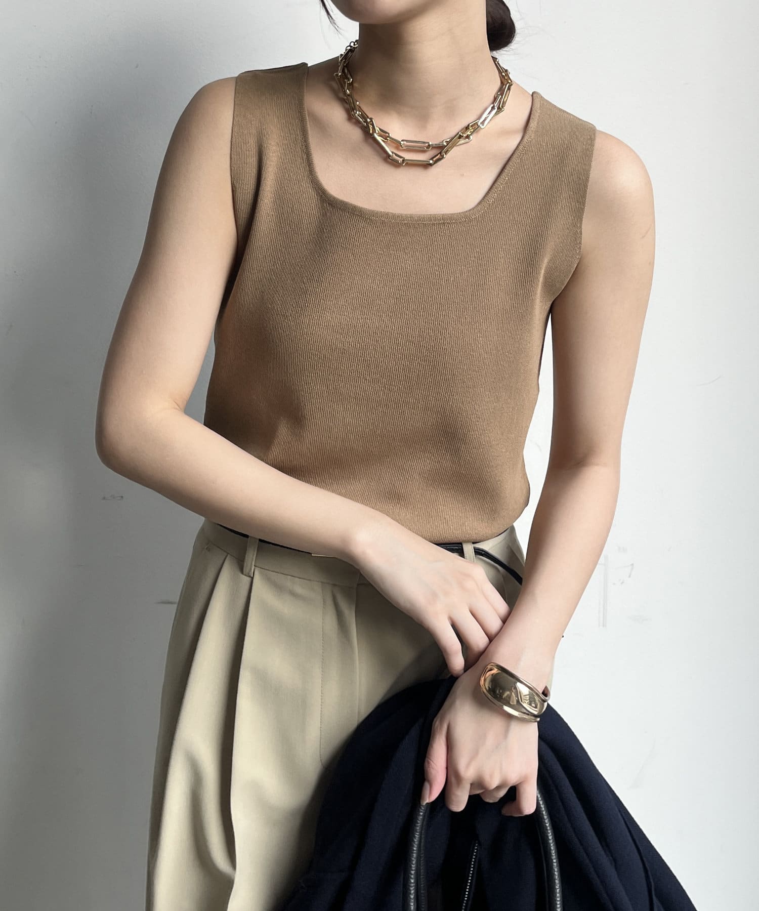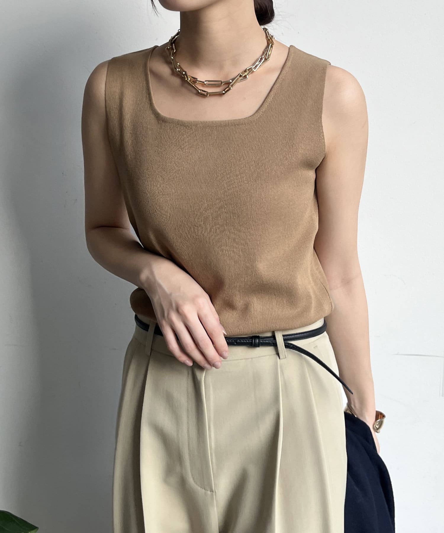 ニット素材で楽に着られ、スクエアネックは小顔効果やデコルテも綺麗に見せてくれます。