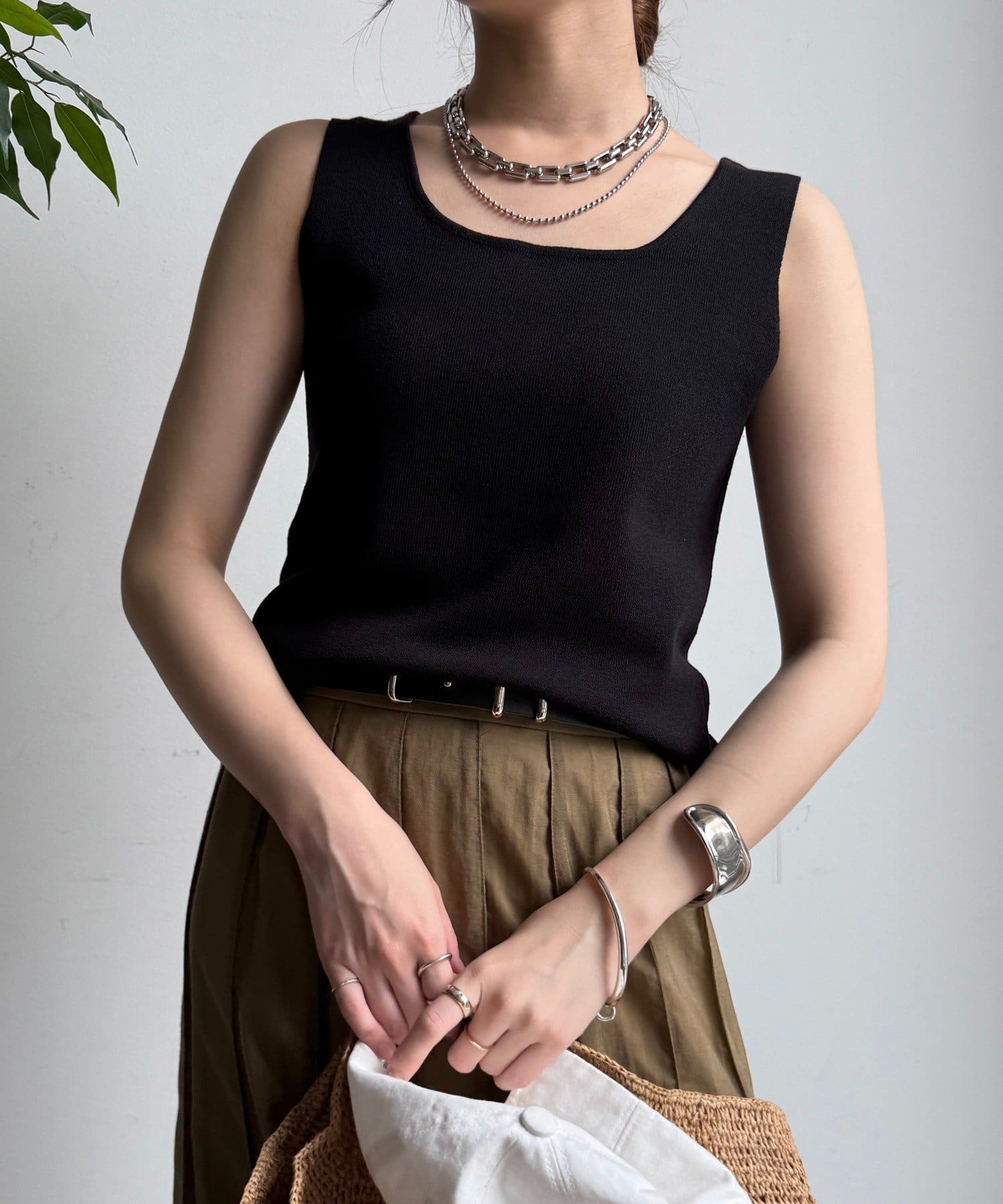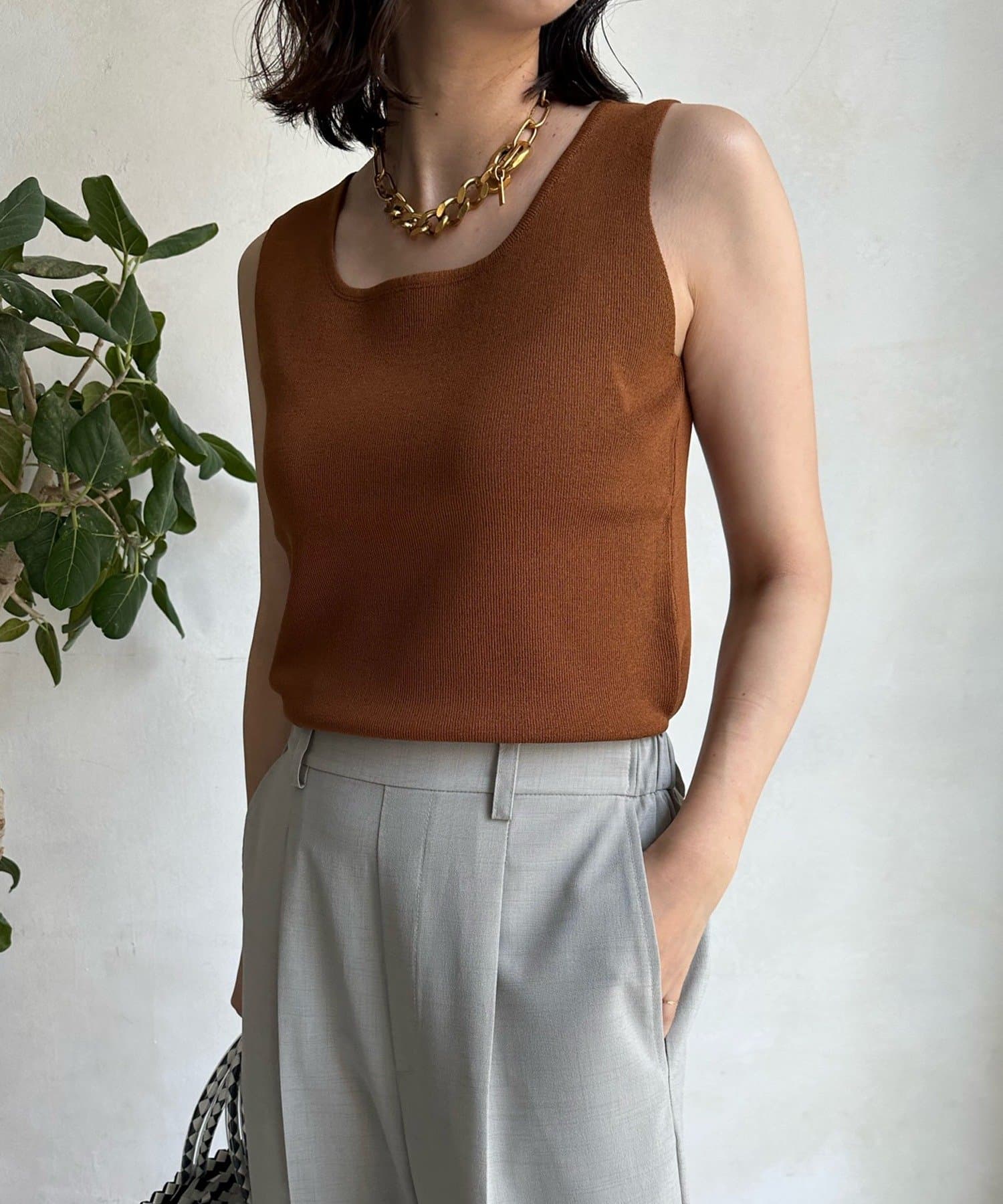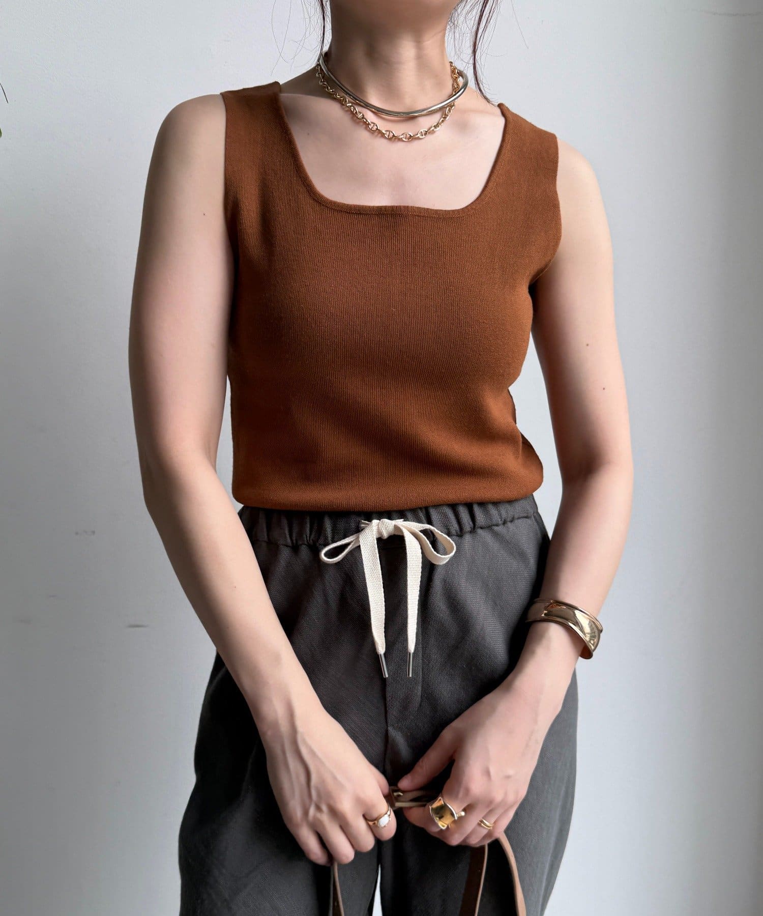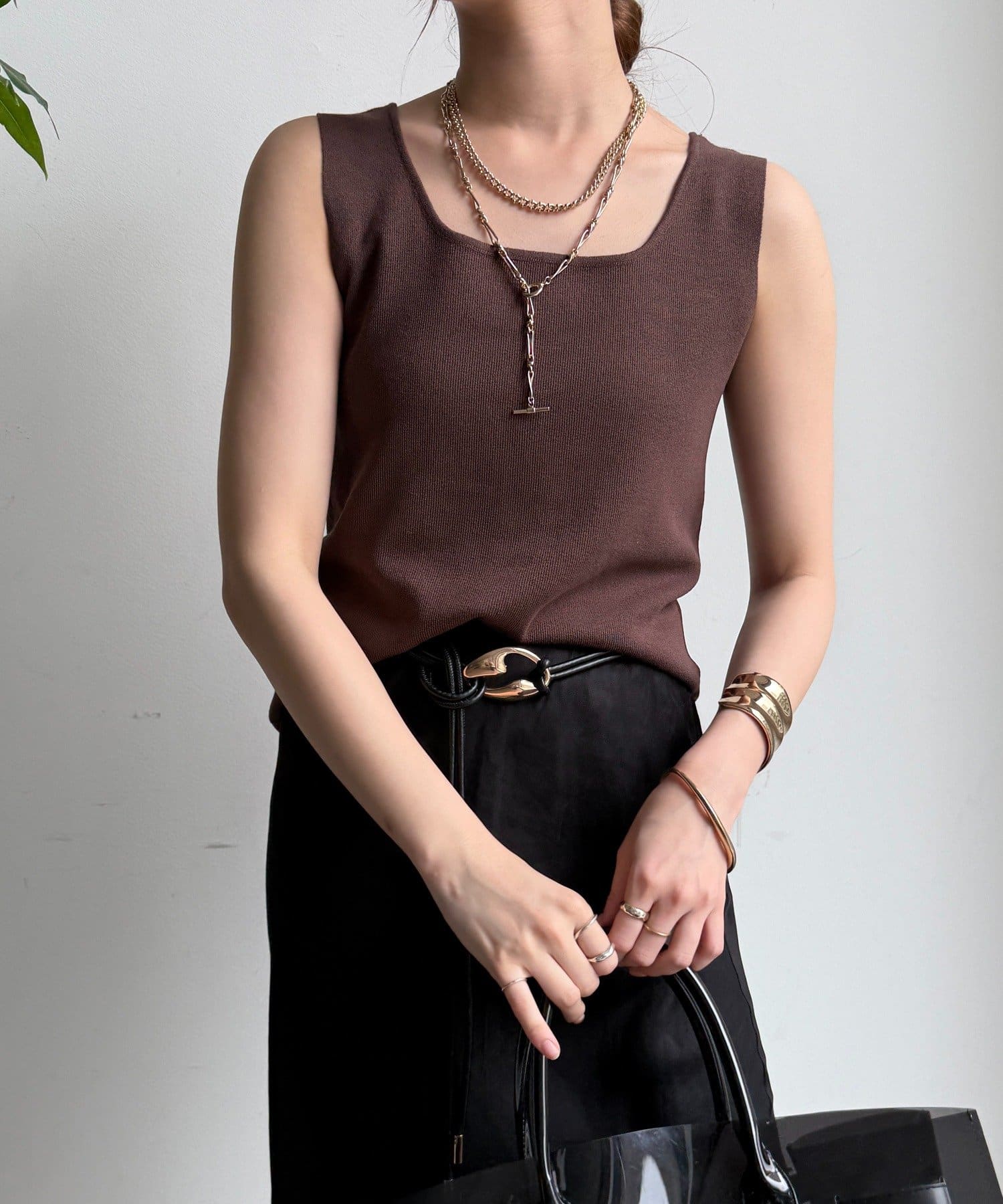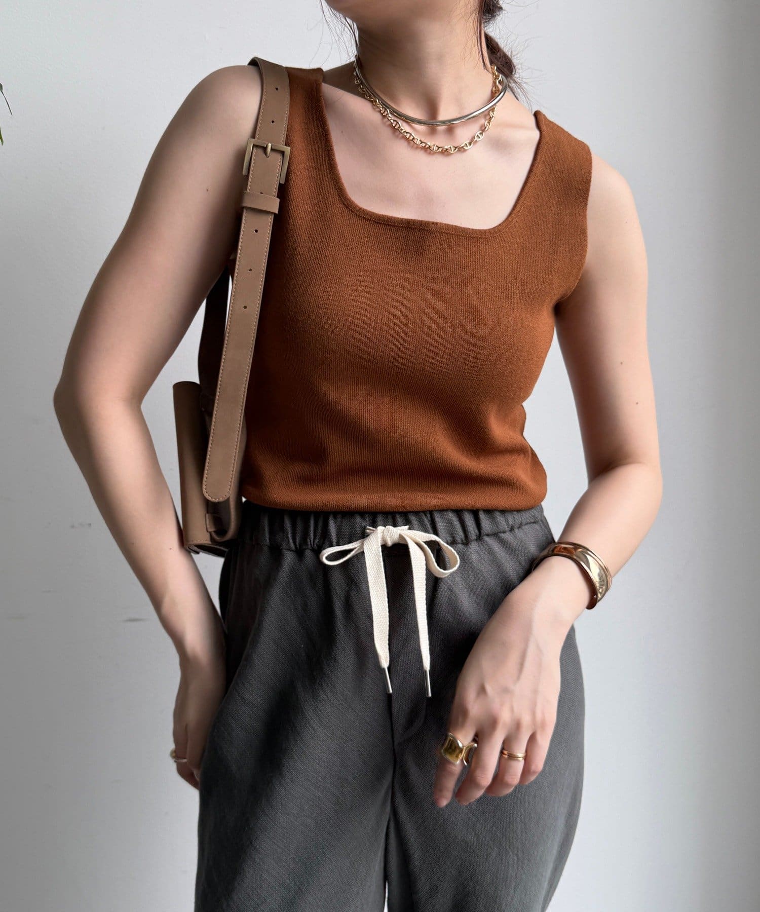 ニット素材で楽に着られ、スクエアネックは小顔効果やデコルテも綺麗に見せてくれます。