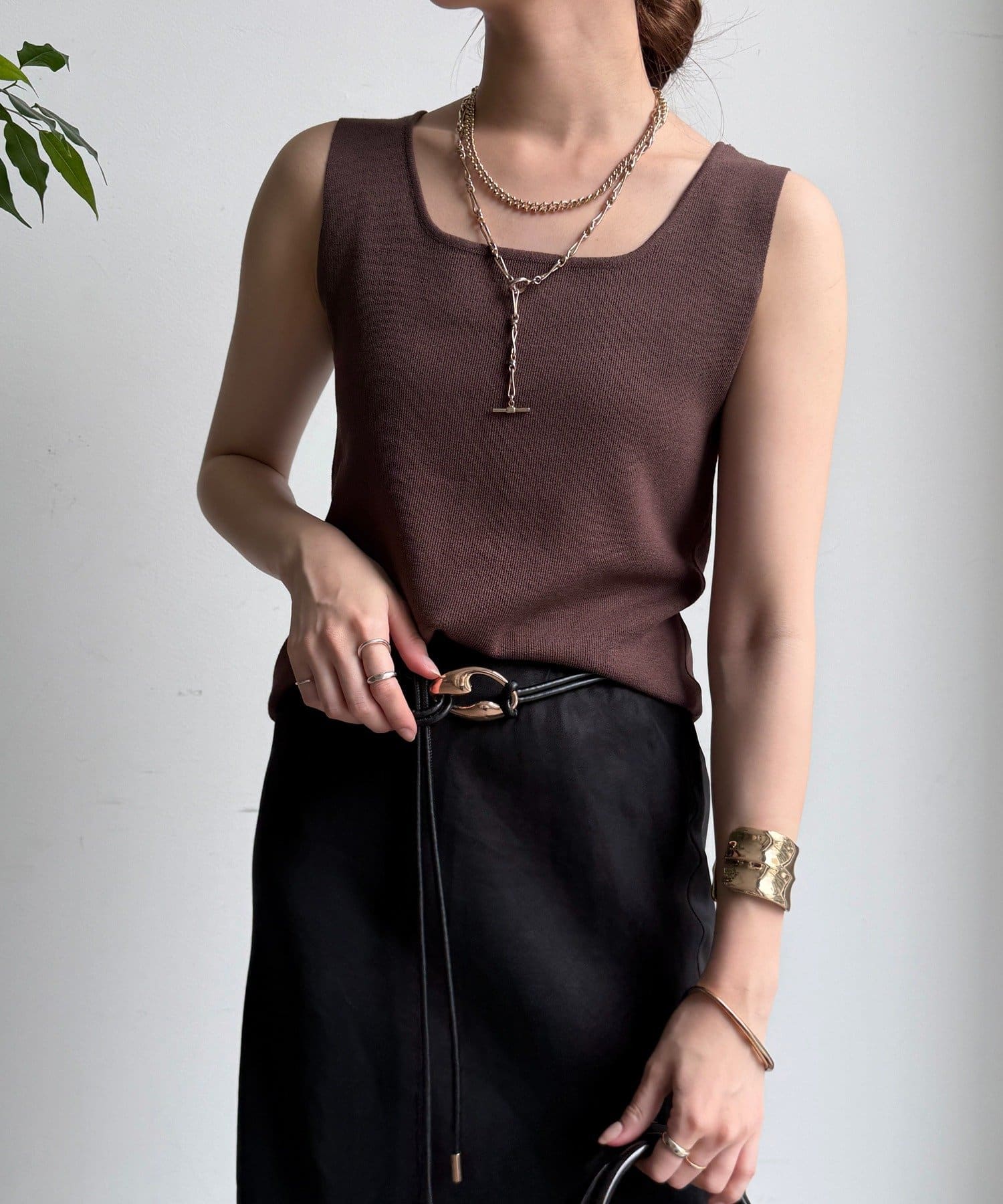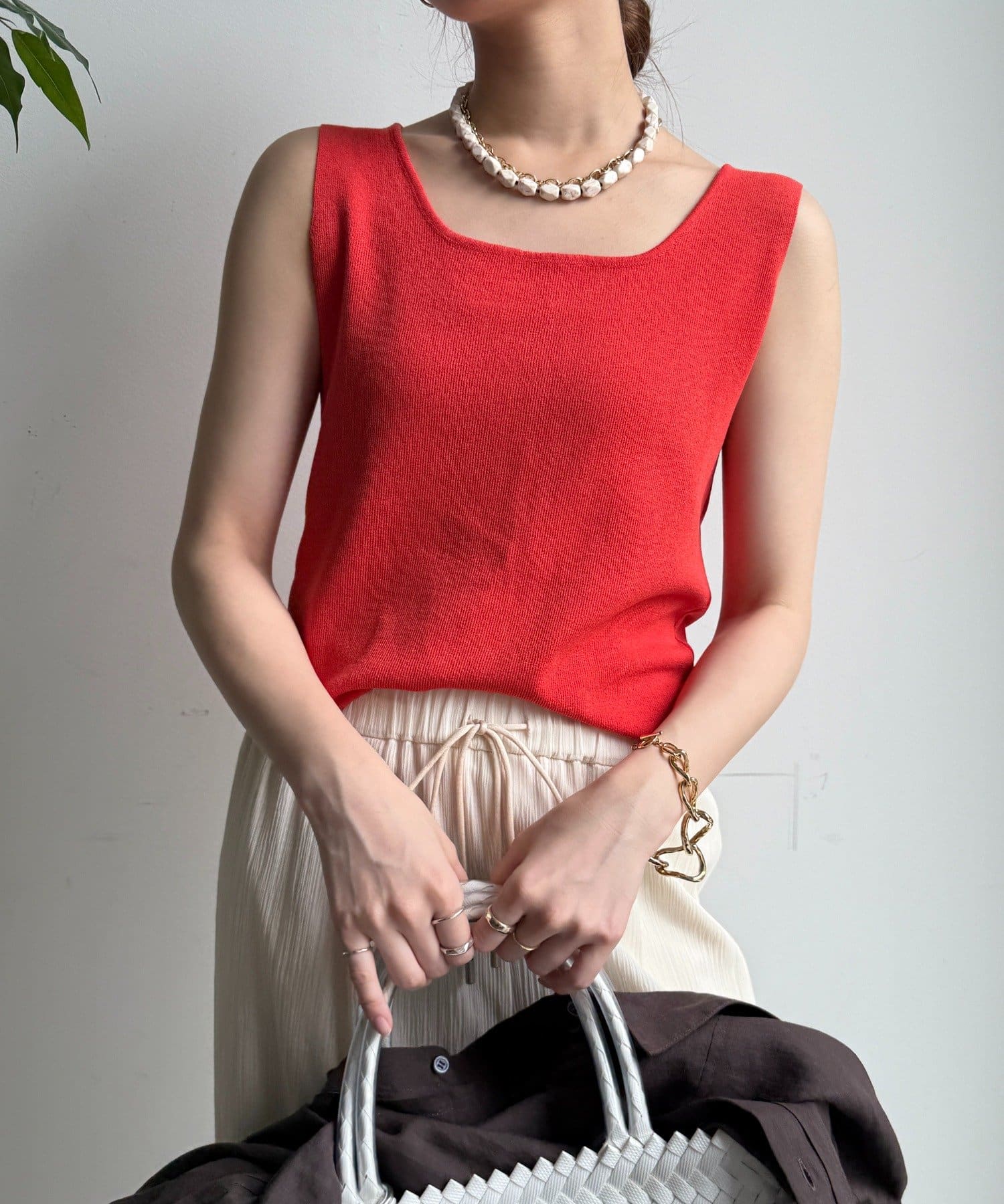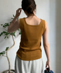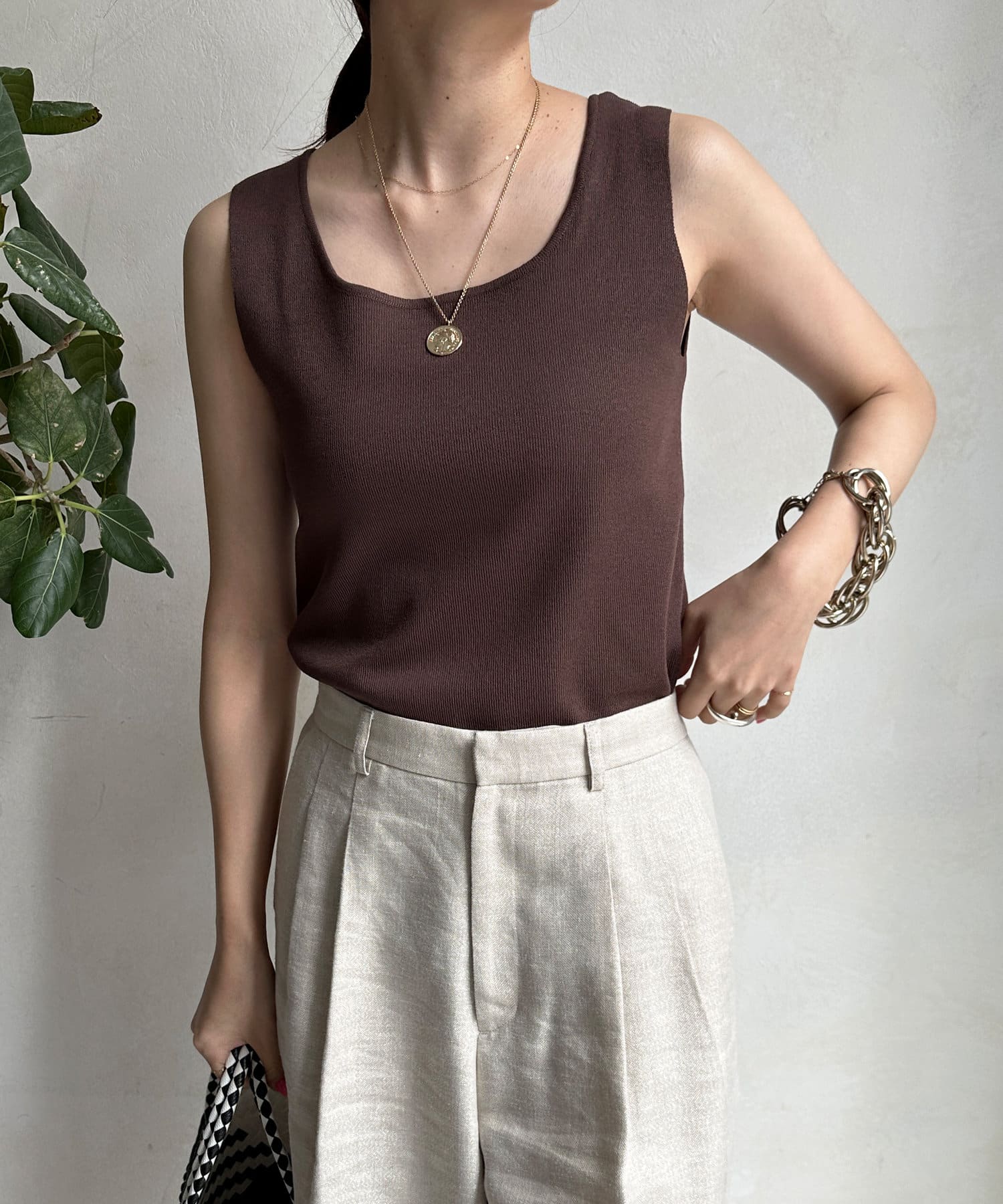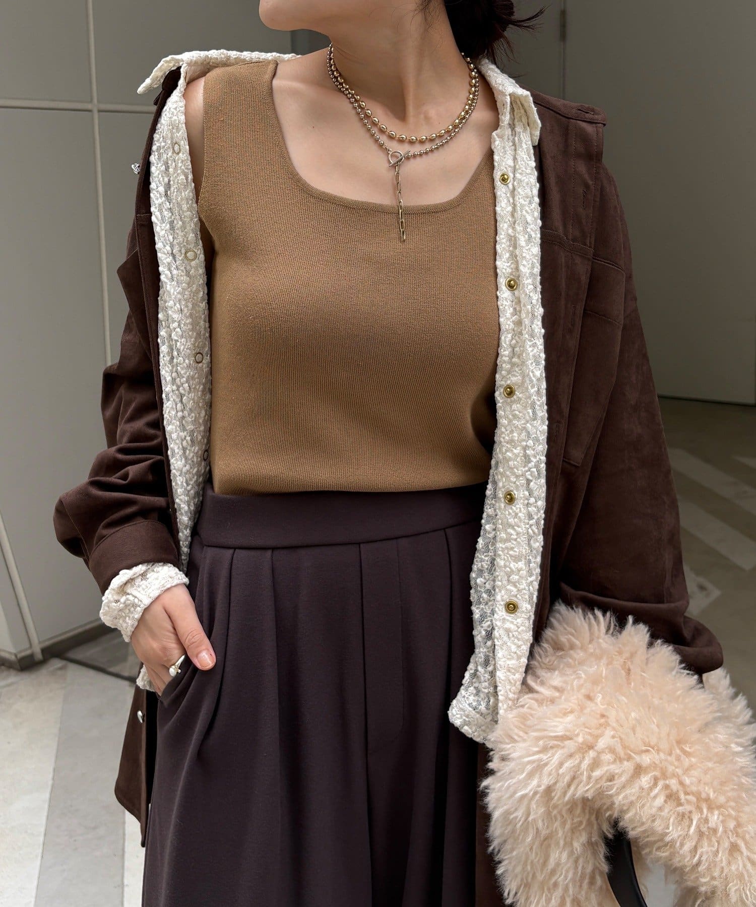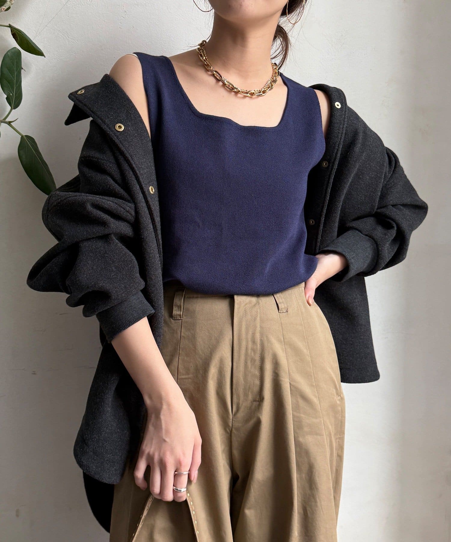 ニット素材で楽に着られ、スクエアネックは小顔効果やデコルテも綺麗に見せてくれます。