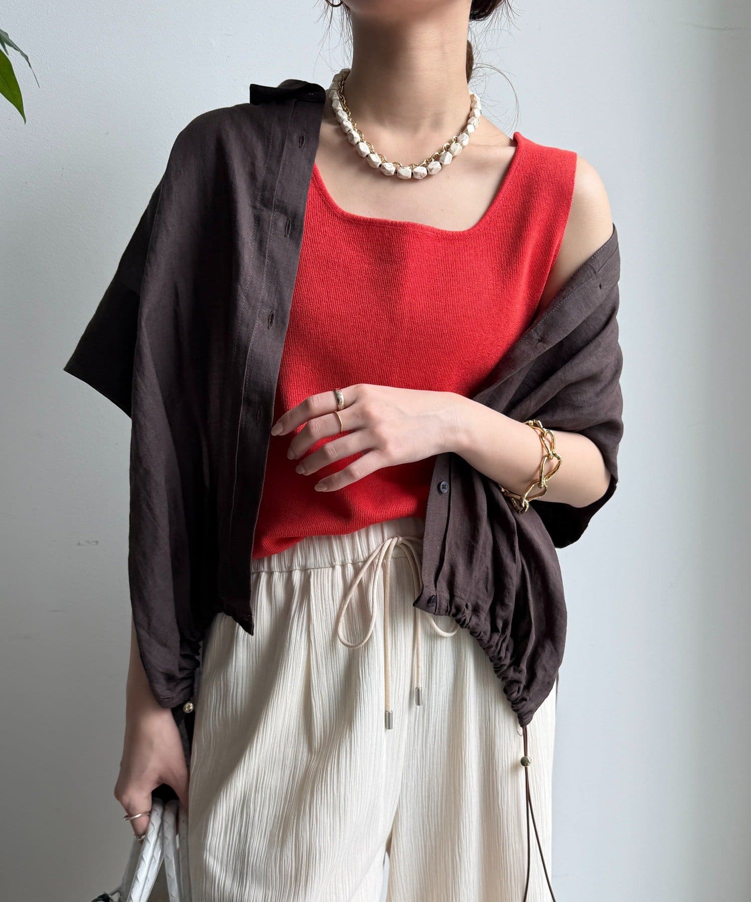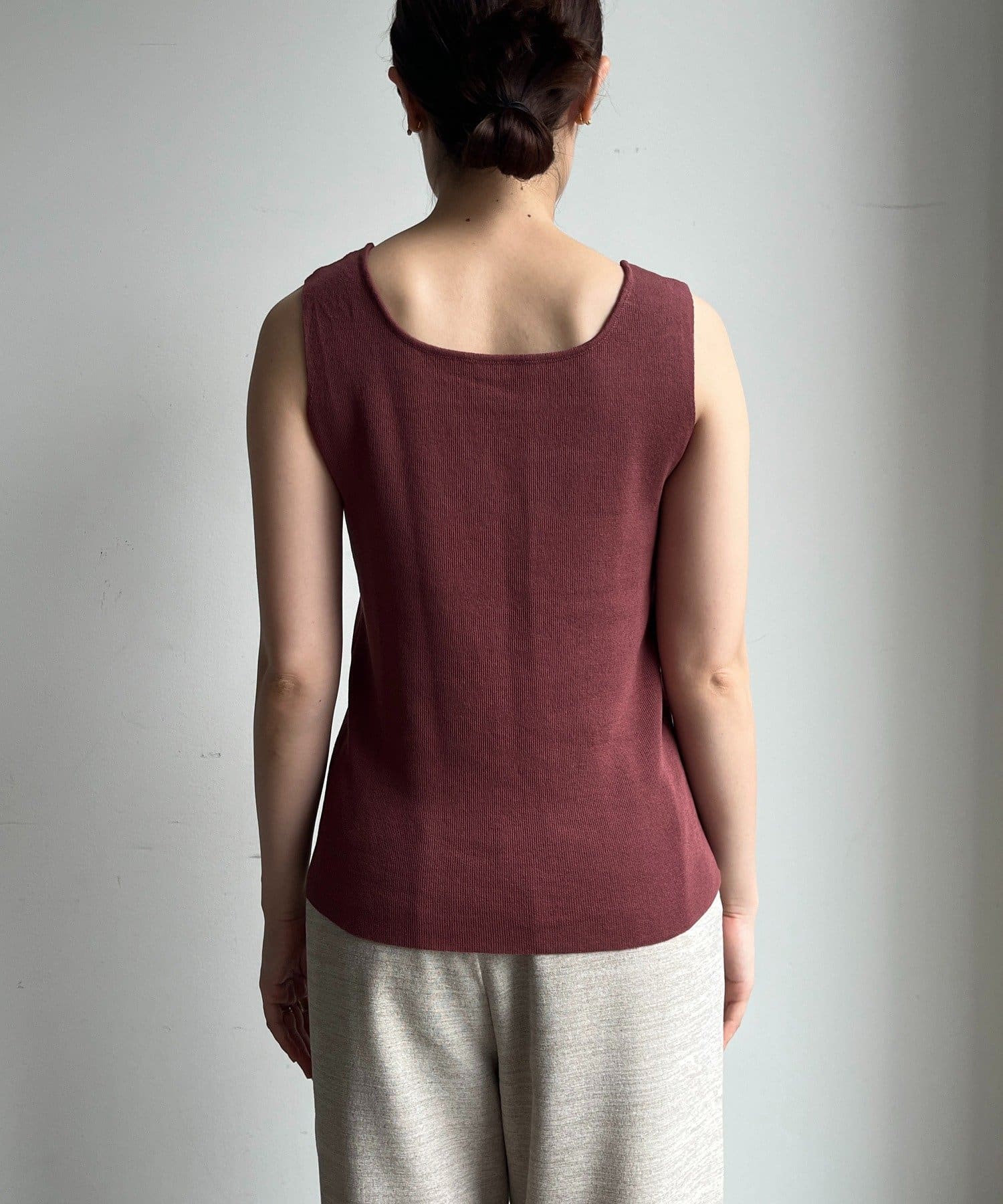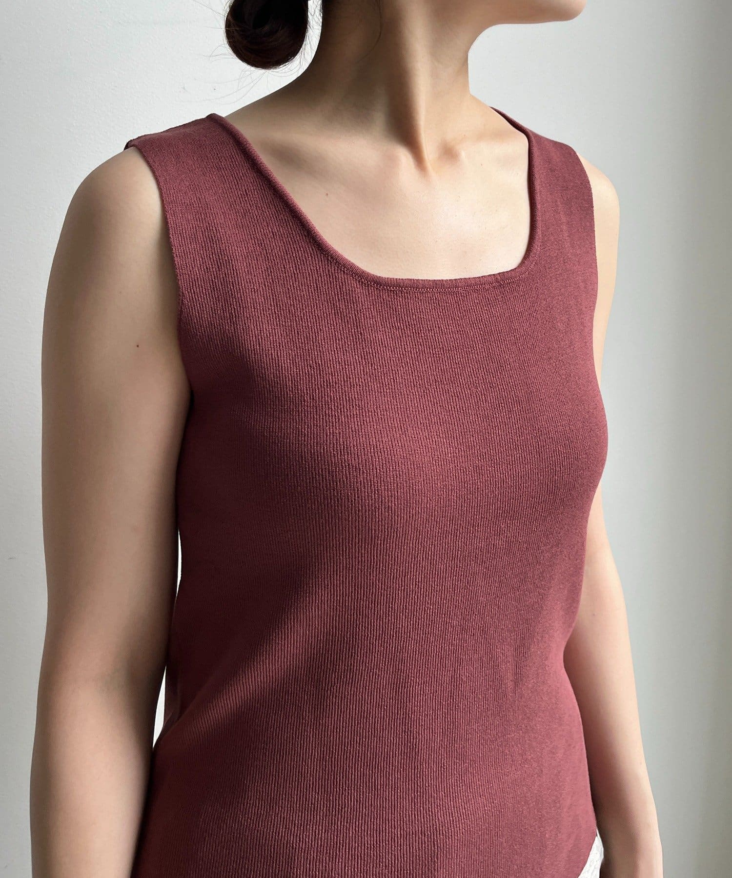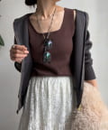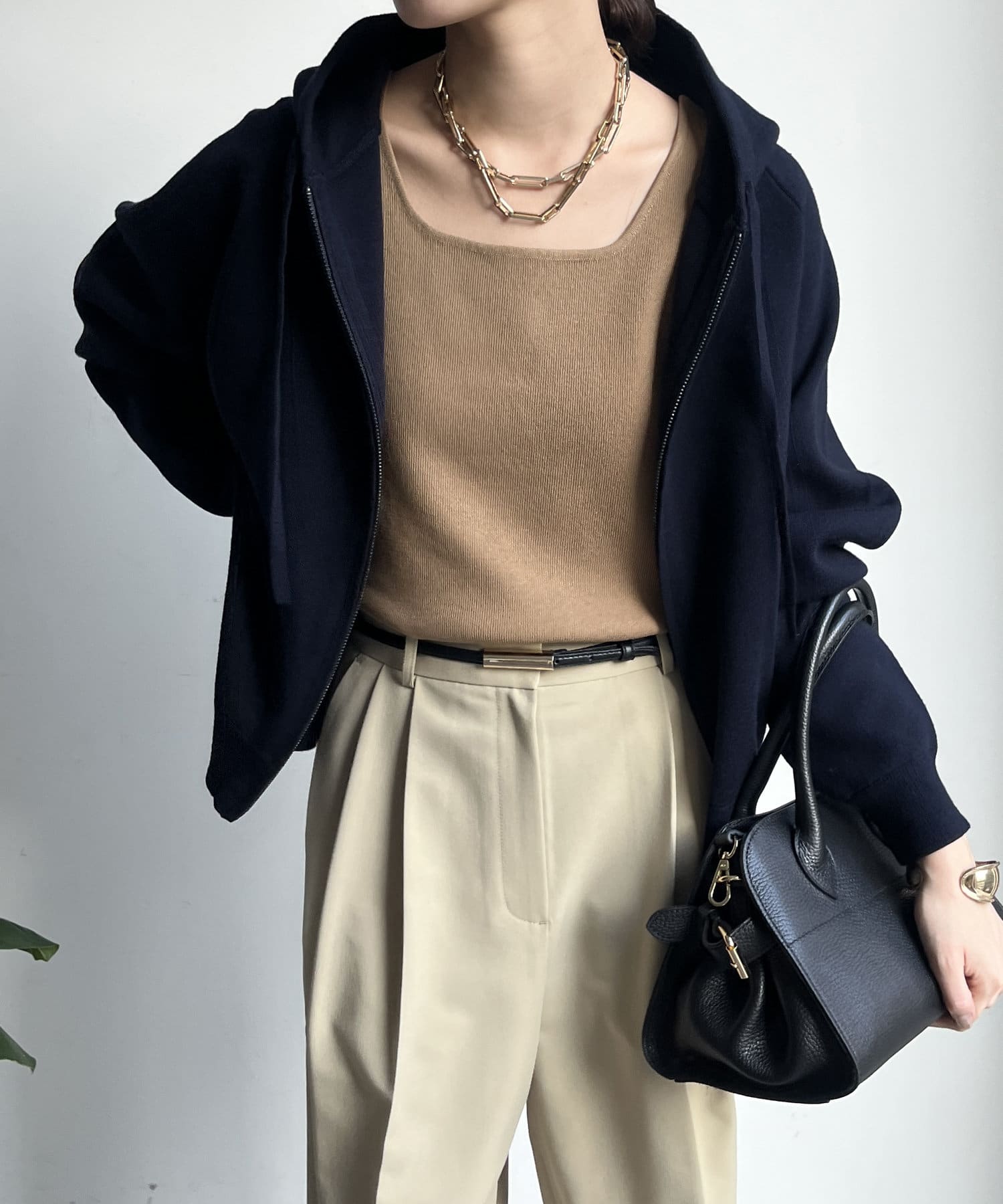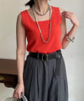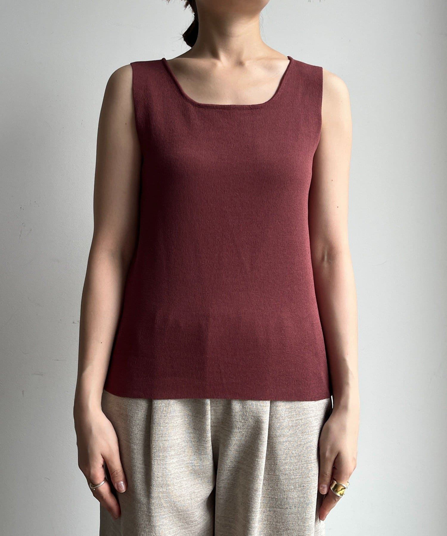 ニット素材で楽に着られ、スクエアネックは小顔効果やデコルテも綺麗に見せてくれます。