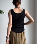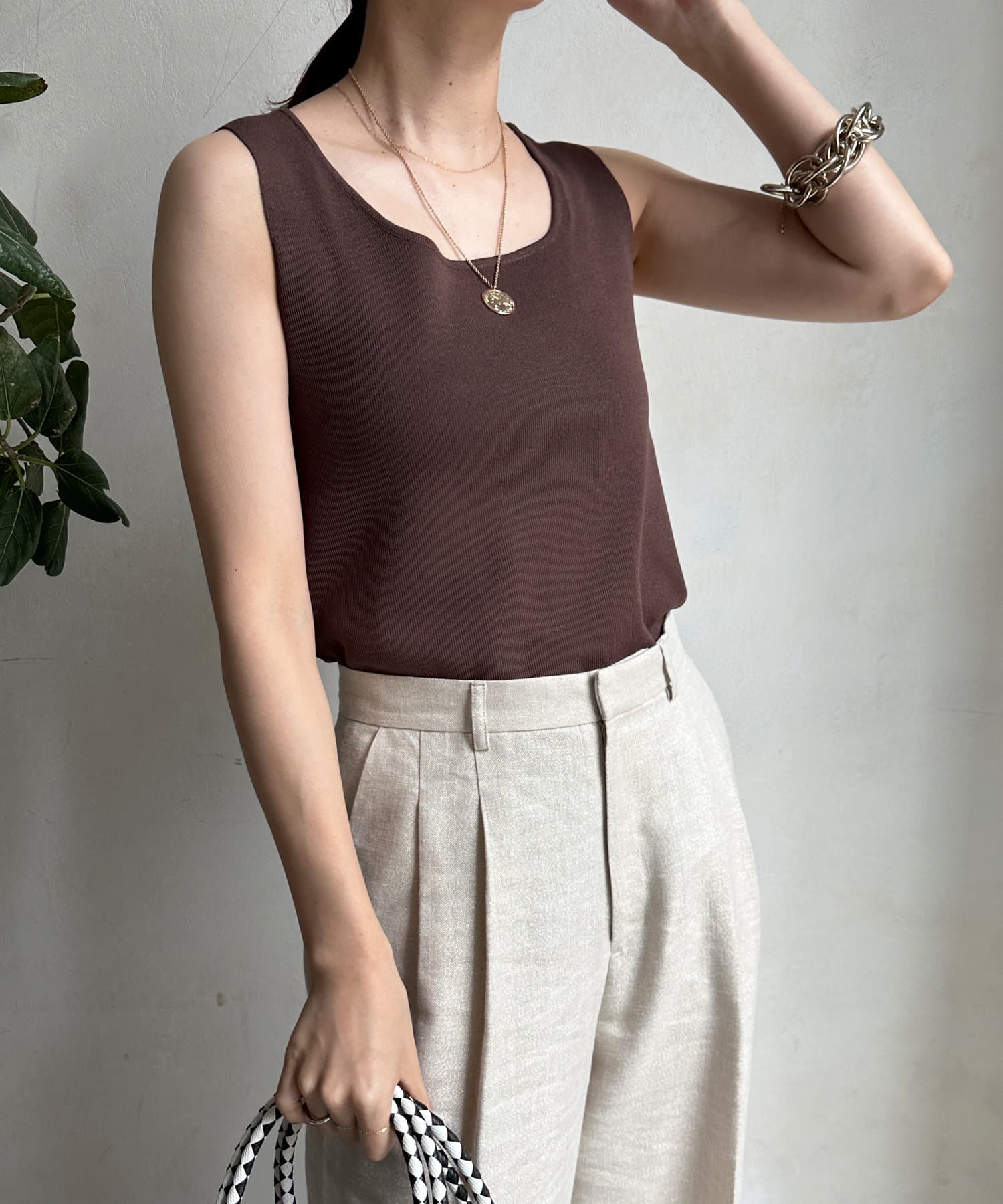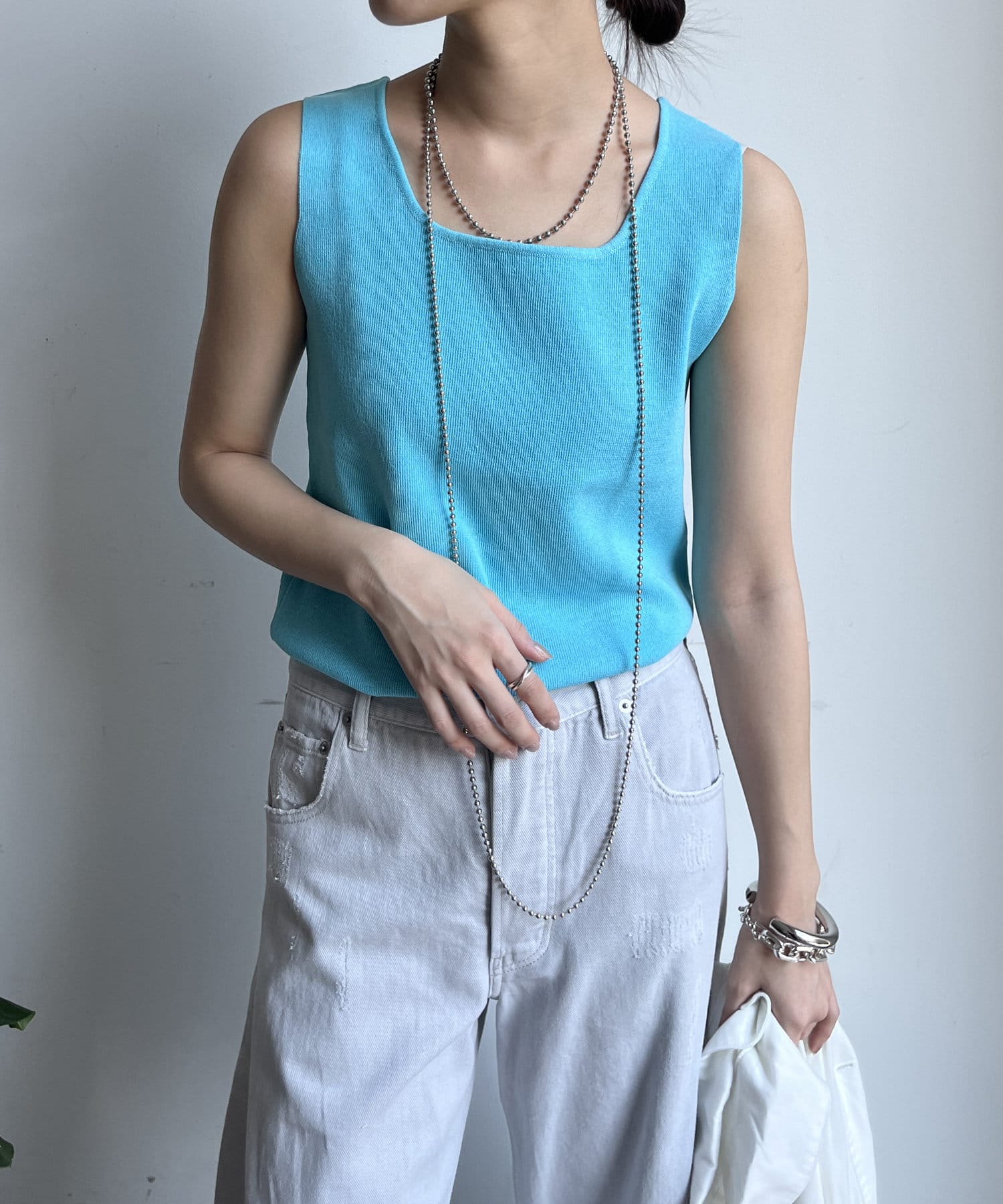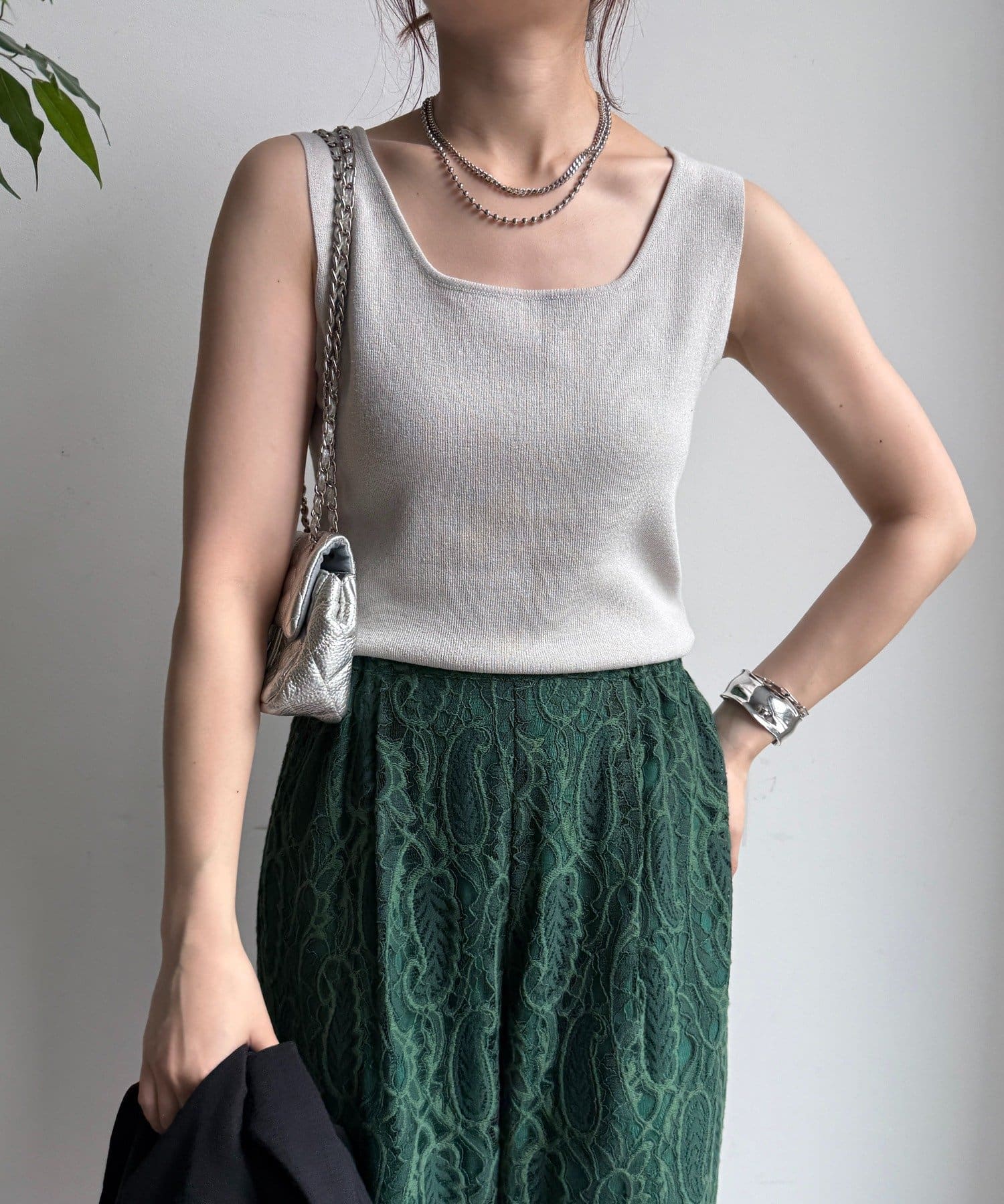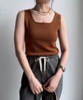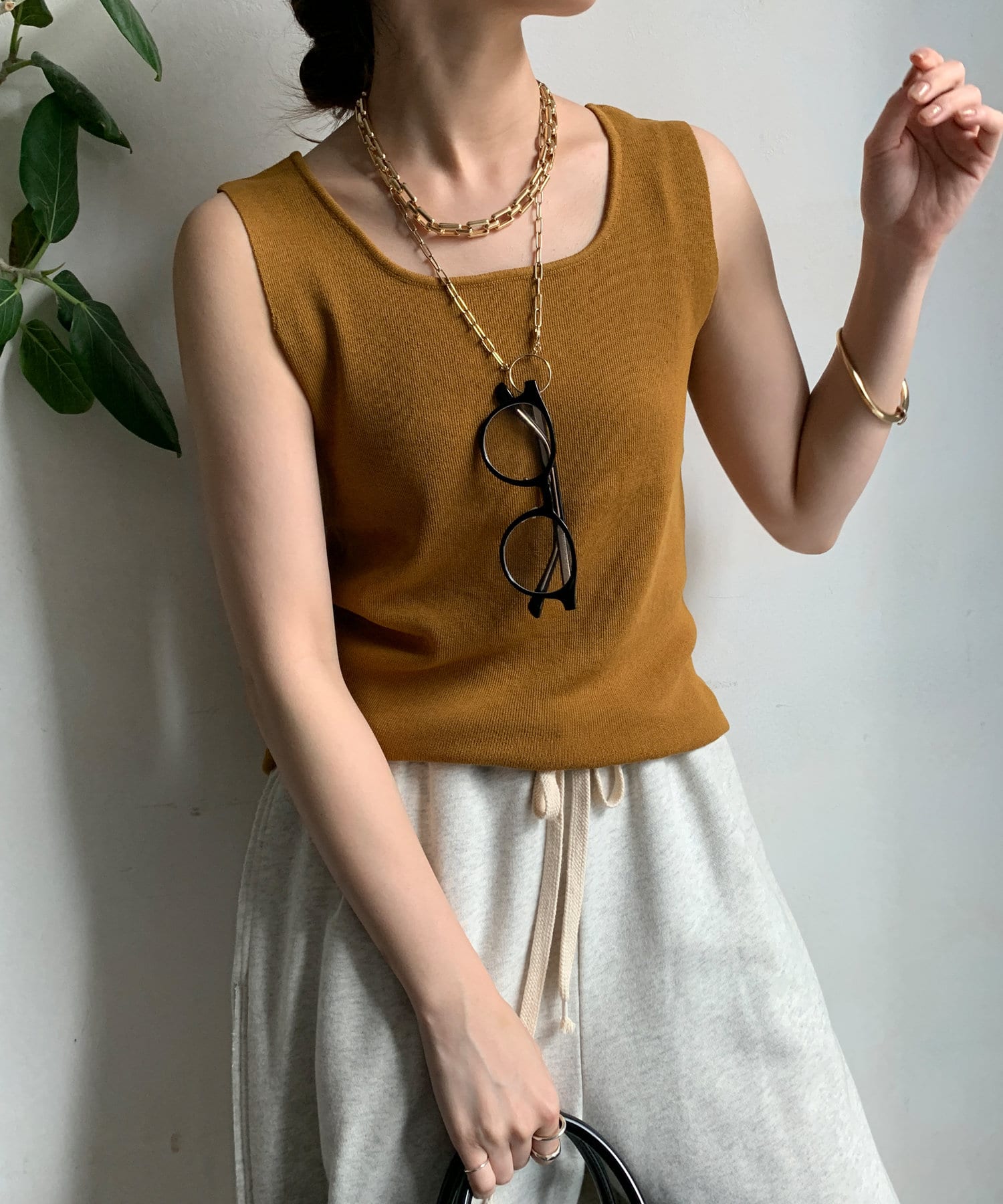 ニット素材で楽に着られ、スクエアネックは小顔効果やデコルテも綺麗に見せてくれます。