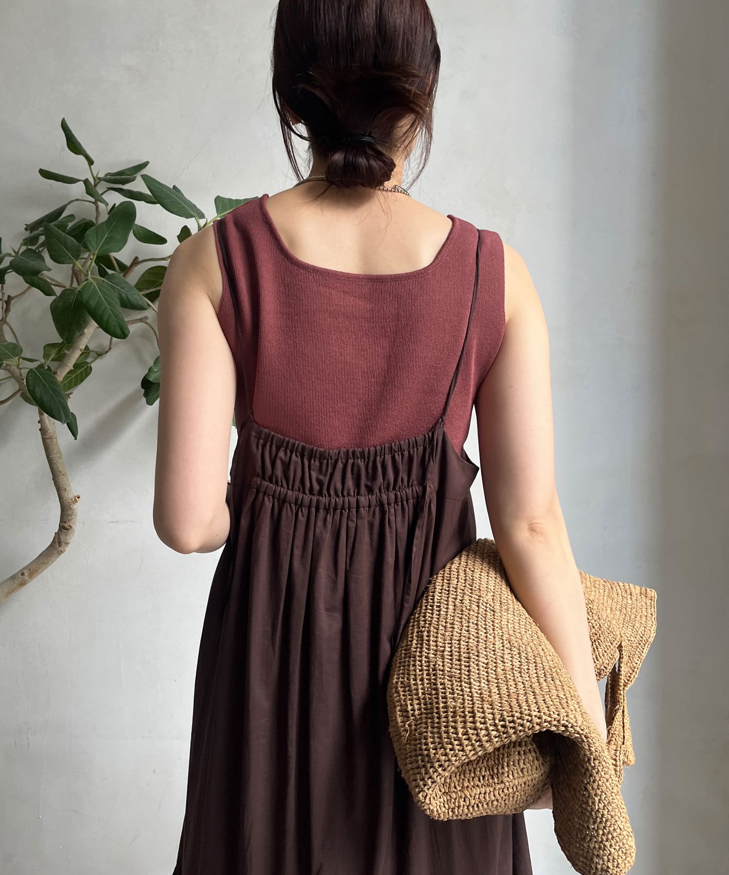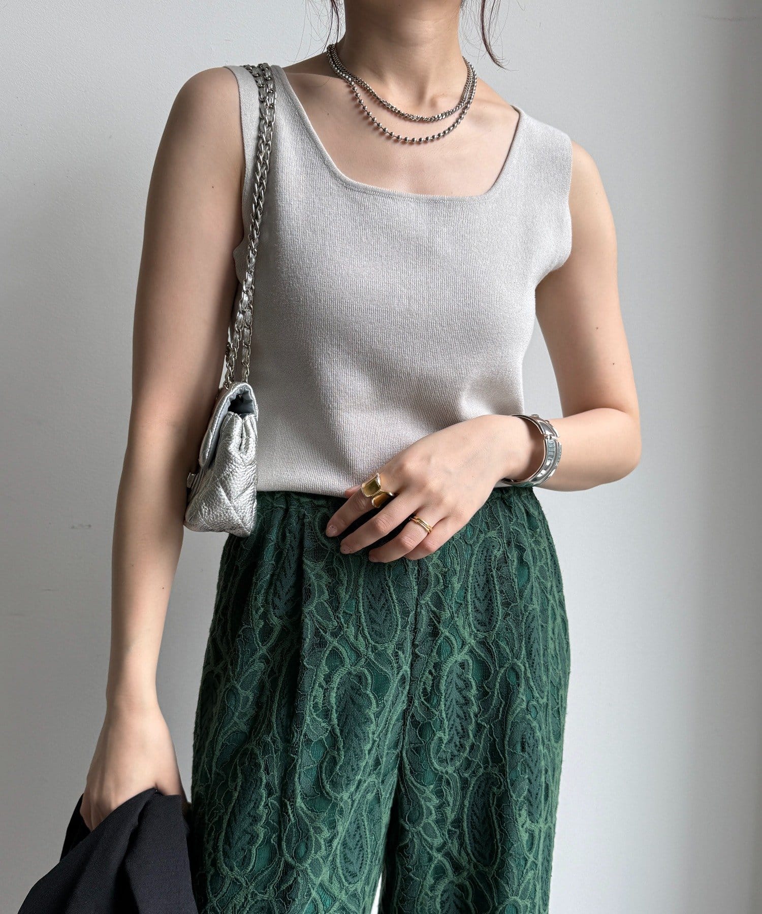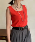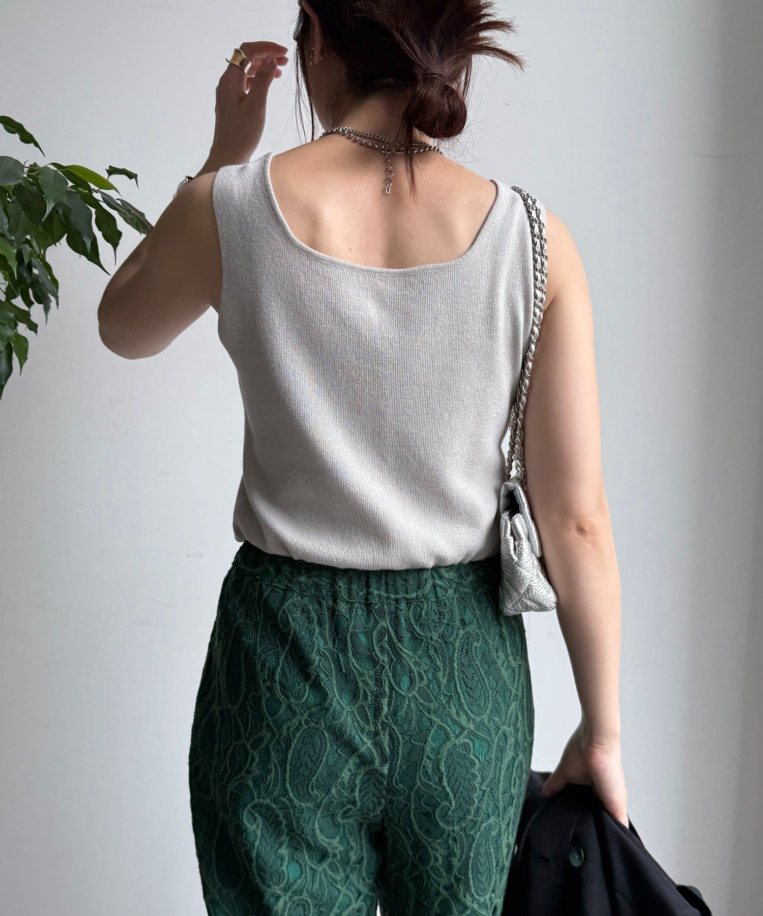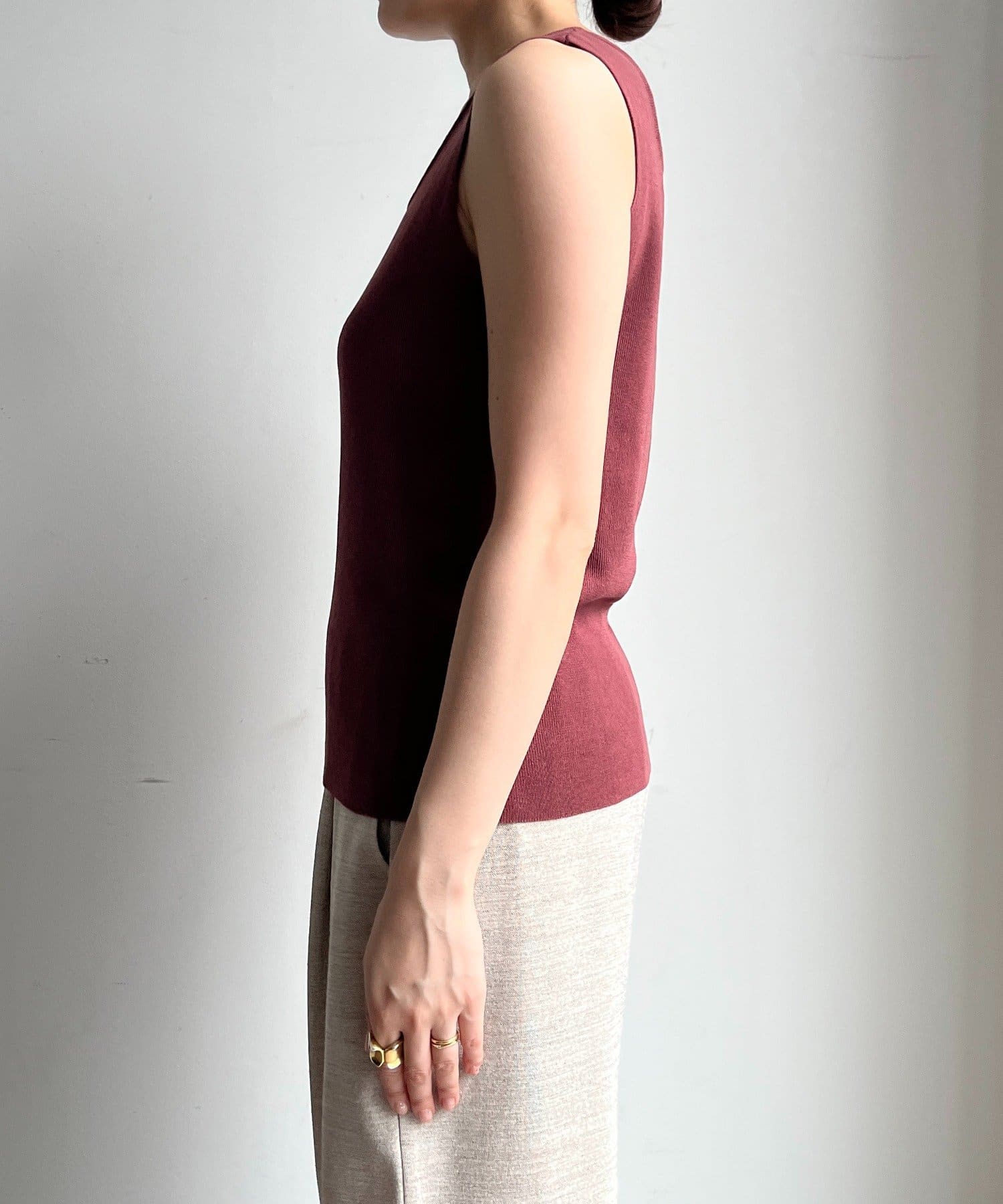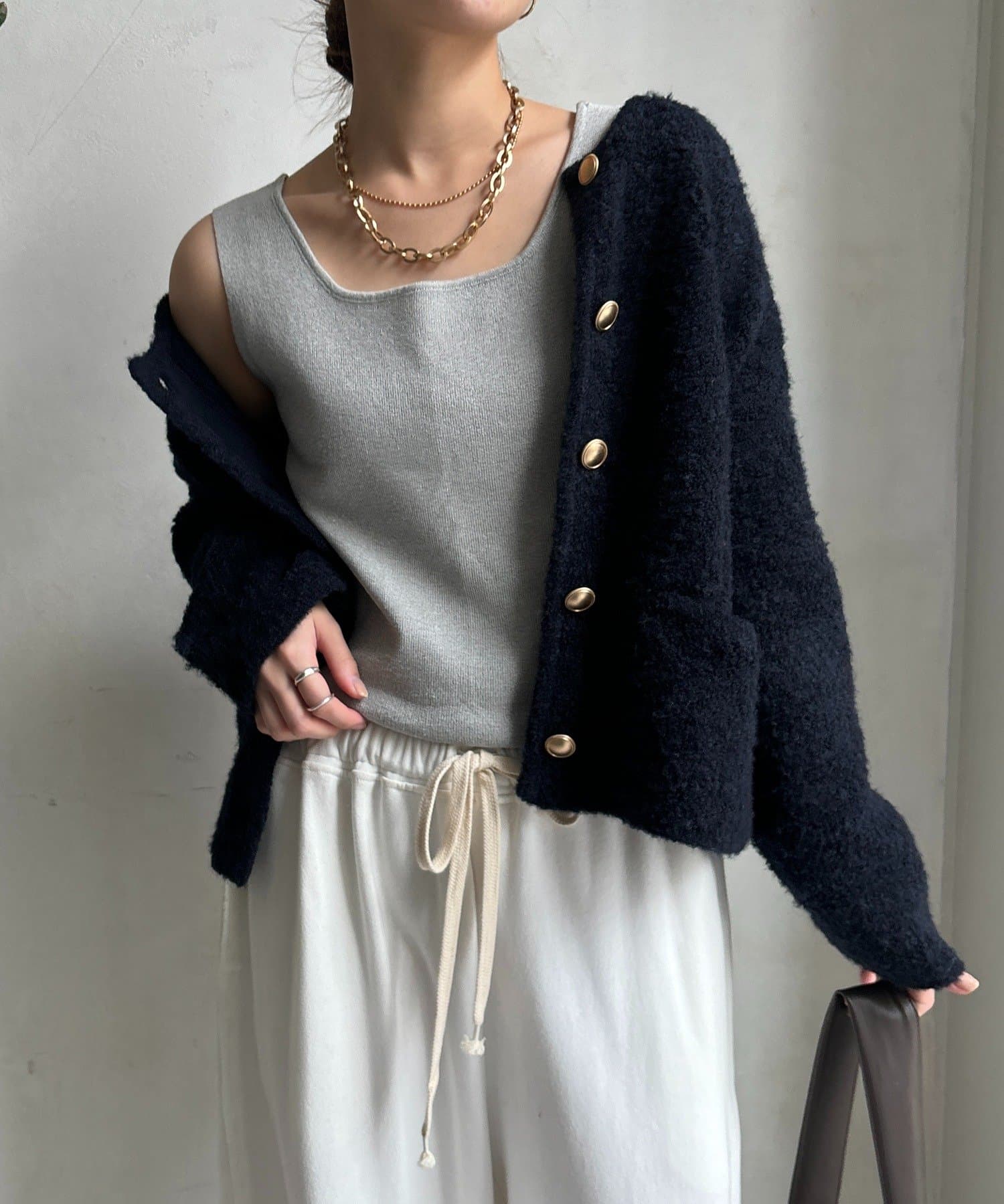 ニット素材で楽に着られ、スクエアネックは小顔効果やデコルテも綺麗に見せてくれます。