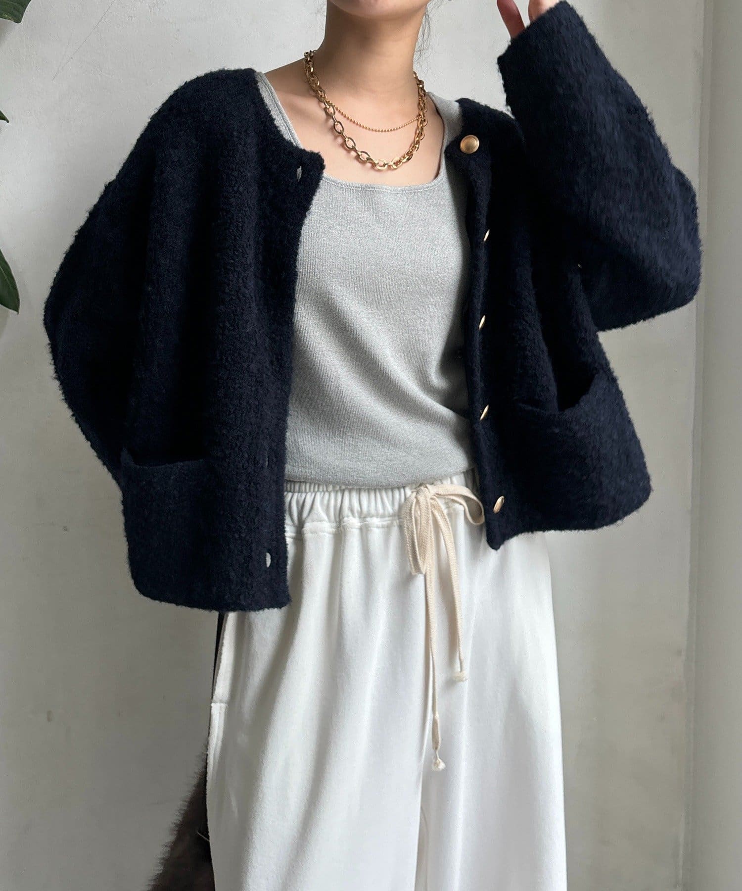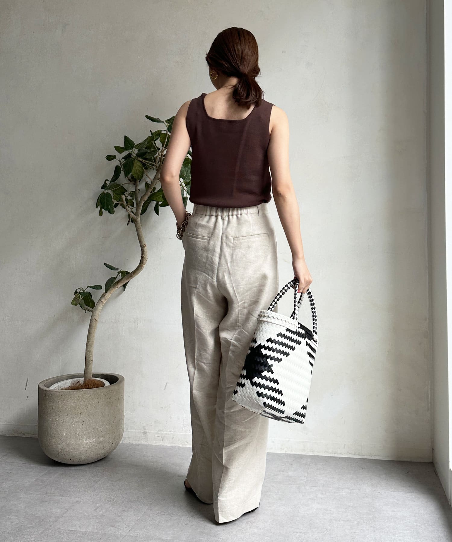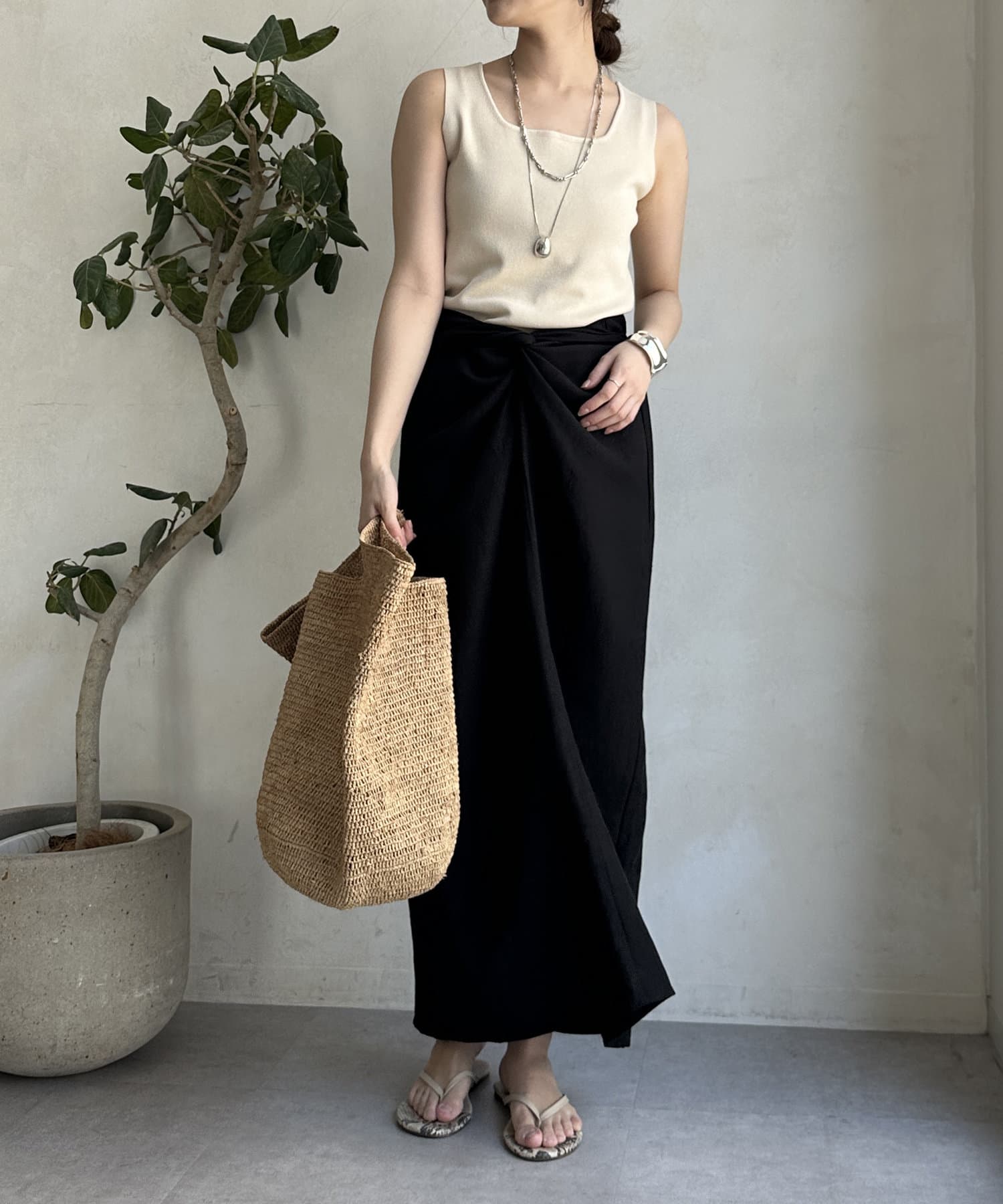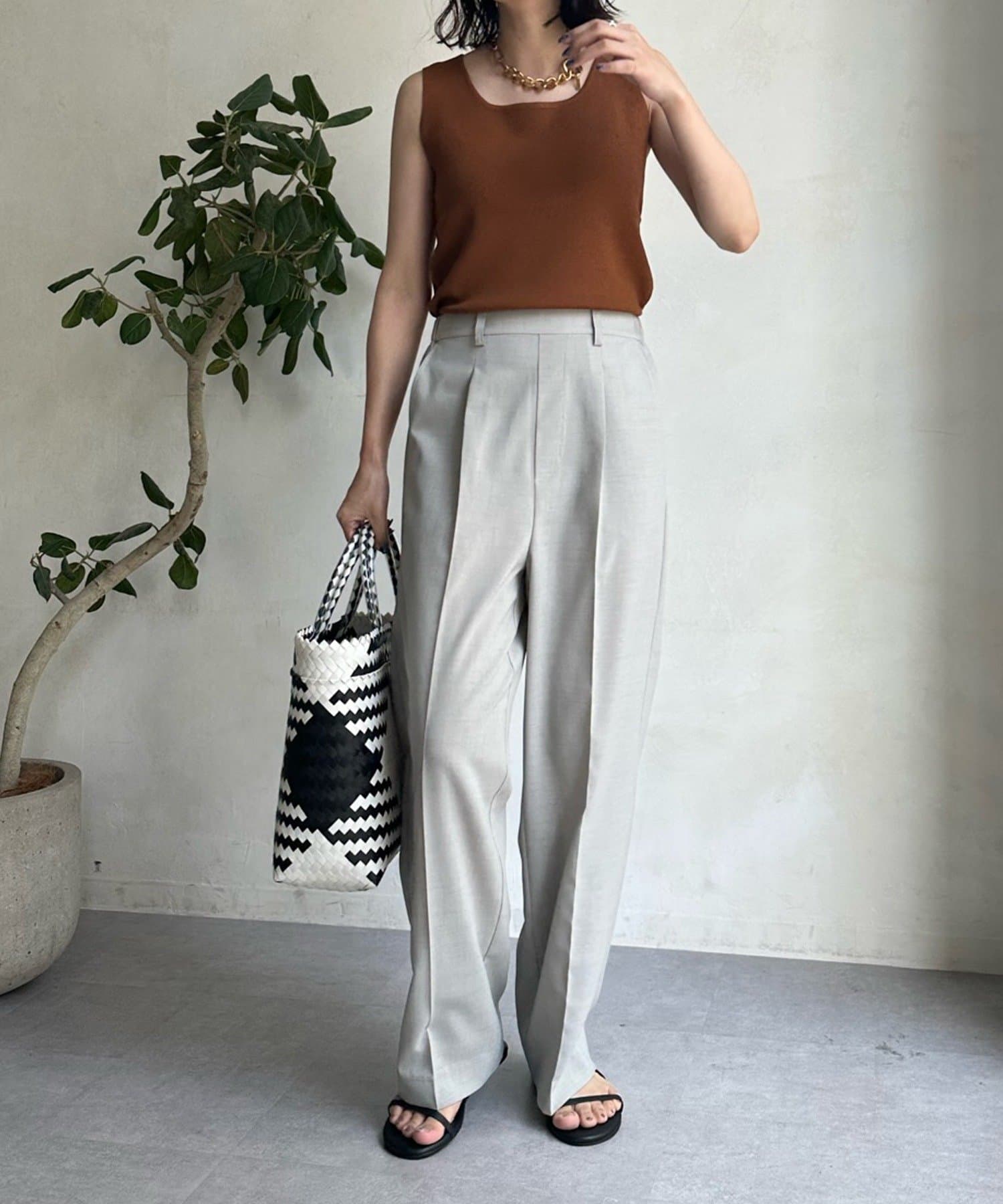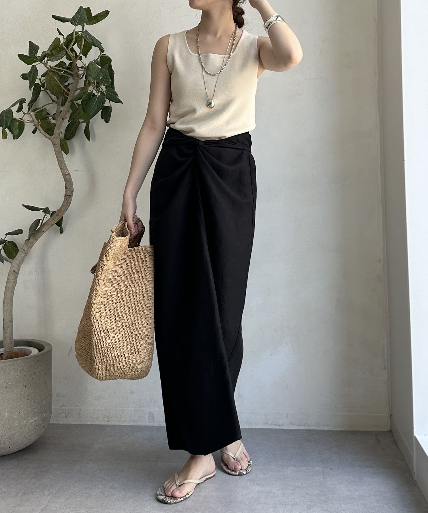 ニット素材で楽に着られ、スクエアネックは小顔効果やデコルテも綺麗に見せてくれます。