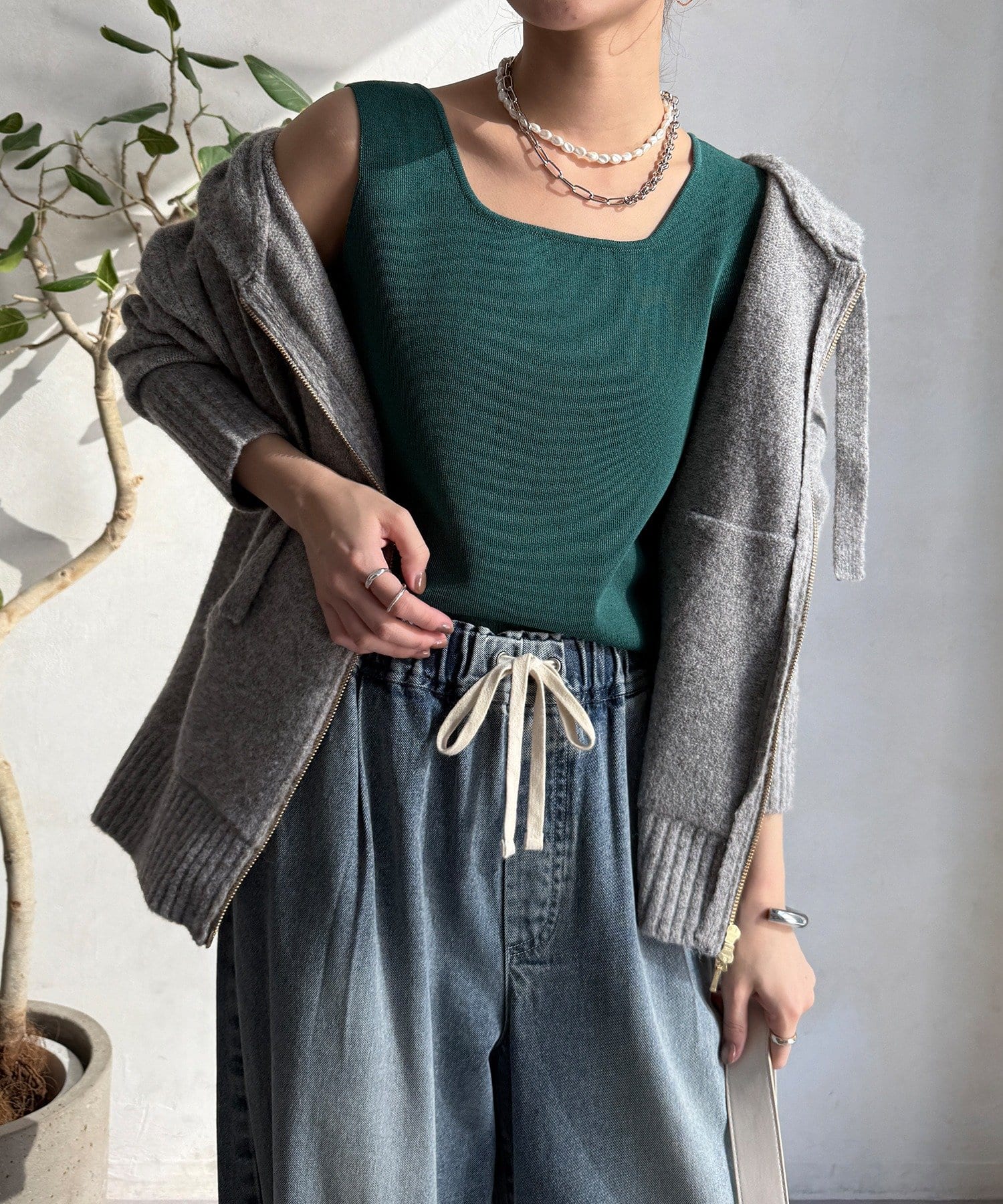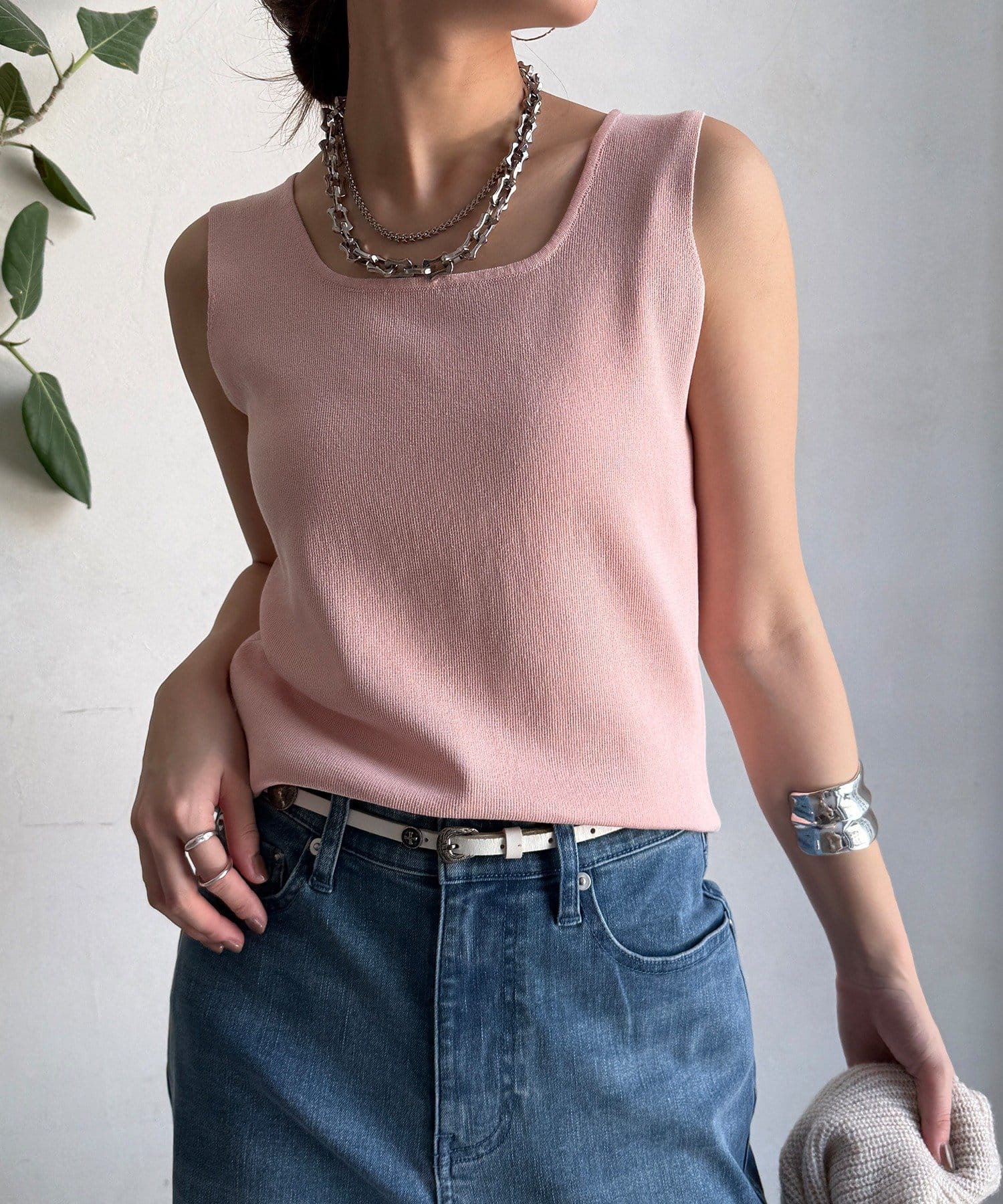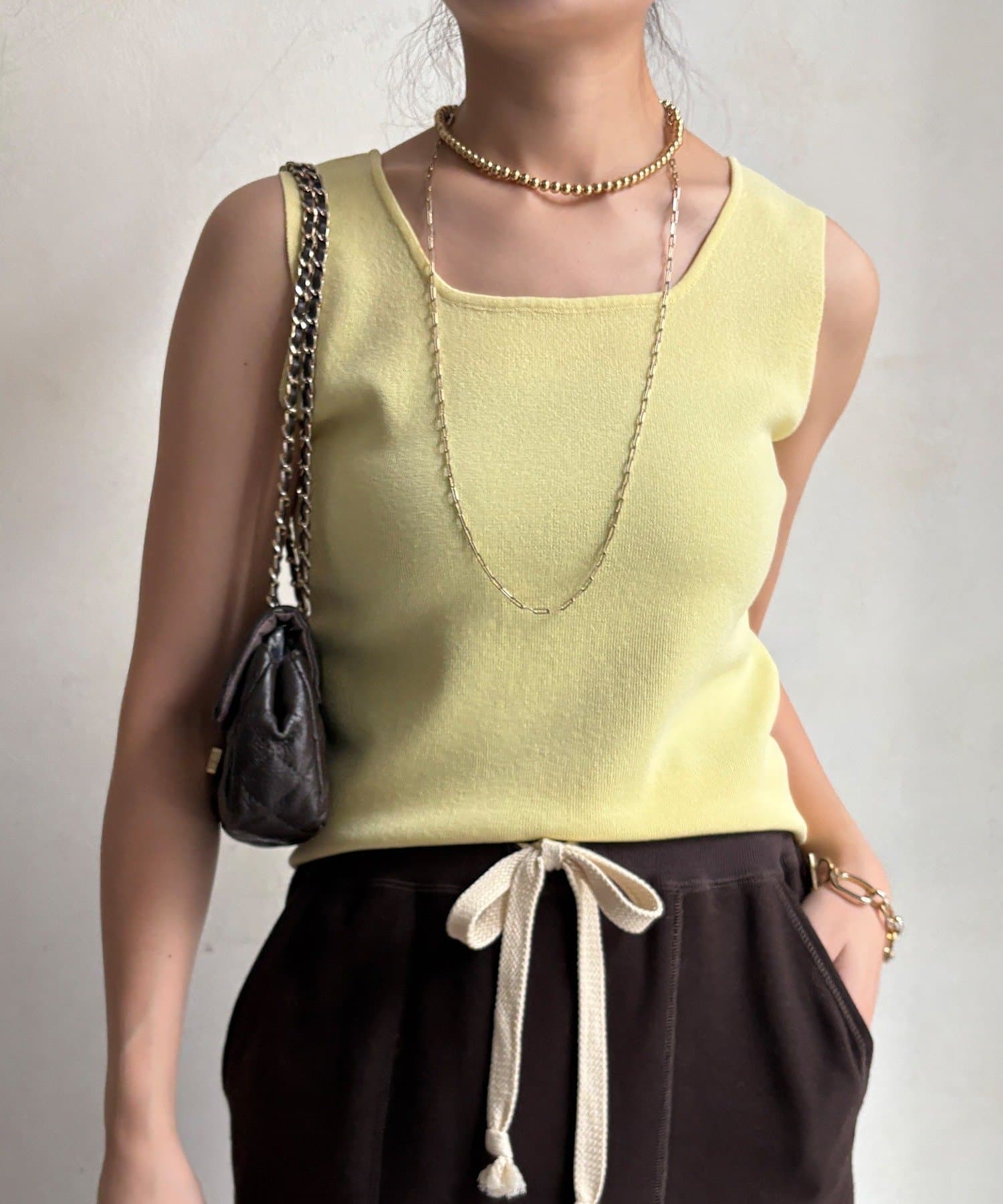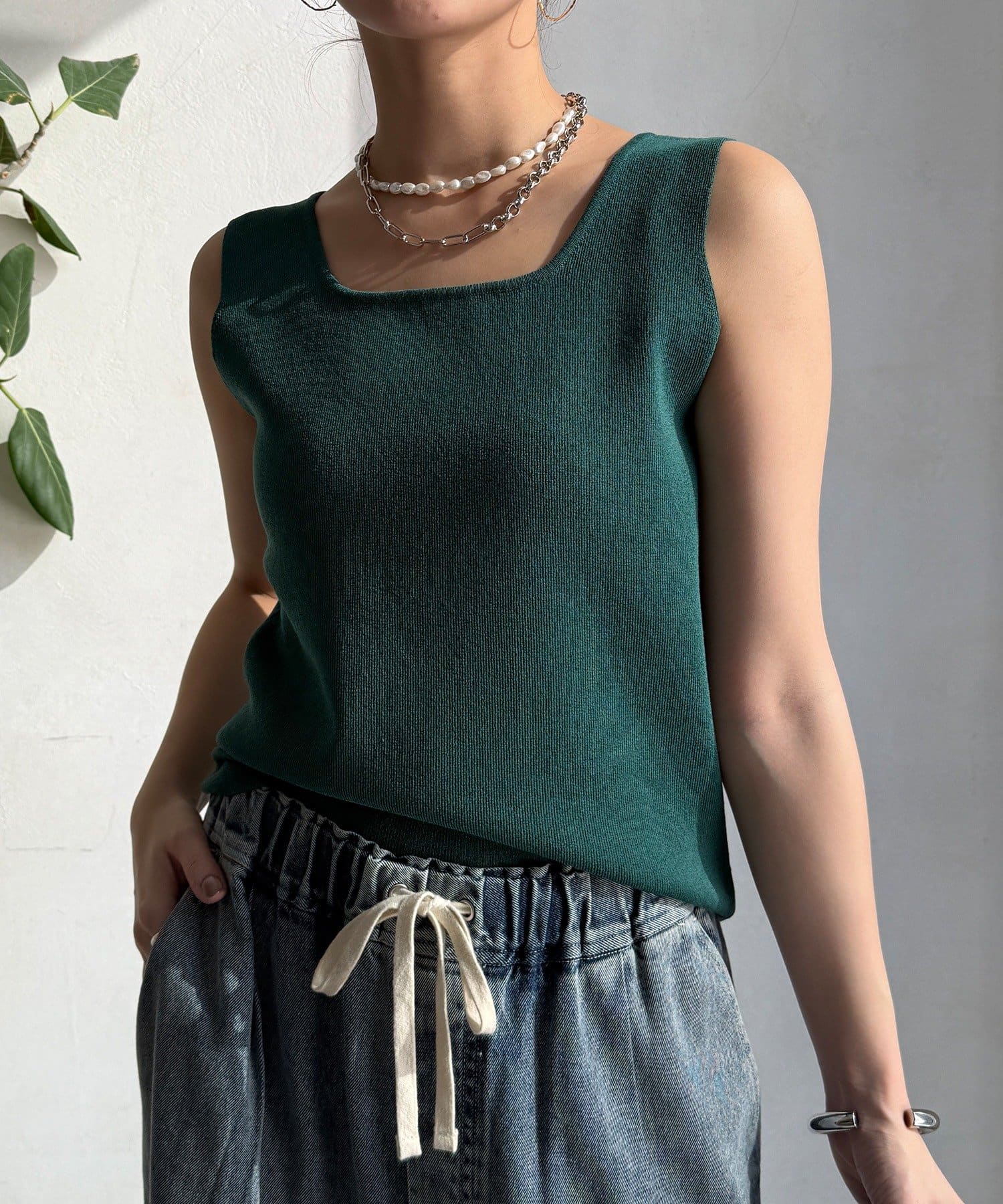 ニット素材で楽に着られ、スクエアネックは小顔効果やデコルテも綺麗に見せてくれます。