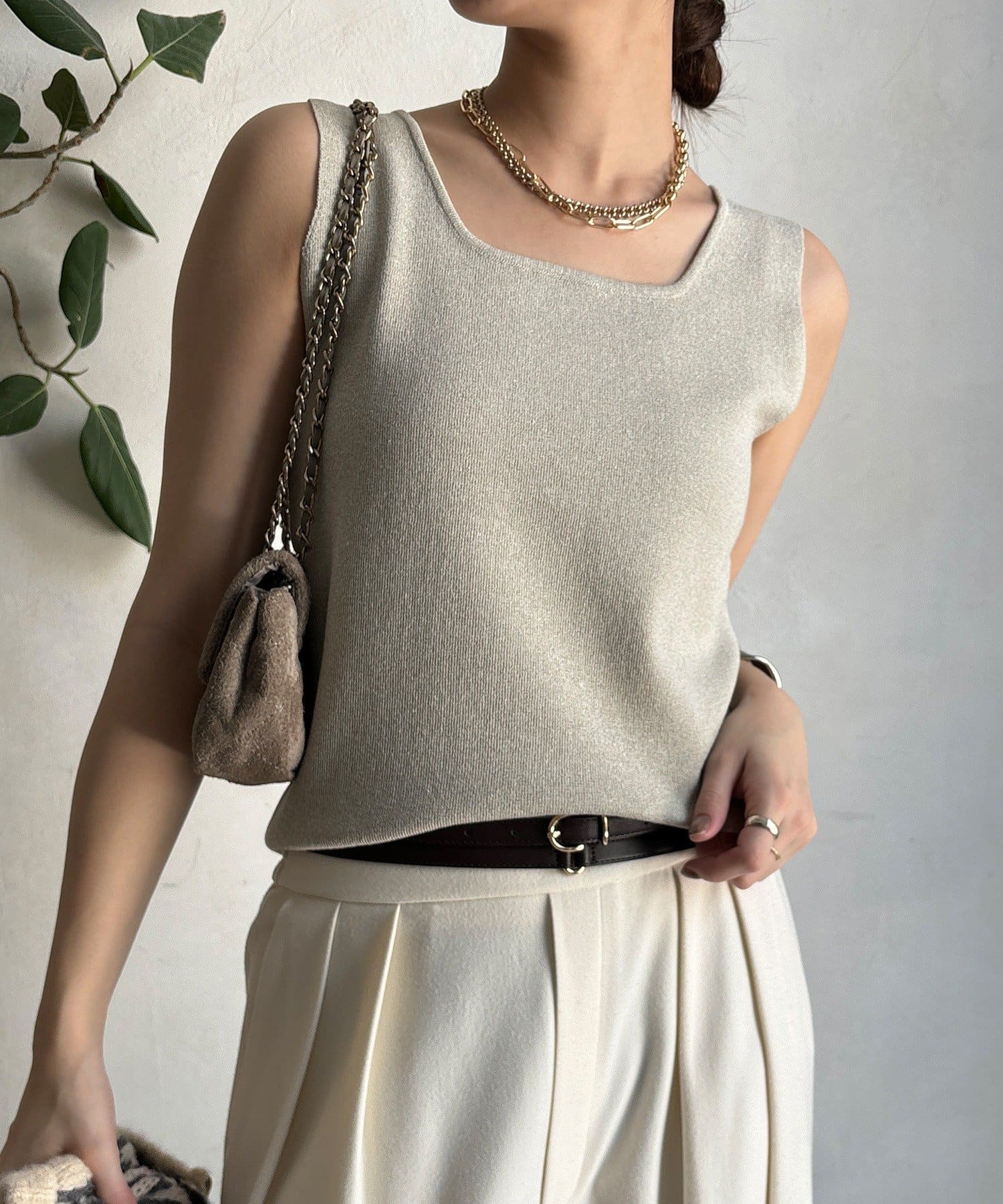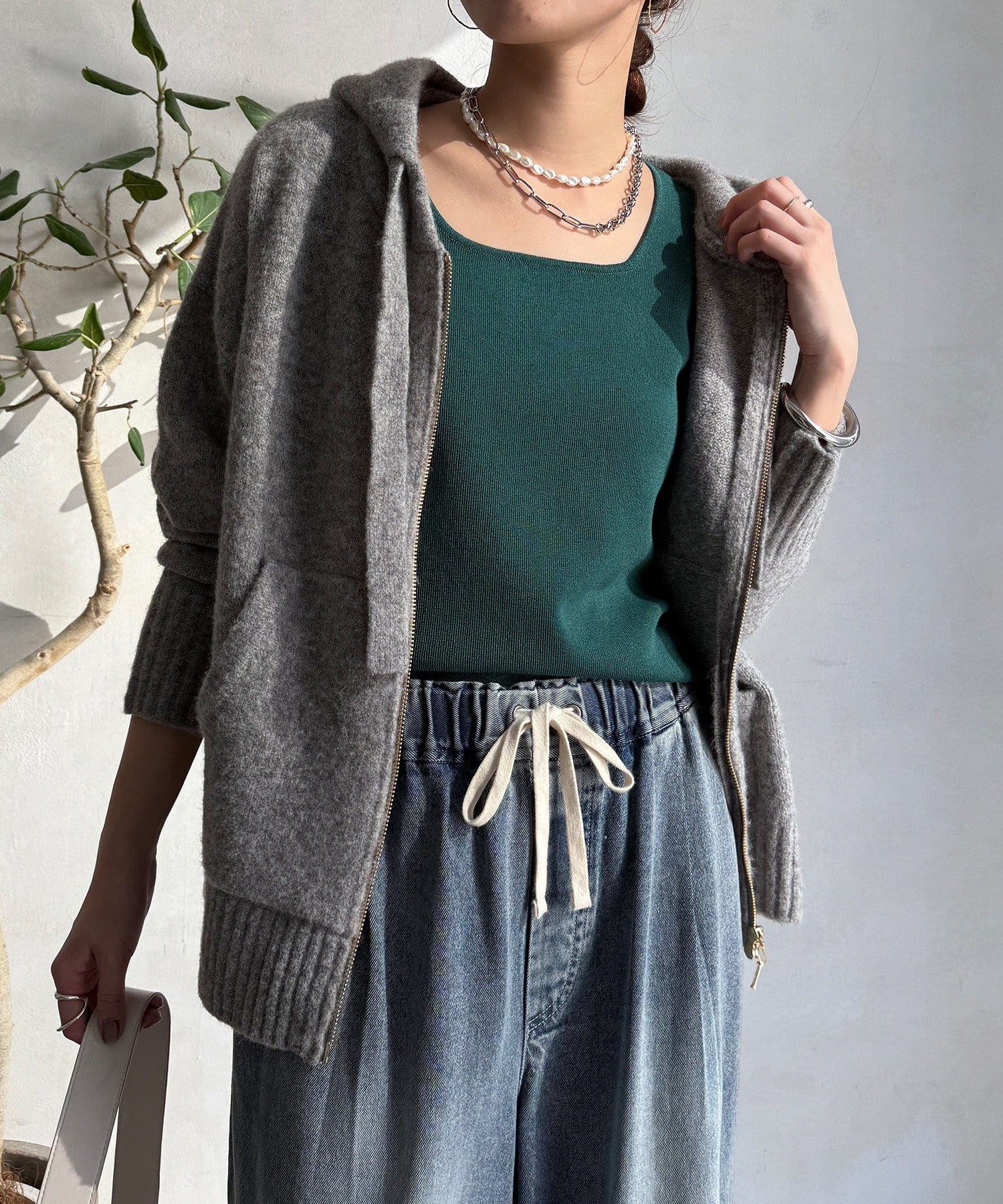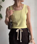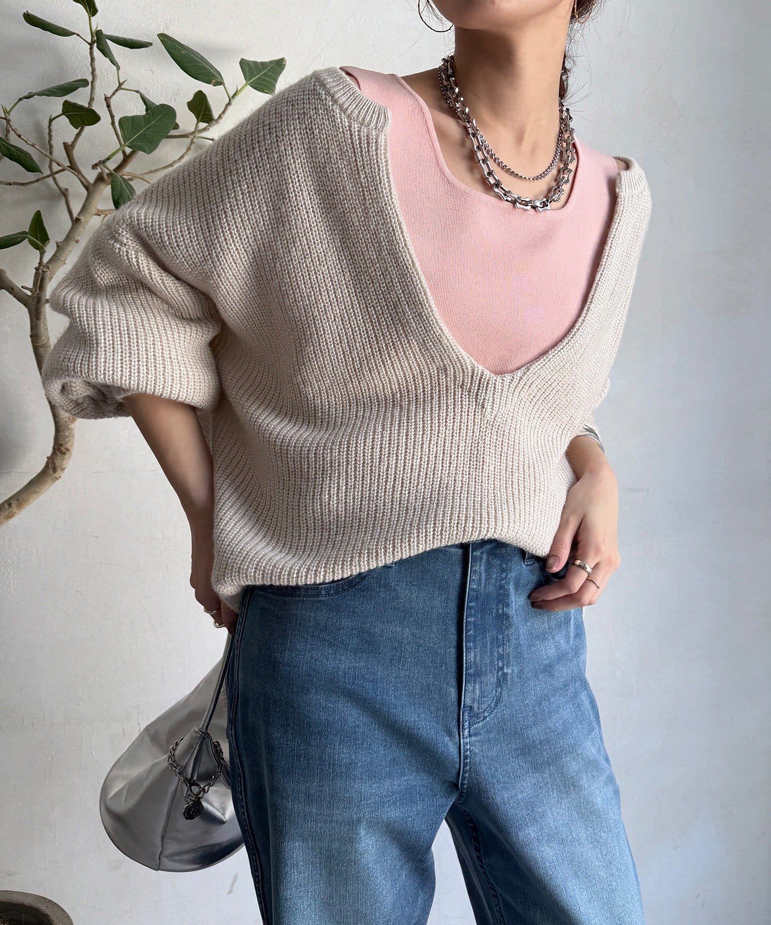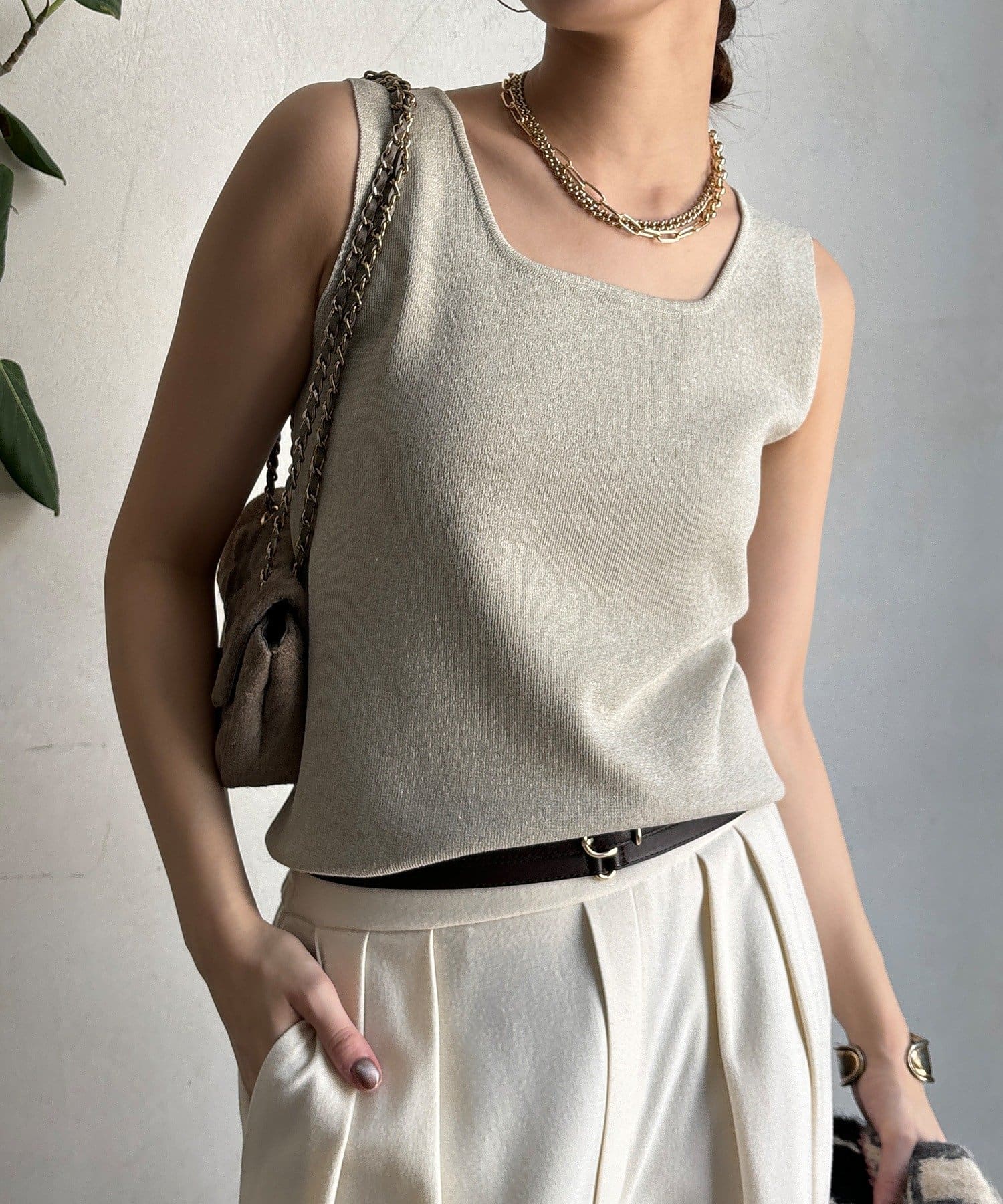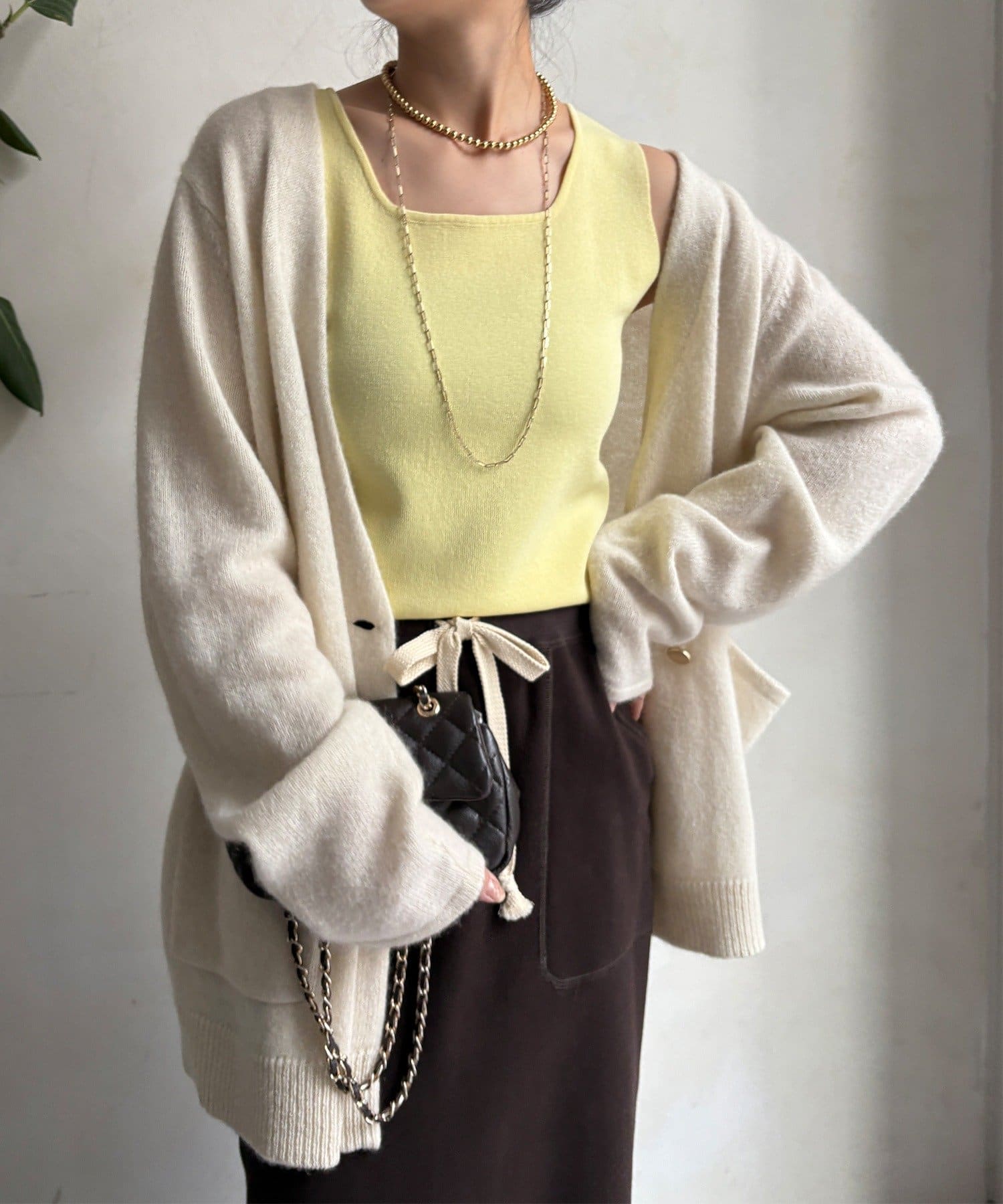 ニット素材で楽に着られ、スクエアネックは小顔効果やデコルテも綺麗に見せてくれます。