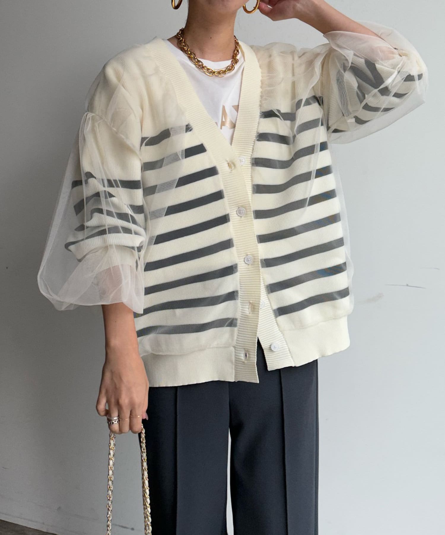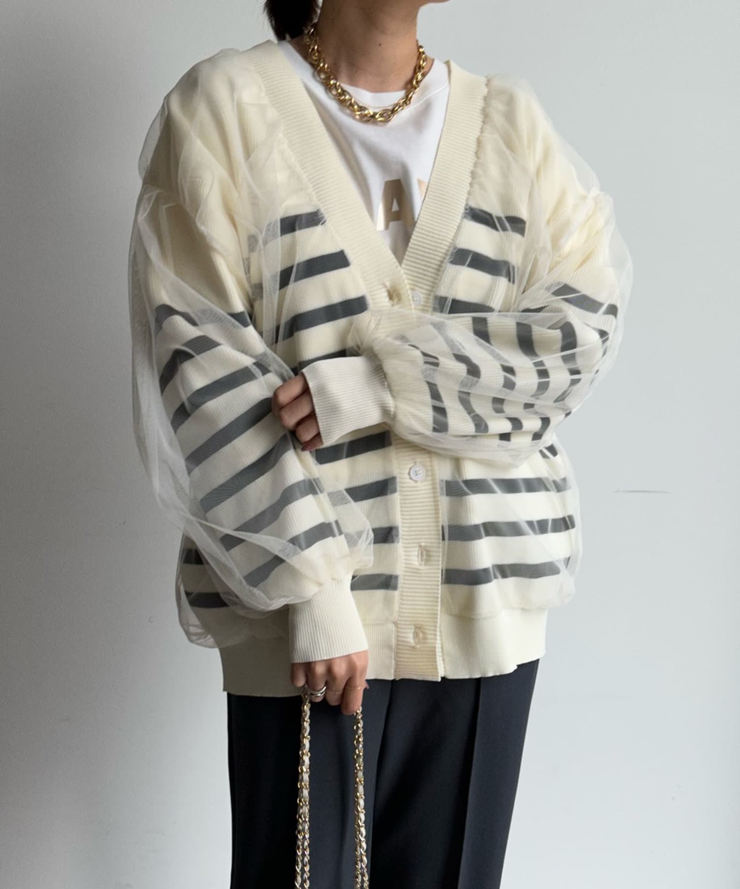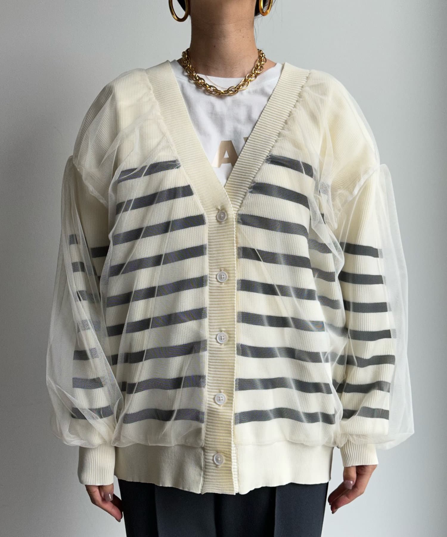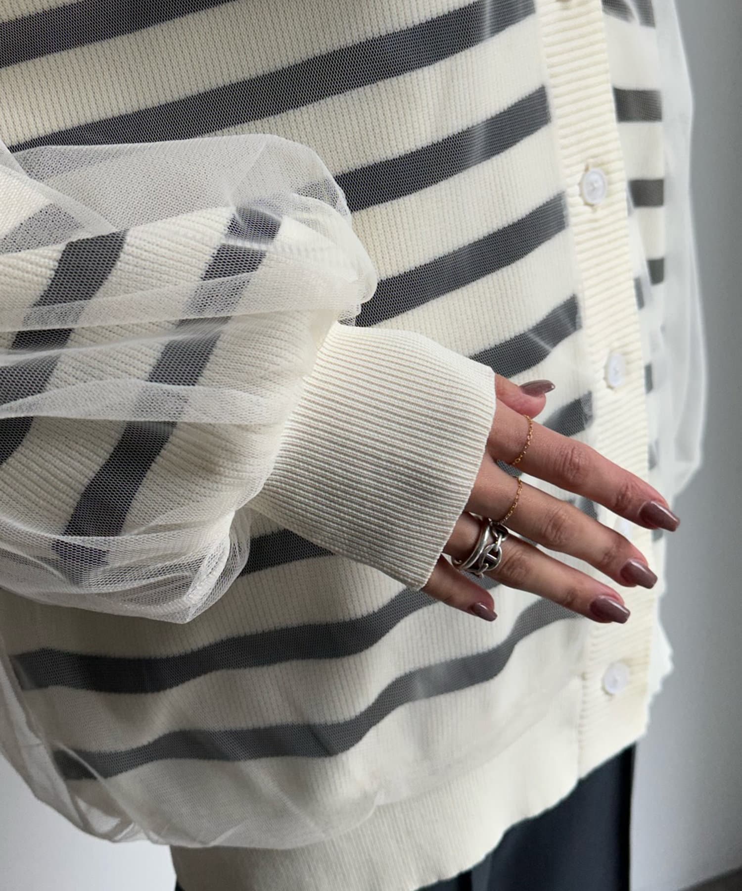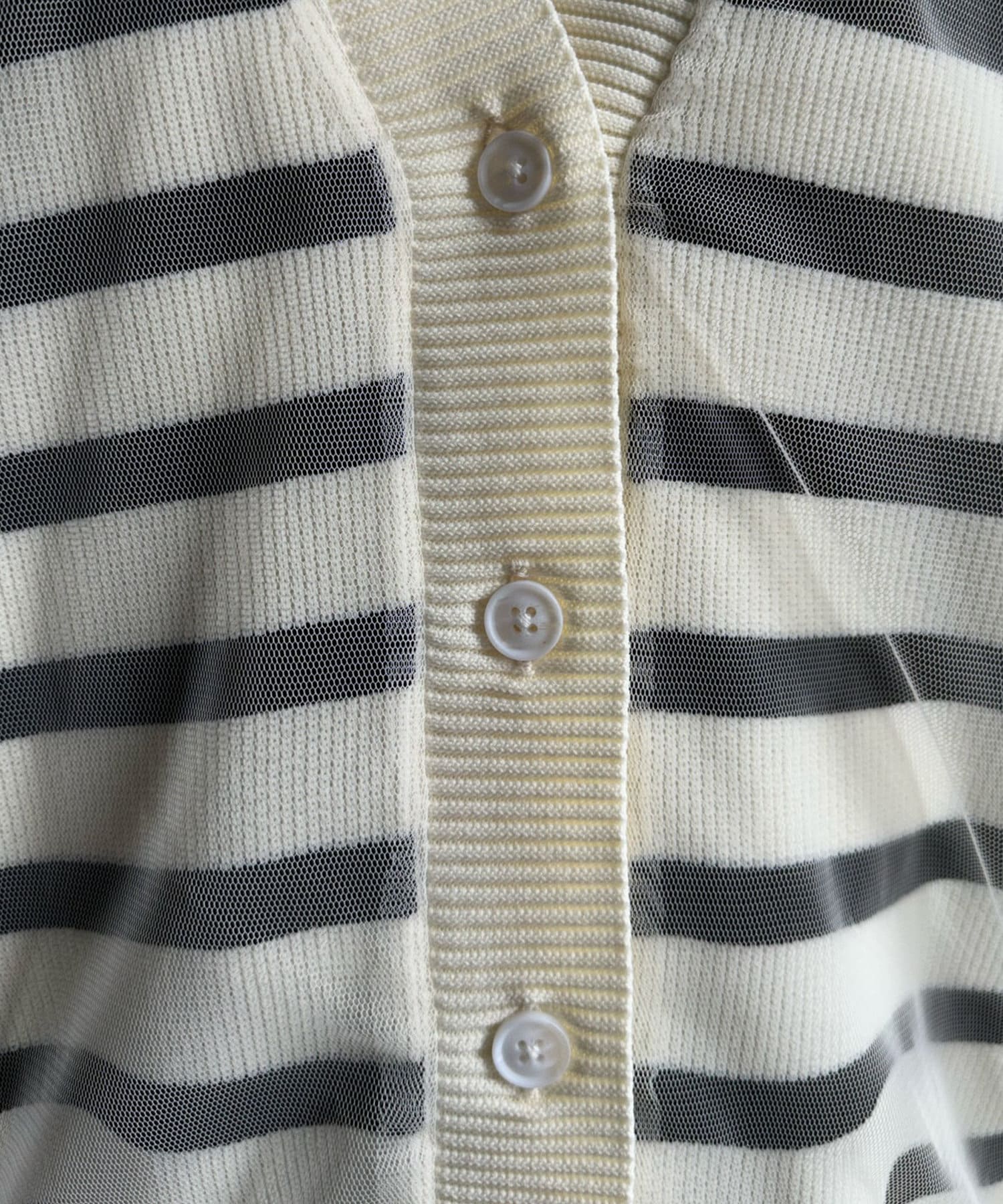 ボーダー柄のカーディガンに、異素材のチュールデザインをプラスしたカーディガン。