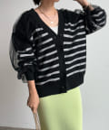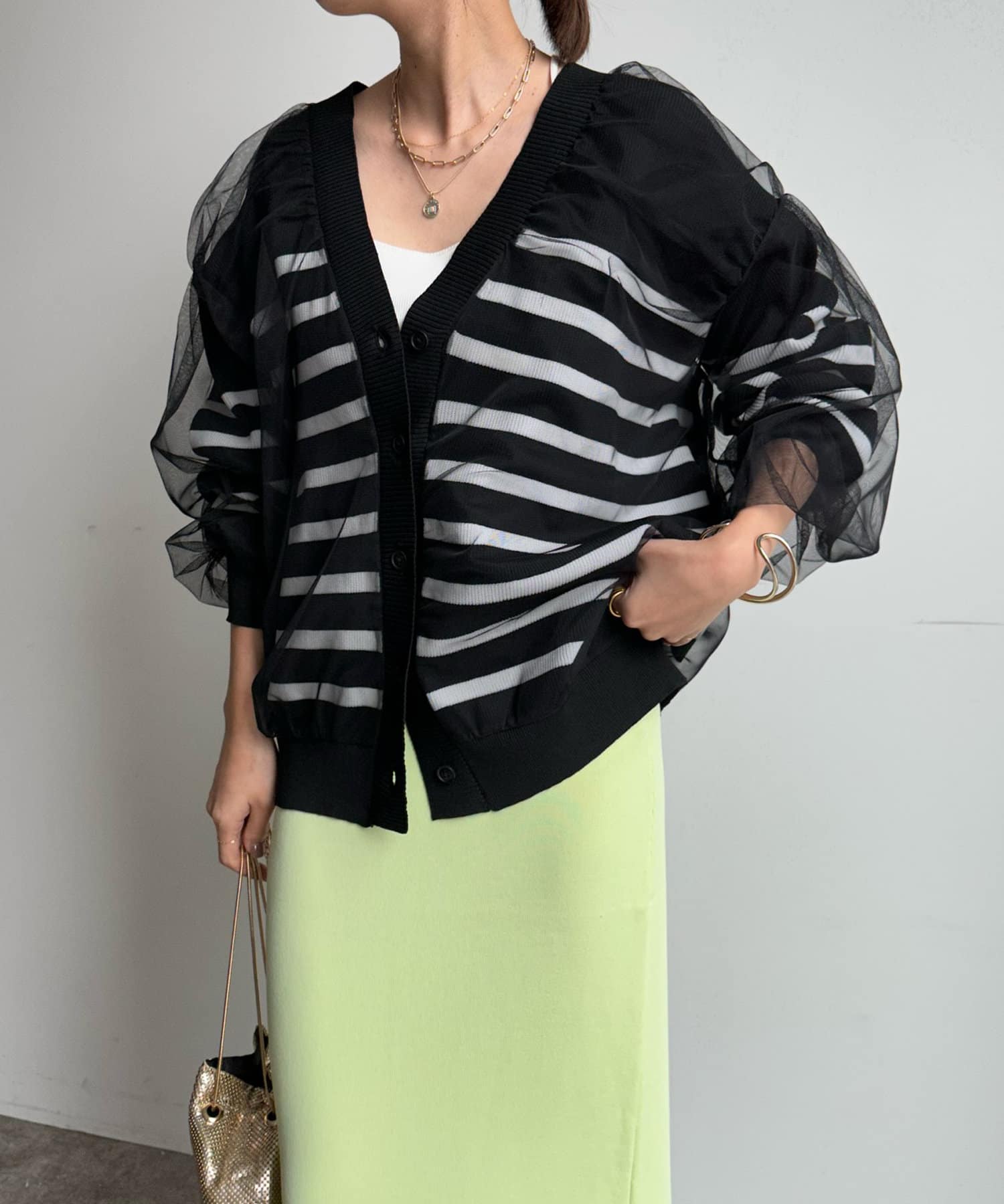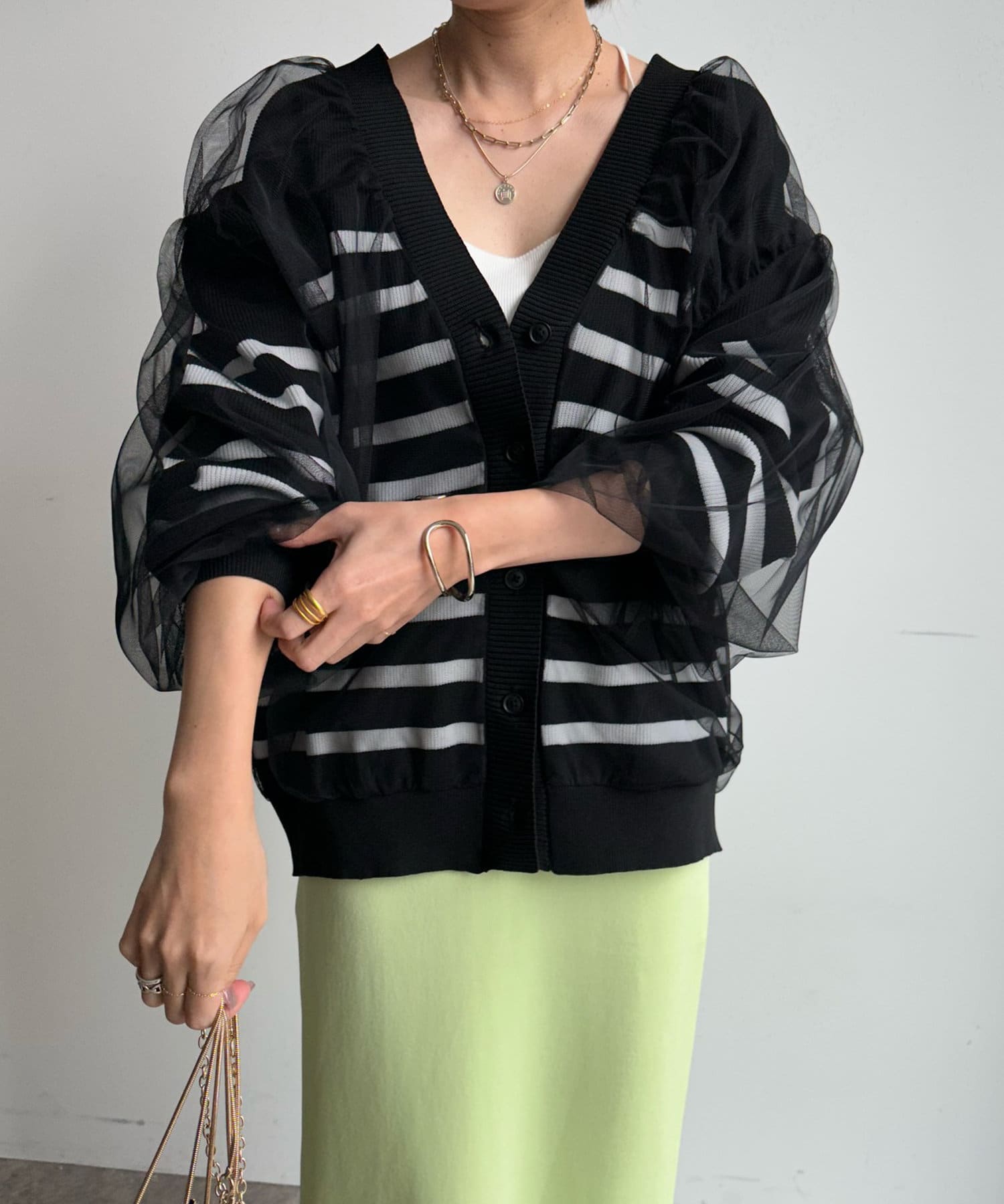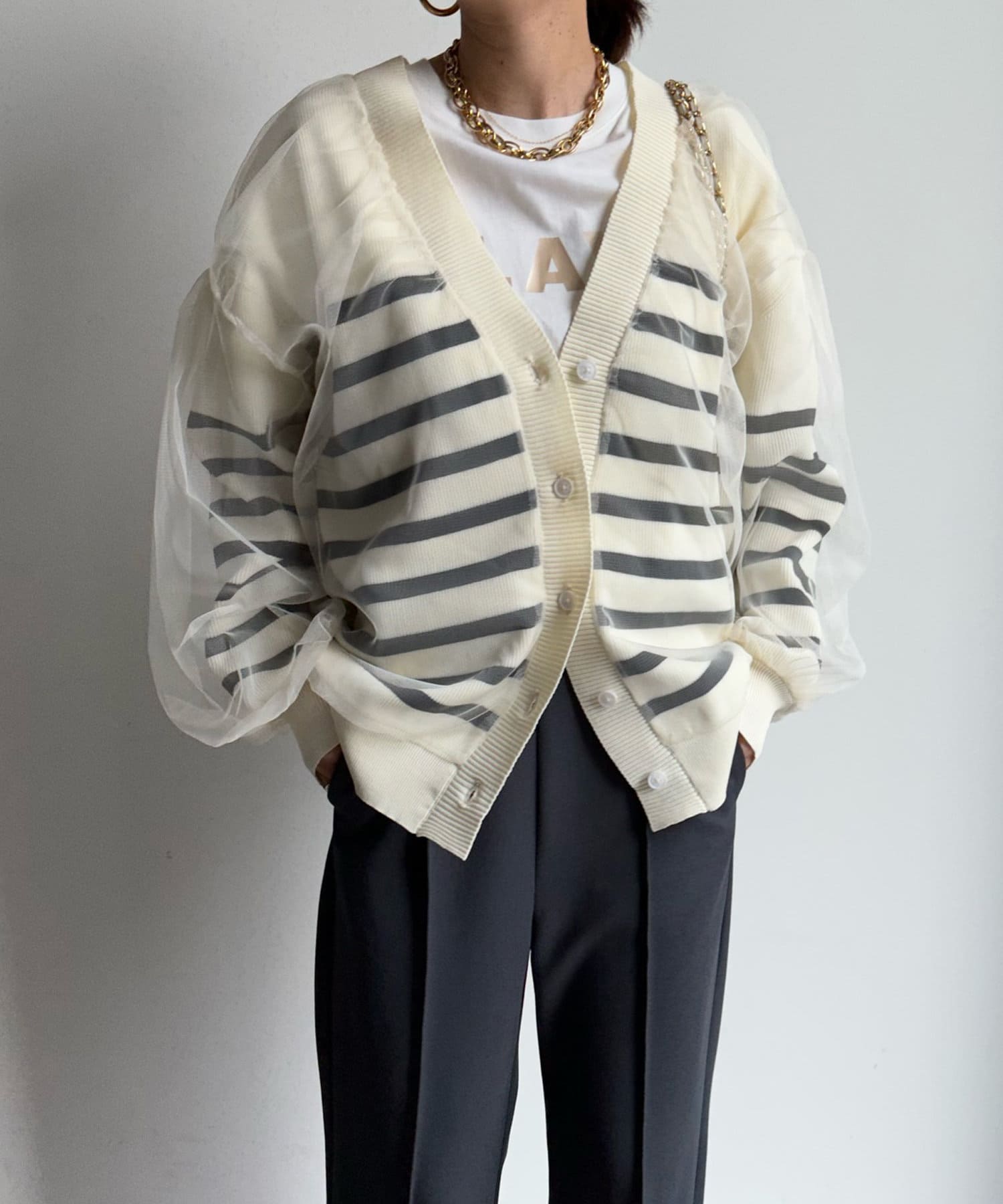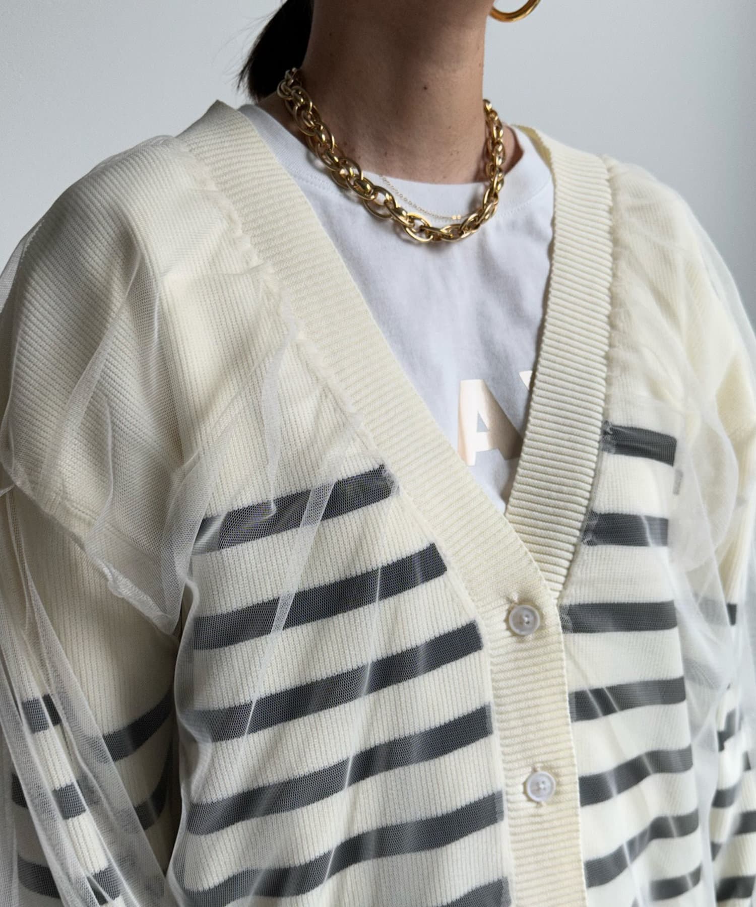 ボーダー柄のカーディガンに、異素材のチュールデザインをプラスしたカーディガン。