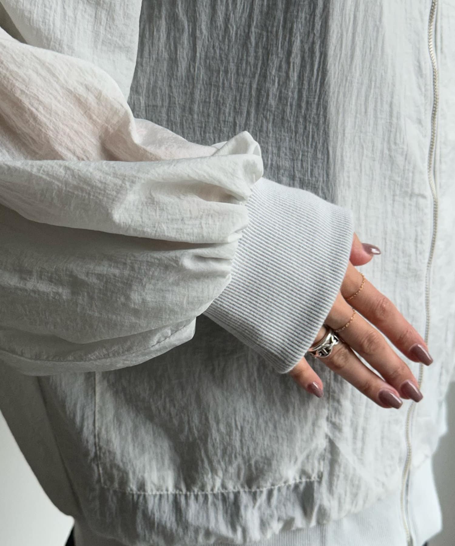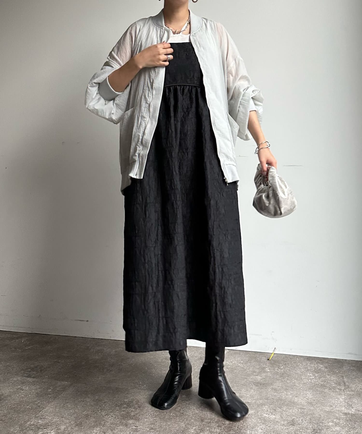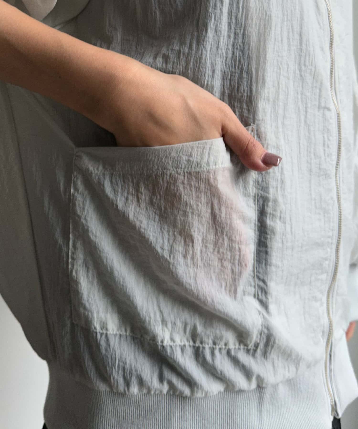 一見カジュアルに見えるブルゾンですが、落ち着きのあるカラーリングと透けすぎない程よい透け感で、大人らしさを演出します。