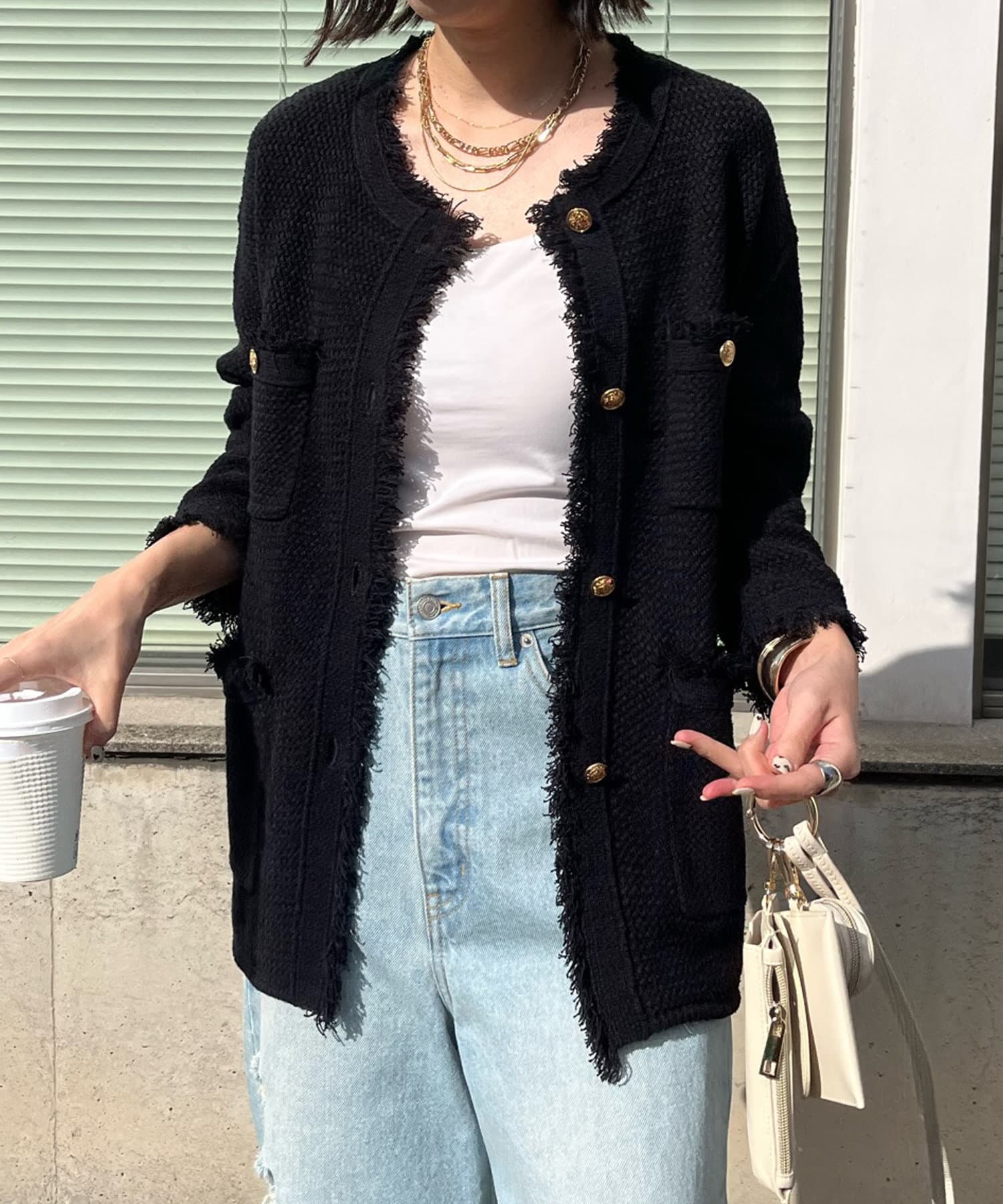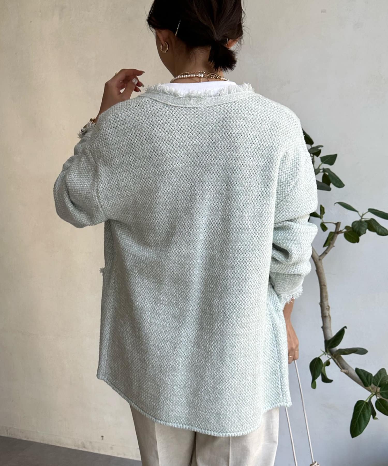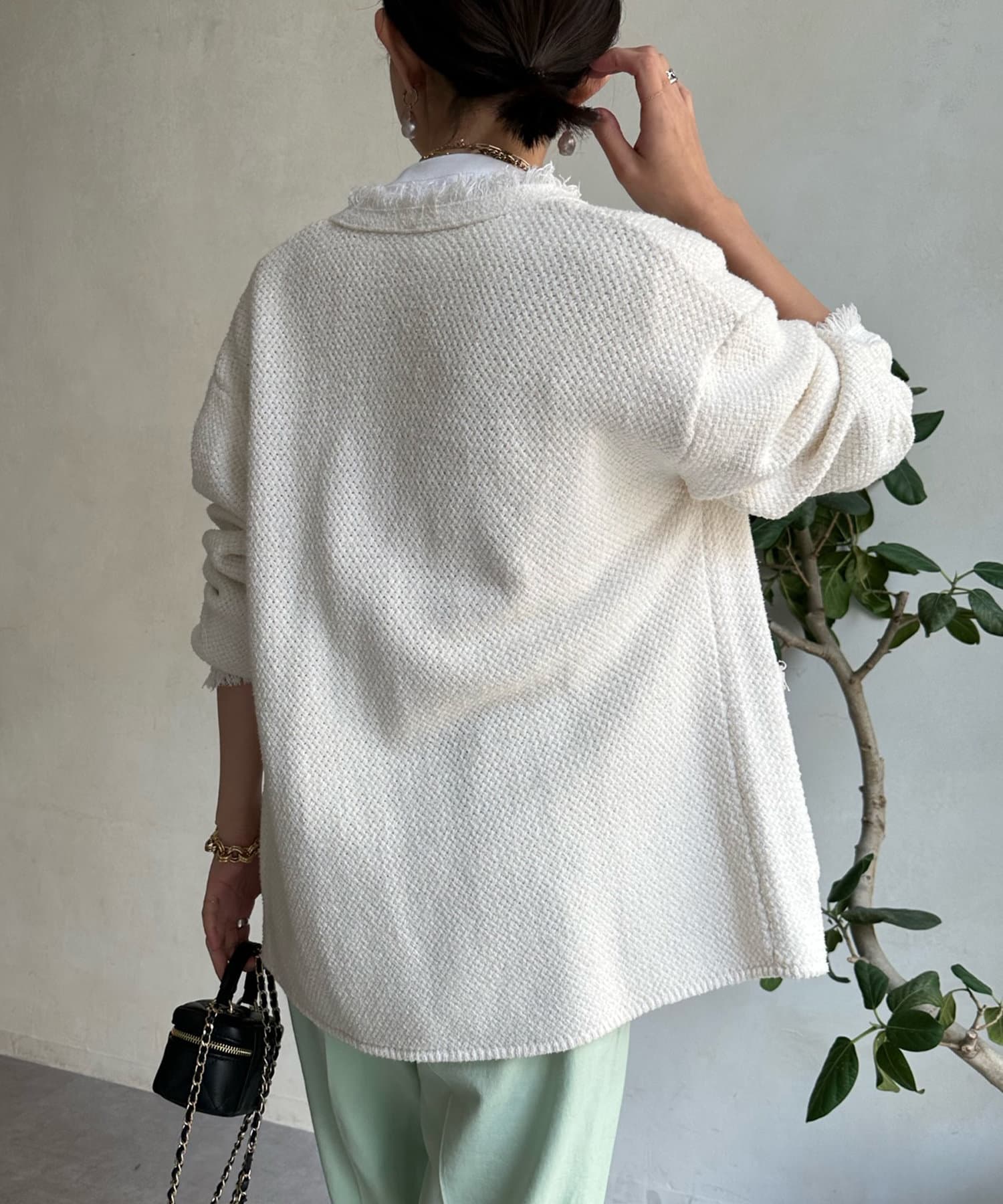 カノコ編みの凸凹とした表面感が今季らしく、裾のフリンジ始末で程よいカジュアルさをプラス。