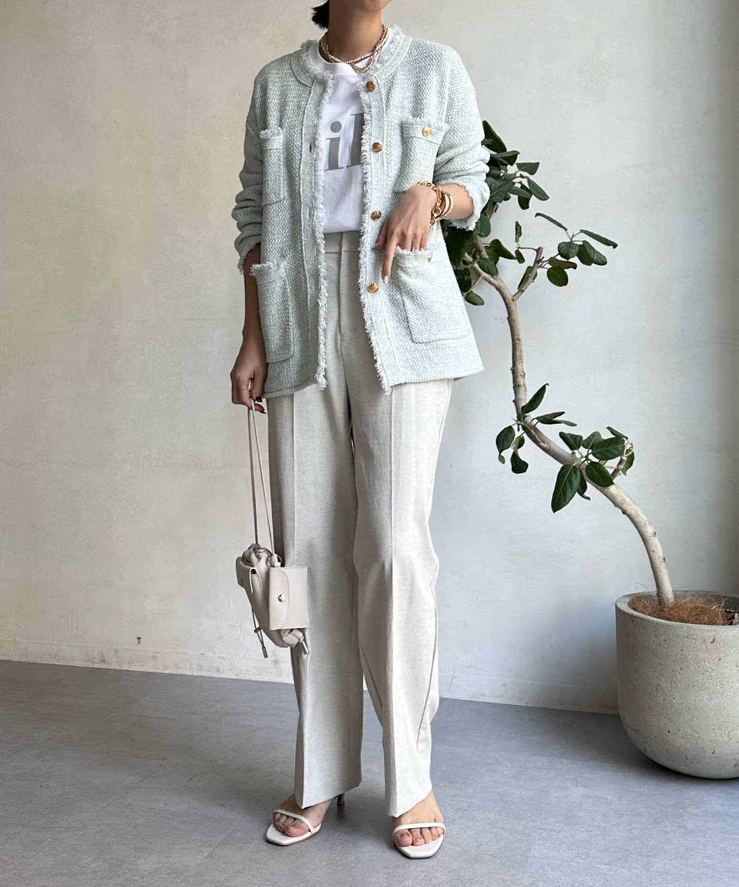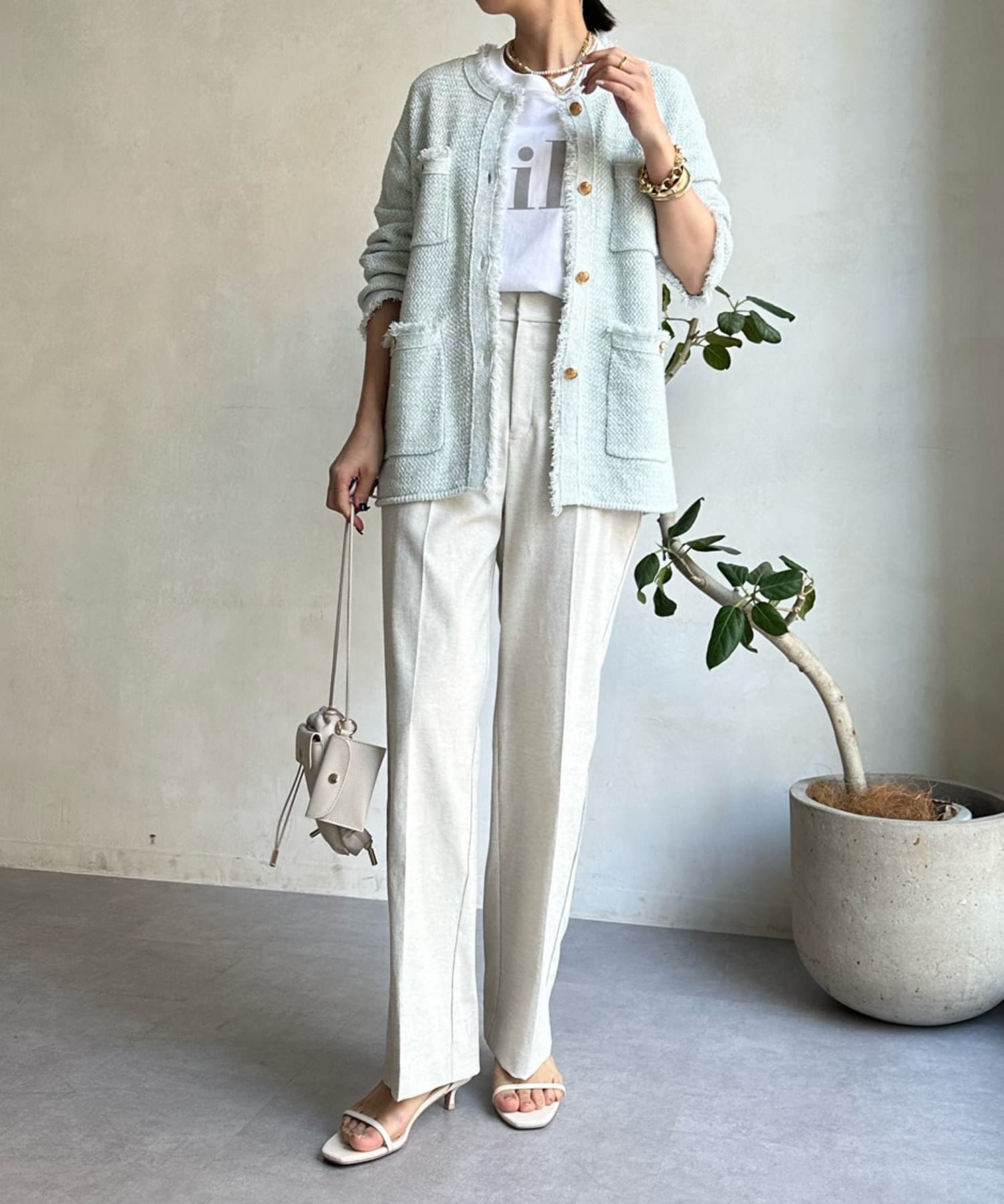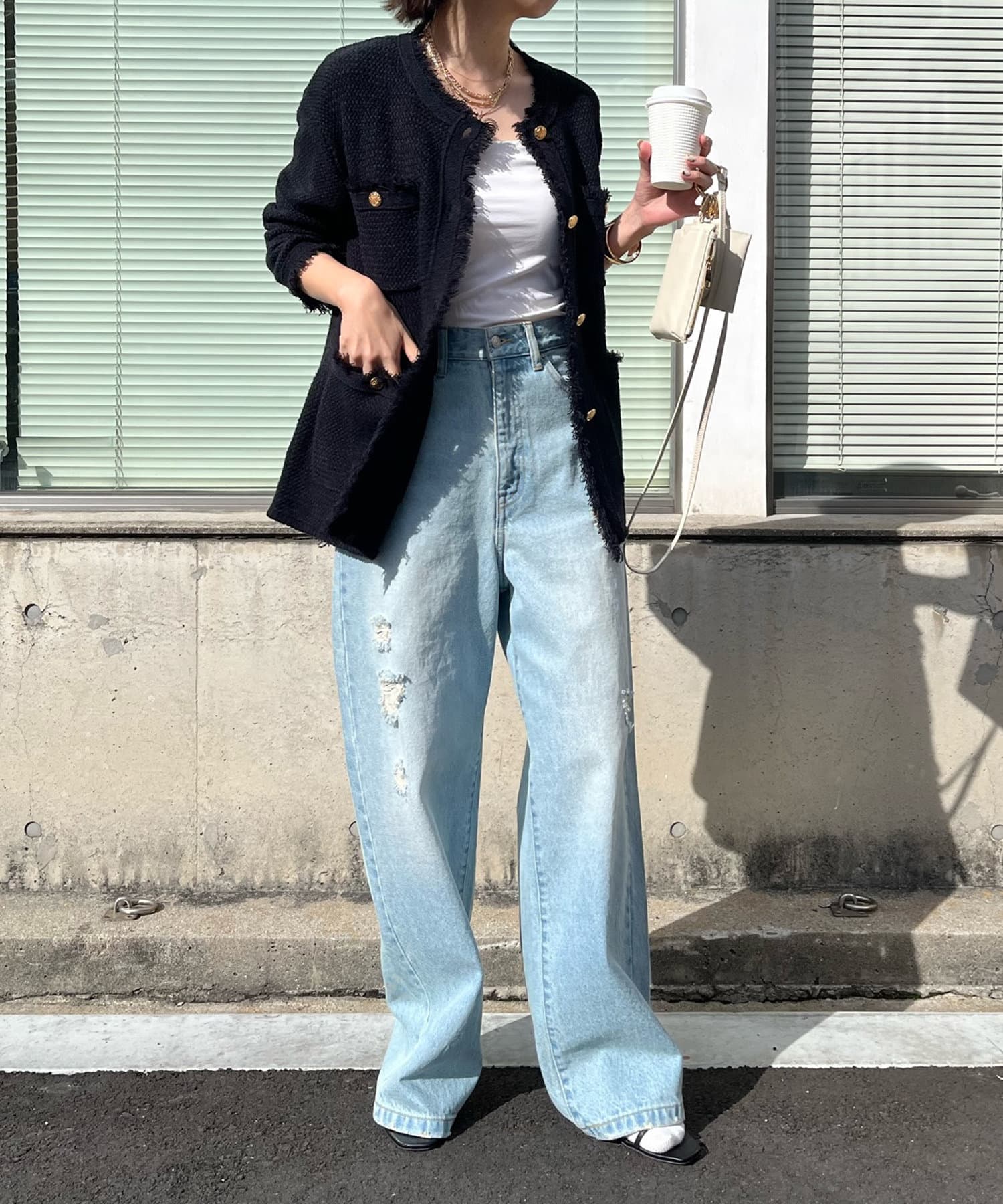 カノコ編みの凸凹とした表面感が今季らしく、裾のフリンジ始末で程よいカジュアルさをプラス。