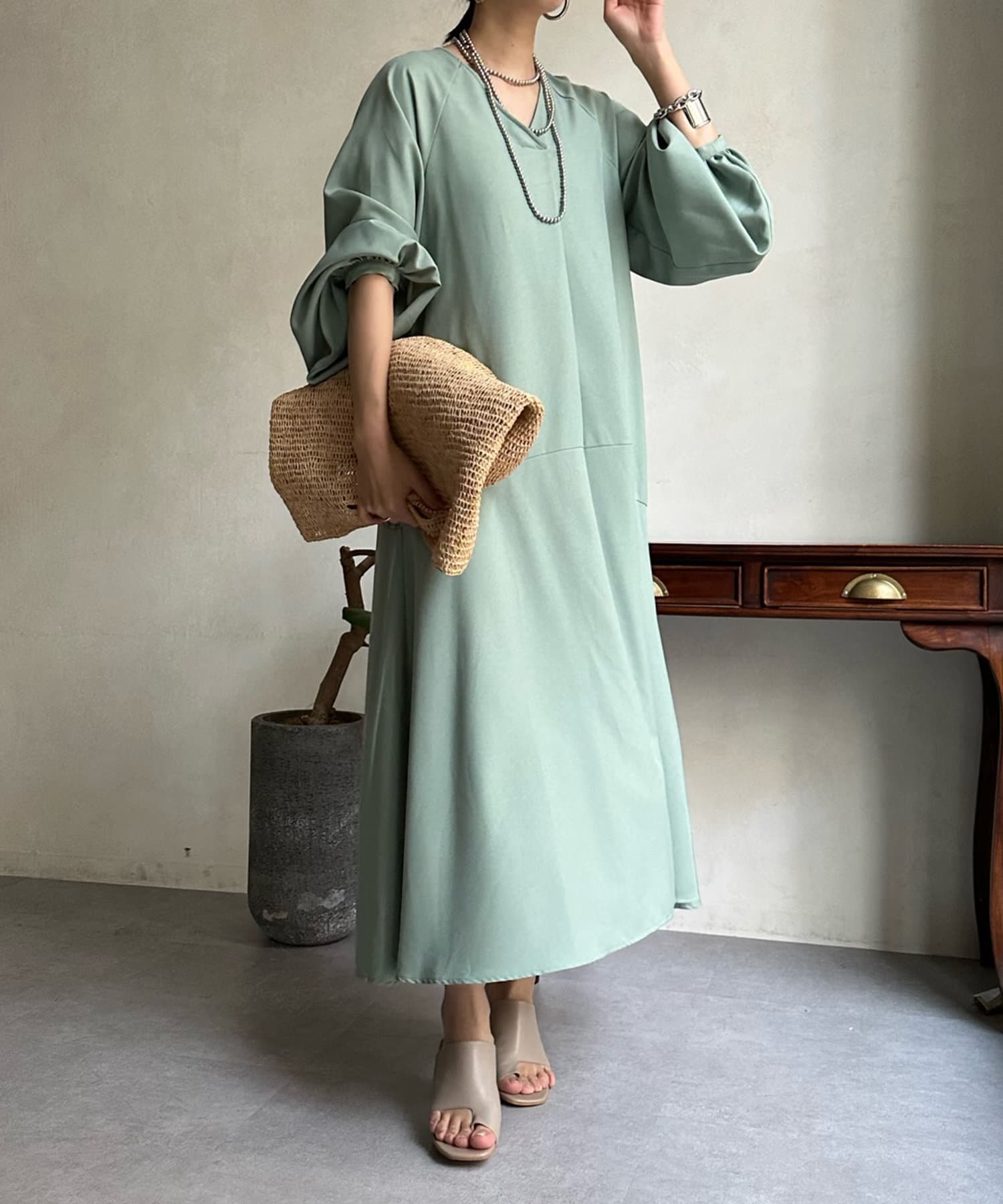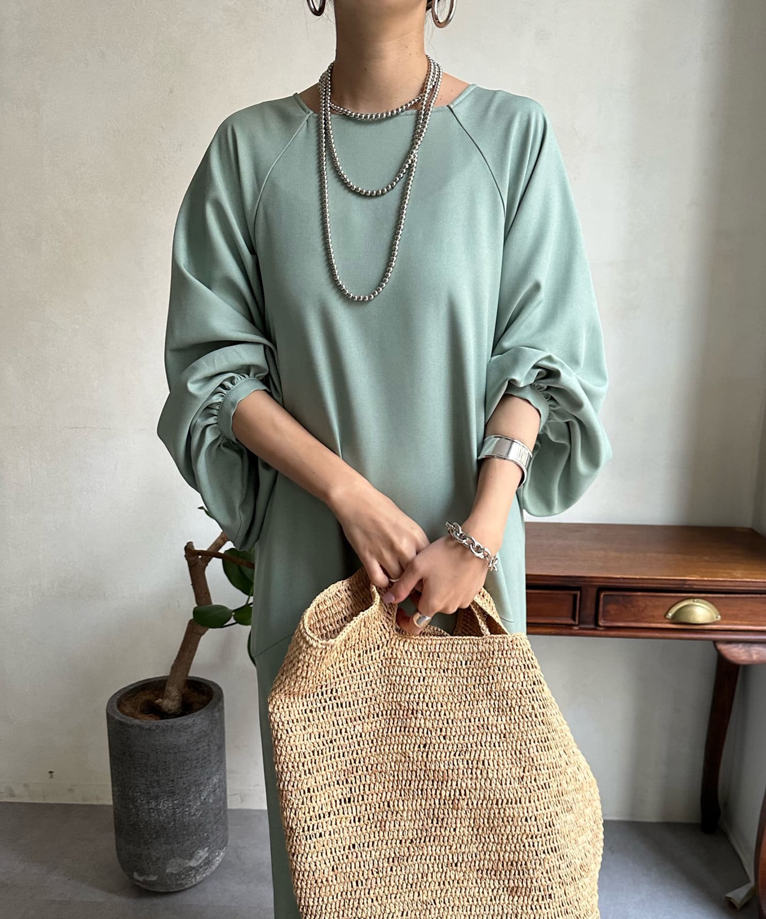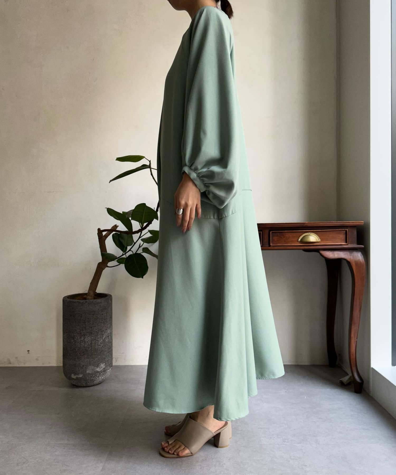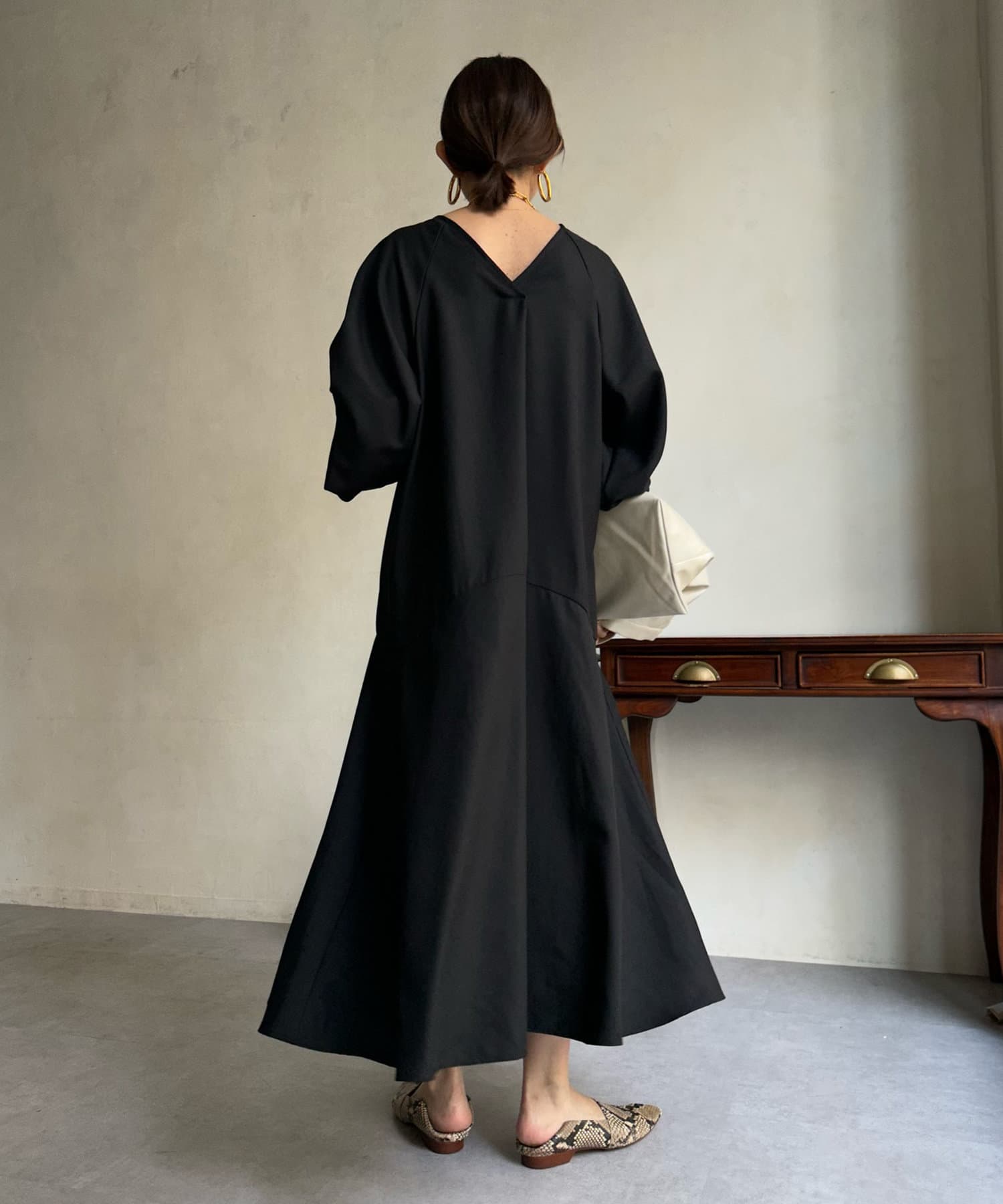 ふんわりと大胆なボリュームスリーブが存在感抜群のワンピース。