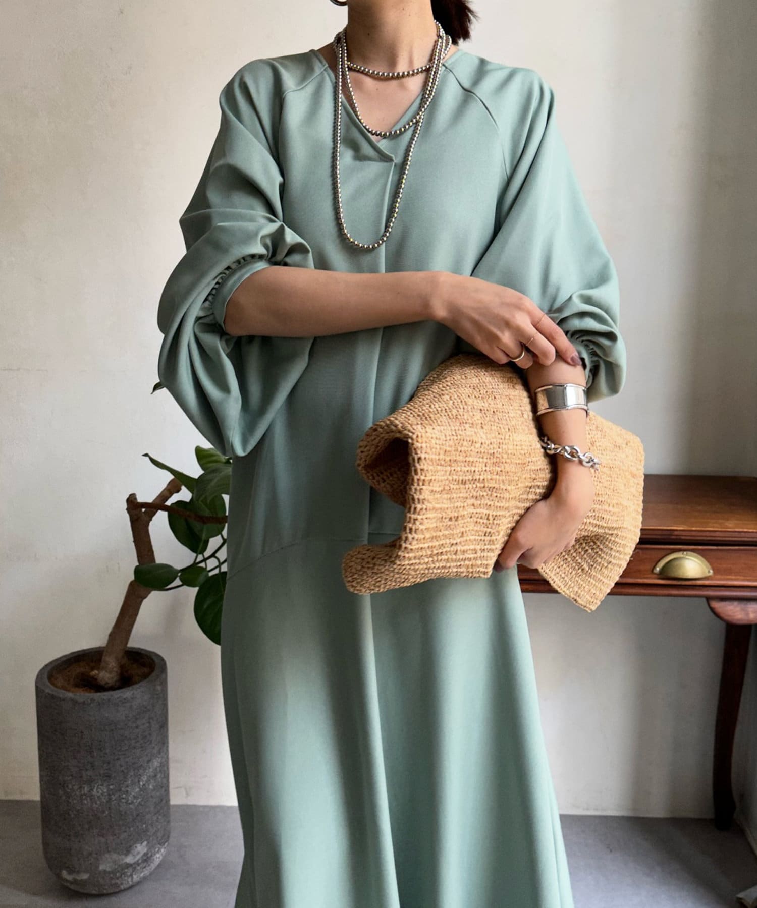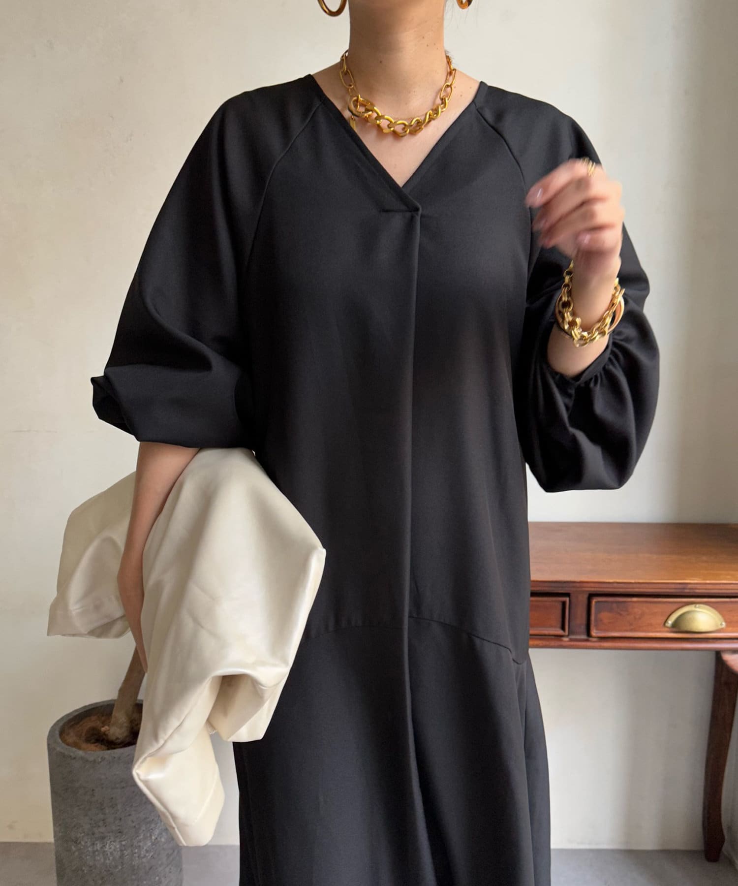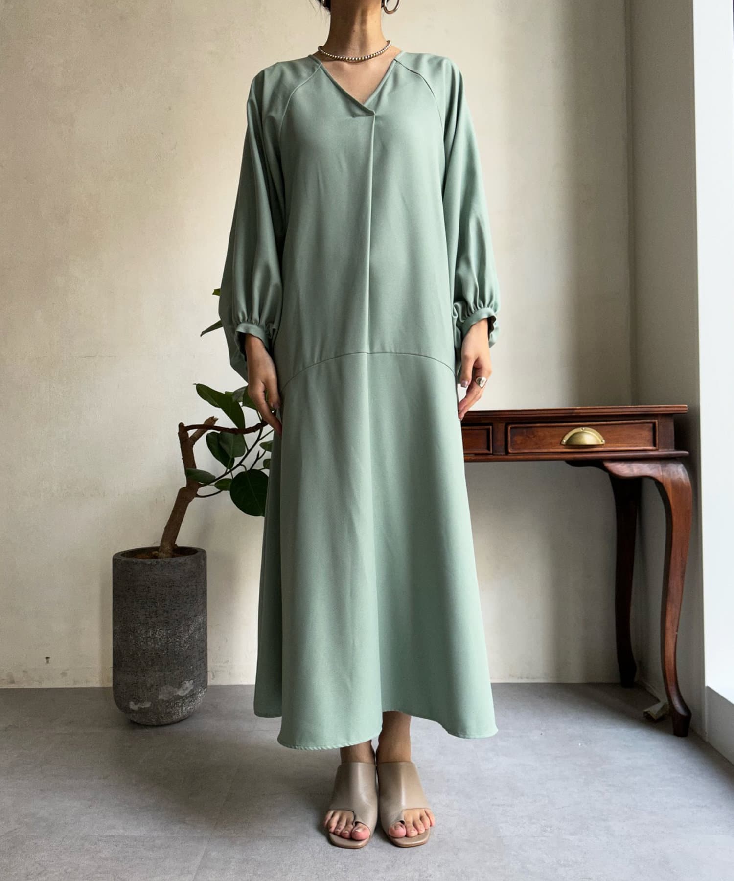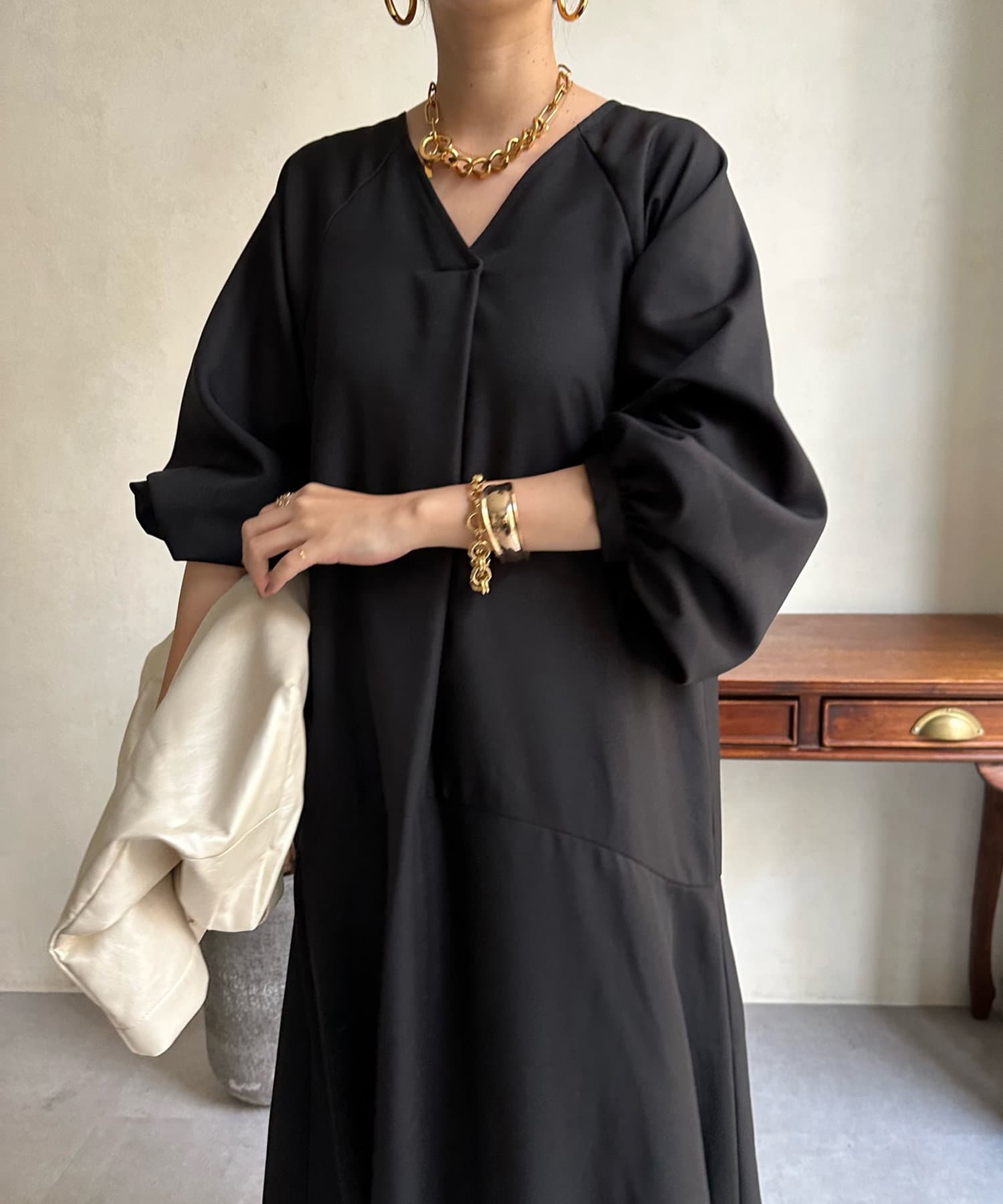 ふんわりと大胆なボリュームスリーブが存在感抜群のワンピース。