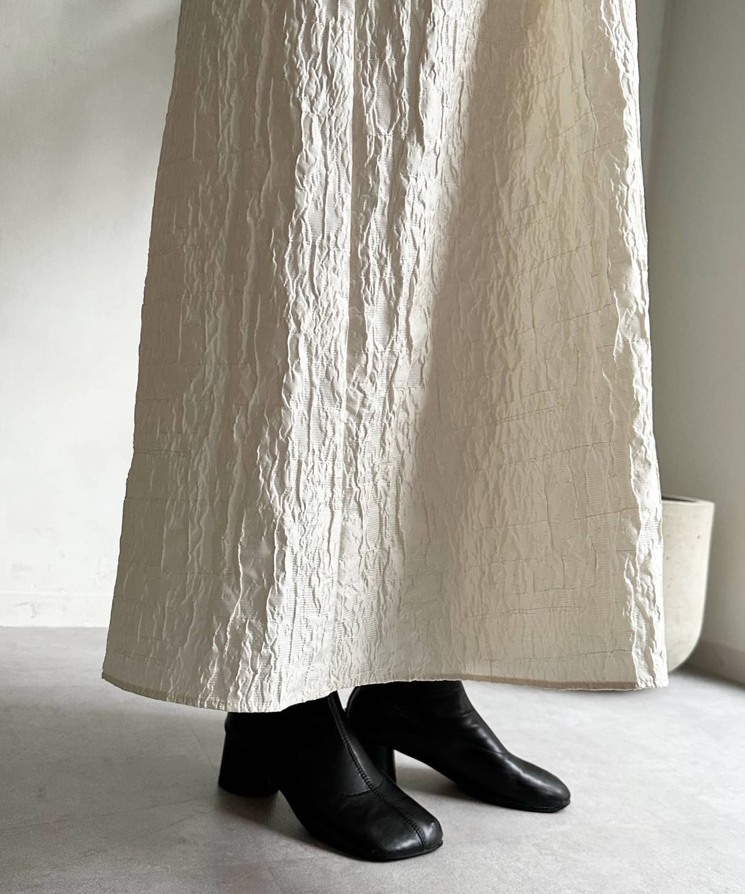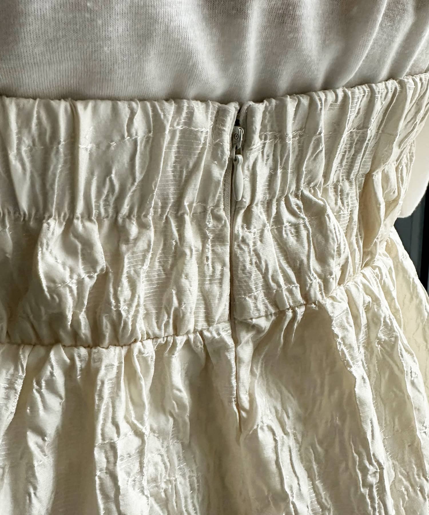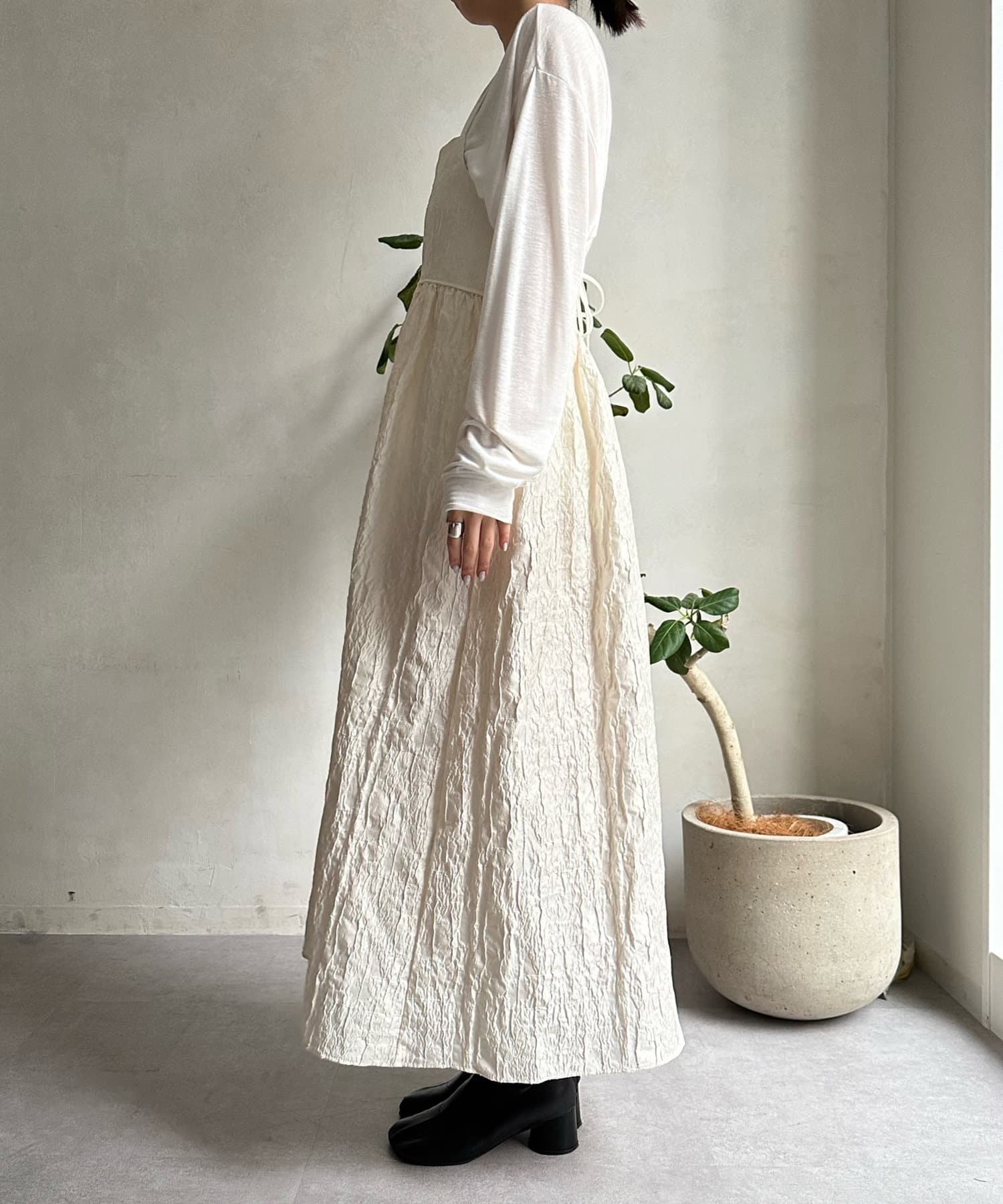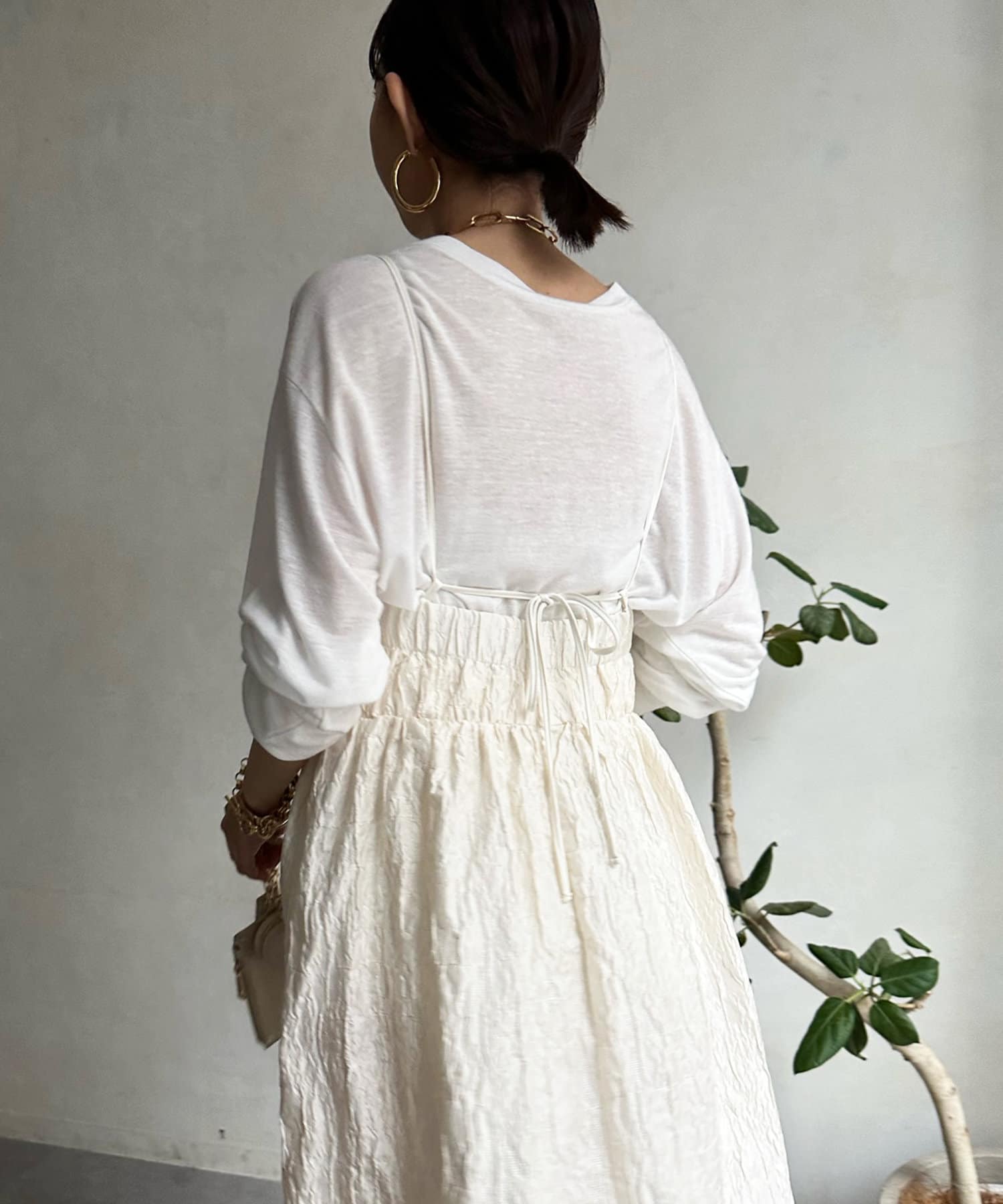 胸下のラインからギャザーを寄せ、裾に向かって広がるシルエットを作ります。高い位置に目線がいくことで、脚長効果があるのも嬉しいポイント。