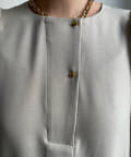 フロントの釦デザインが、コーディネートのさりげないポイントになり、華やかさもプラス。