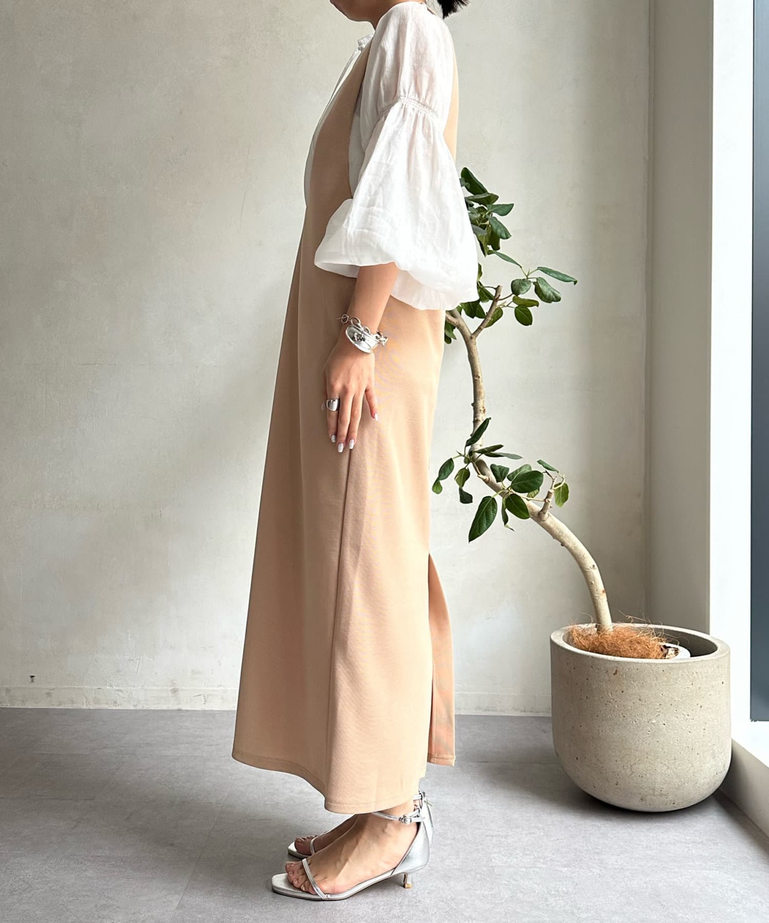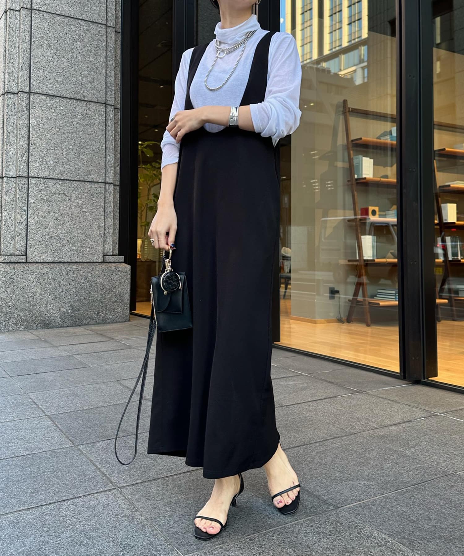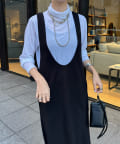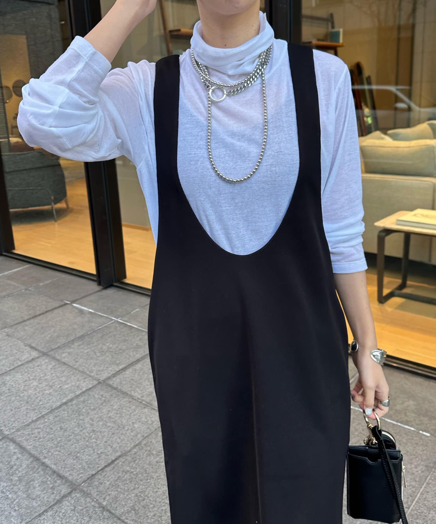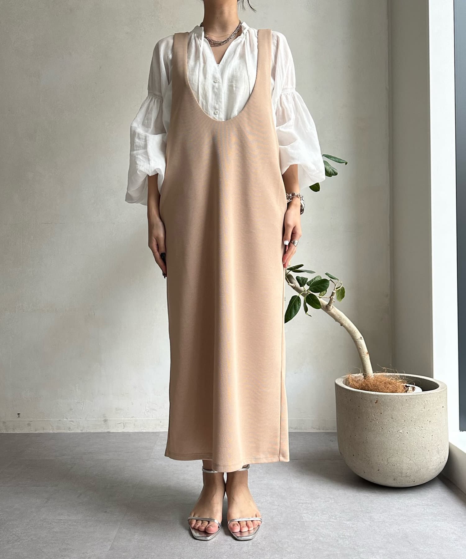 深めのUネックがポイントで、すっきりとしたIラインシルエットのジャンパースカート。