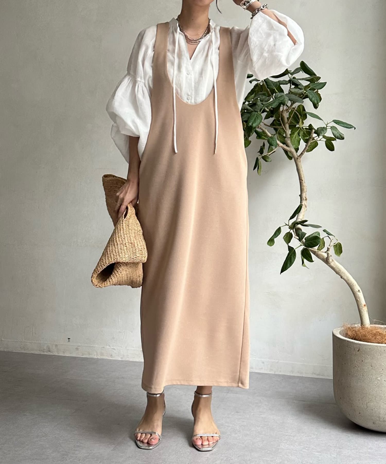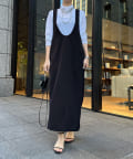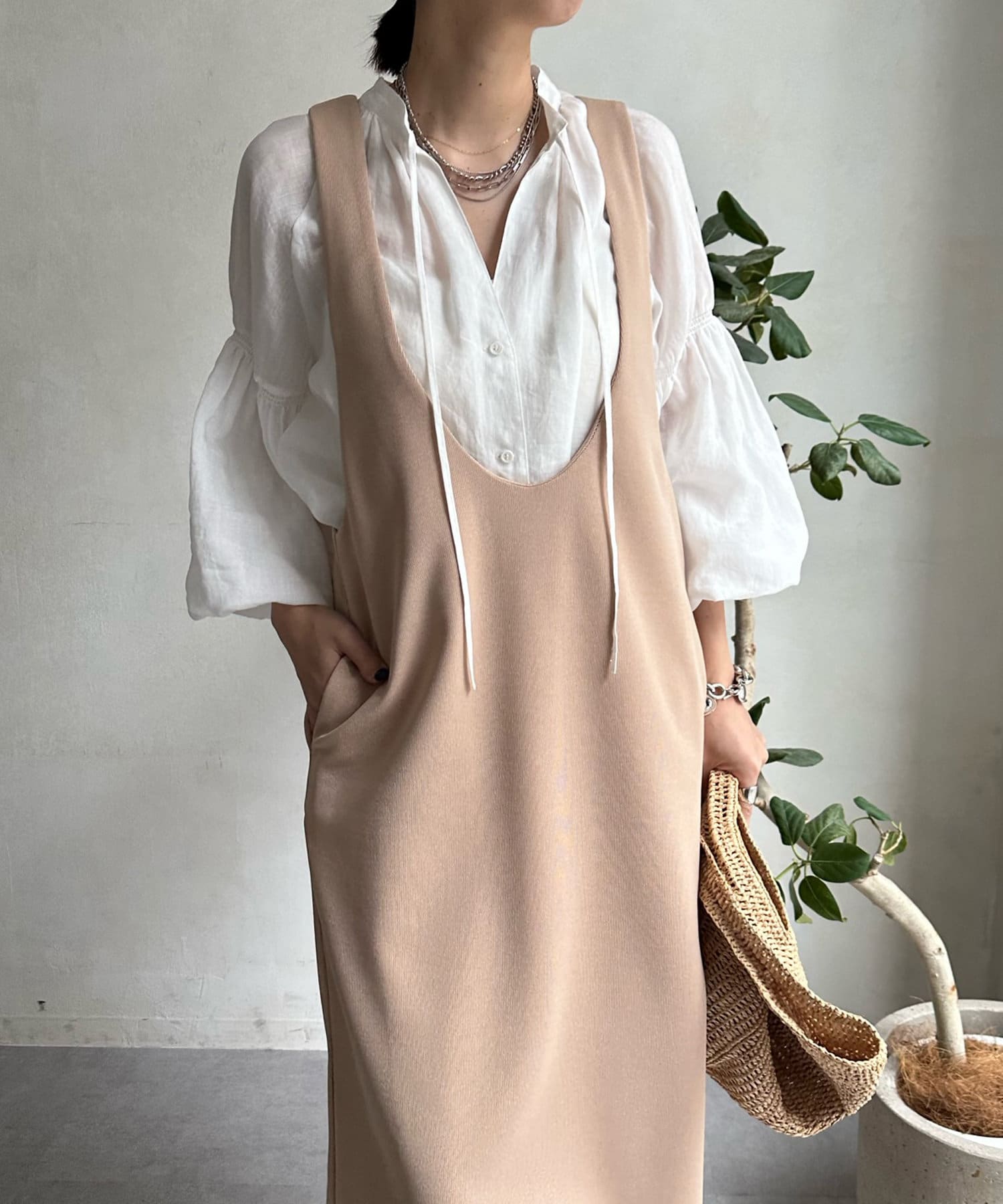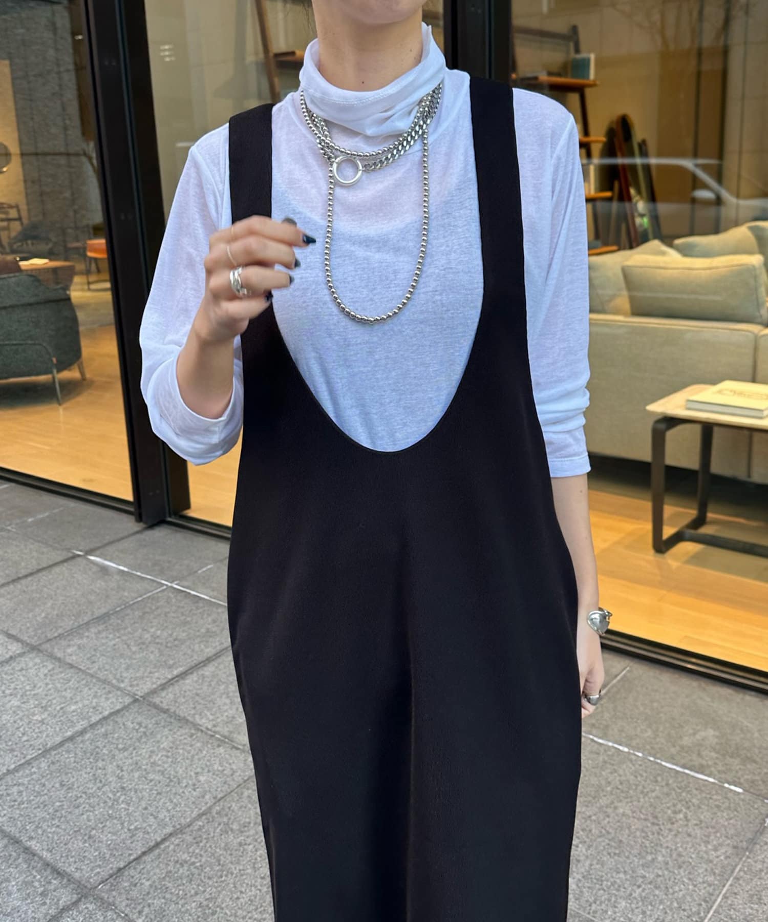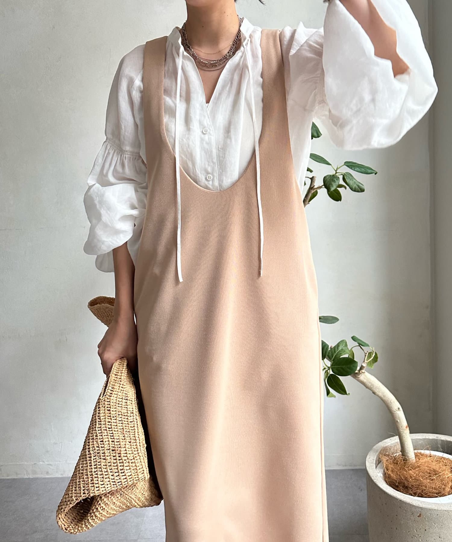 深めのUネックがポイントで、すっきりとしたIラインシルエットのジャンパースカート。