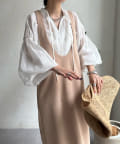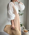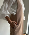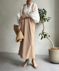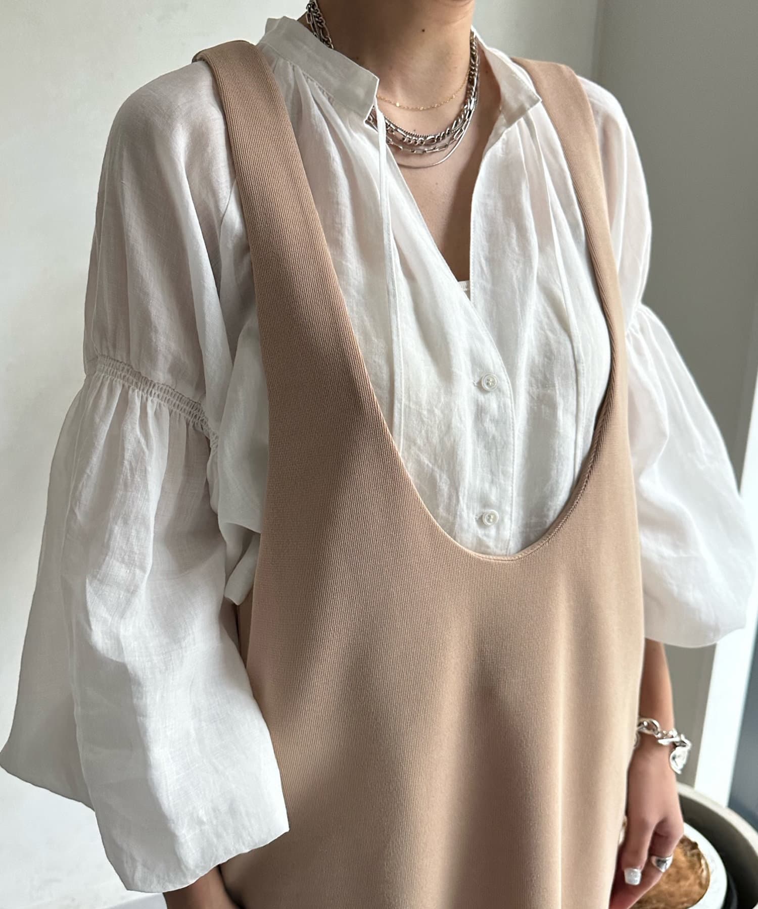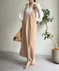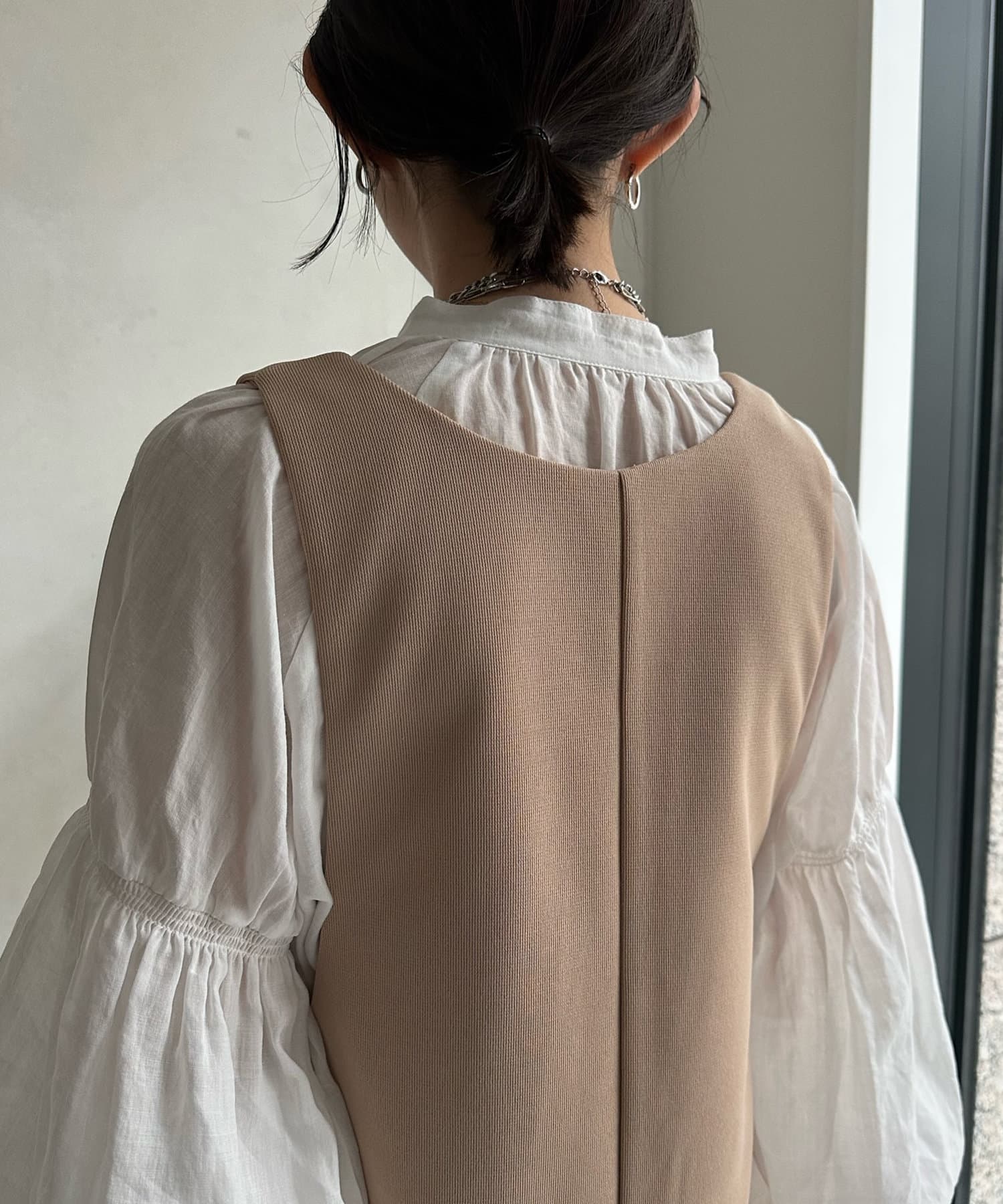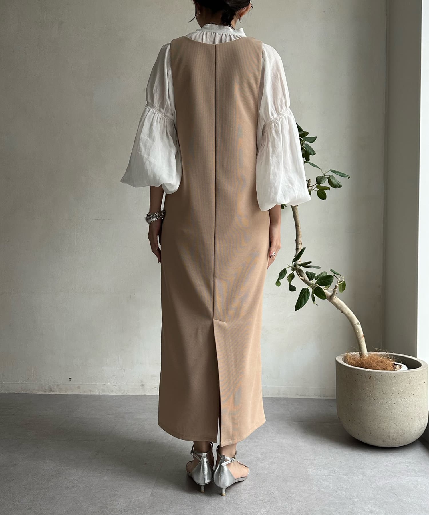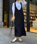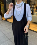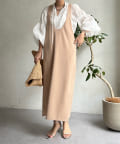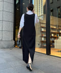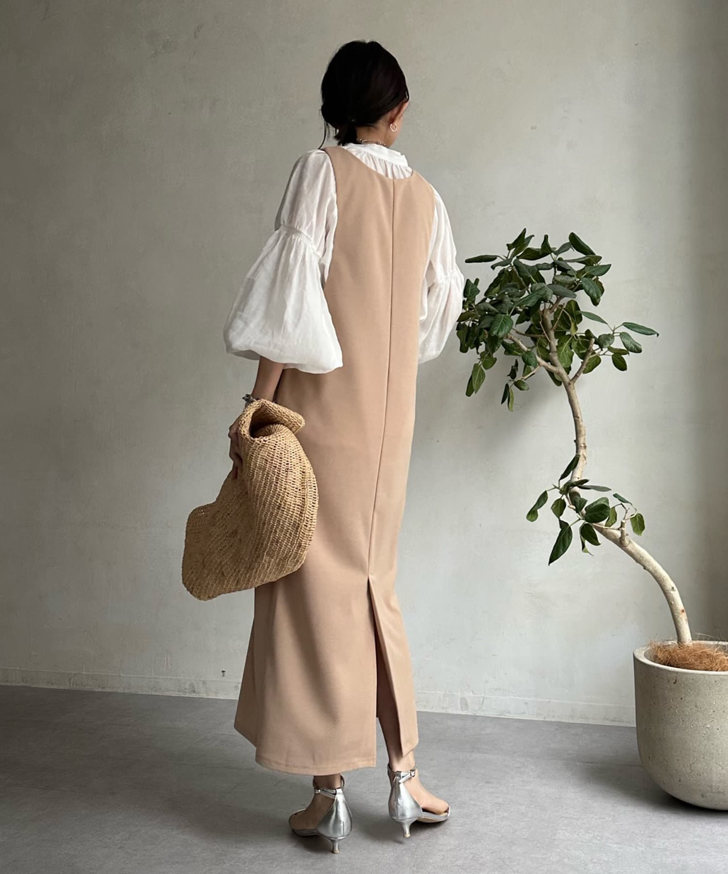 深めのUネックがポイントで、すっきりとしたIラインシルエットのジャンパースカート。