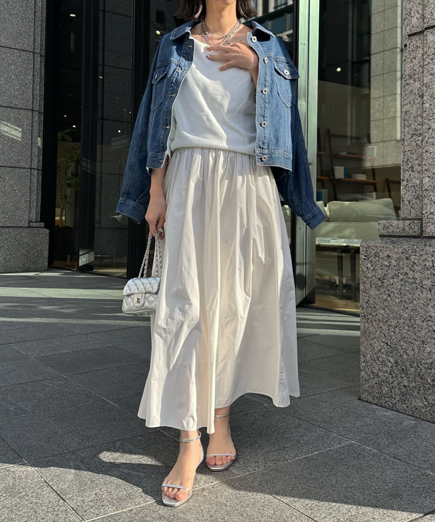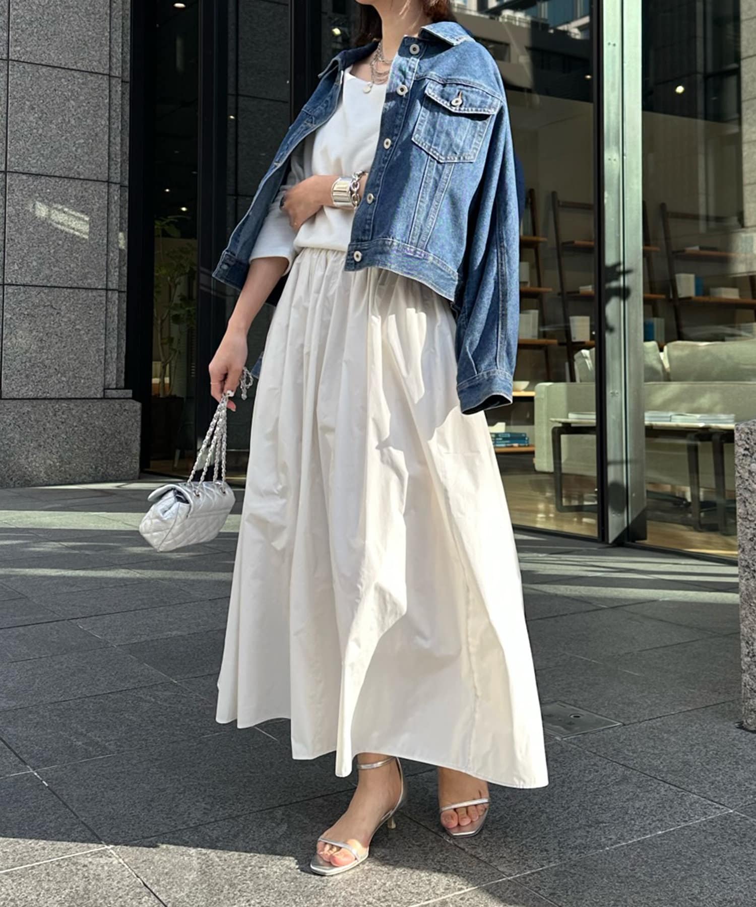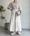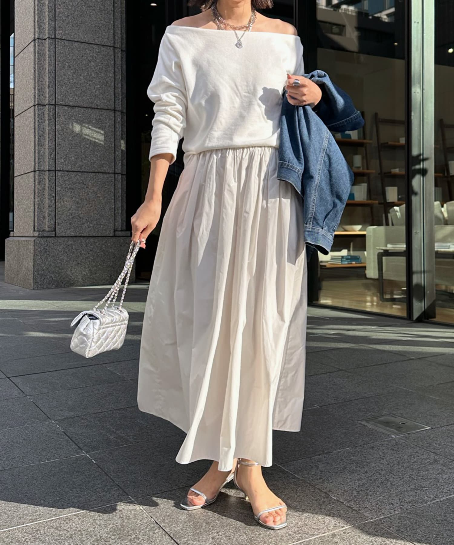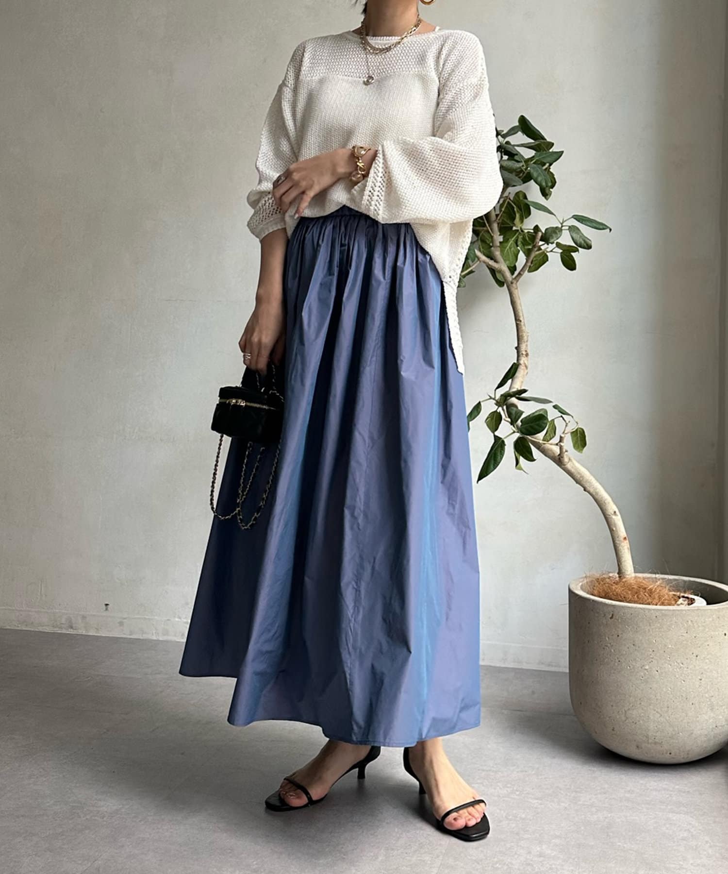 見る角度や動きによって表情が変わる素材感が特徴的なため、合わせるトップスはシンプルなものでもサマ見え◎
