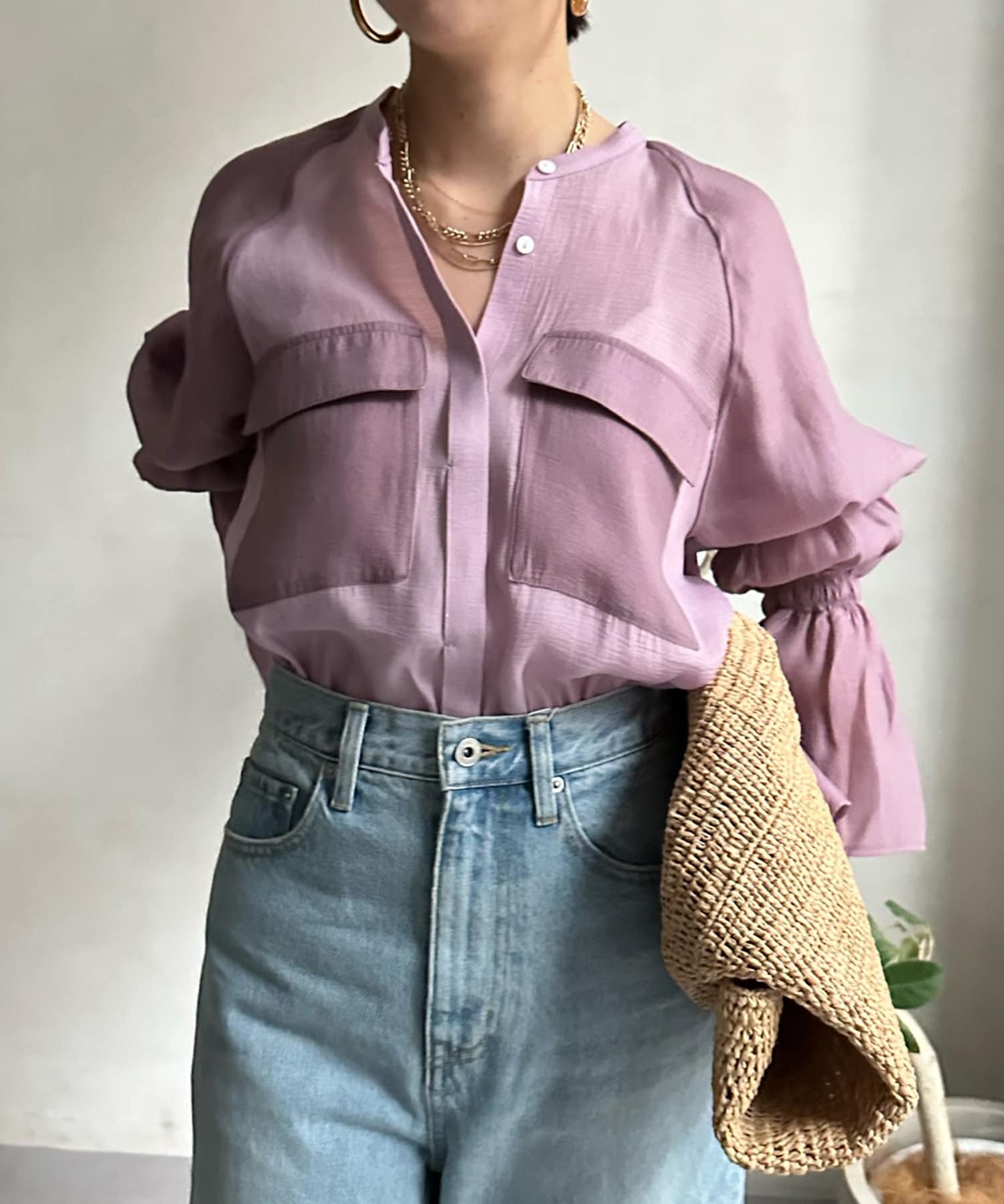流行りのシアーシャツですが、袖のデザインや胸元のポケットが可愛くて周りと差がつくところが気に入ってます。色は、ネットで見るより少し黄色が強いです。