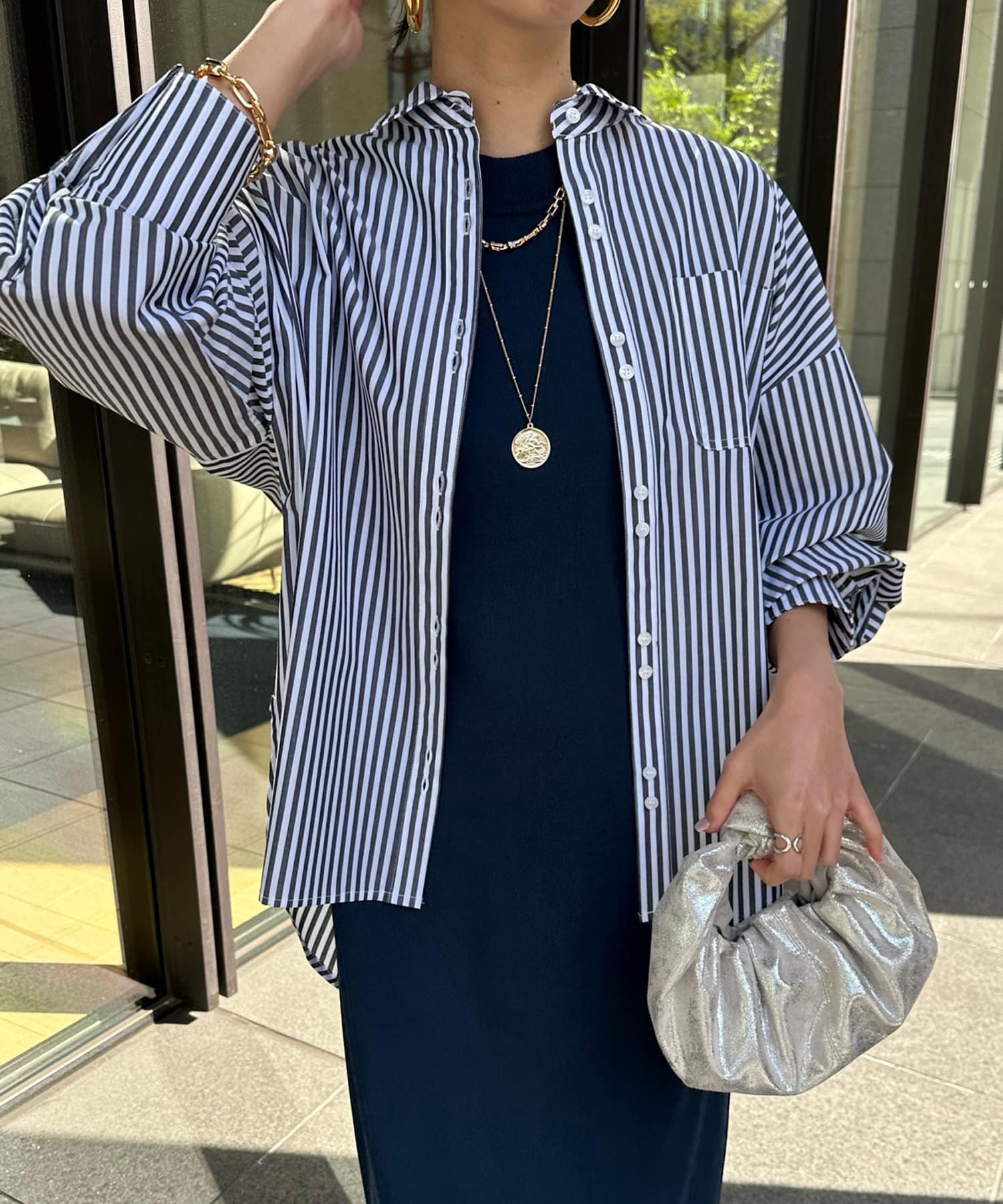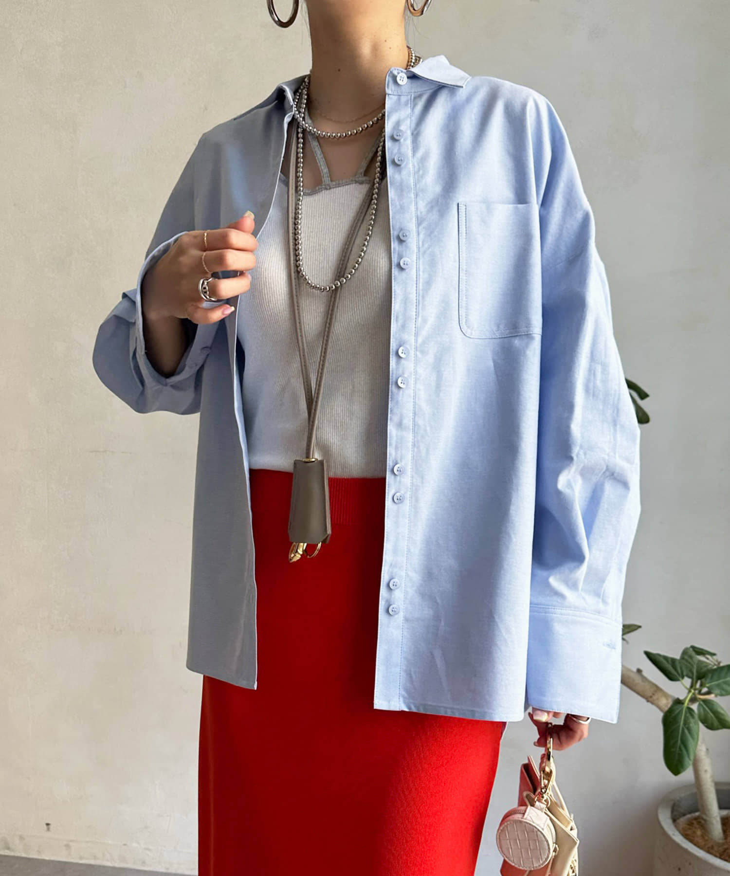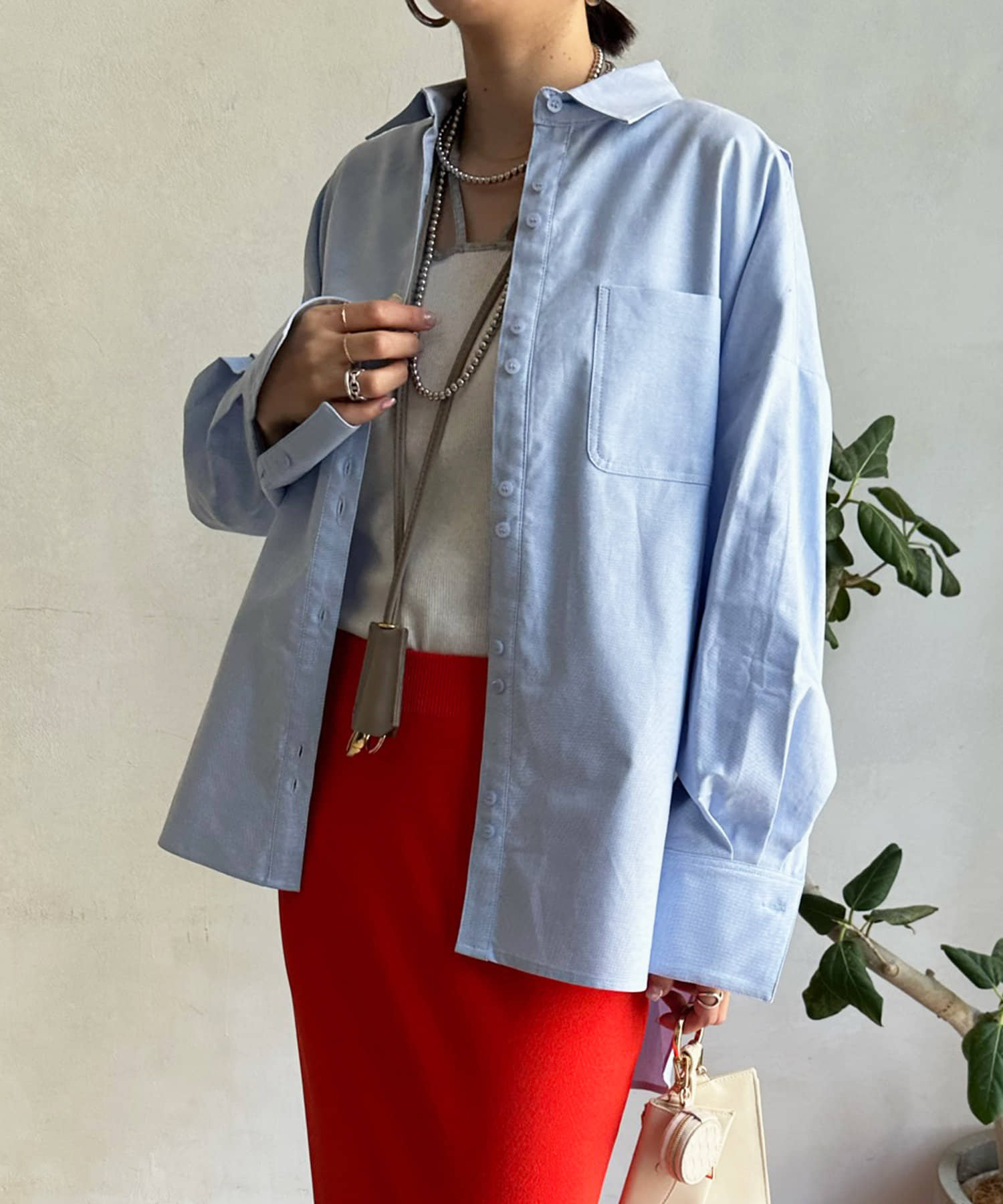 ボタンは上まで閉めるのはもちろん、インナーを合わせてざっくりと開けた着こなしも素敵ですよ◎