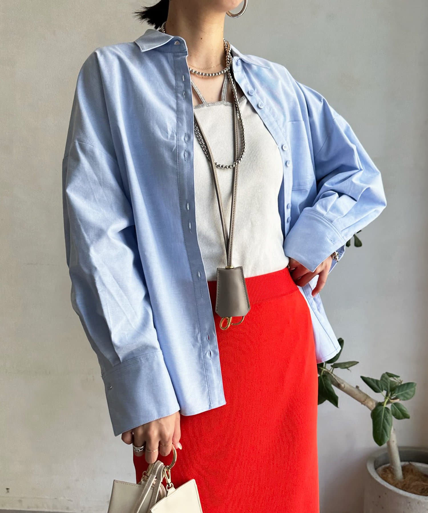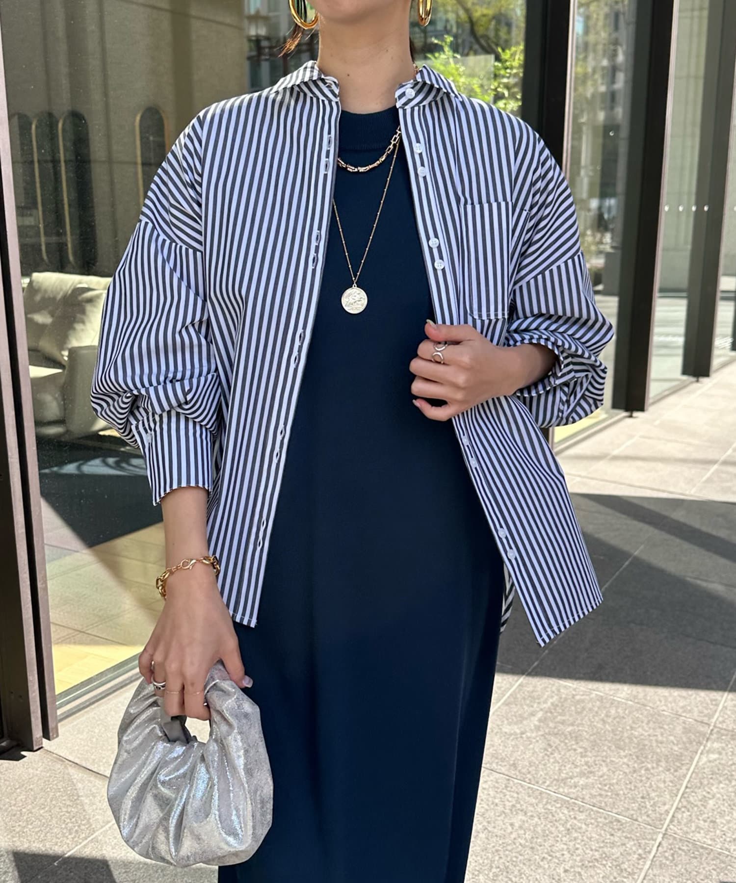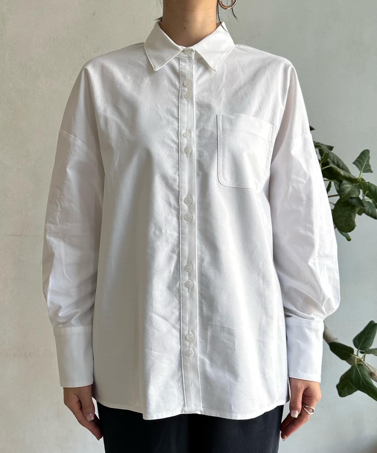 ボタンは上まで閉めるのはもちろん、インナーを合わせてざっくりと開けた着こなしも素敵ですよ◎